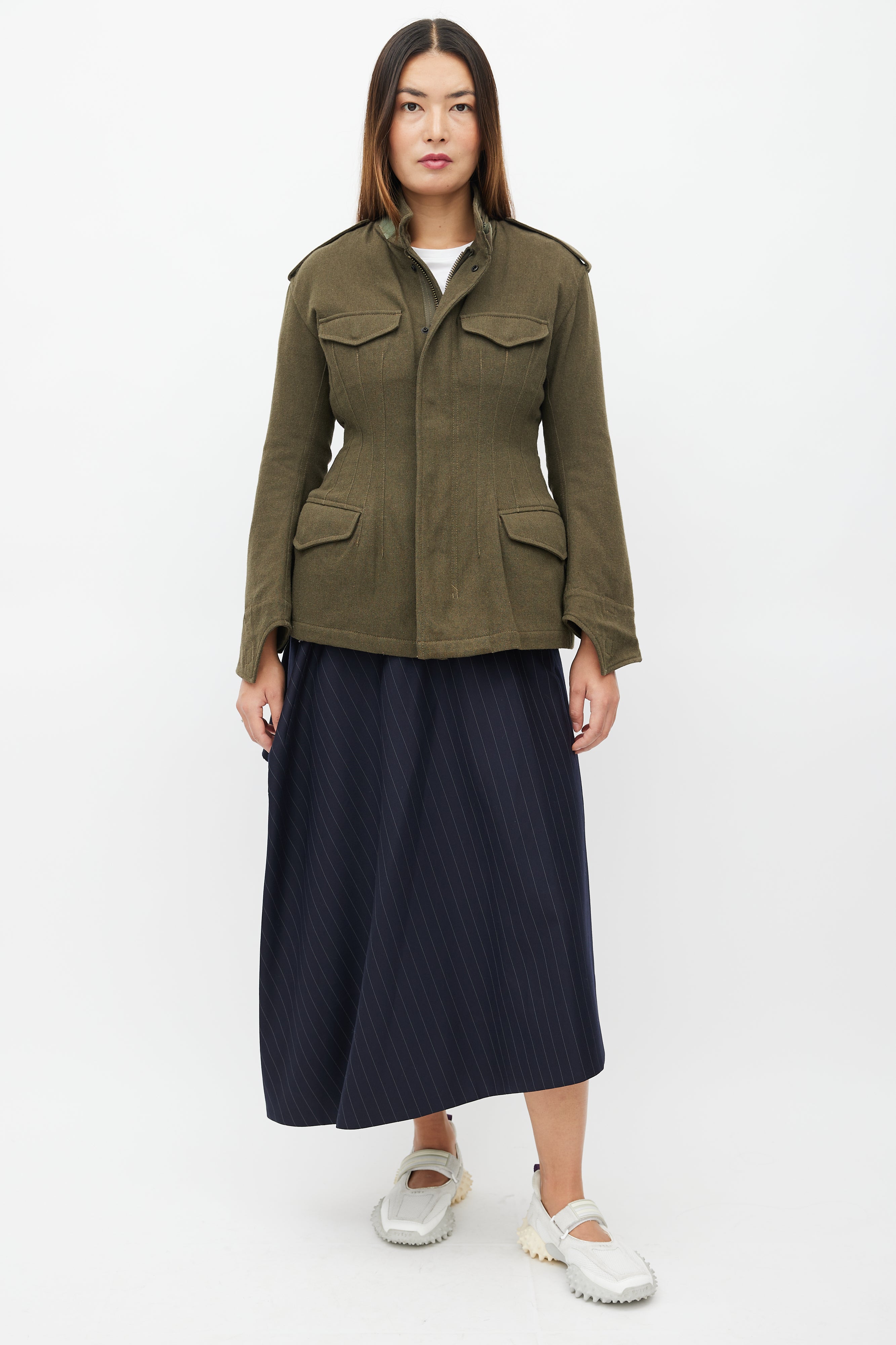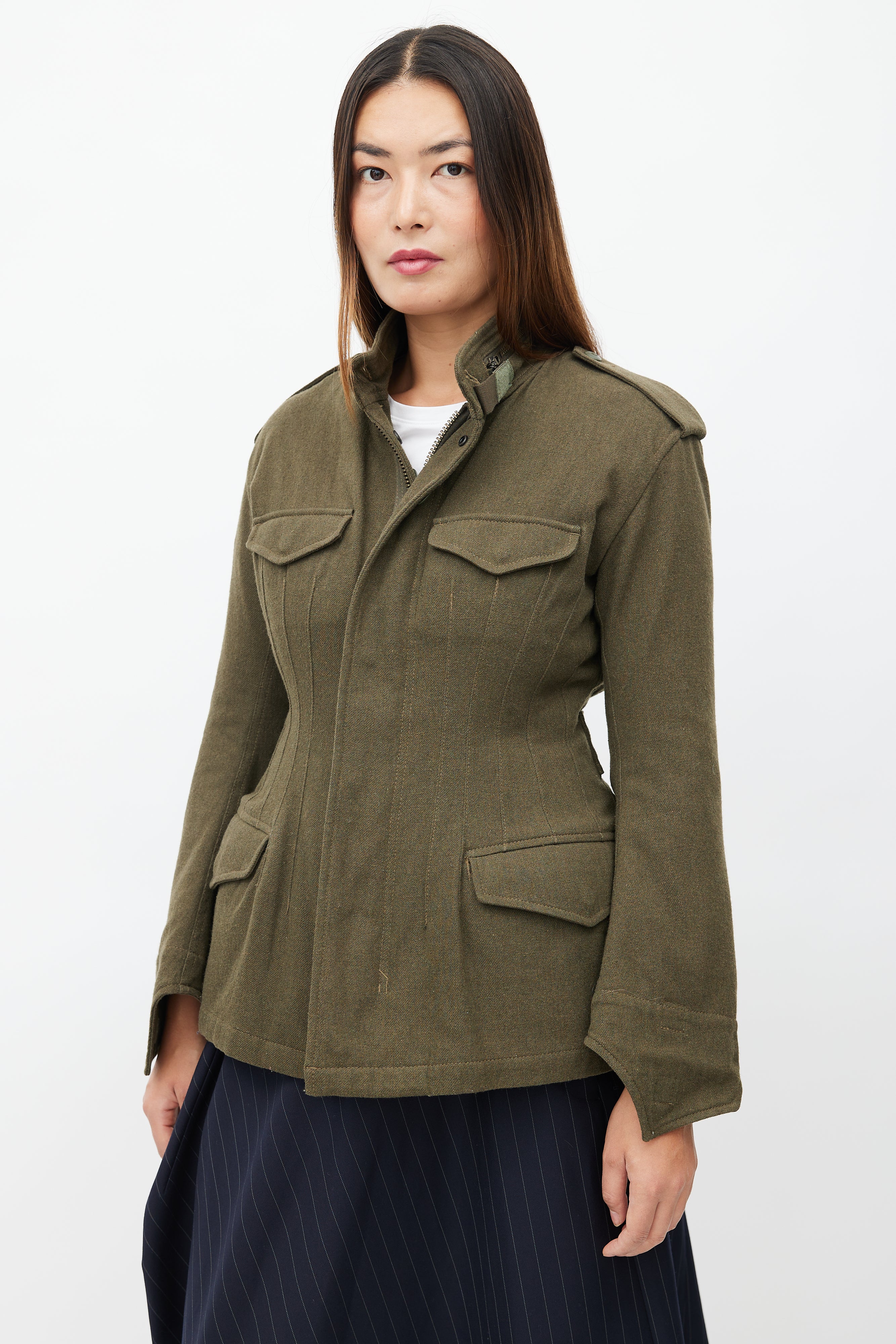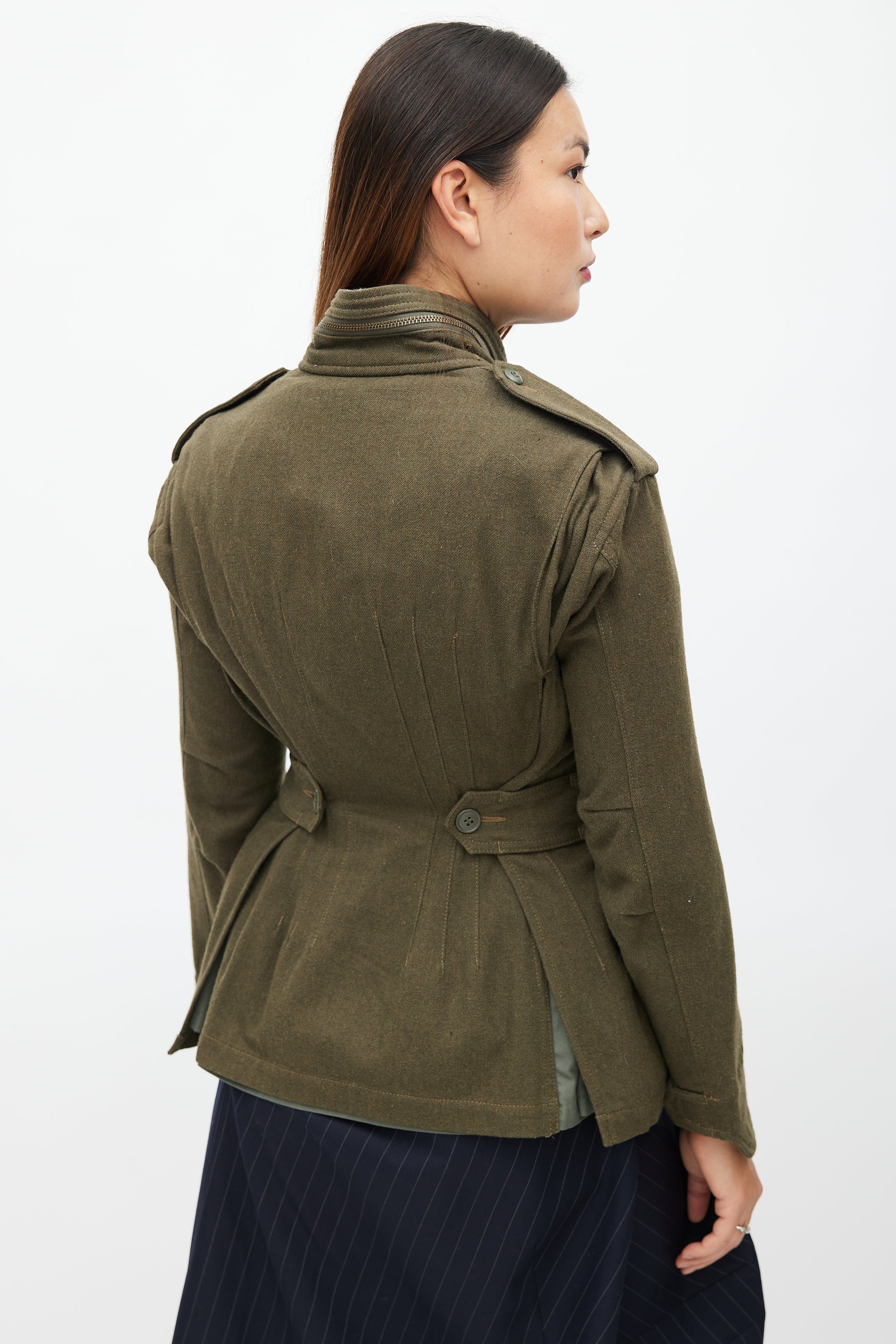 Pre-owned Fall 2010 Junya Watanabe khaki green jacket featuring zip up front, concealed hood with zip fastening at collar, four flap pockets, structured waist with darting throughout, pleated lining, and shoulder epaulettes. Look 53 from runway.