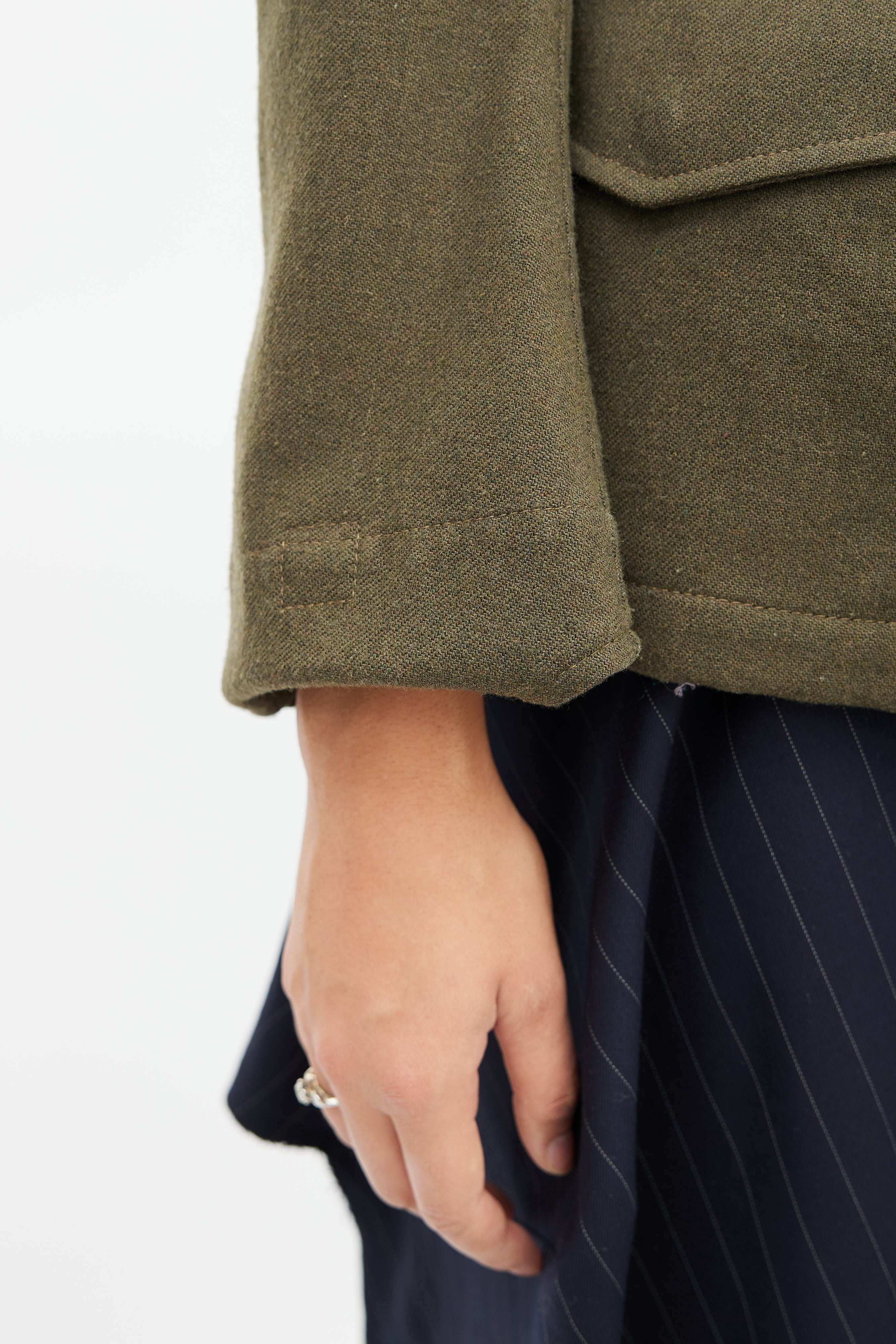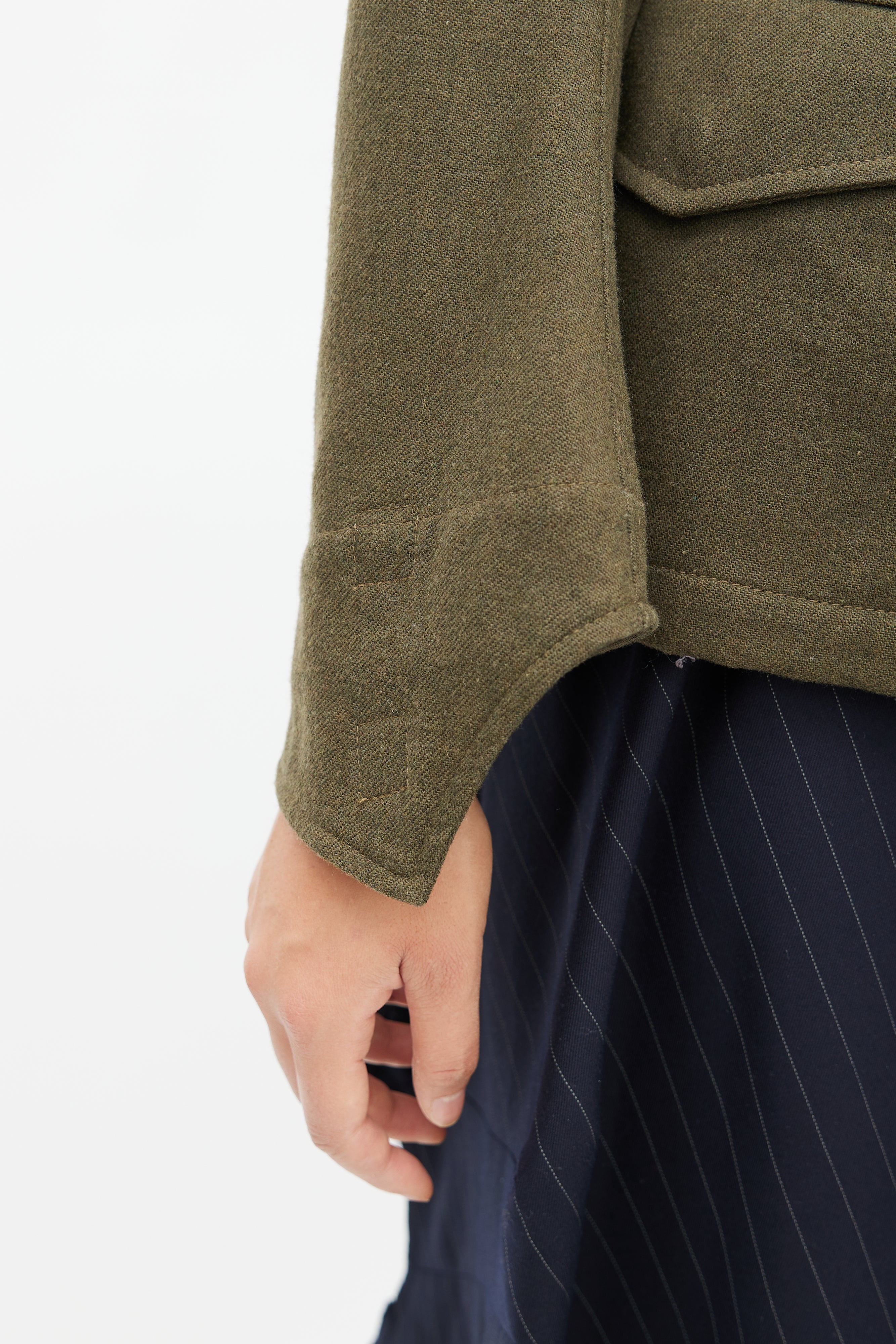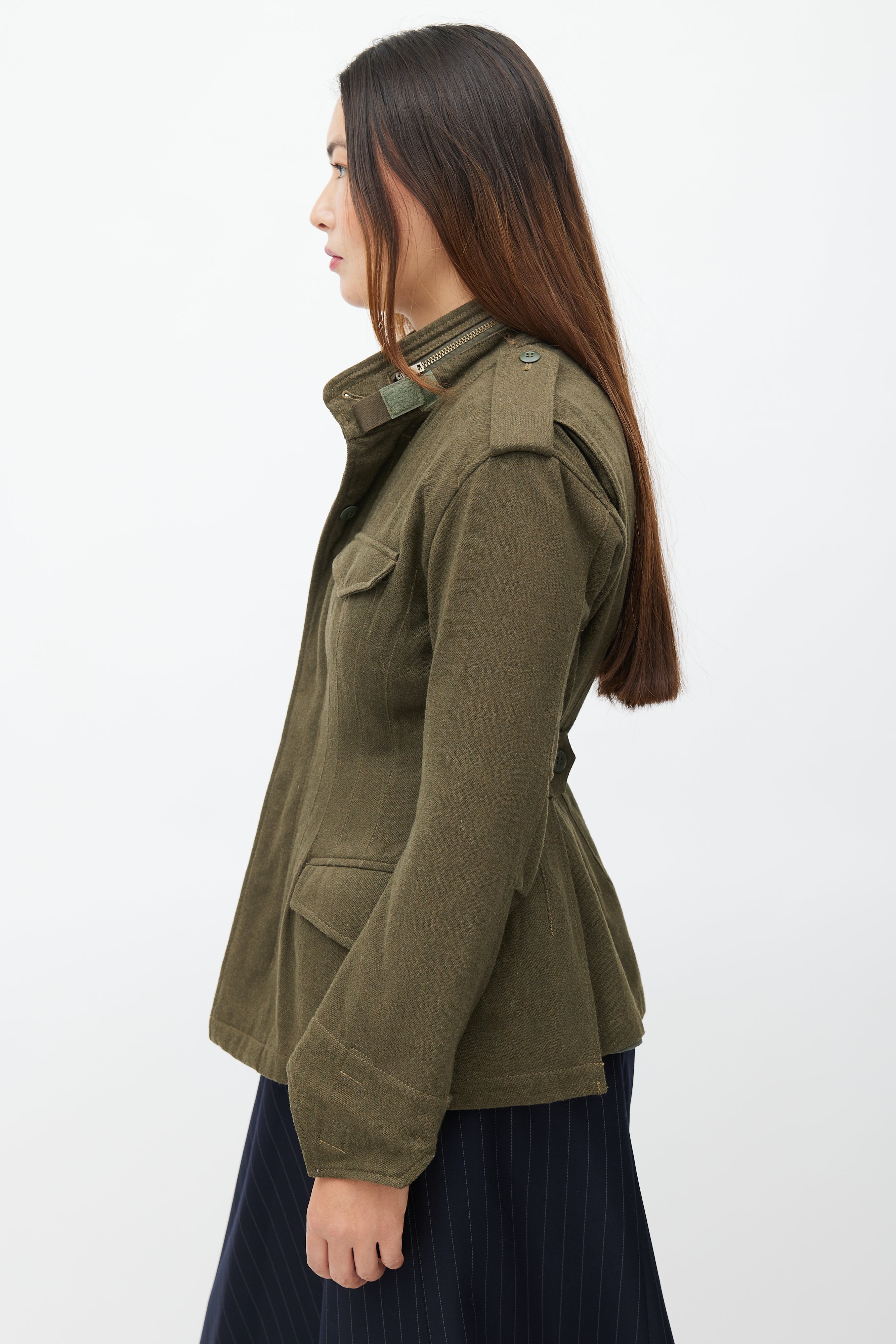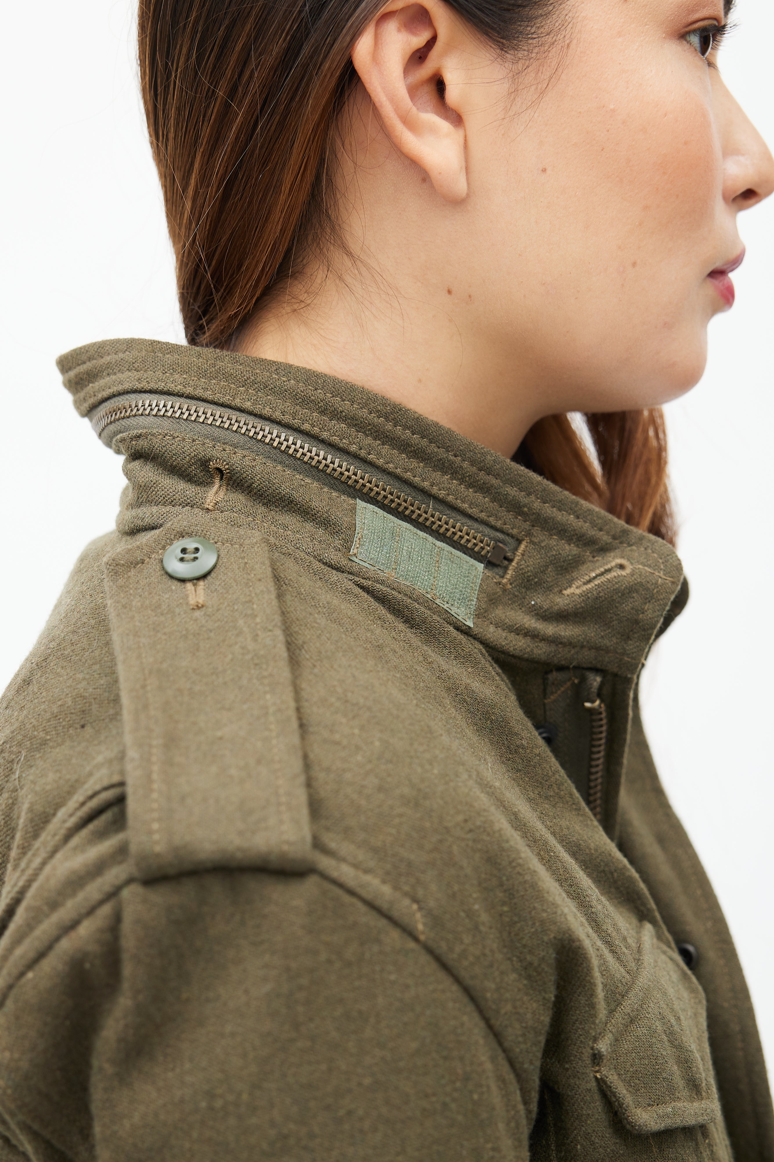 Pre-owned Fall 2010 Junya Watanabe khaki green jacket featuring zip up front, concealed hood with zip fastening at collar, four flap pockets, structured waist with darting throughout, pleated lining, and shoulder epaulettes. Look 53 from runway.
