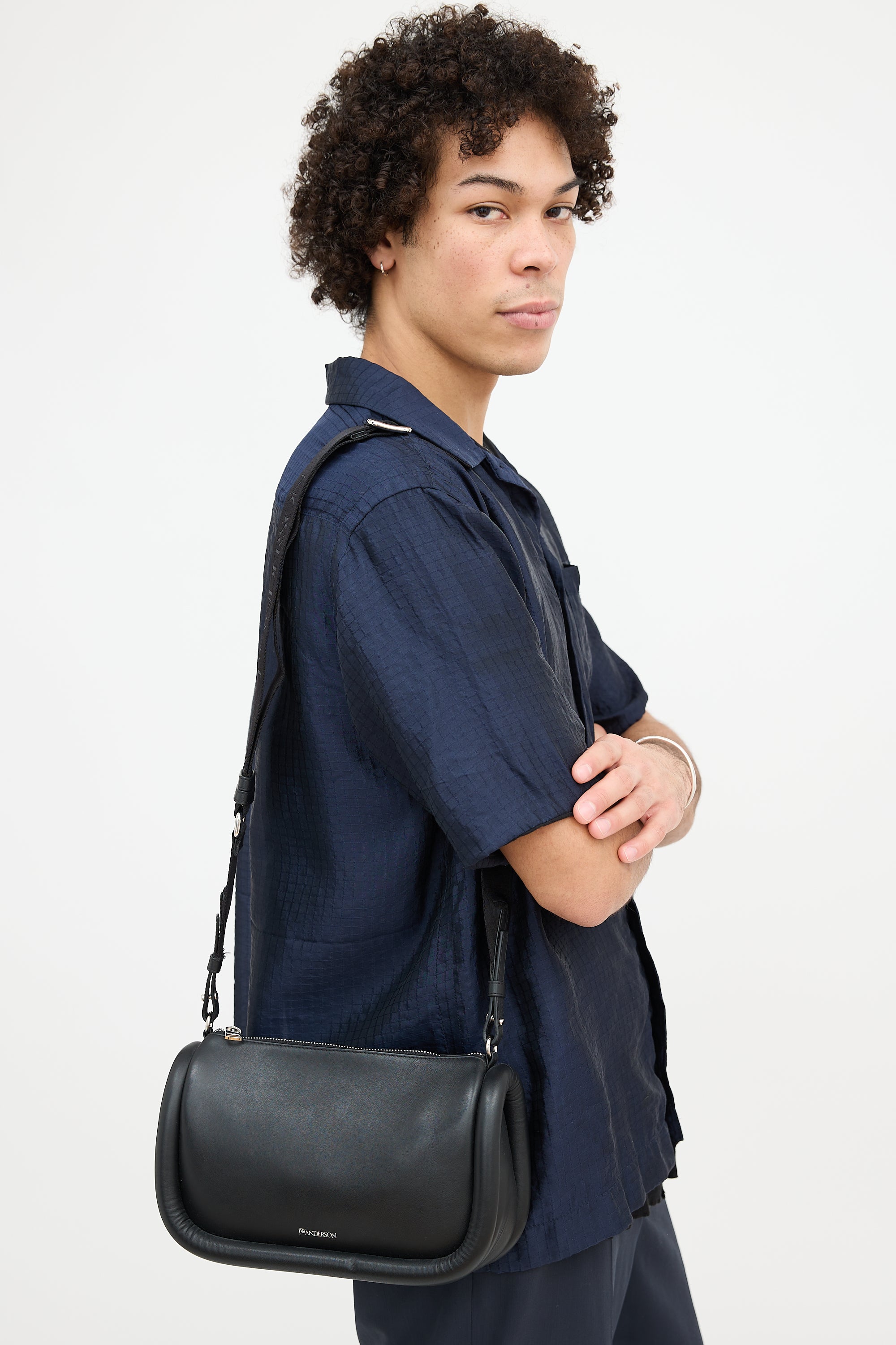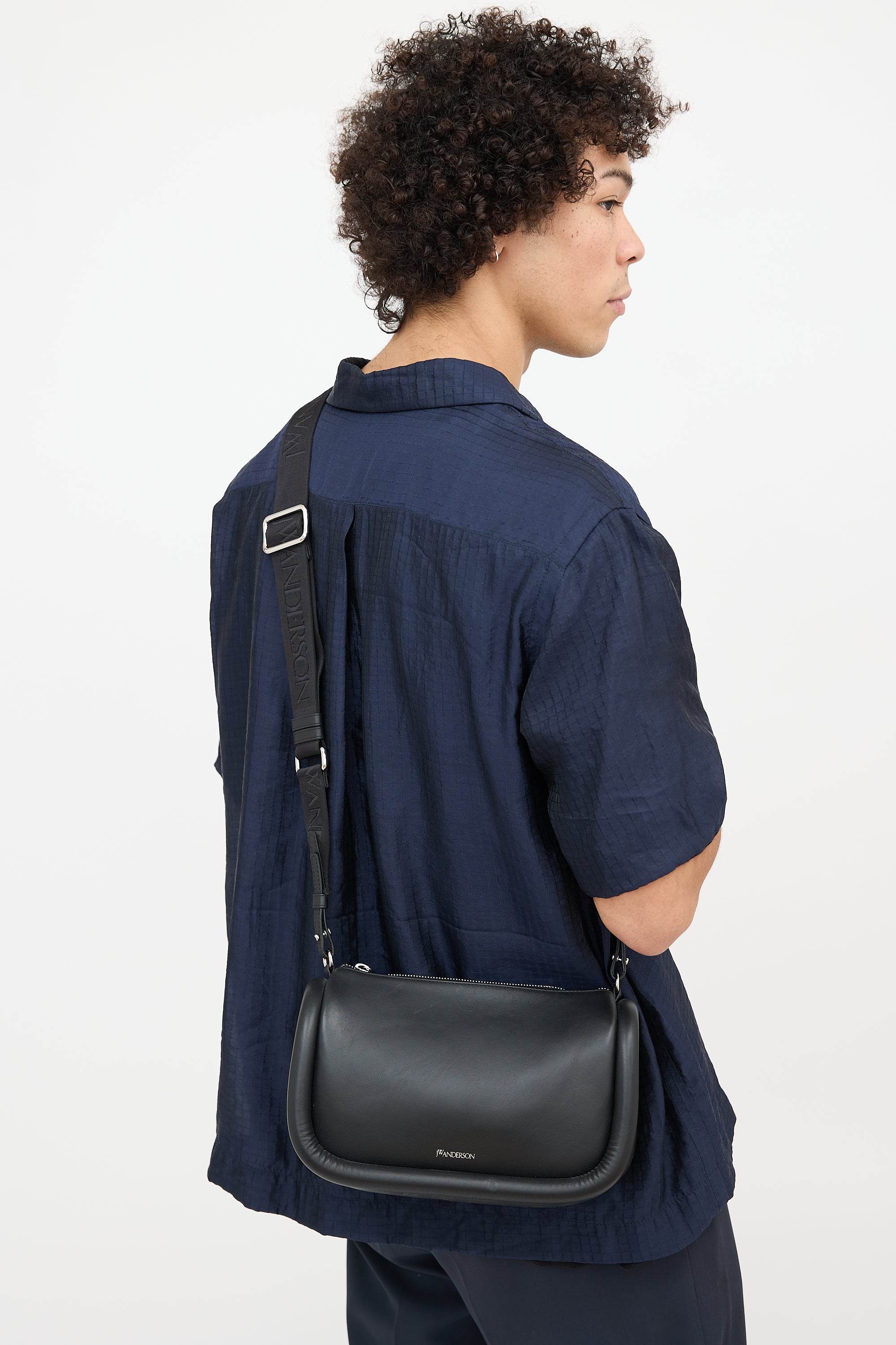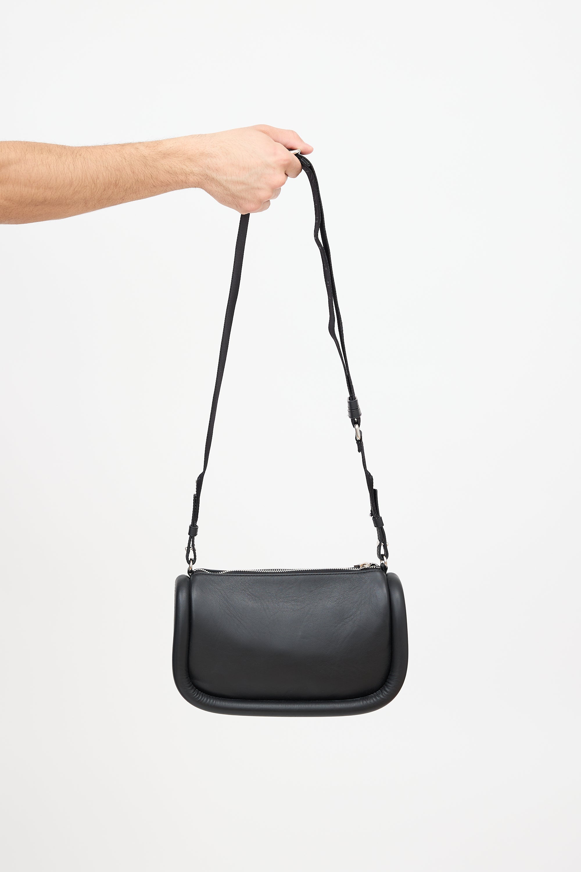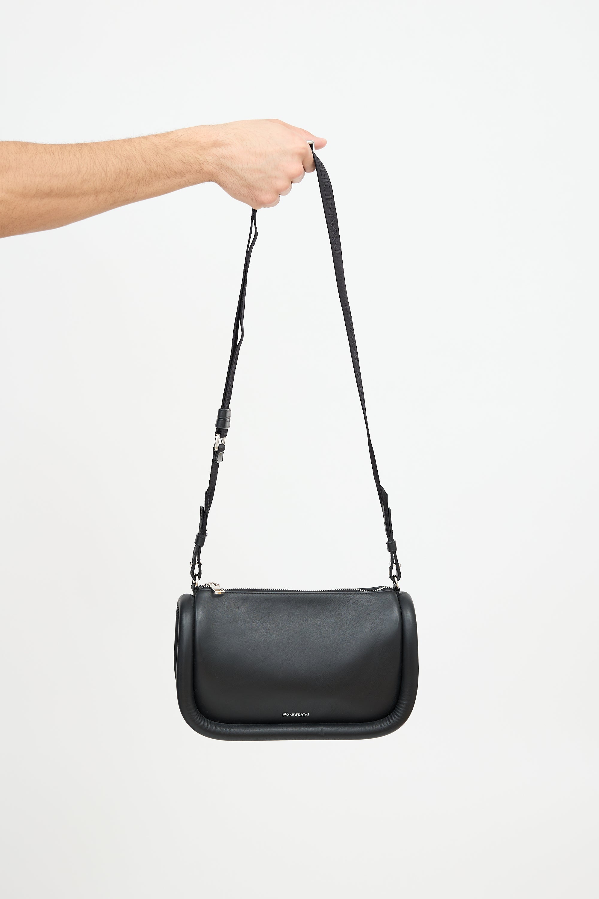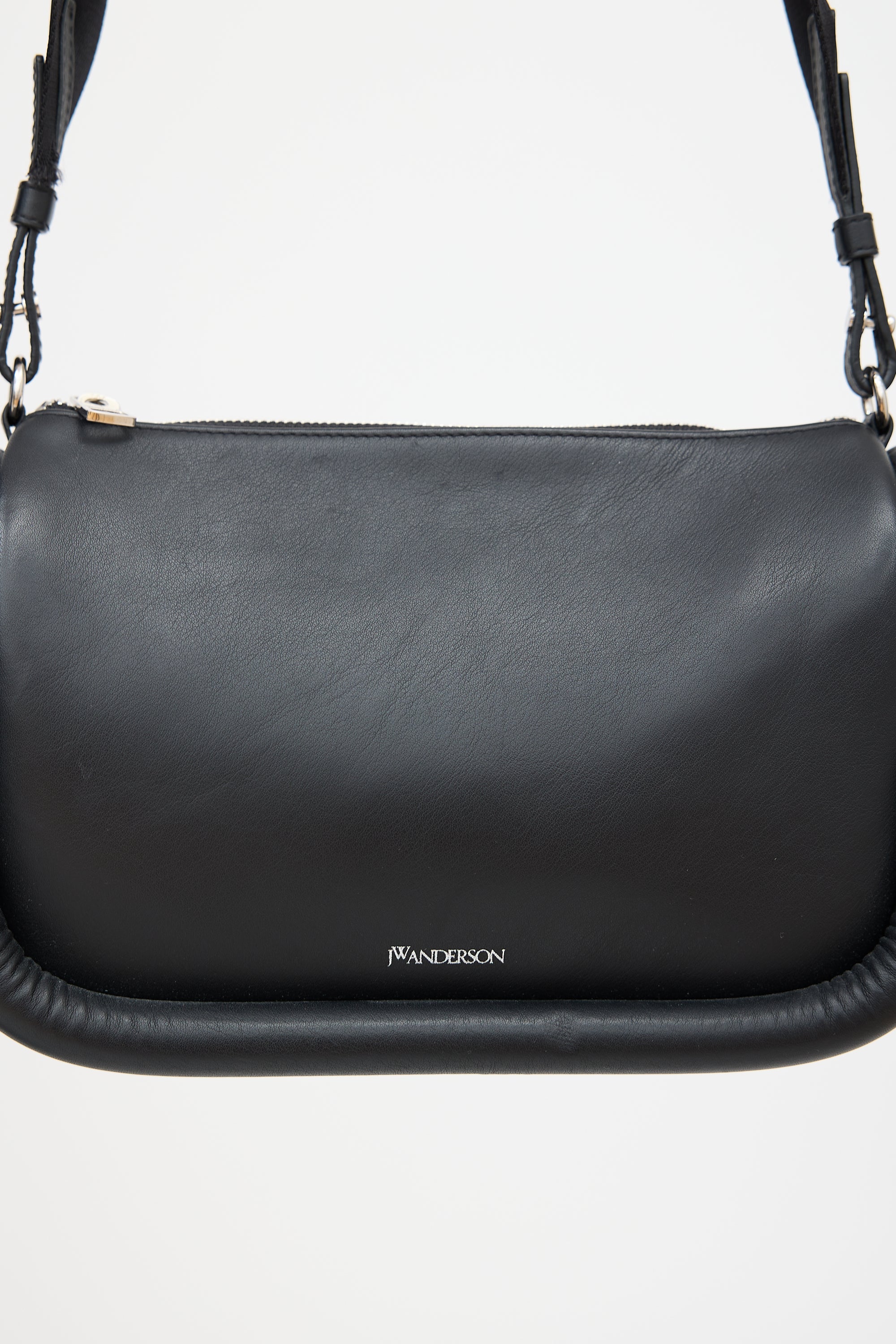 Pre-owned JW Anderson black leather Bumper 17 bag featuring a detachable and adjustable logo debossed crossbody strap, silver tone stamped logo at front, zip top closure, one interior slip pocket, and padded sides. Includes original dust bag.