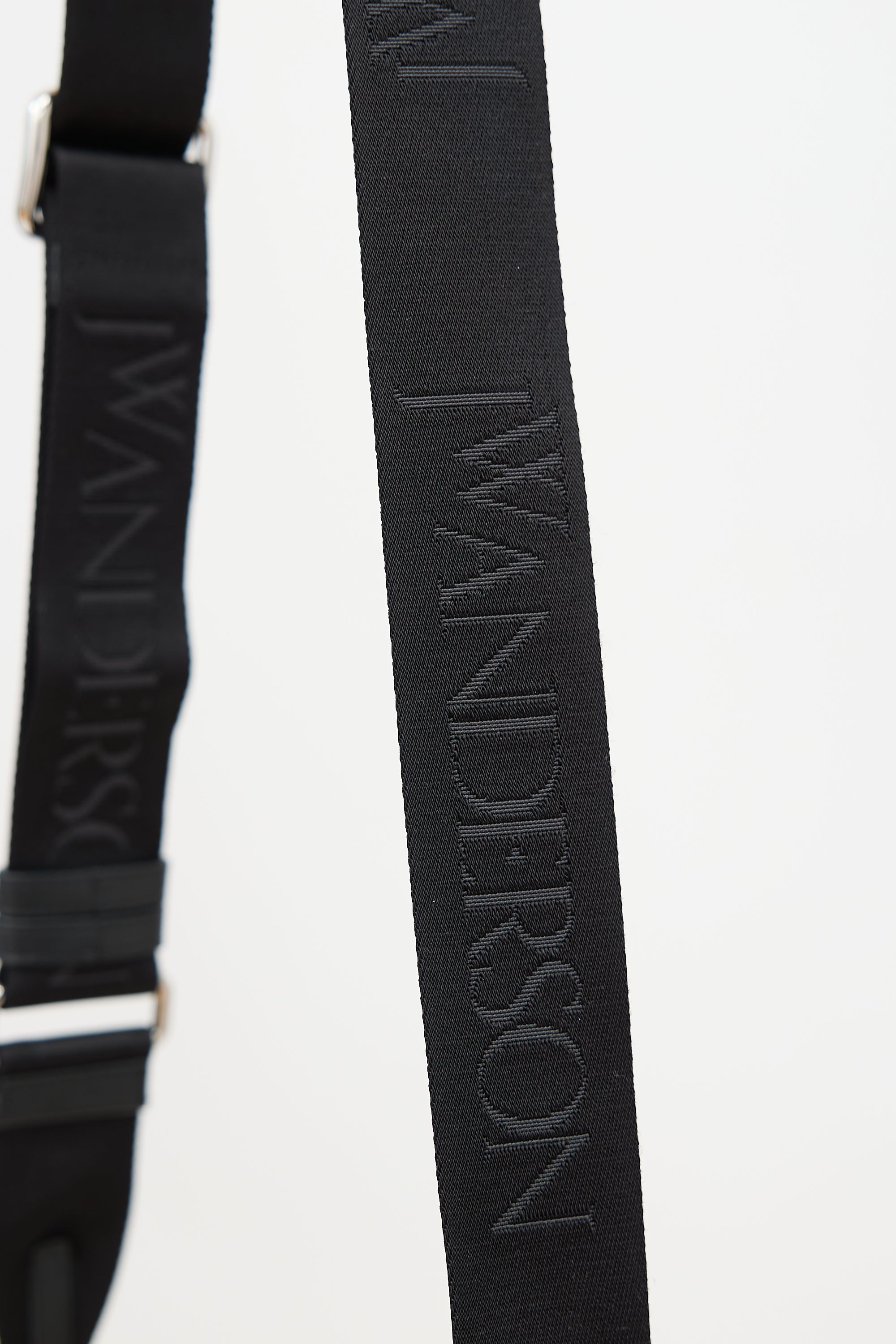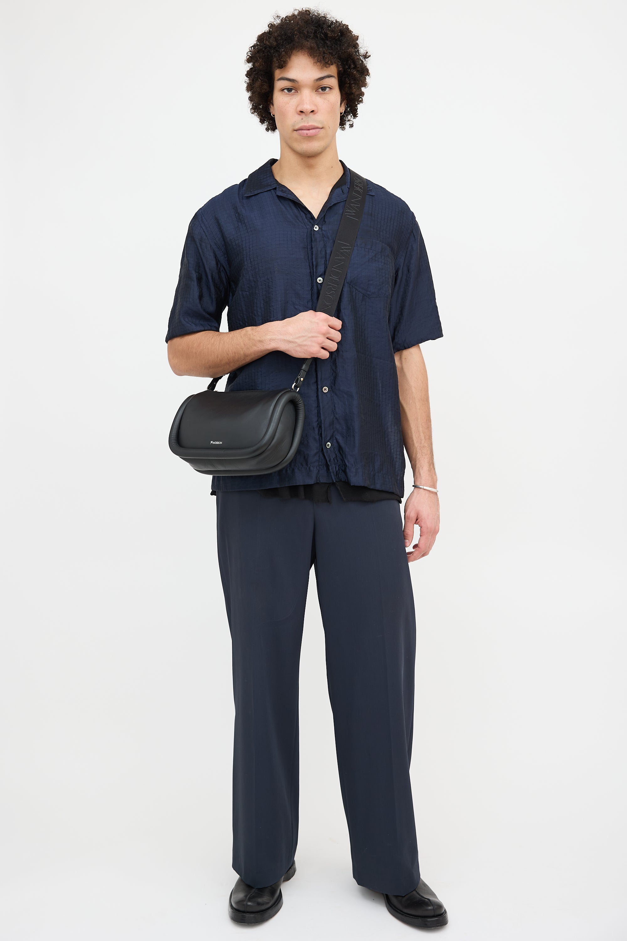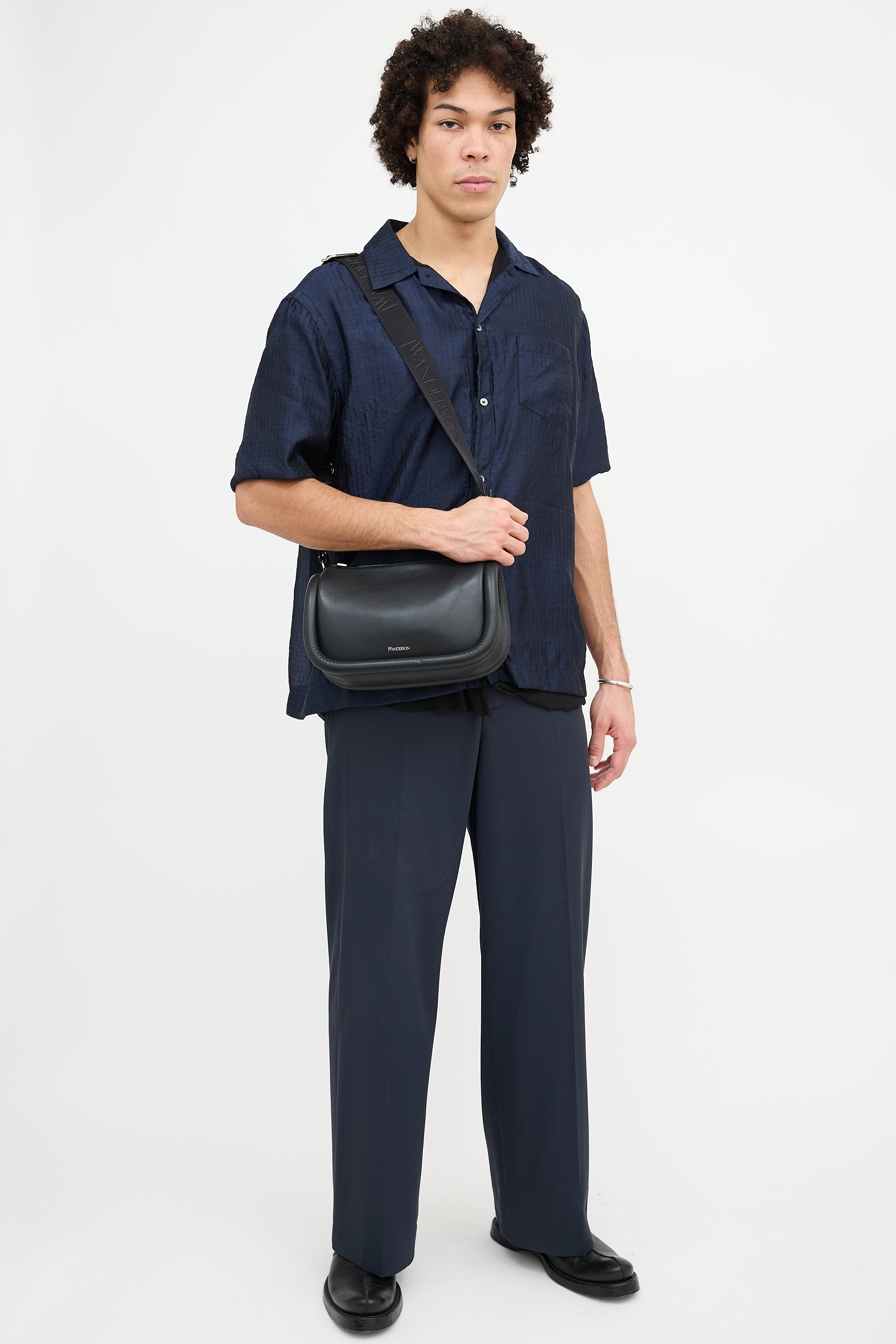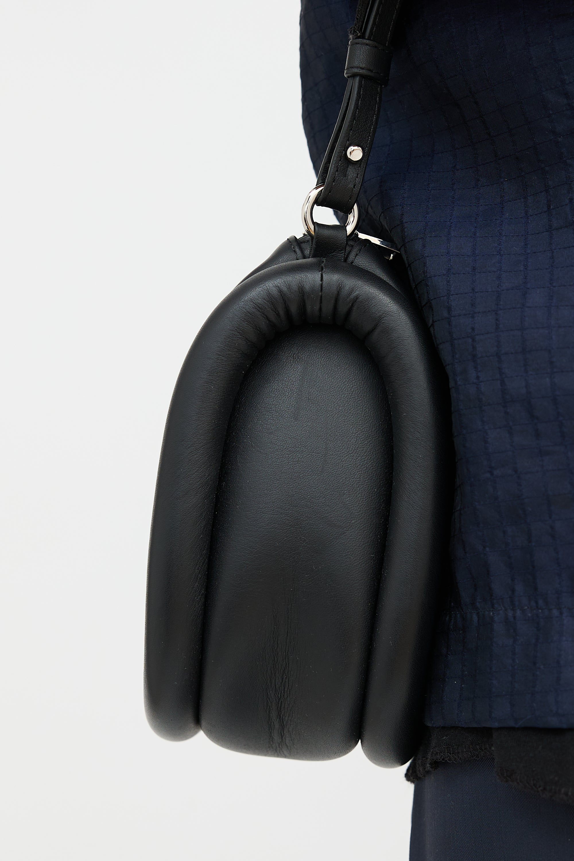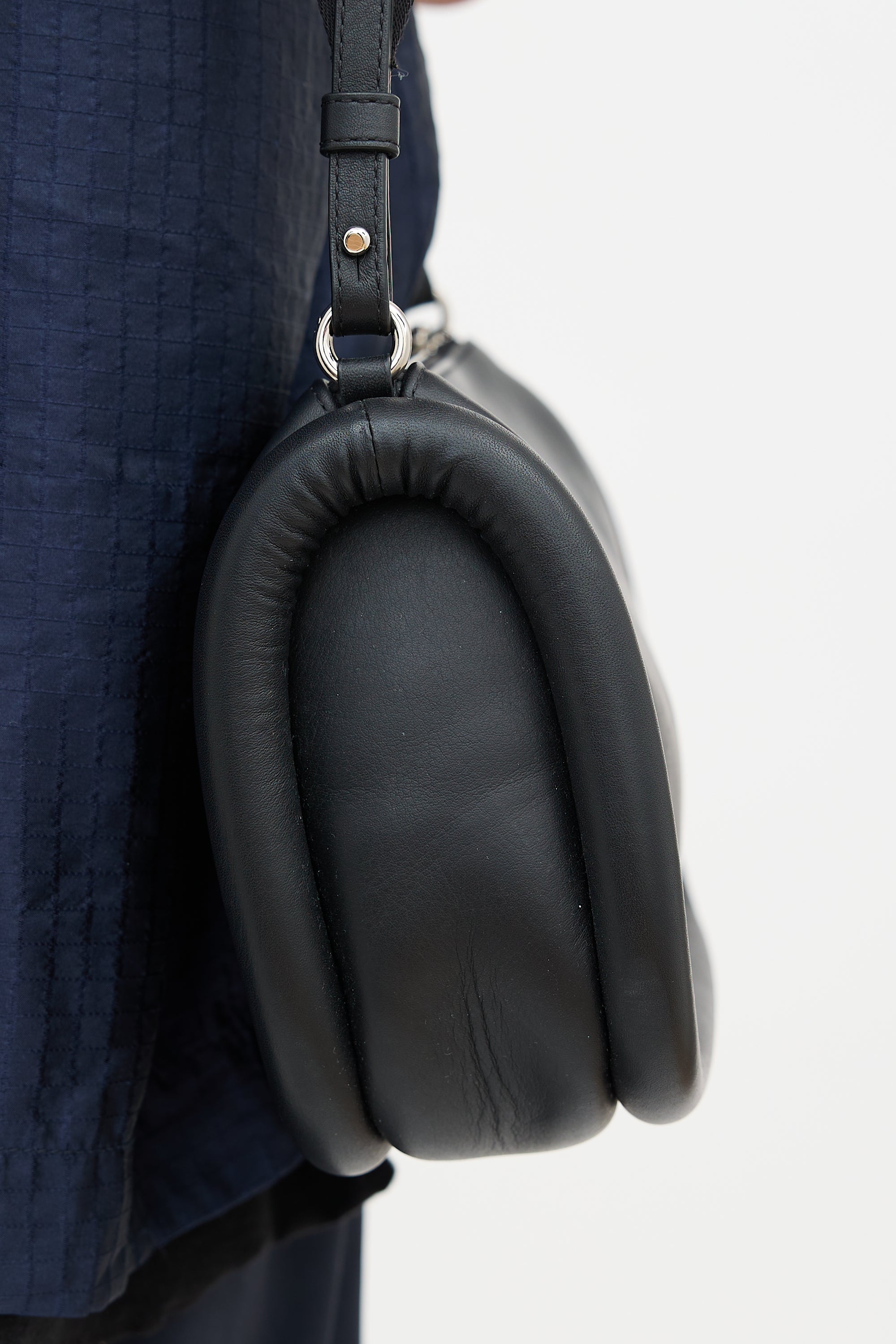 Pre-owned JW Anderson black leather Bumper 17 bag featuring a detachable and adjustable logo debossed crossbody strap, silver tone stamped logo at front, zip top closure, one interior slip pocket, and padded sides. Includes original dust bag.
