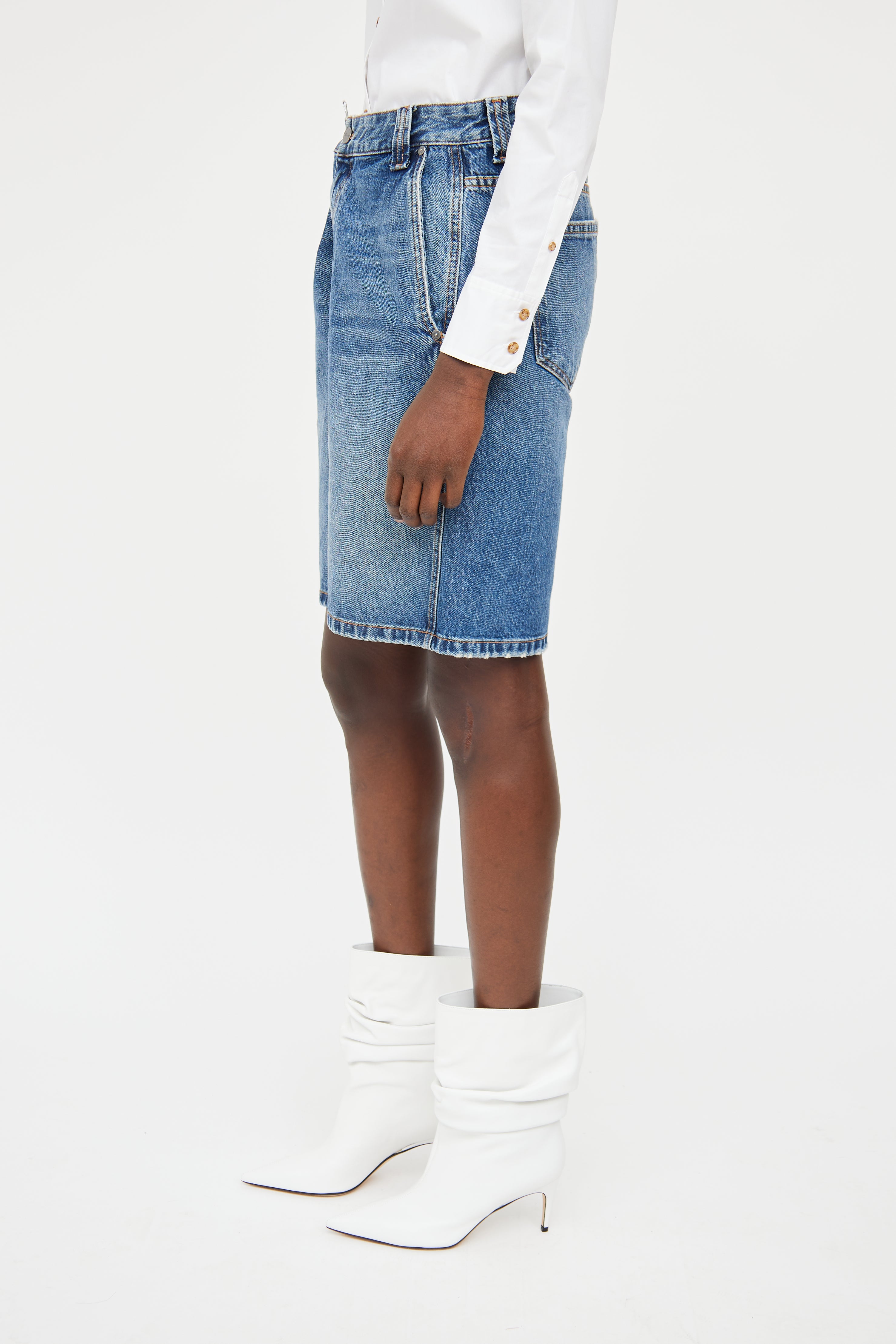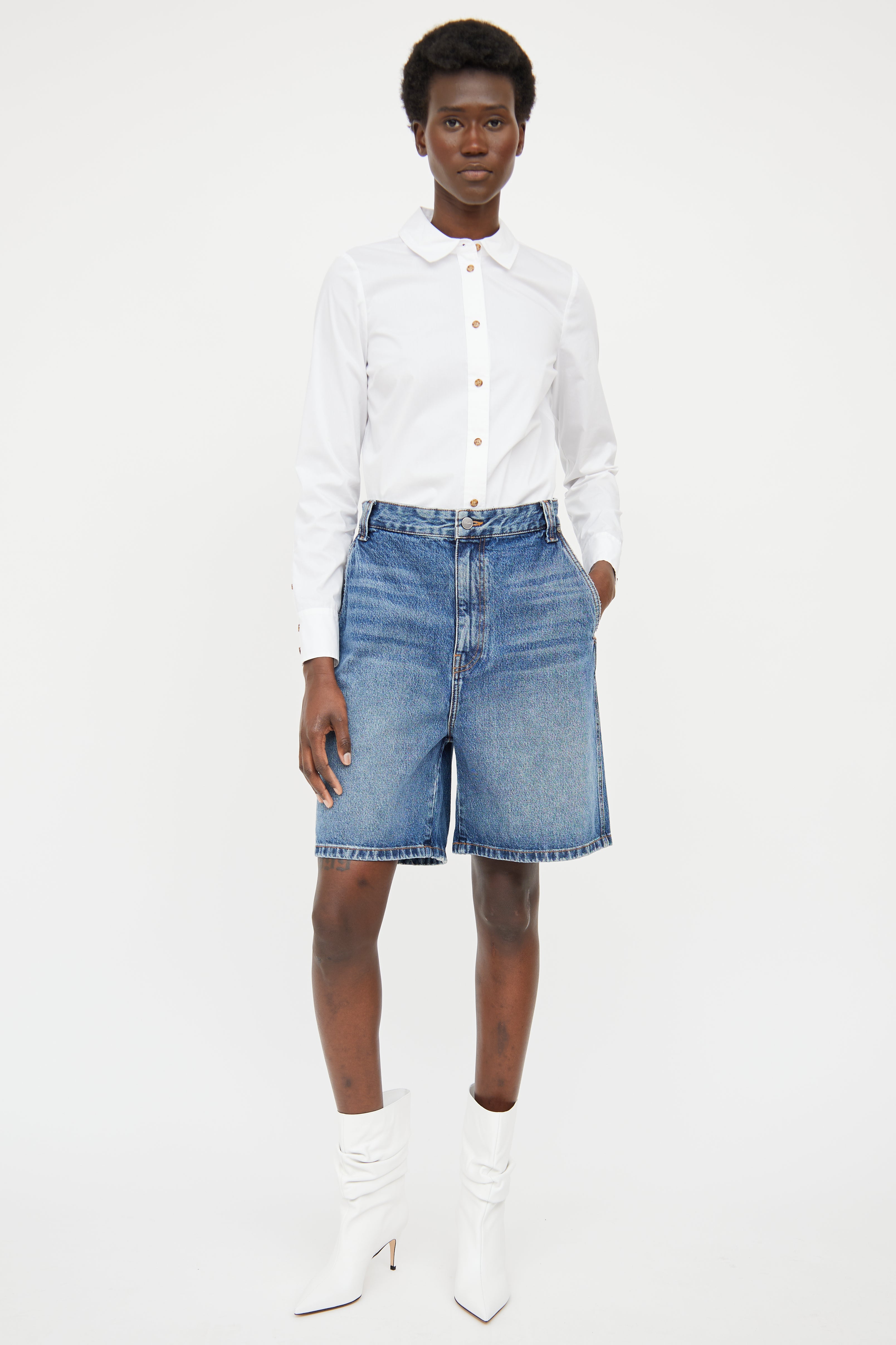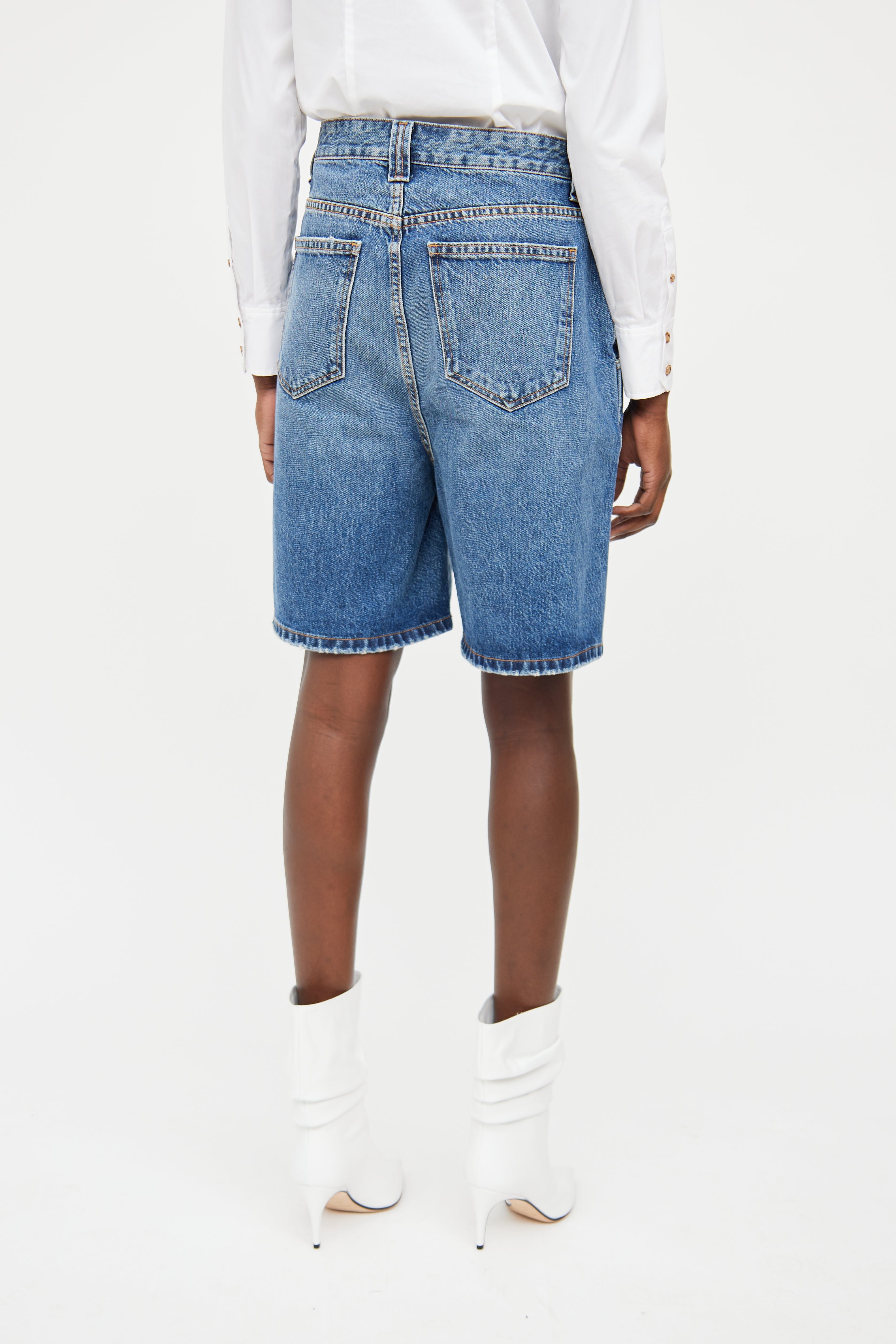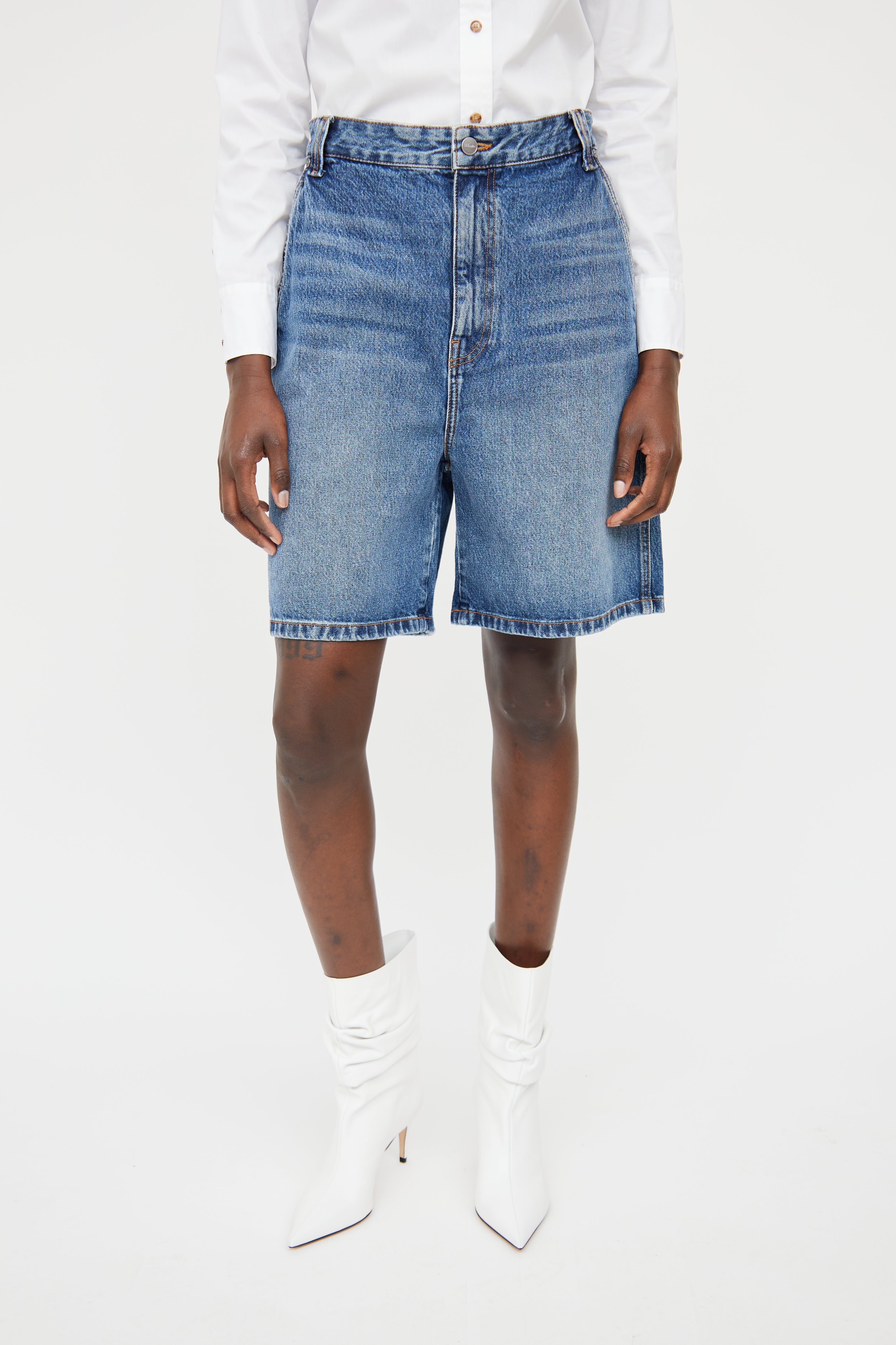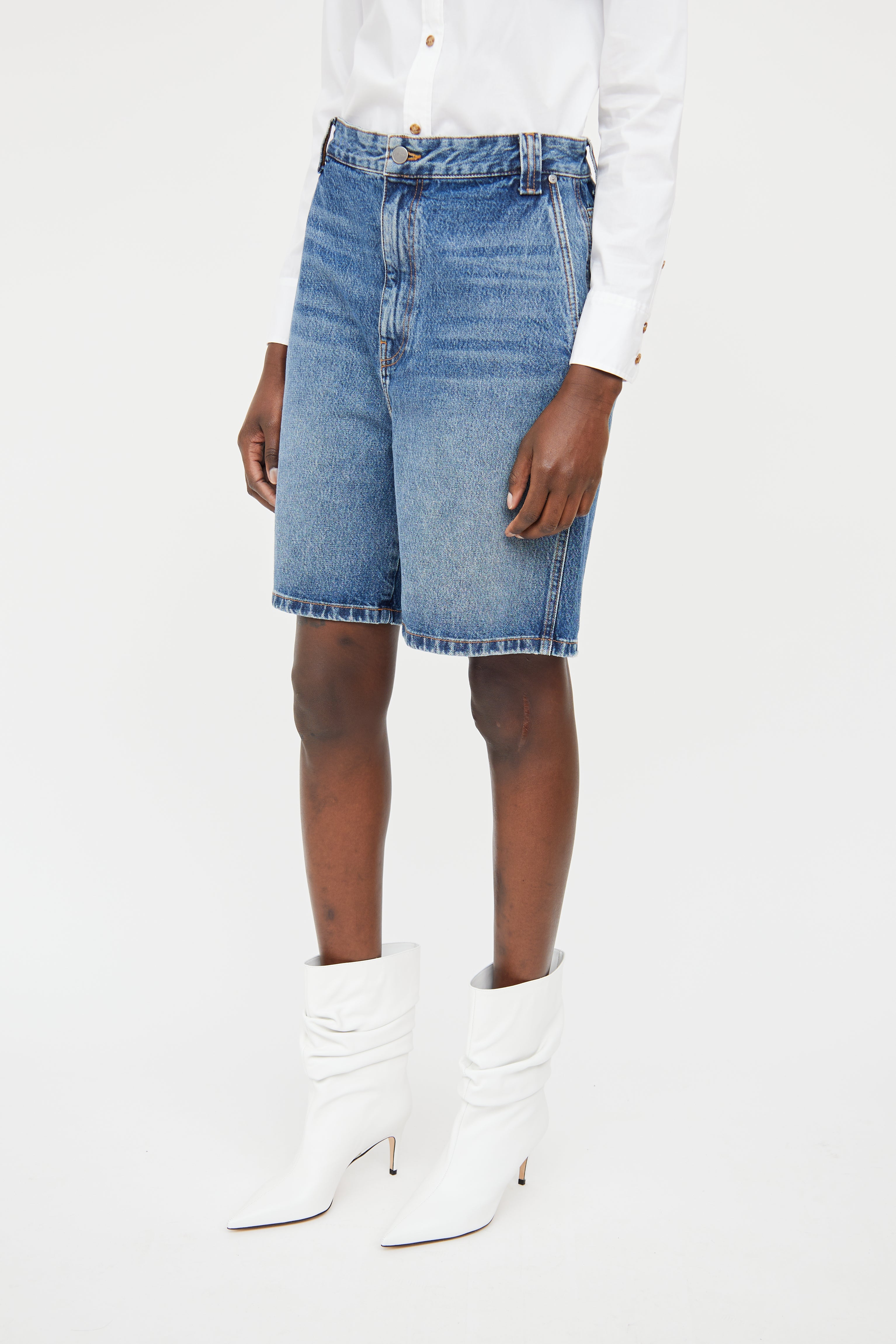 Pre-owned Khaite Nia jean shorts featuring button closure waist with belt loops, dual slip pockets at hip, medium wash, and dual slip pockets at back.