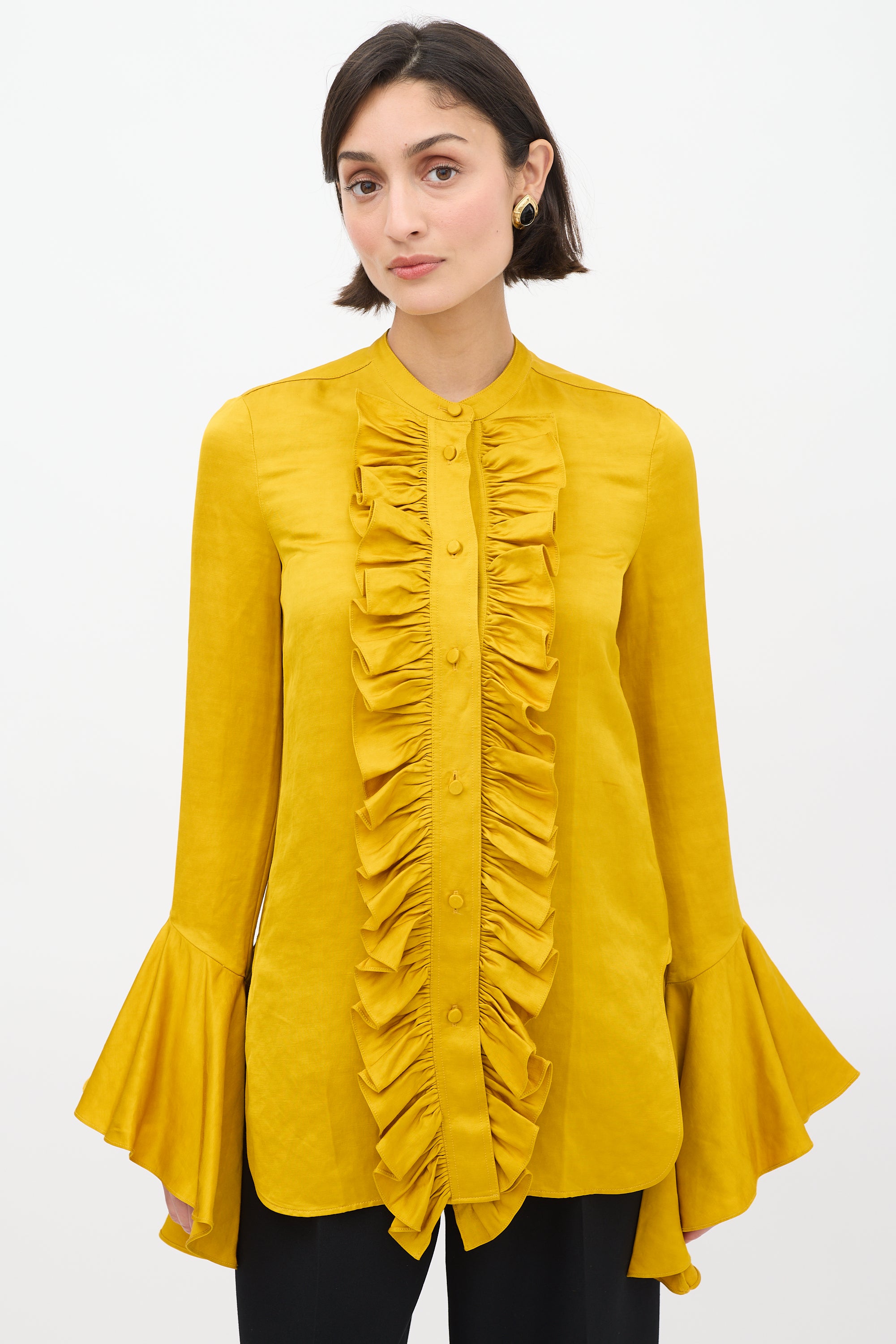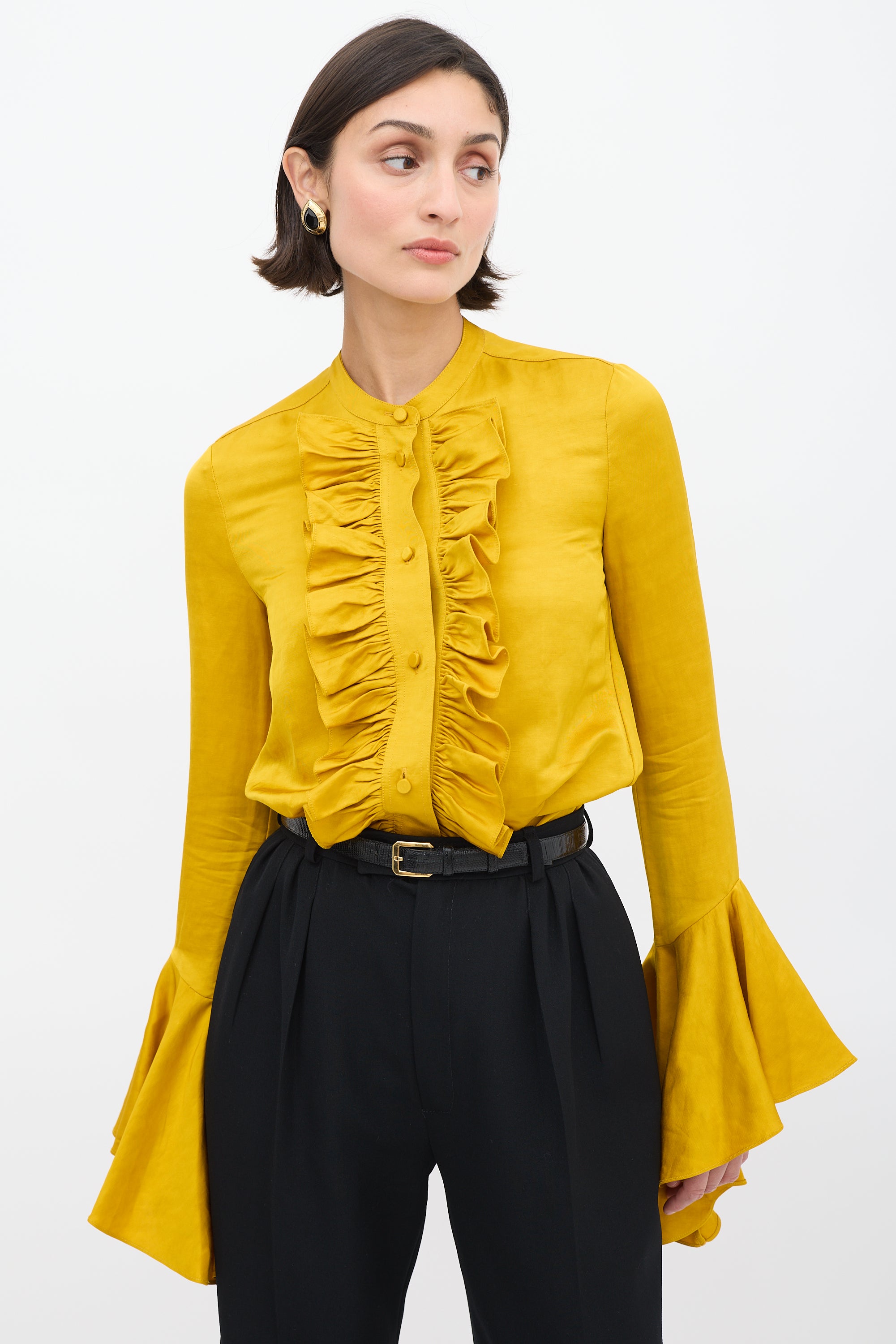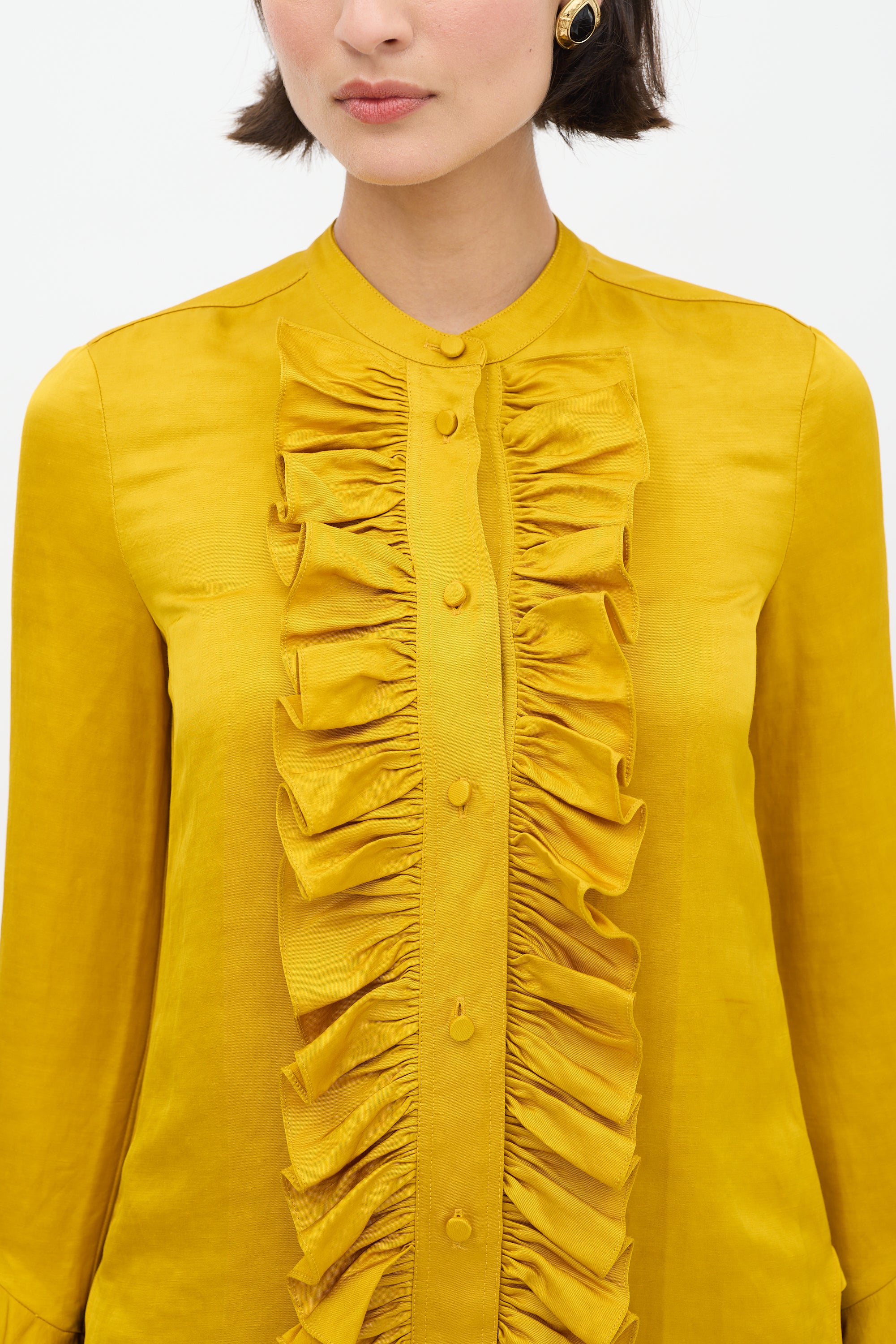 Pre-owned Khaite mustard linen blend shirt featuring a stand collar, button up front with ruffle insert, pleating at back yoke, curved hem, and long sleeves with flounced cuffs.