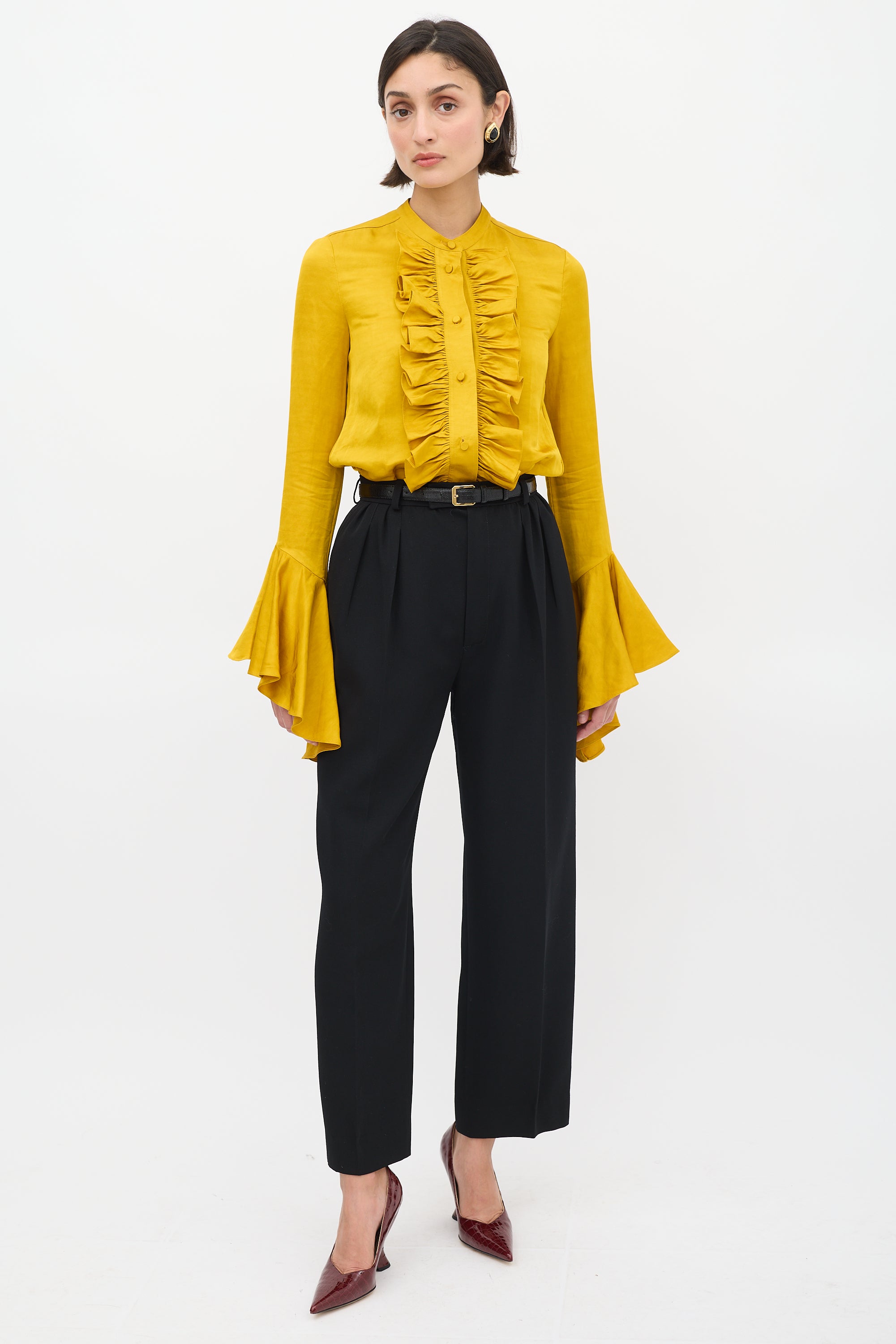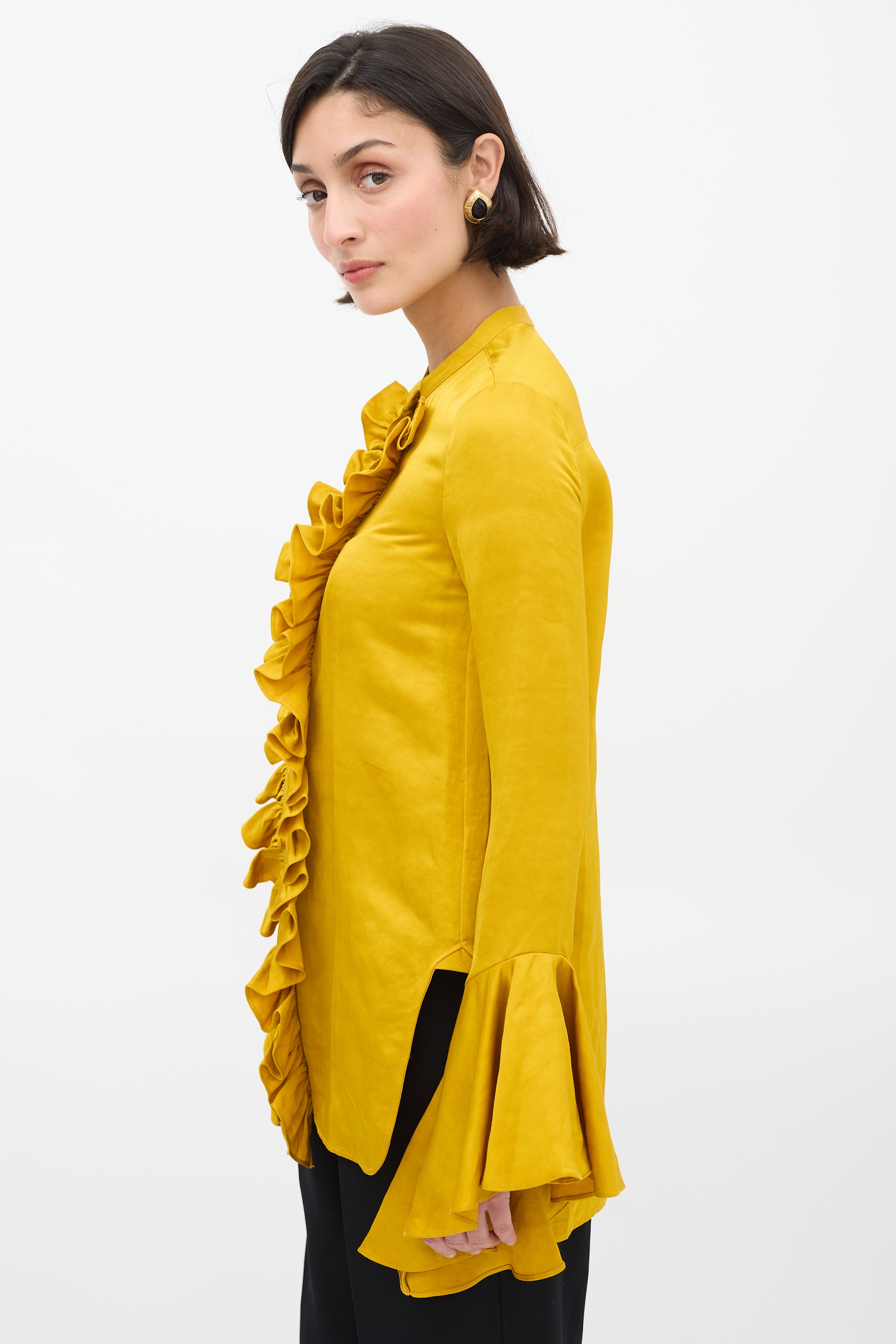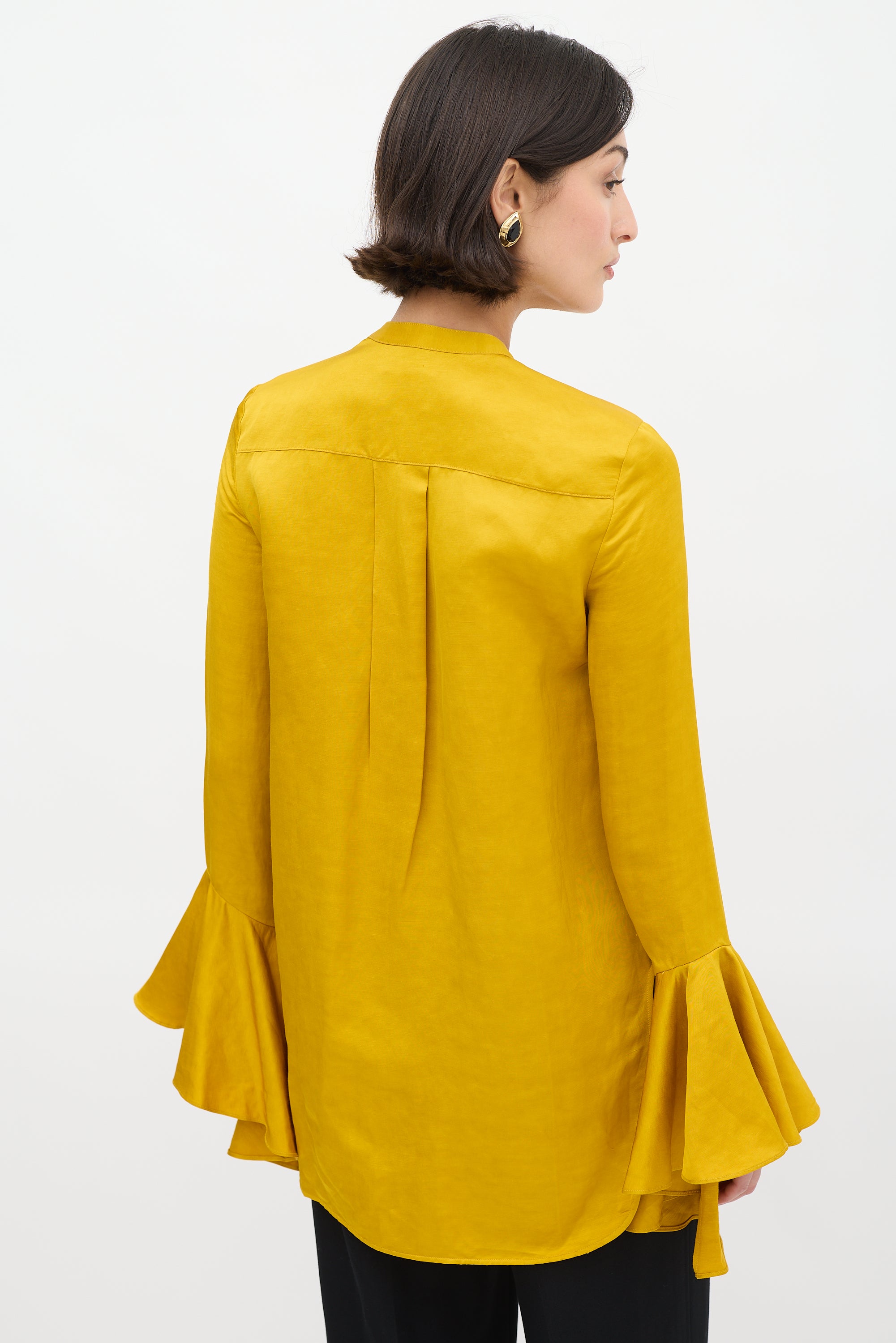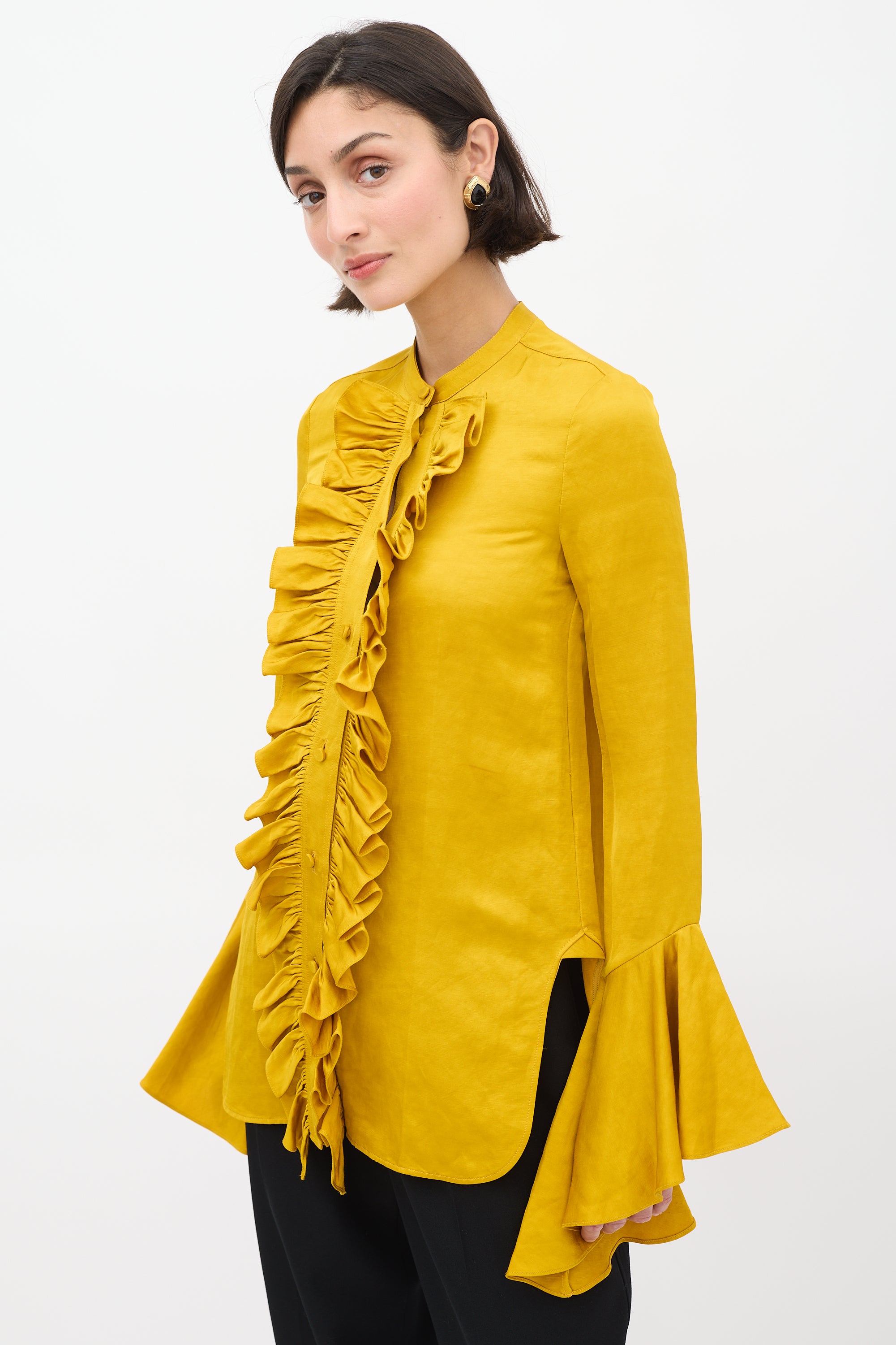 Pre-owned Khaite mustard linen blend shirt featuring a stand collar, button up front with ruffle insert, pleating at back yoke, curved hem, and long sleeves with flounced cuffs.