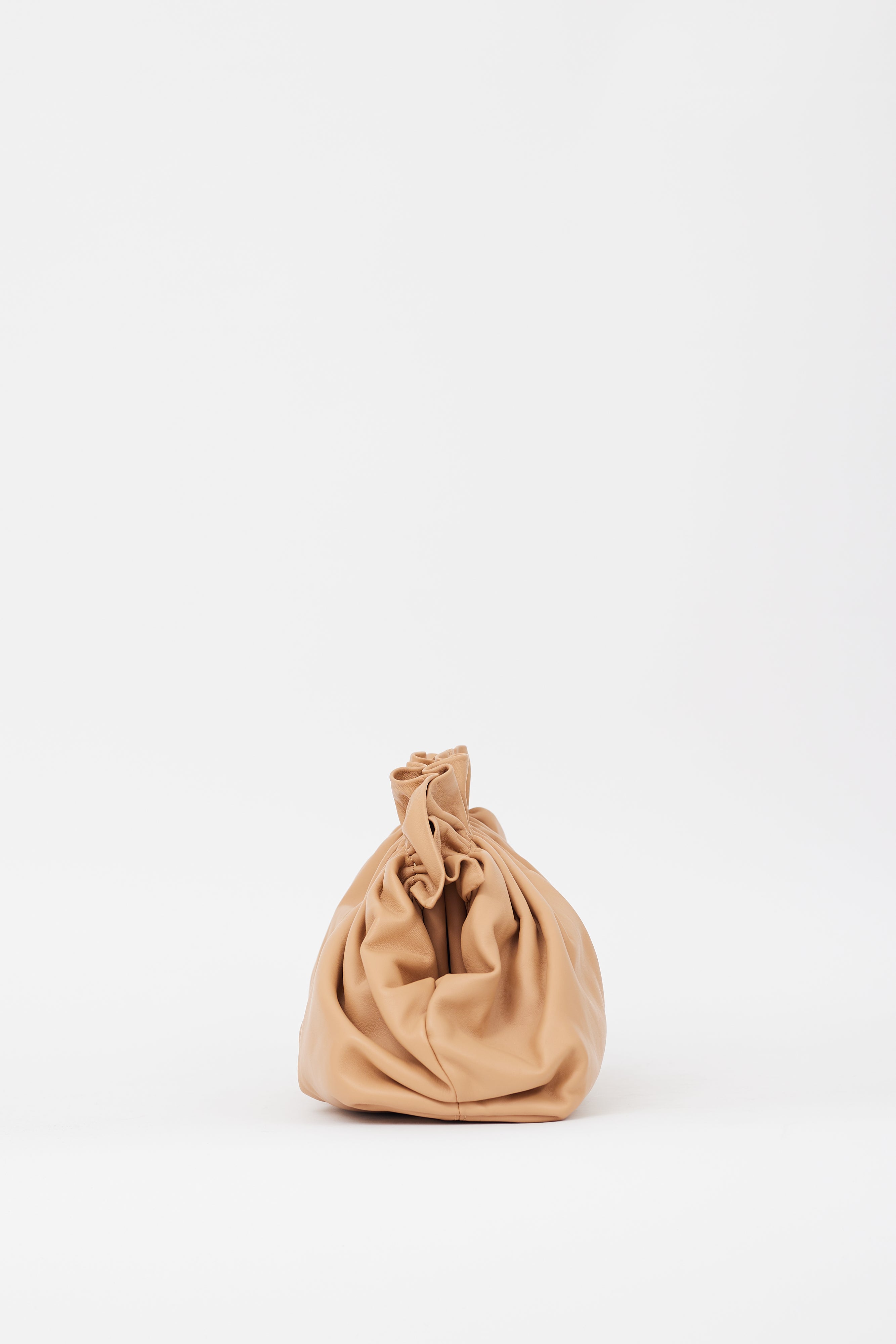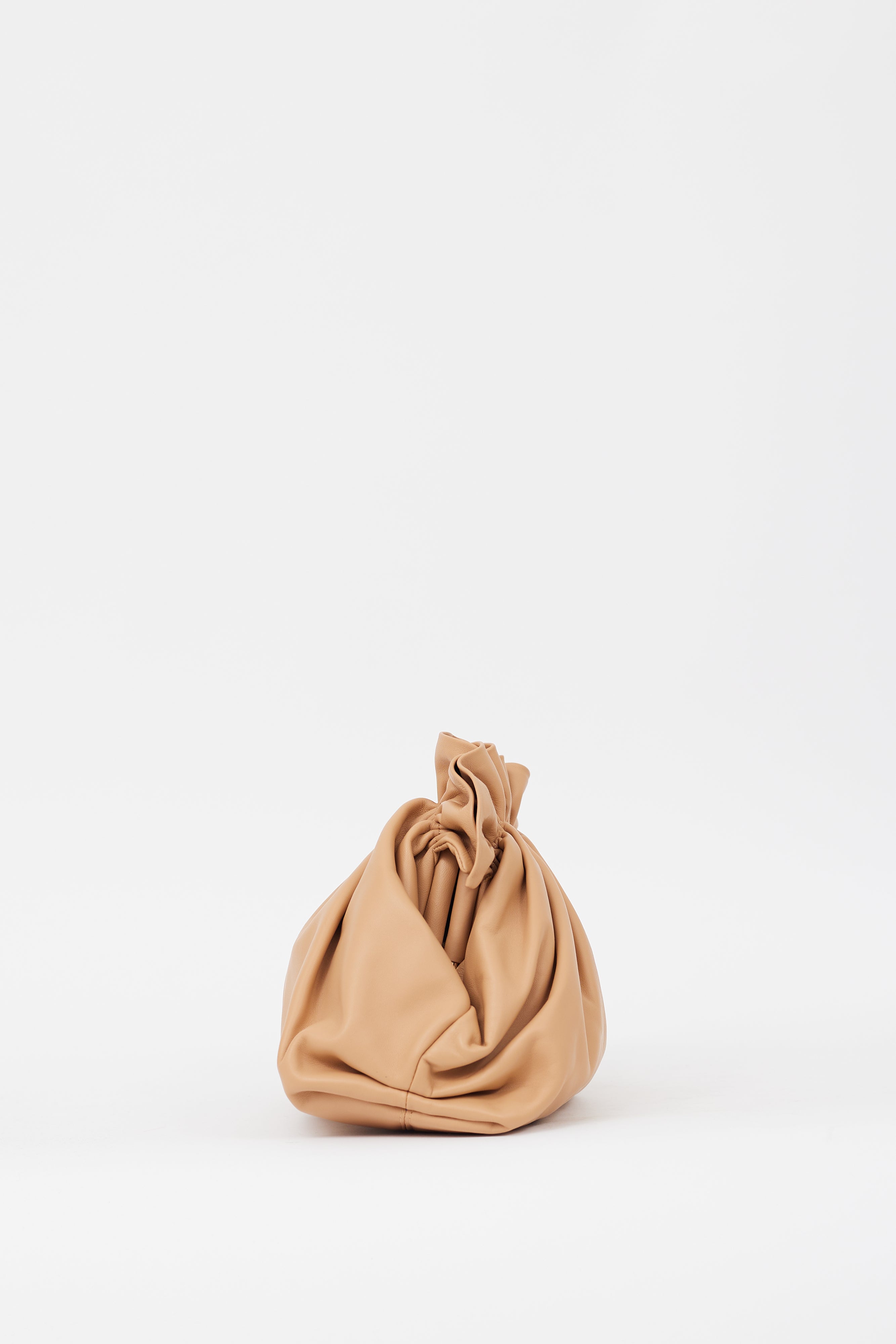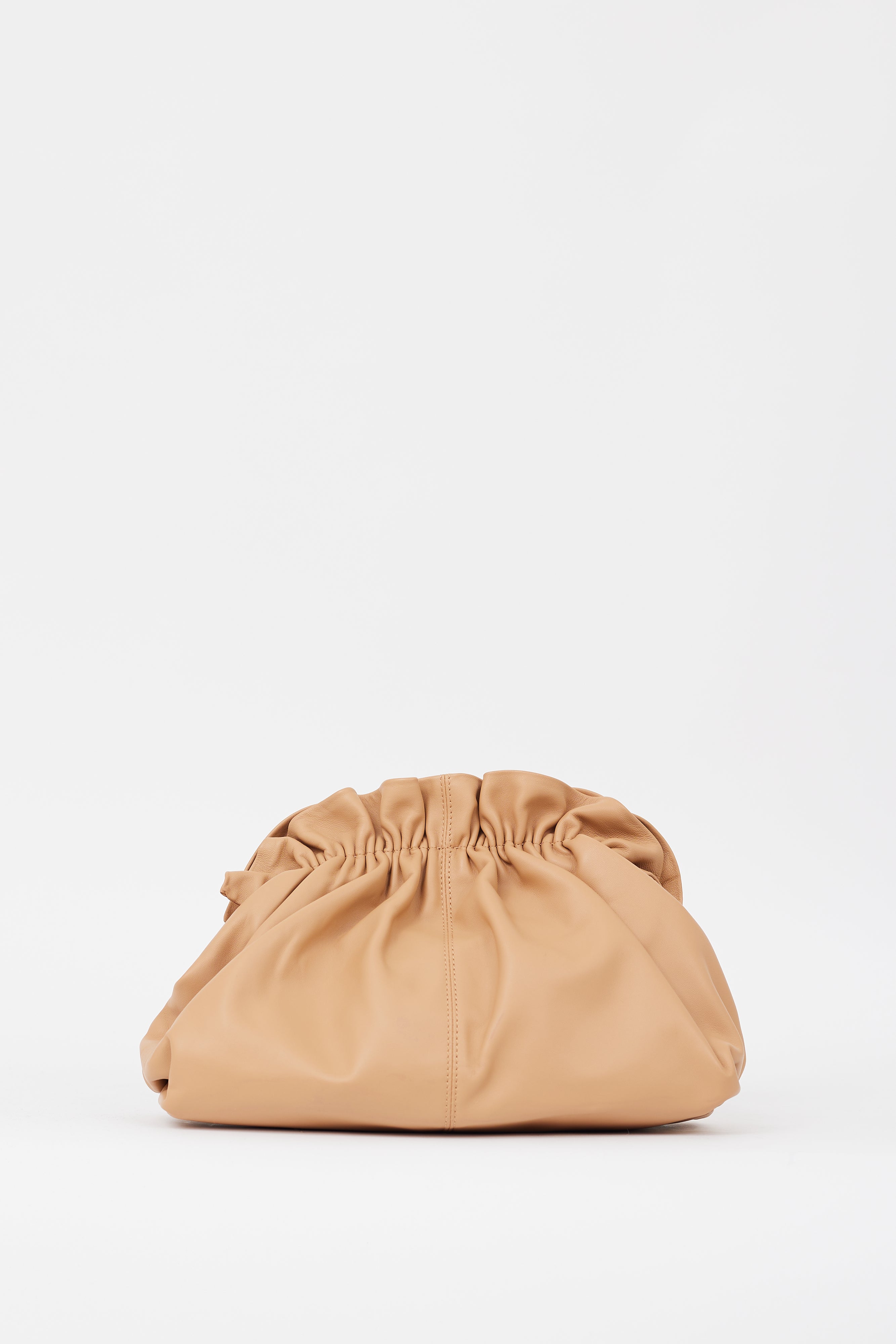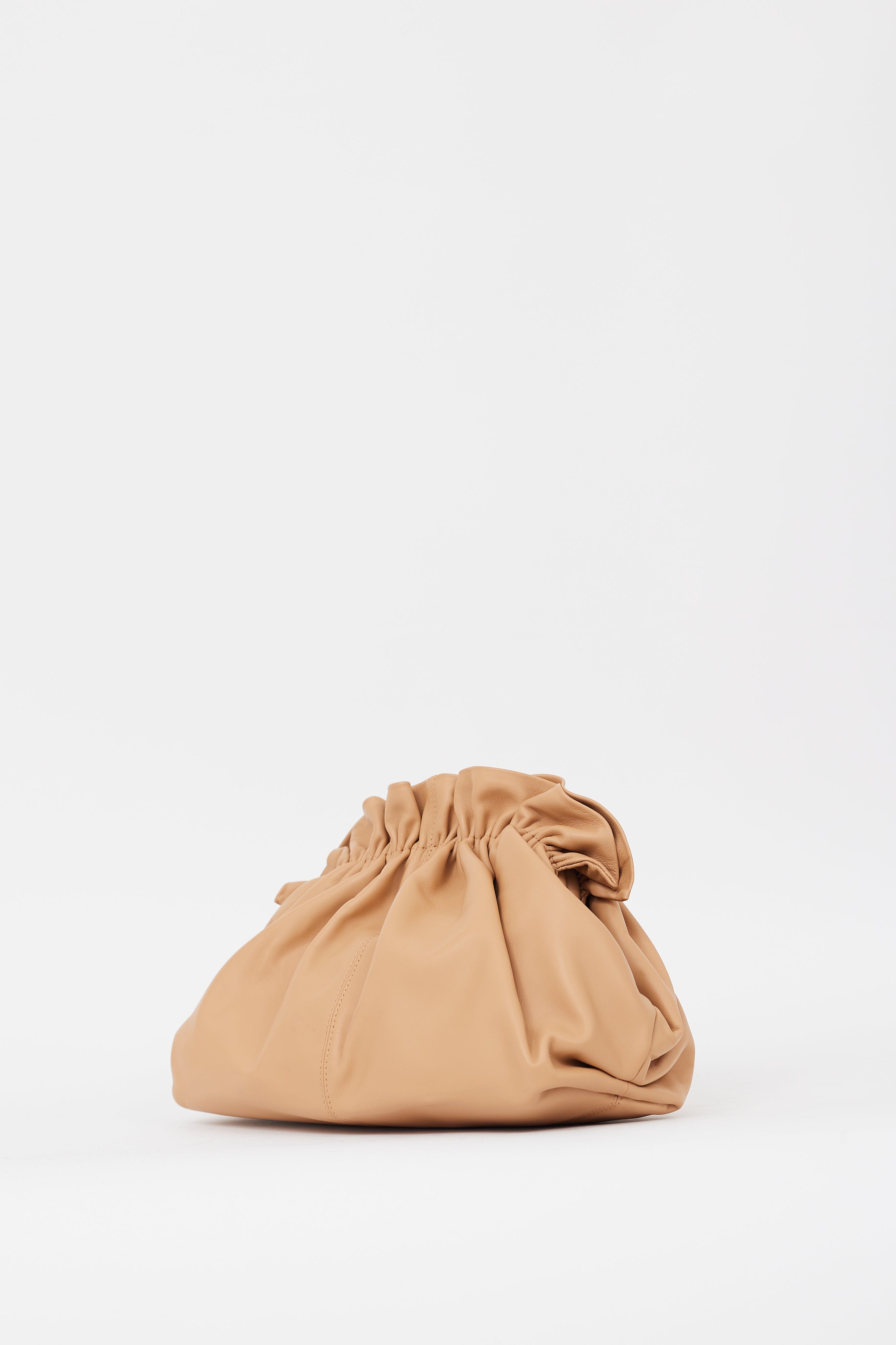 Pre-owned Loeffler Randall brown leather Willa Clutch bag featuring a ruffled top edge, top frame, detachable gold tone twisted chain strap, and one lined main compartment with single slip pocket. Lined. Comes with original dust bag.
