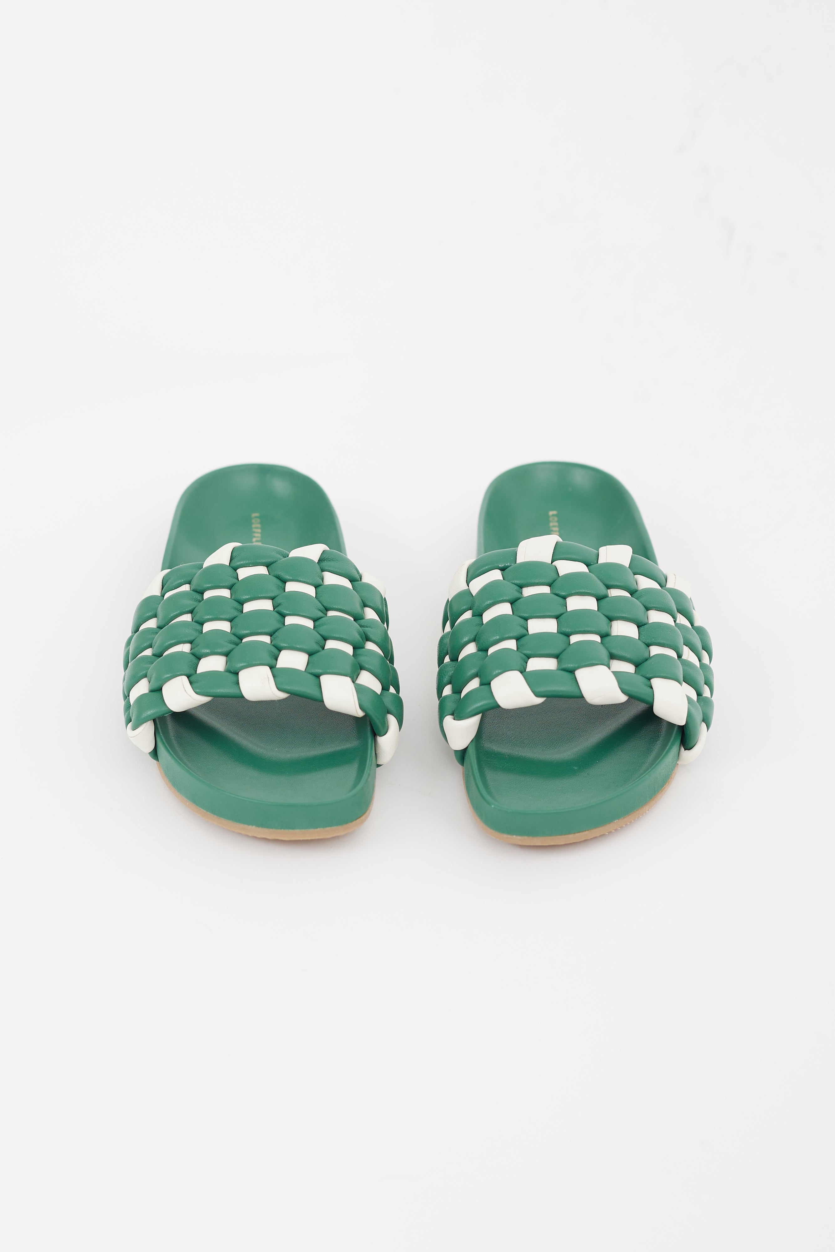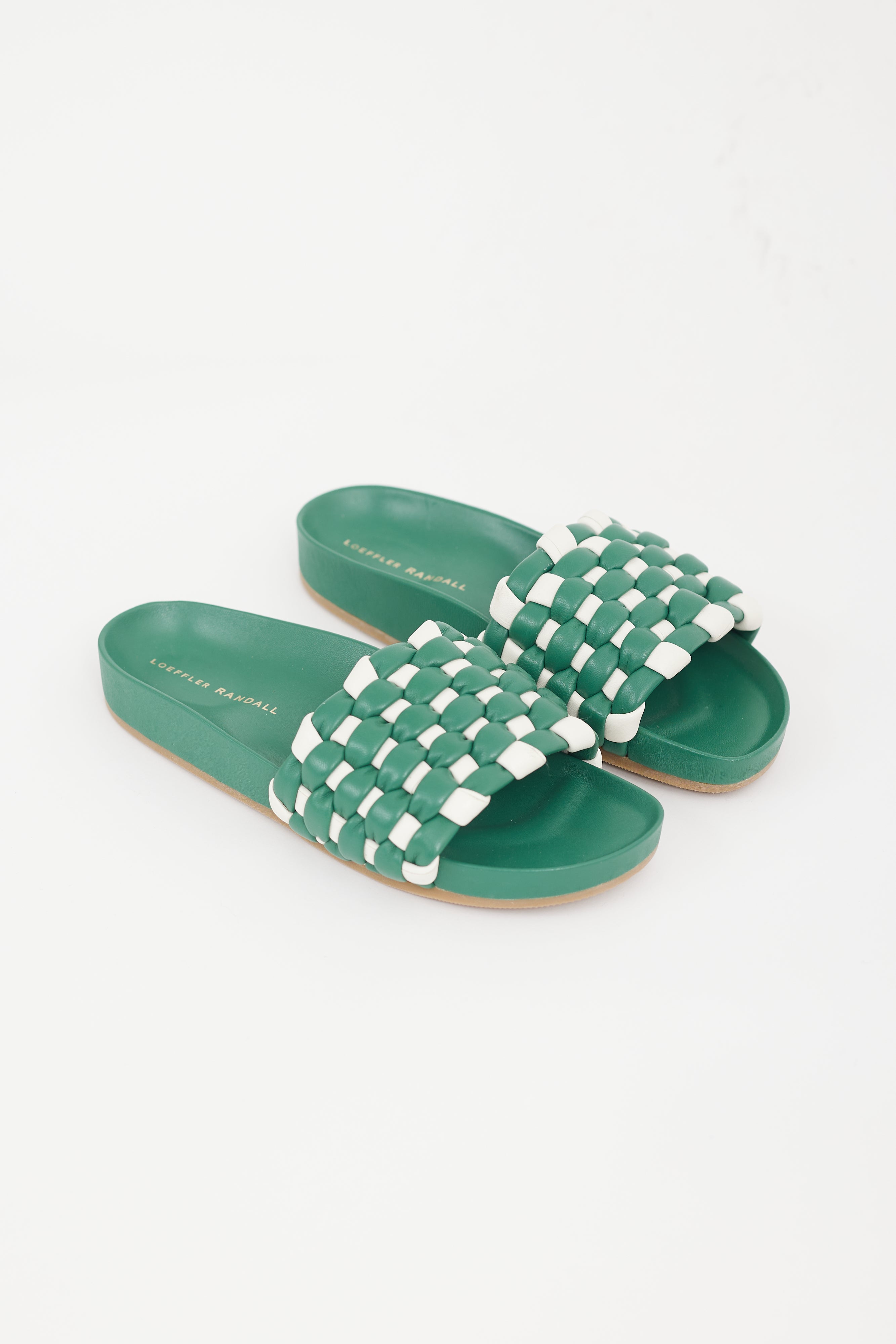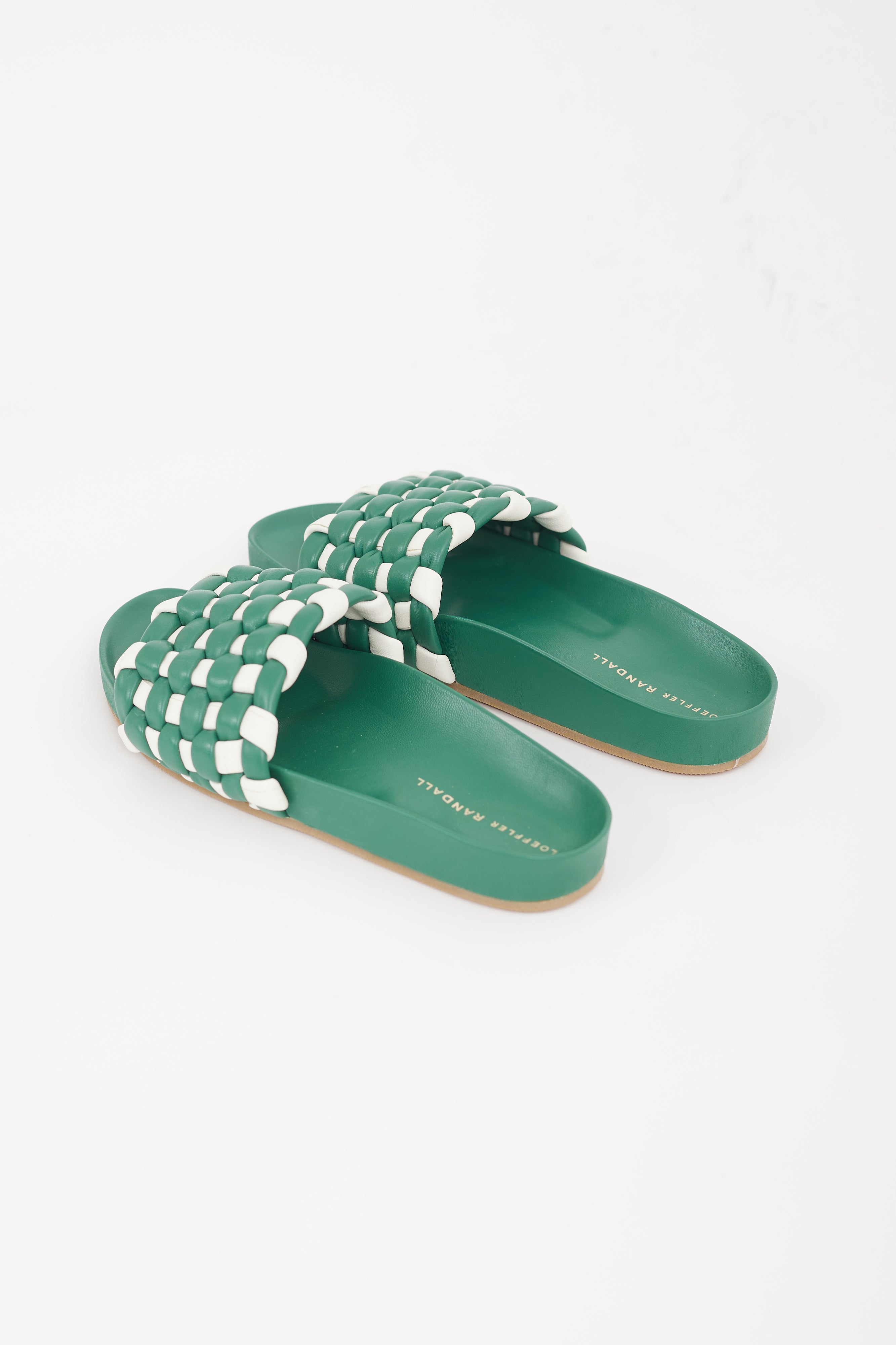 Pre-owned Loeffler Randall green Sonnie slides featuring an open round toe, white woven upper, and embossed logo at insole.