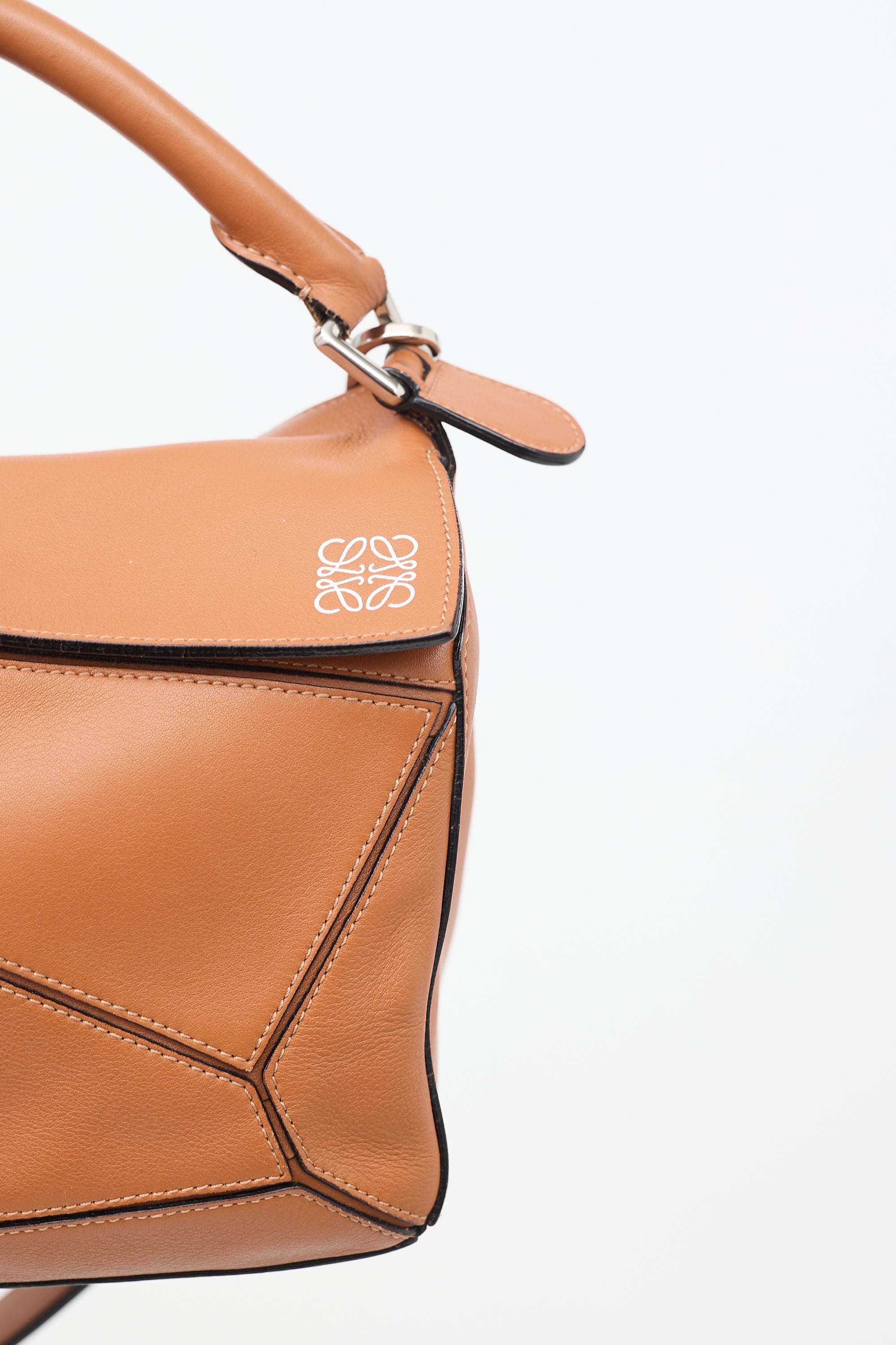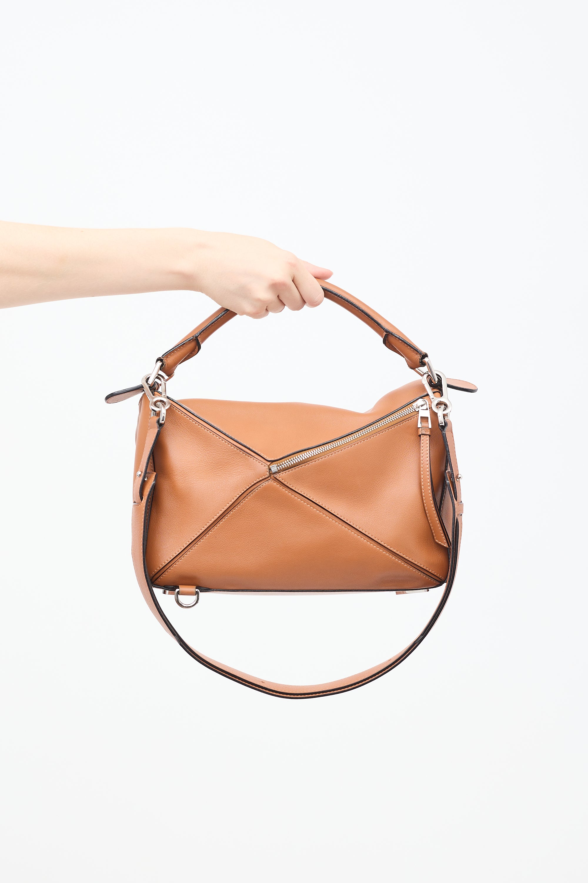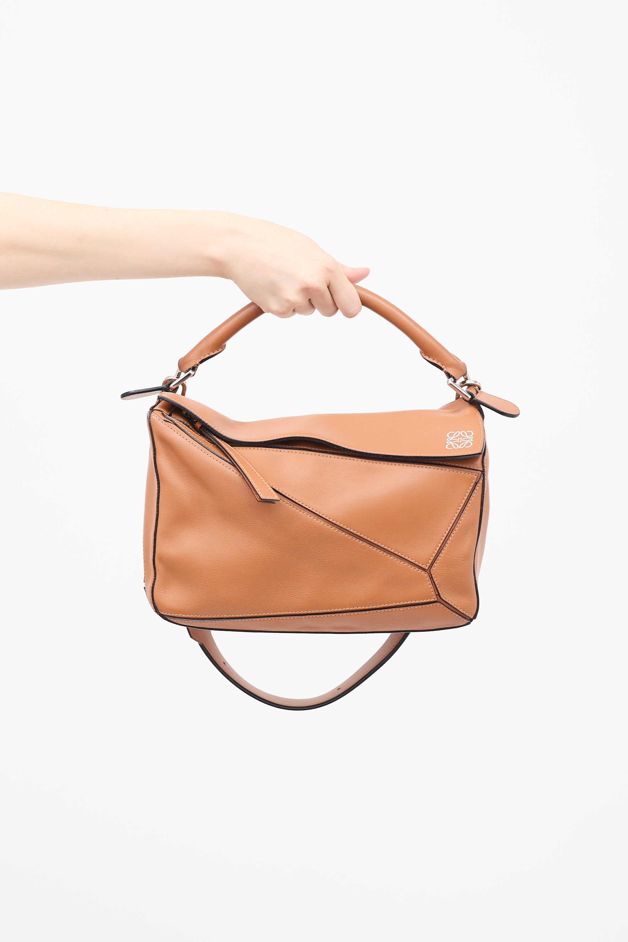 Pre-owned Loewe 2016 brown leather medium Puzzle bag featuring tonal stitching silver tone hardware, four protective feet at base, panelled design, one zip pocket and D ring at back side, single rolled top handle, detachable and adjustable shoulder strap, top flap with white stamped logo, concealed top zip closure with long leather pull tab, and one canvas lined main compartment with two slip pockets. Comes with original dust bag.