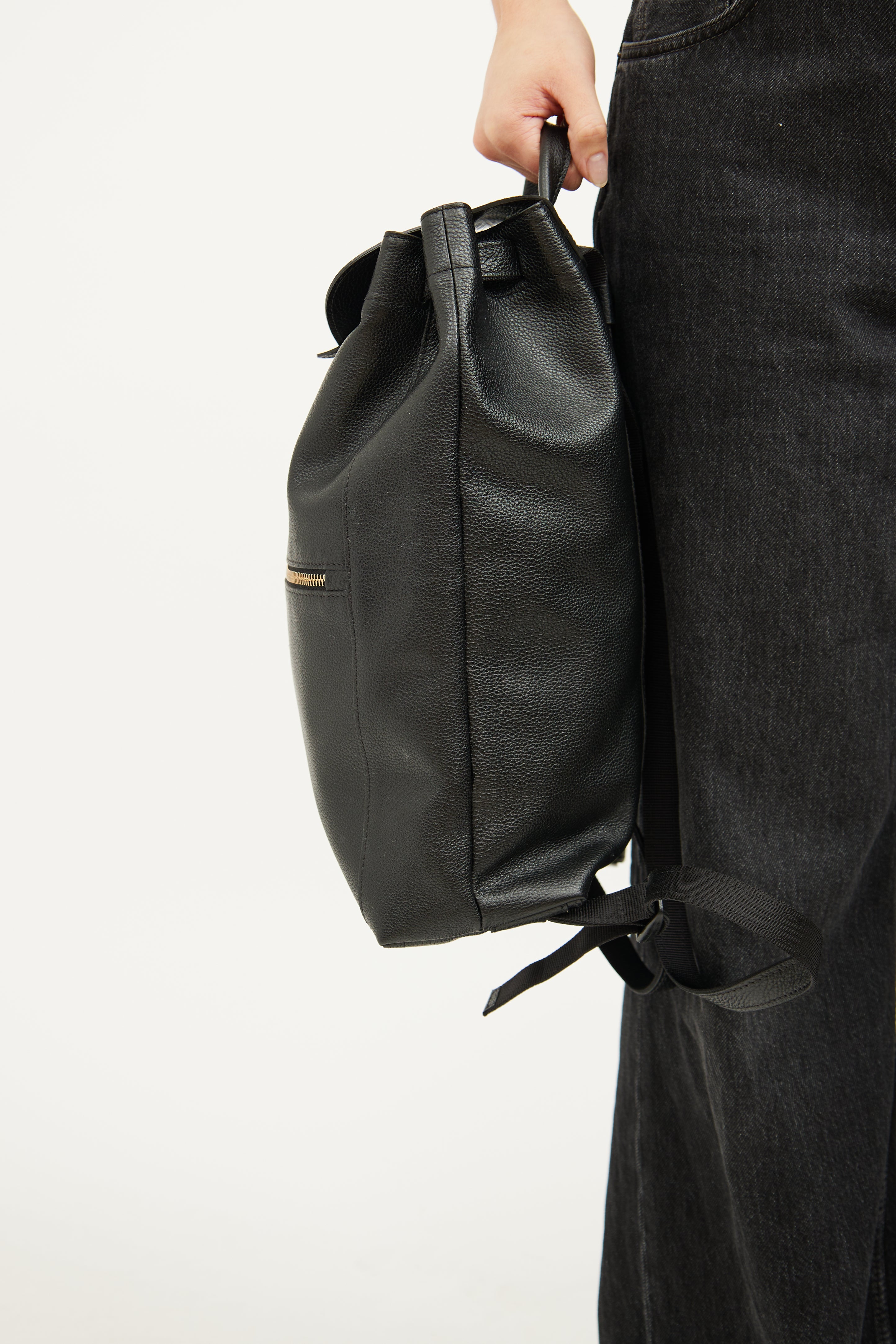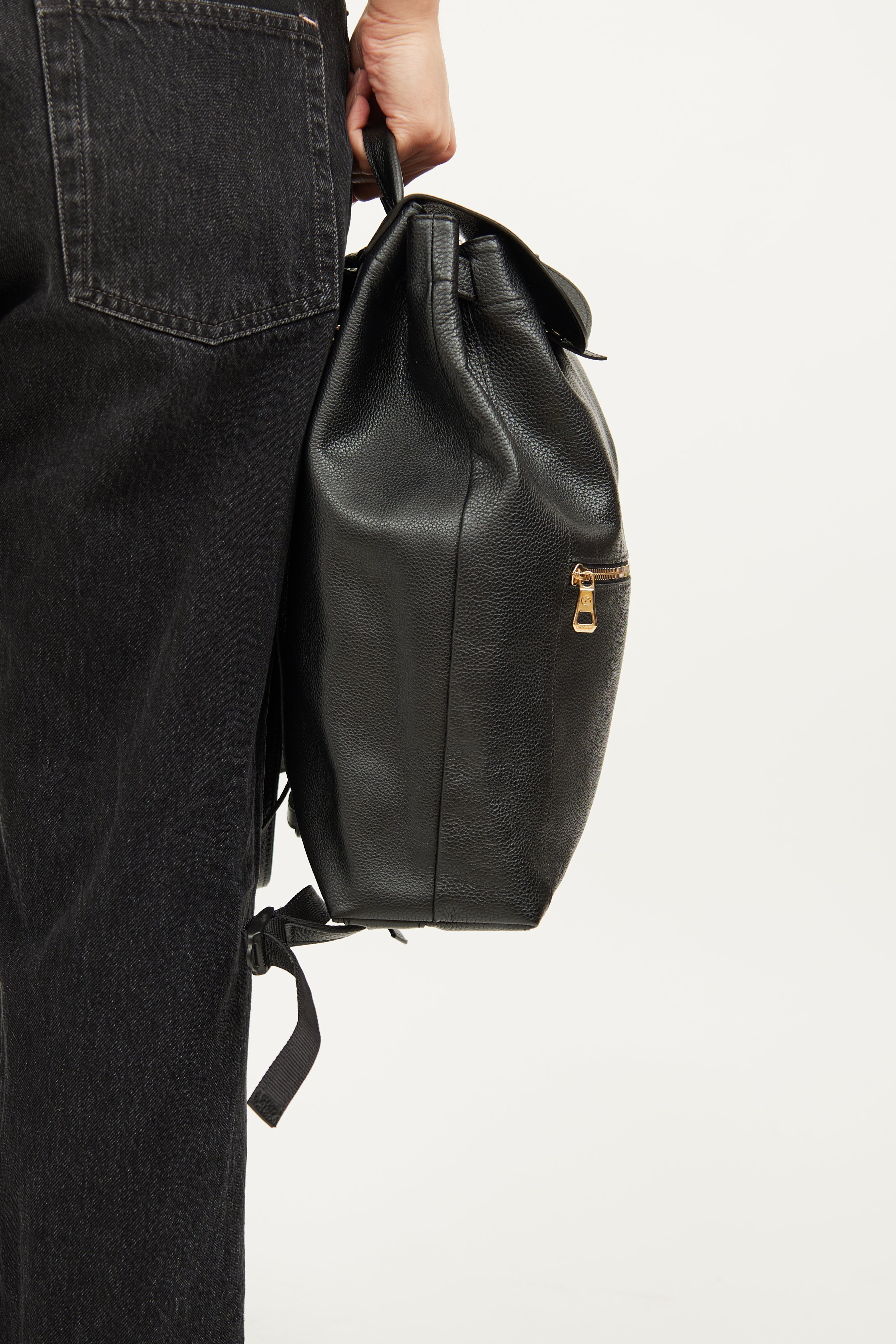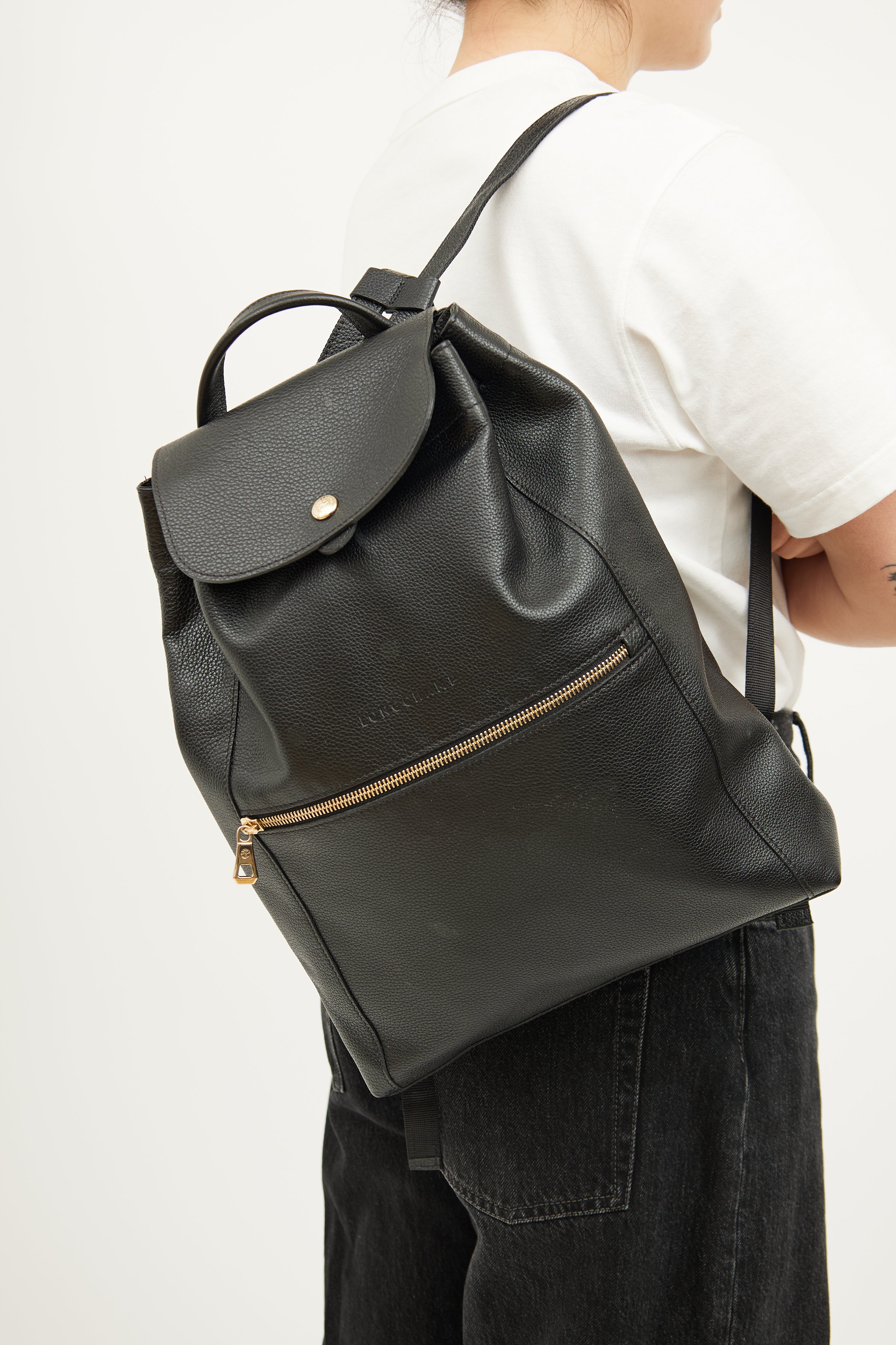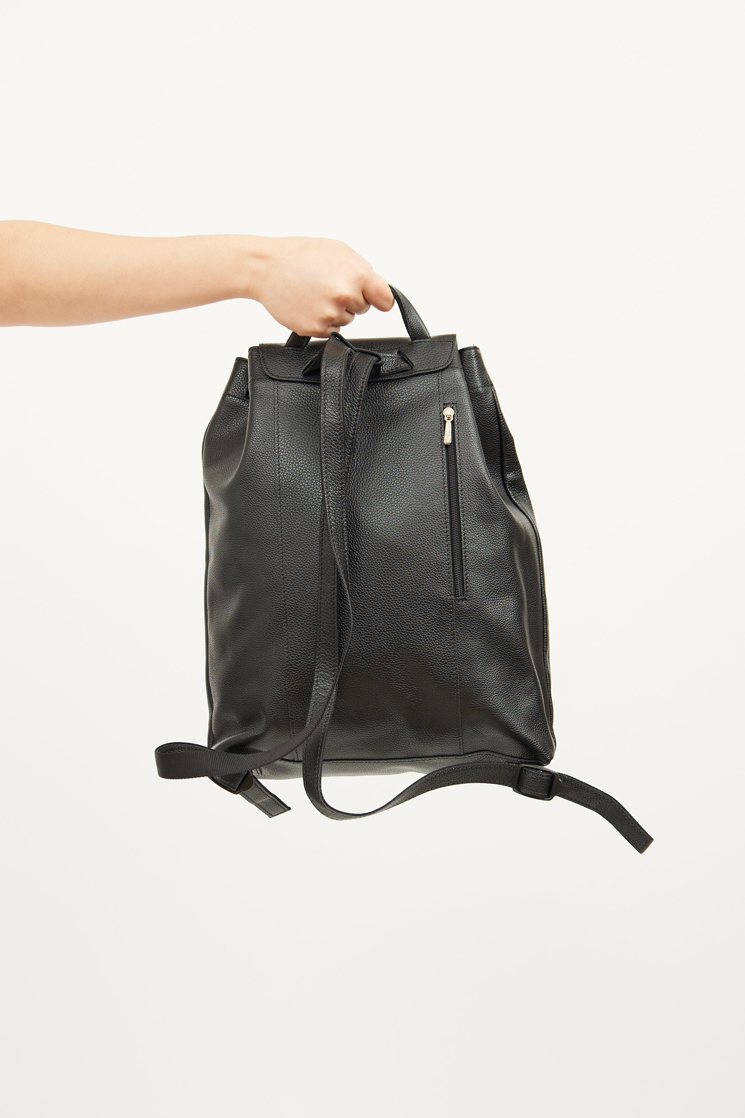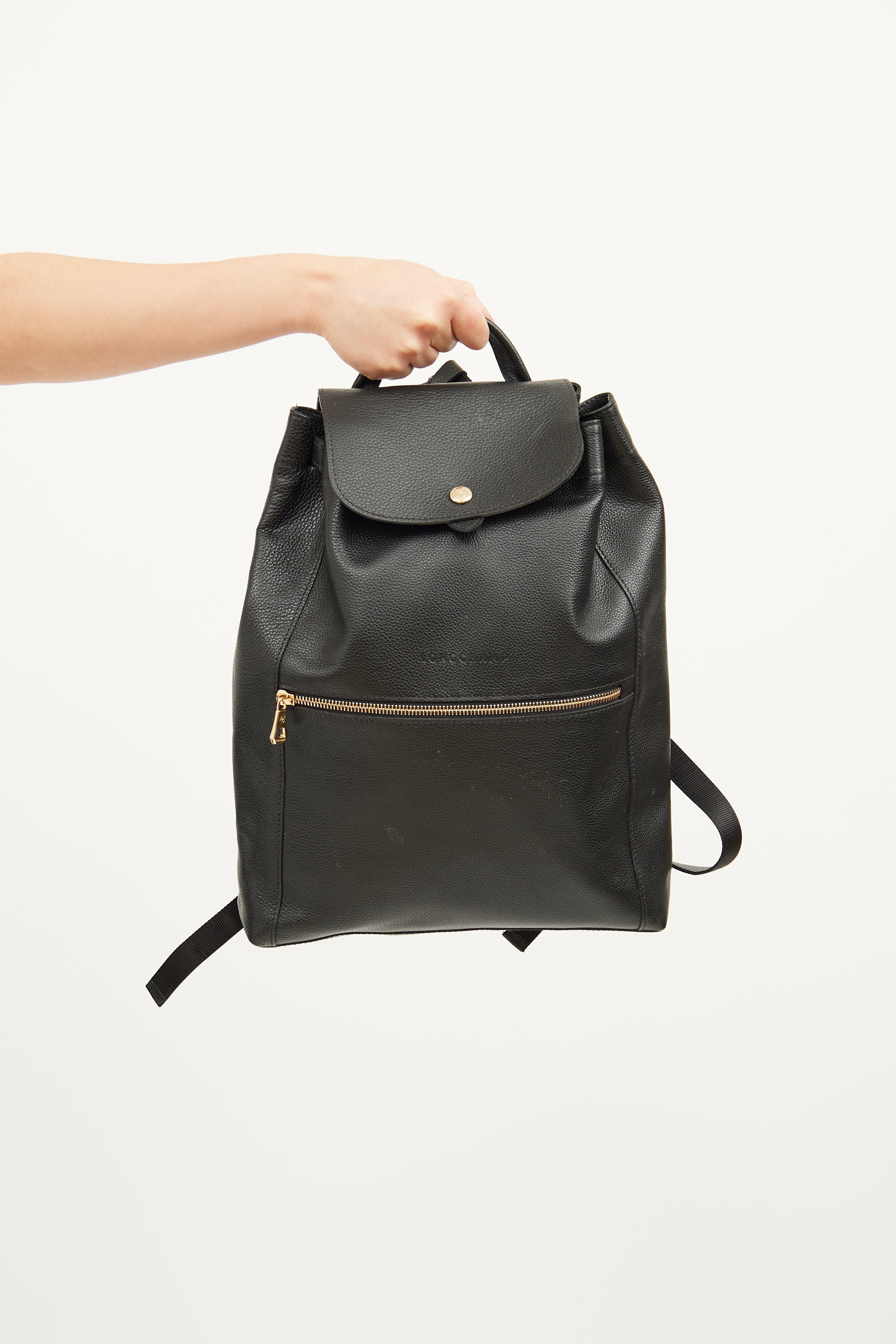 Pre-owned Longchamp black leather Le Foulonne backpack featuring pebbled leather, top handle and dual flat adjustable shoulder straps, gold tone hardware, zip pocket on back, zip pocket on front and drawstring and flap with snap button closure. Nylon lined main compartment.