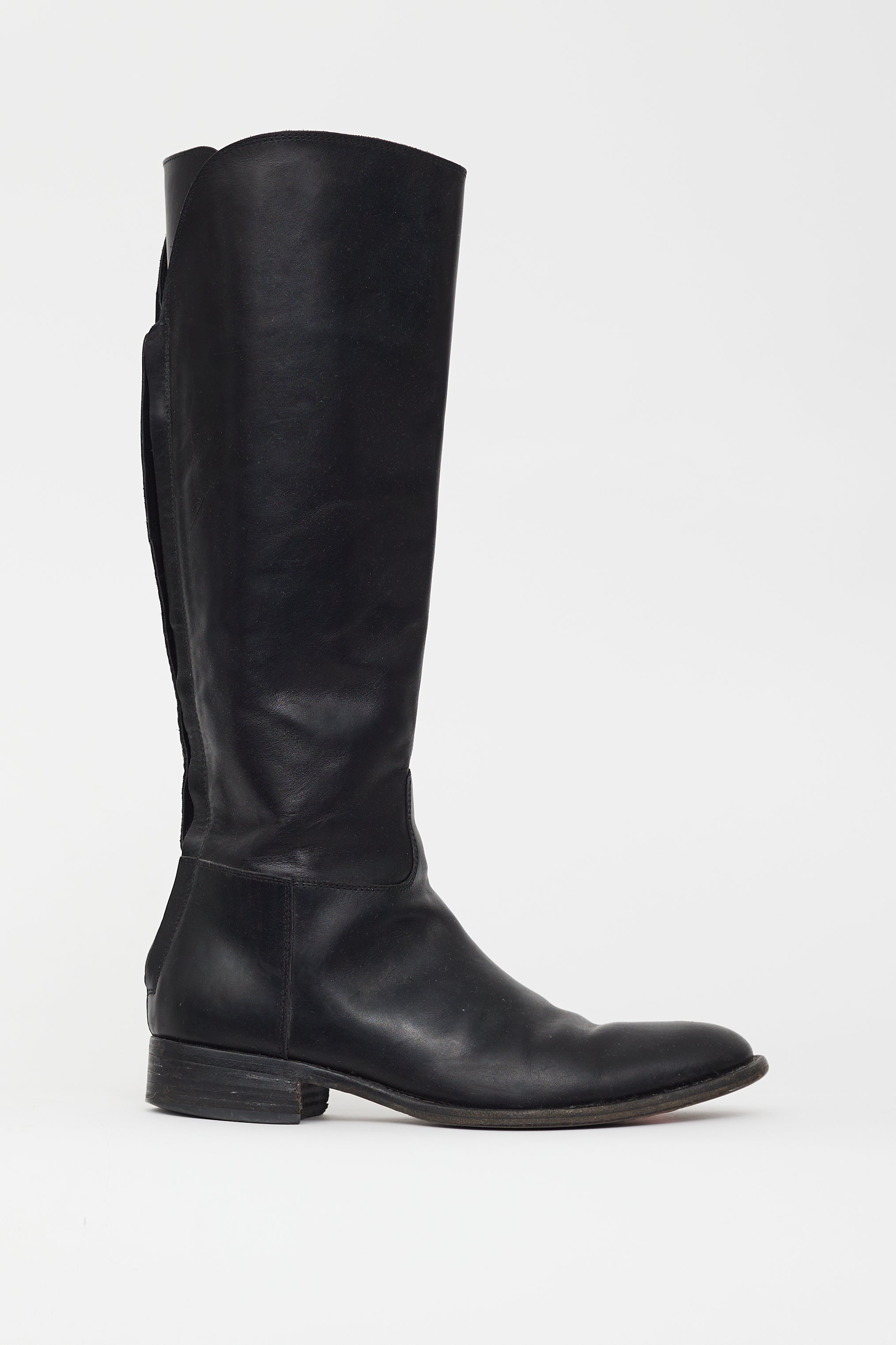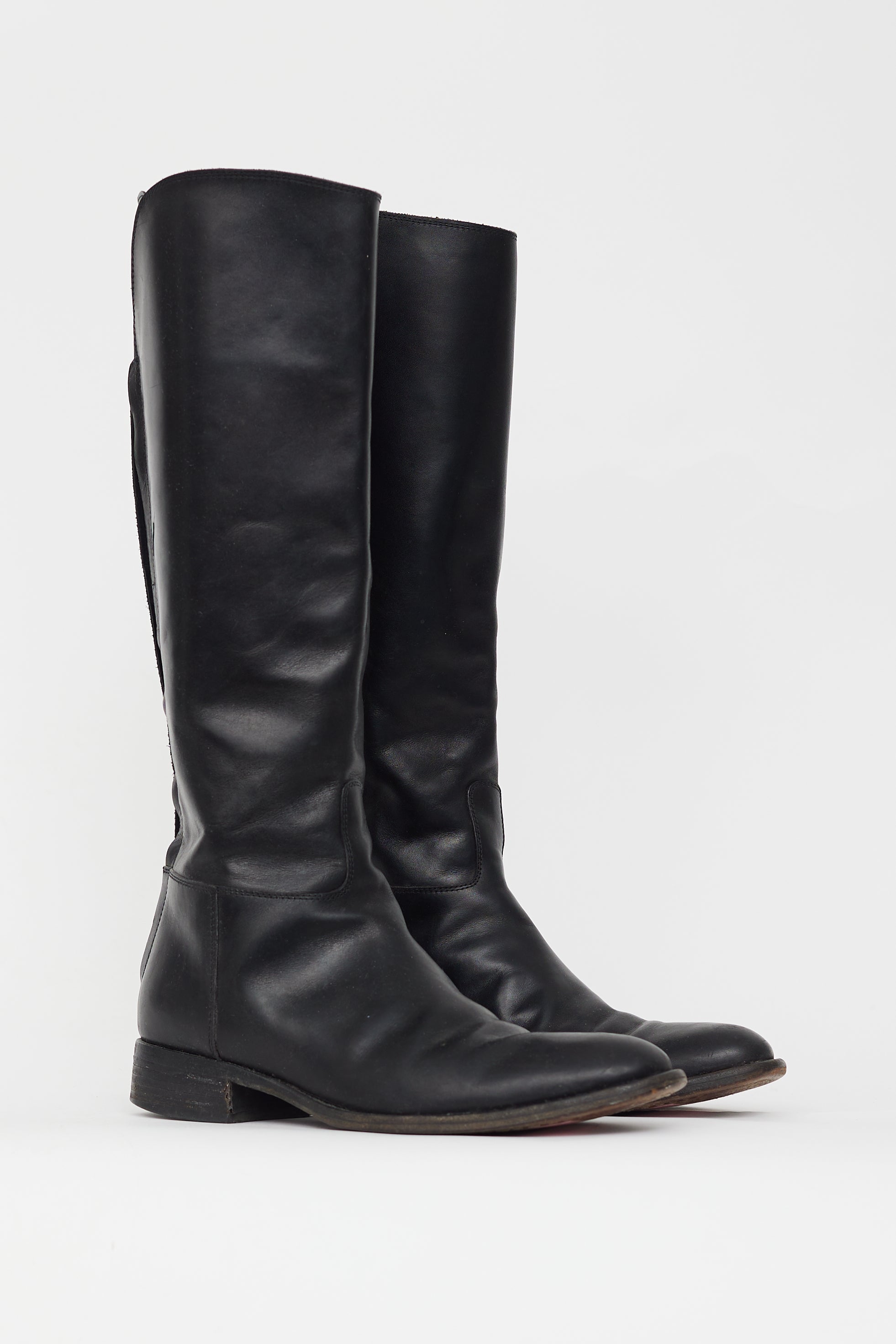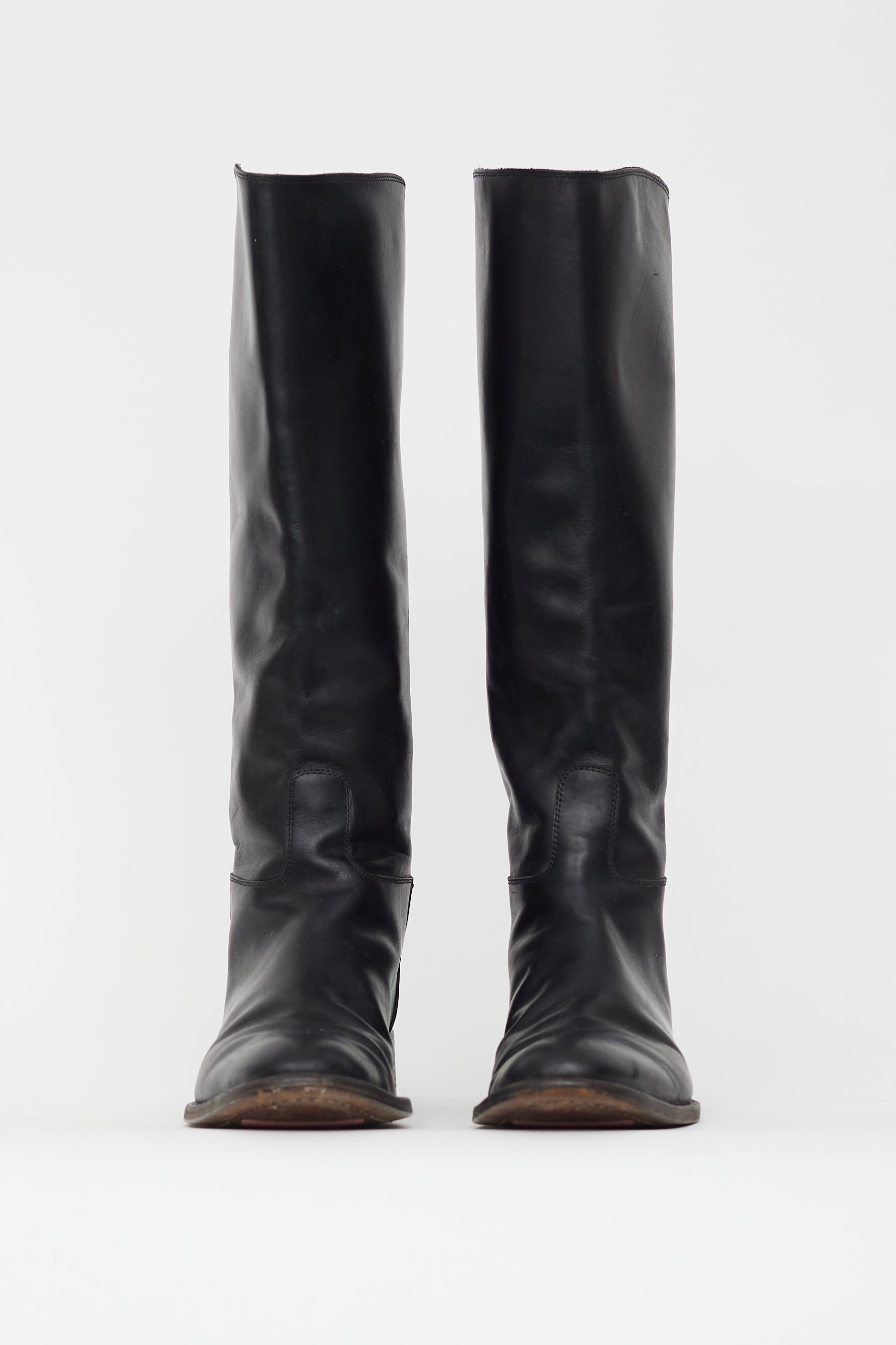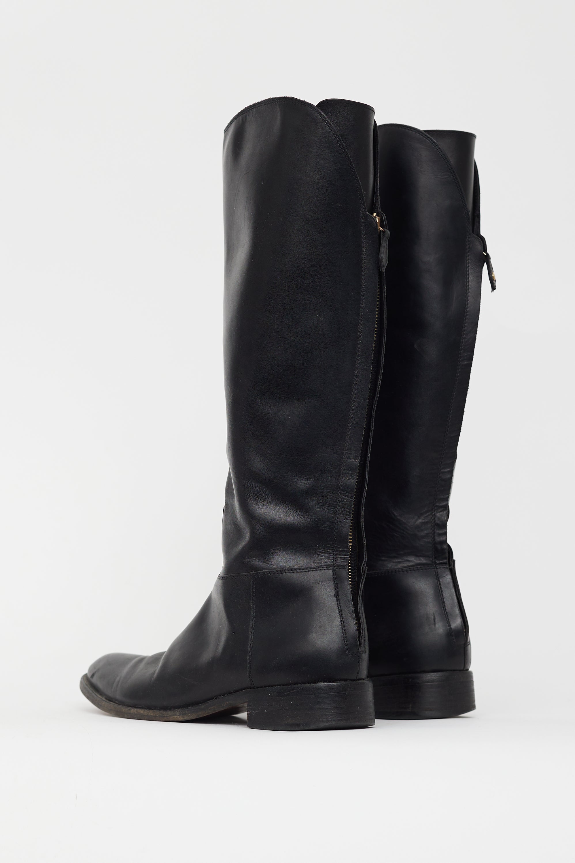 Pre-owned Loro Piana black leather riding boots featuring pointed toe, covered zip closure at counter, and block wooden heel.