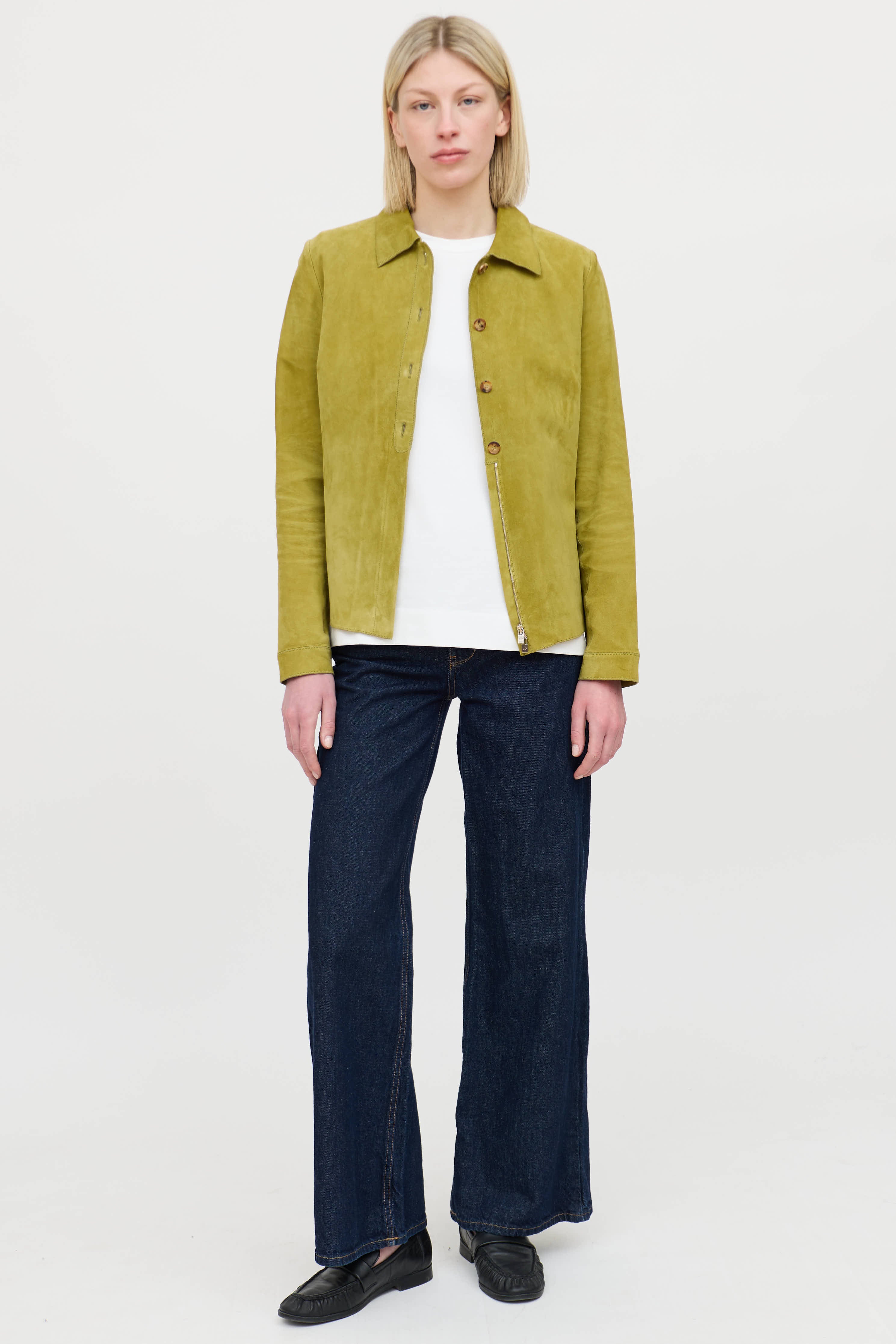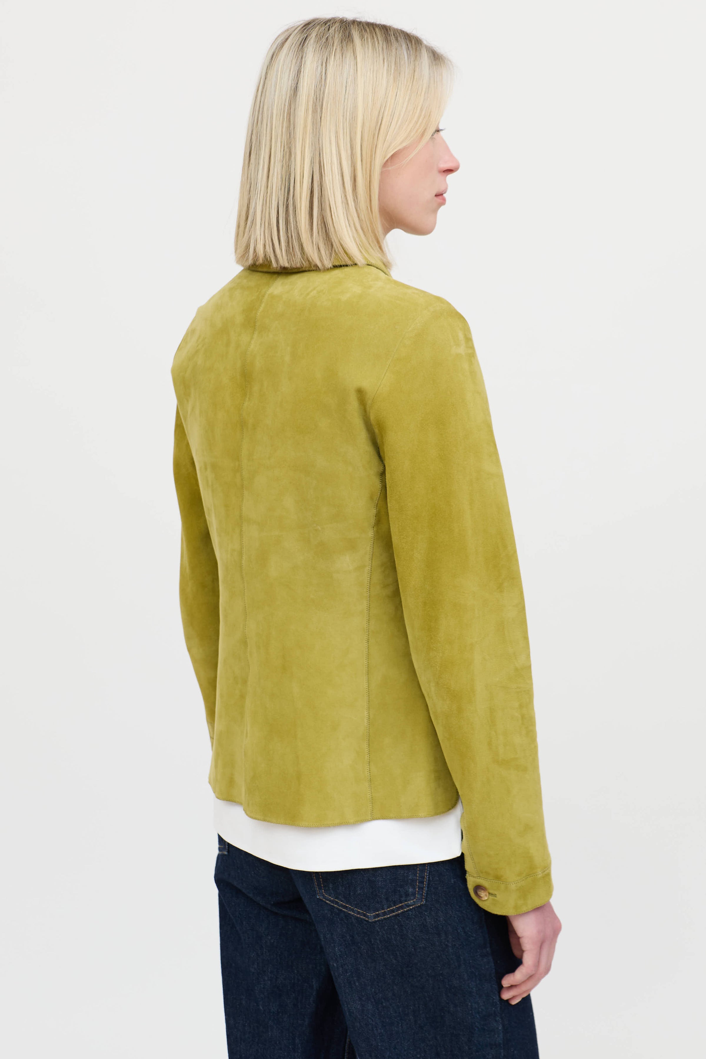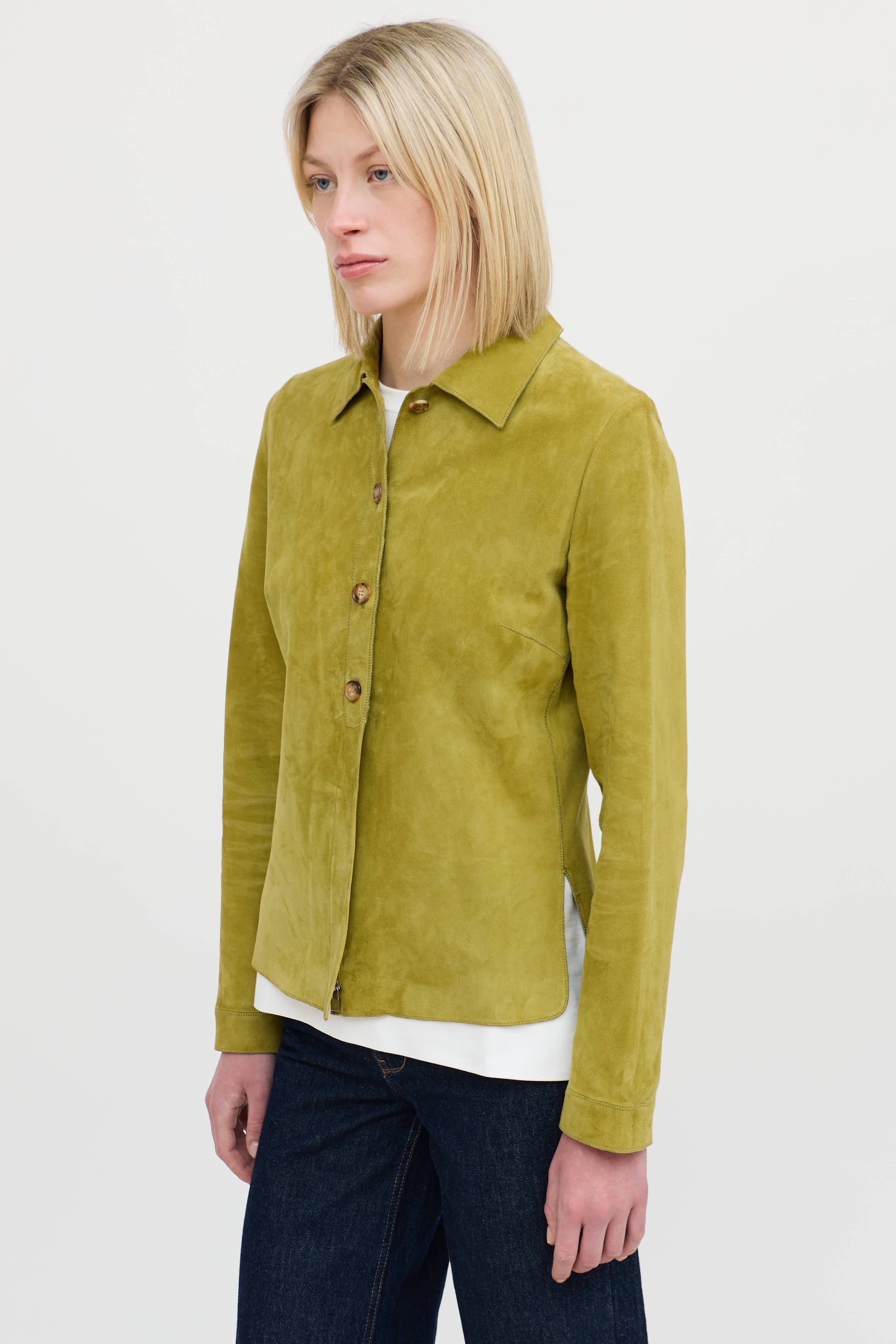 Pre-owned Loro Piana suede green long sleeve shirt featuring pointed collar, button up front and concealed zip, buttoned cuffs, and slit at hemline.