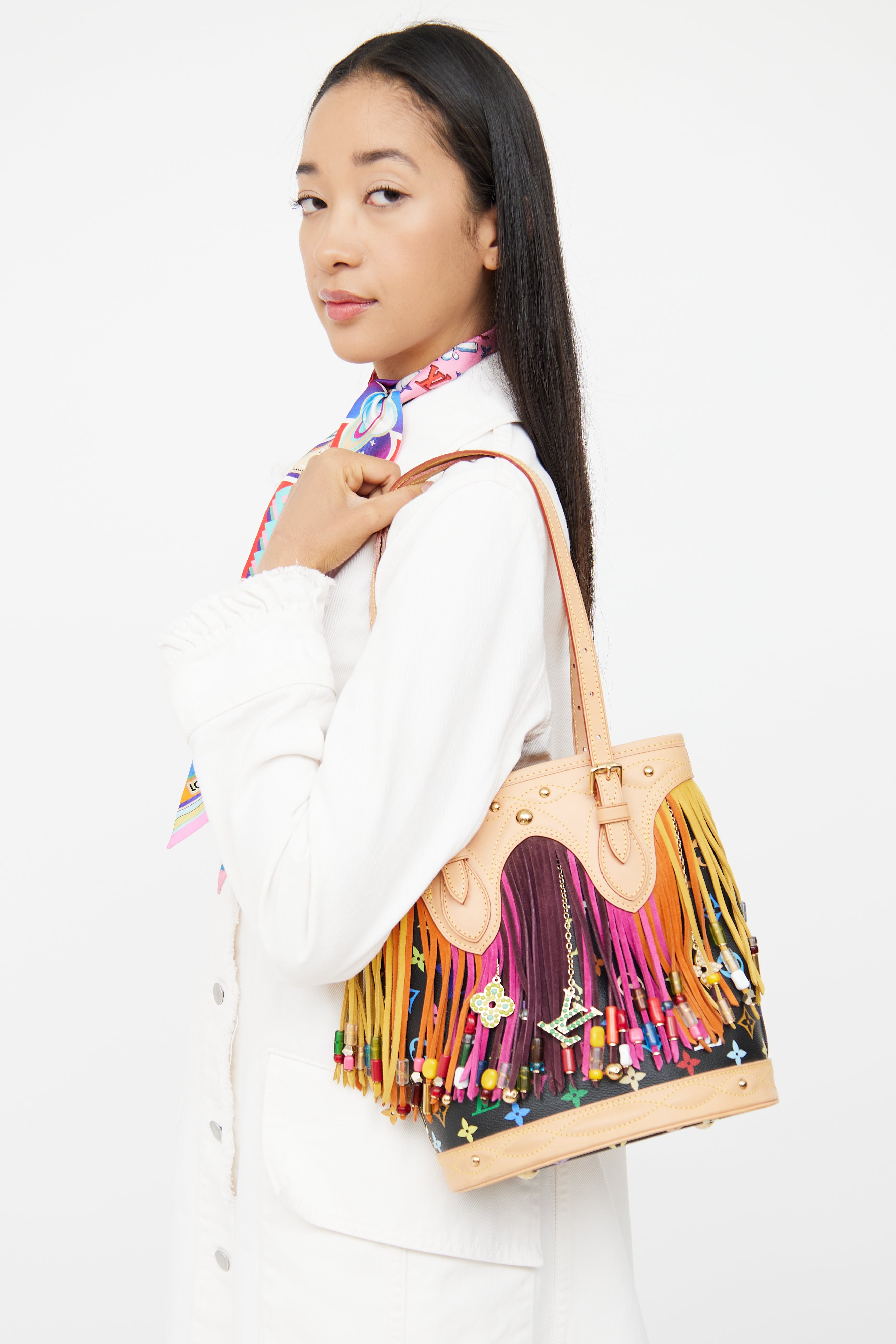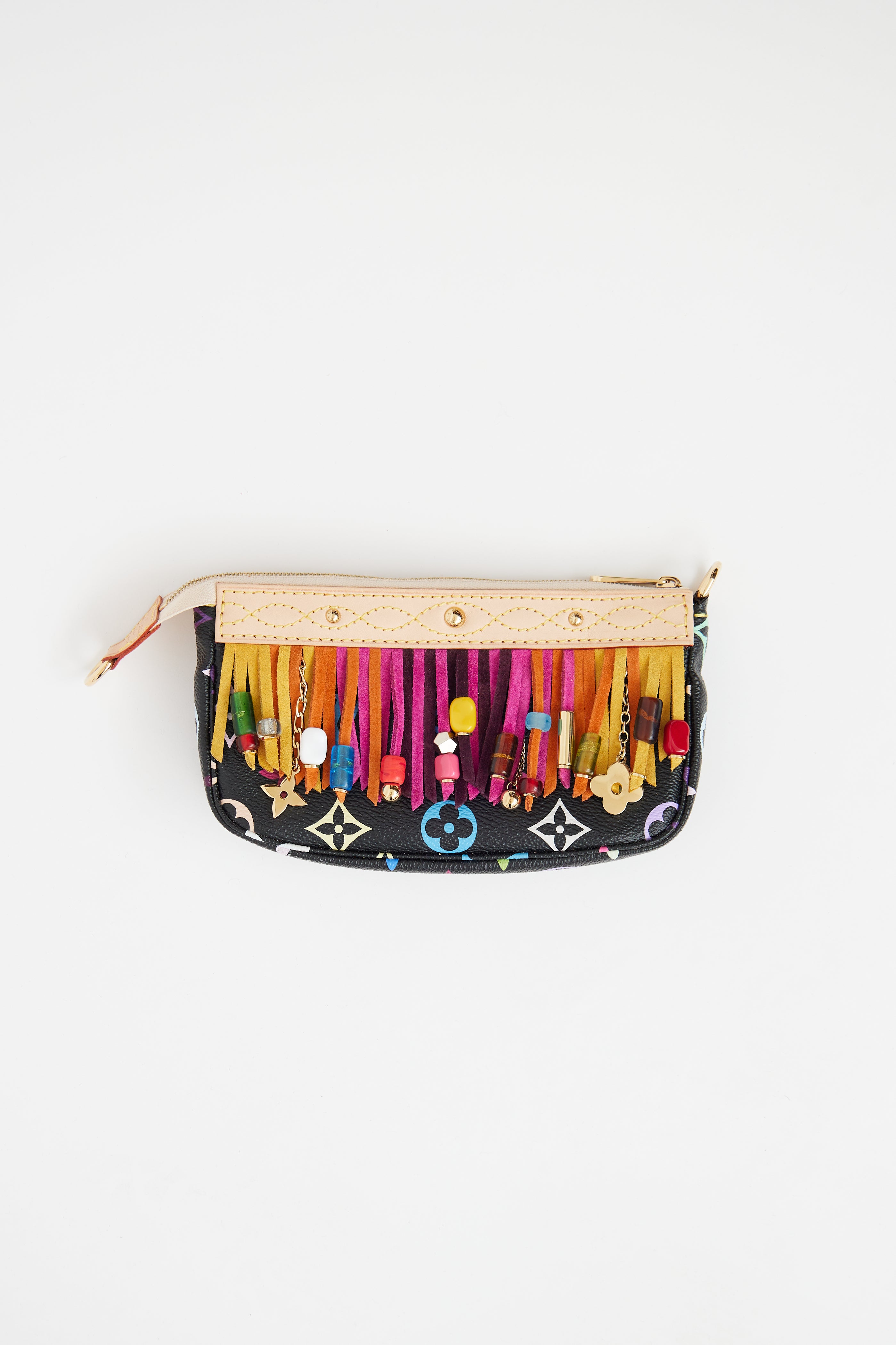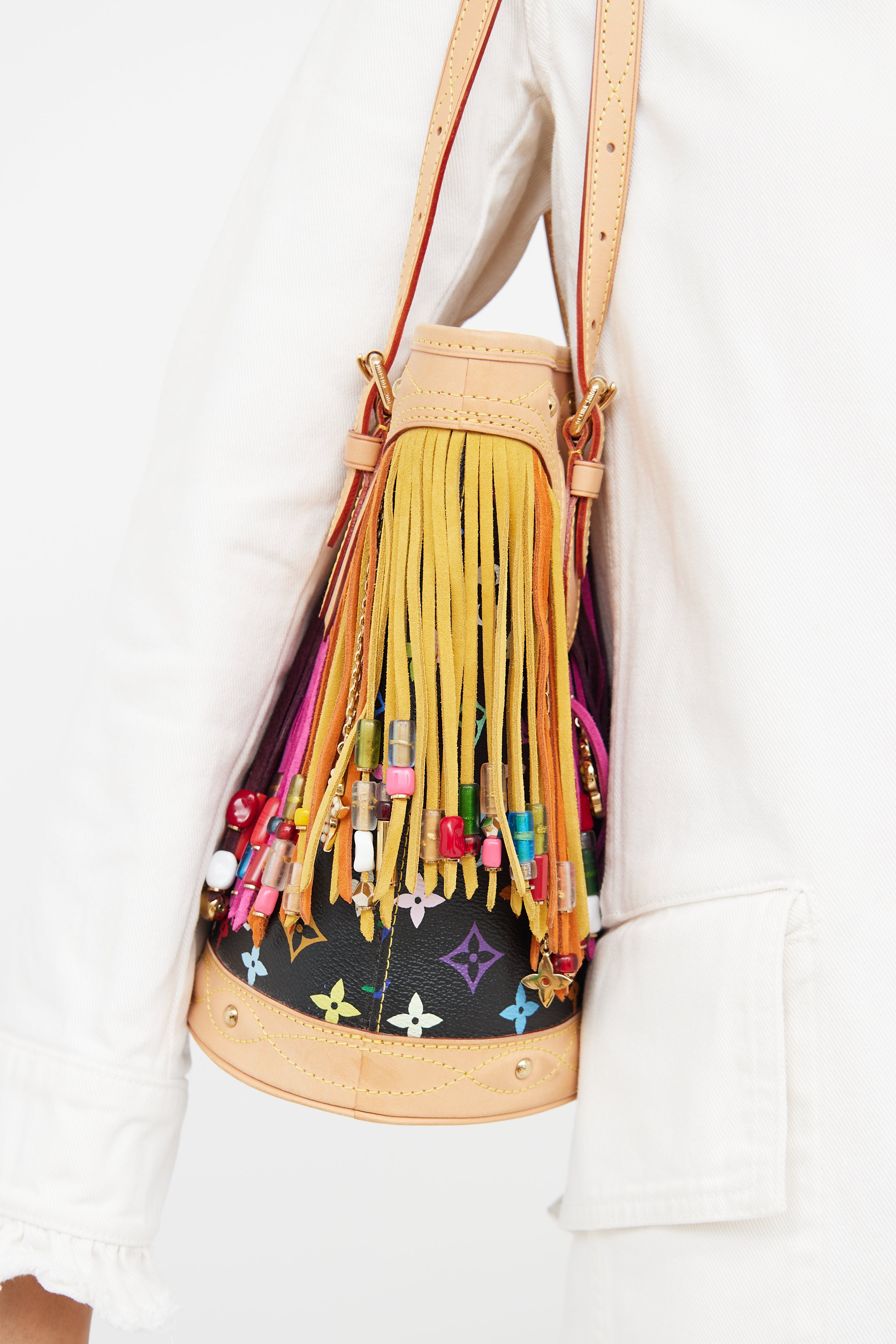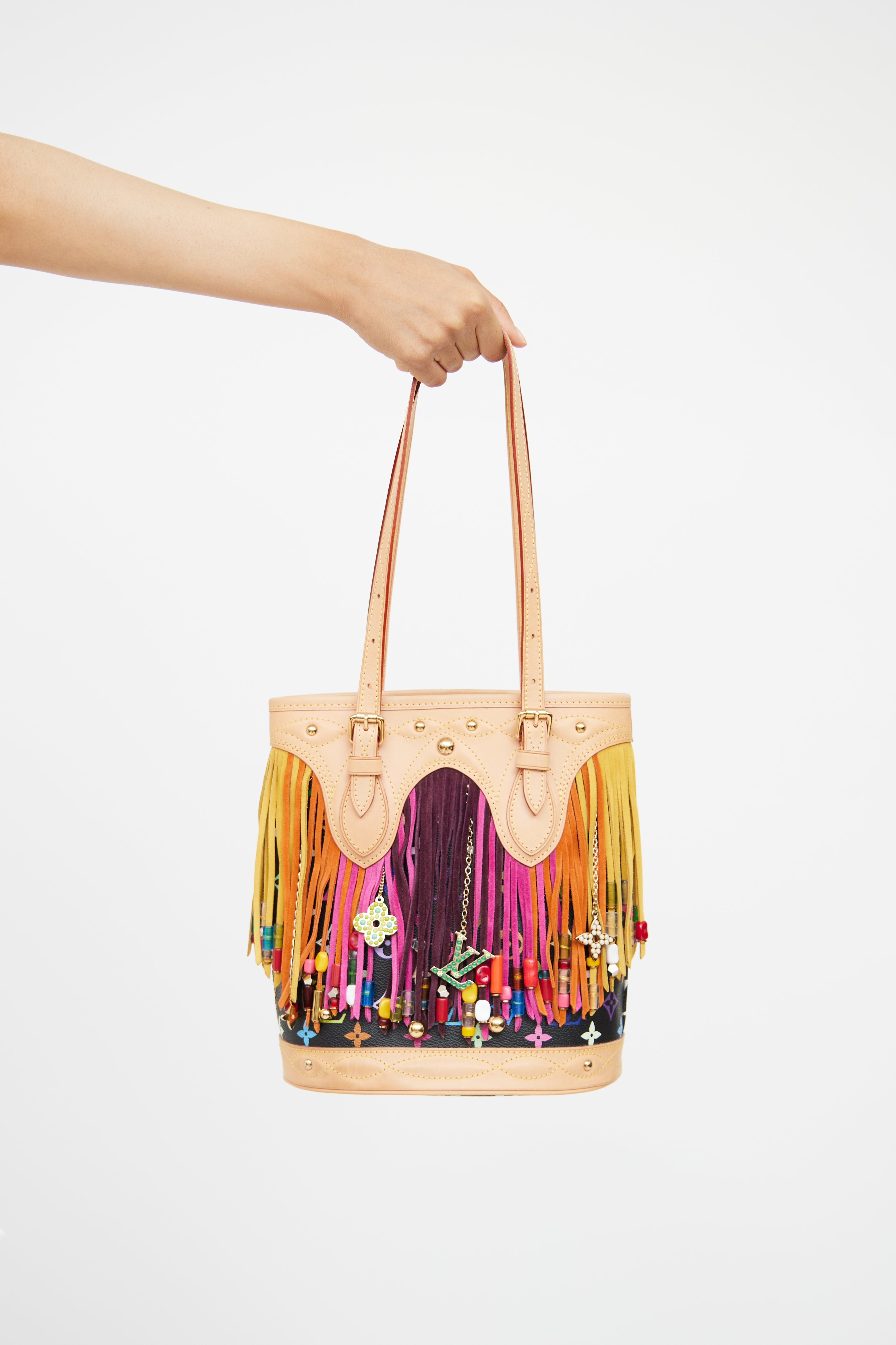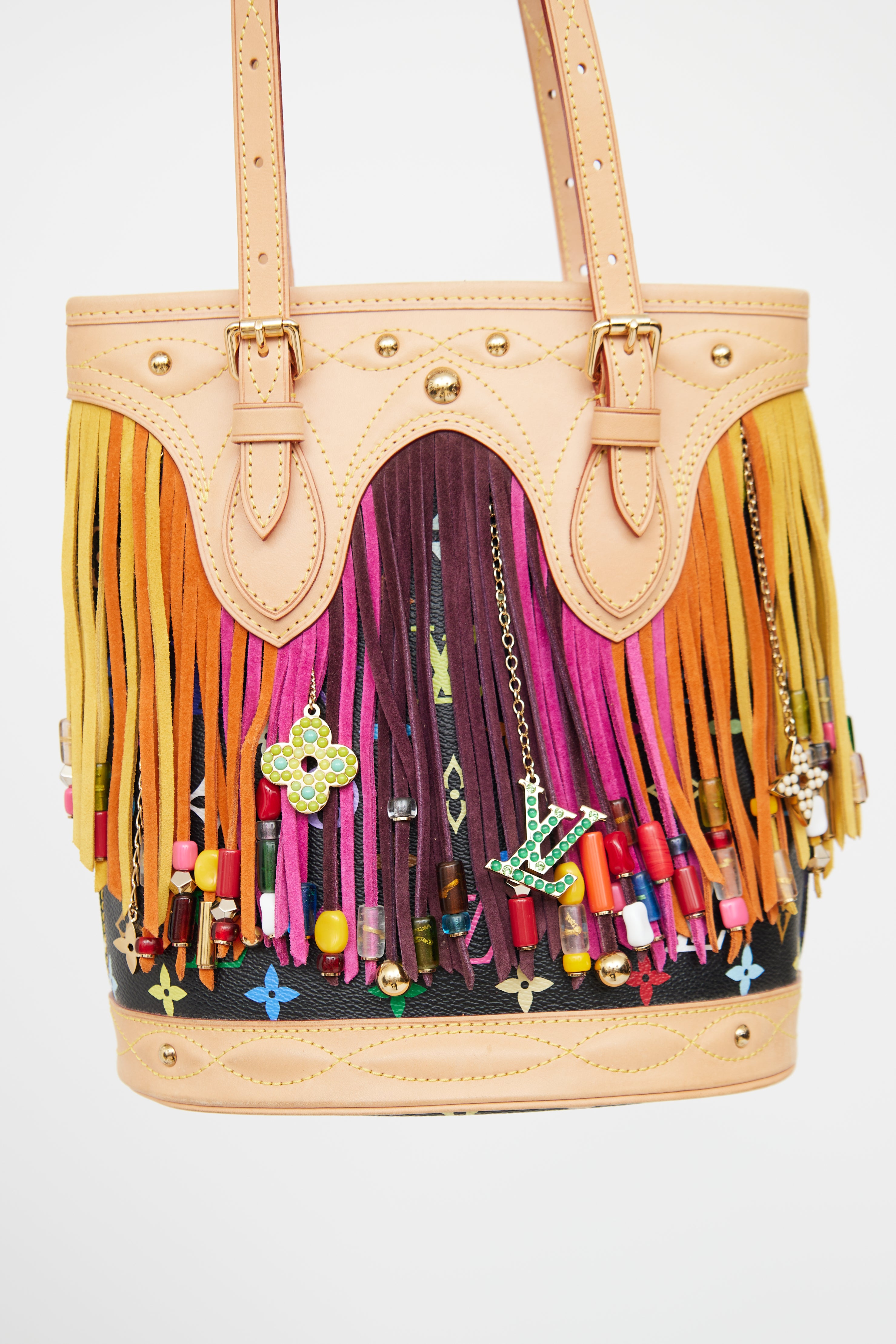 Pre-owned Louis Vuitton x Takashi Murakami 2006 fringe bucket bag featuring black Monogram coated canvas exterior, alcantara lining, one interior zip pocket and flat pocket, bead-embellished fringe detail and gold tone Louis Vuitton logo charms.