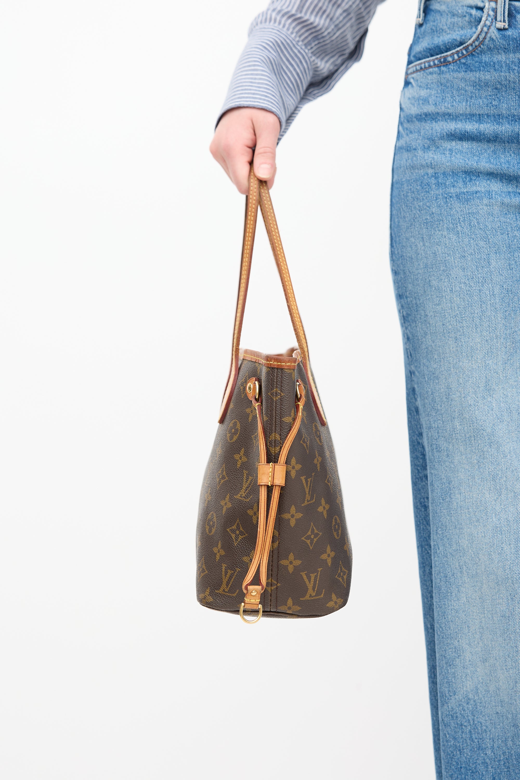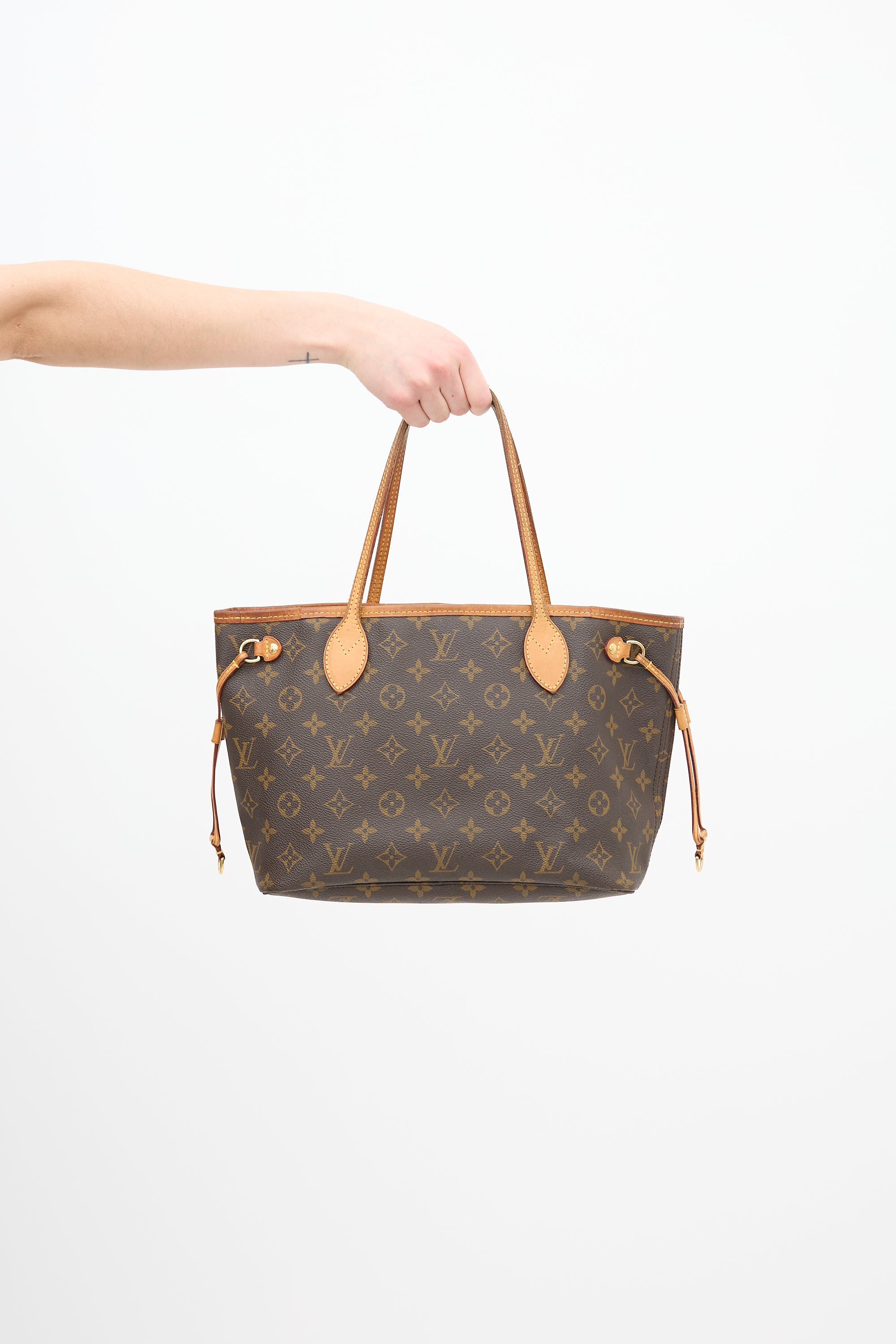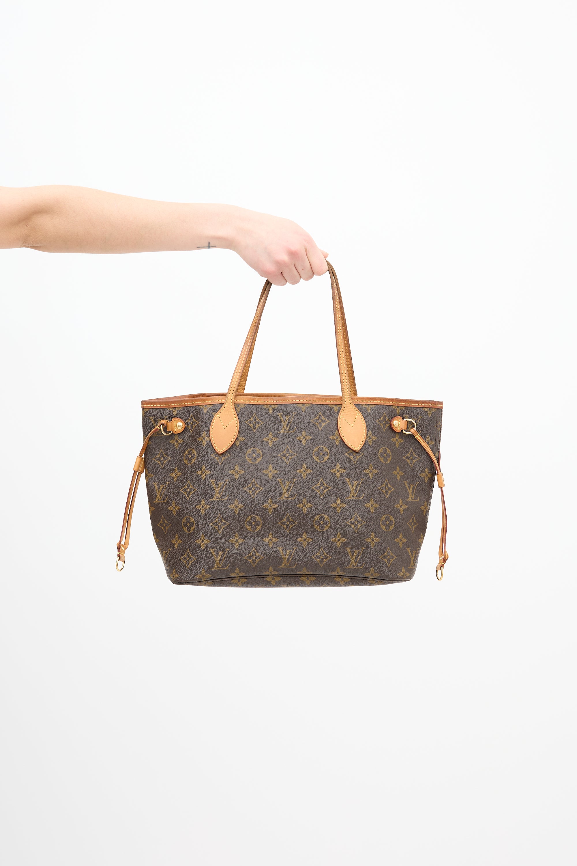 Pre-owned Louis Vuitton 2008 brown coated canvas Neverfull PM bag featuring signature monogram print, brown Vachetta leather details, dual carry handles, open top, clasp closure, and one lined main compartment with one zip pocket.