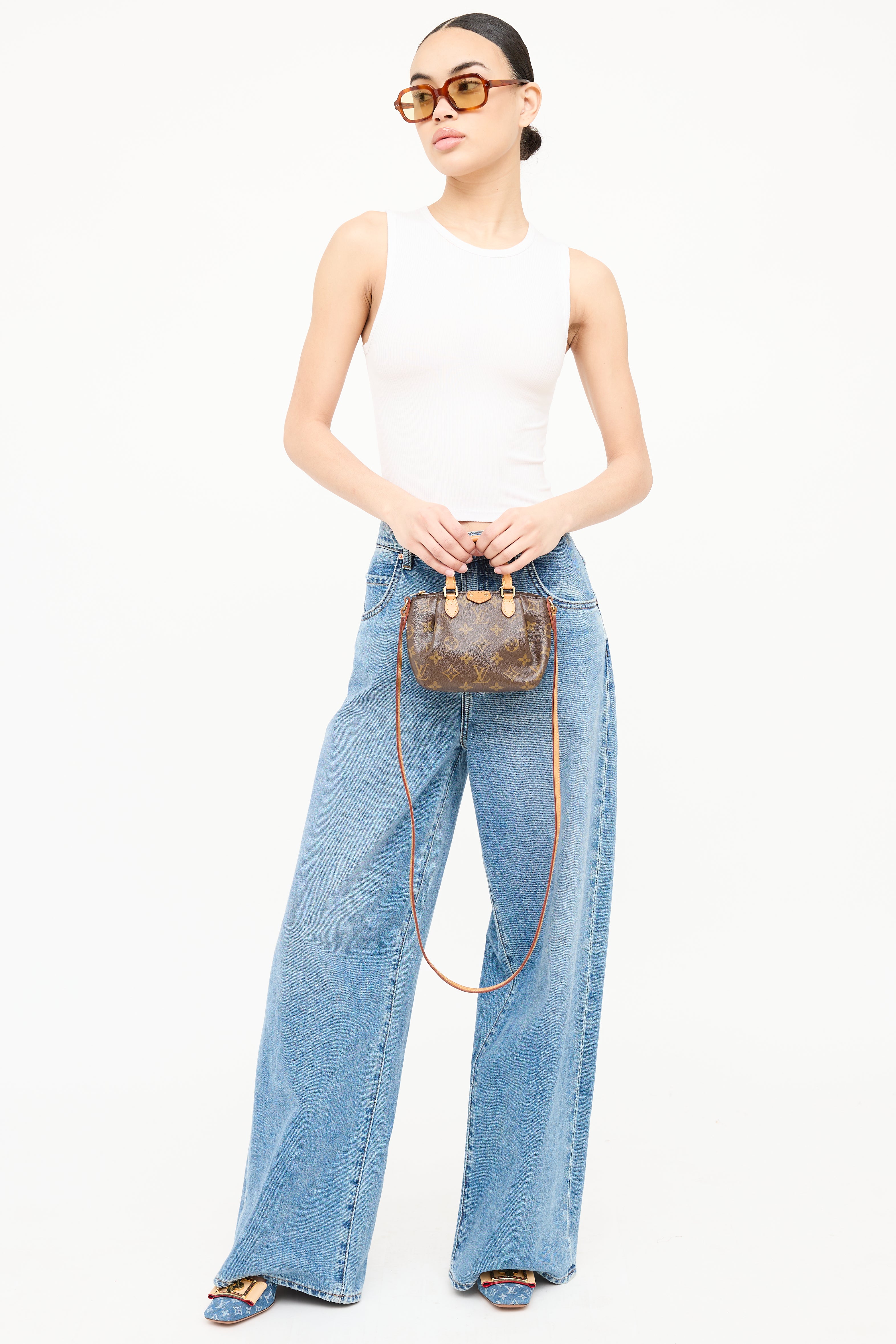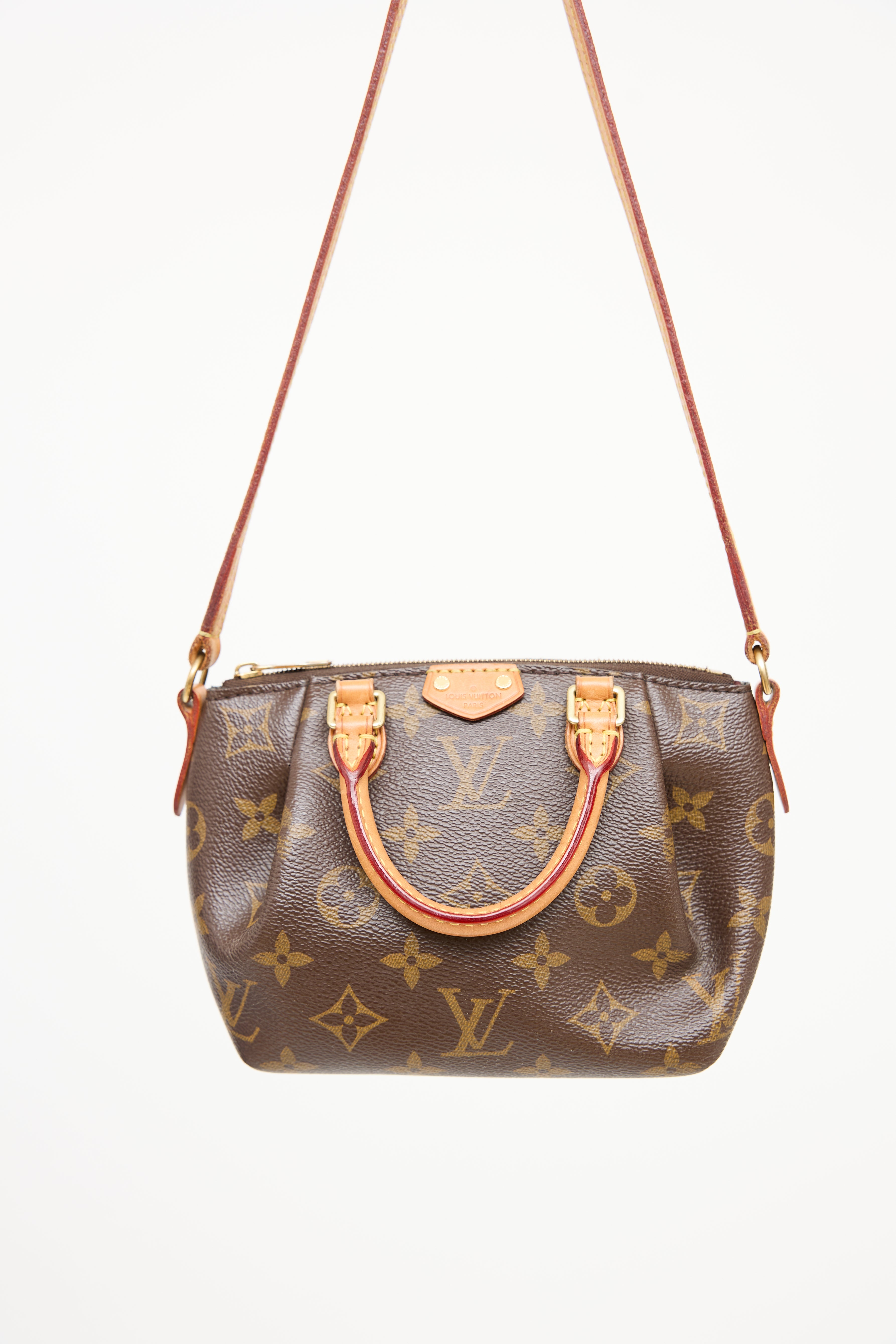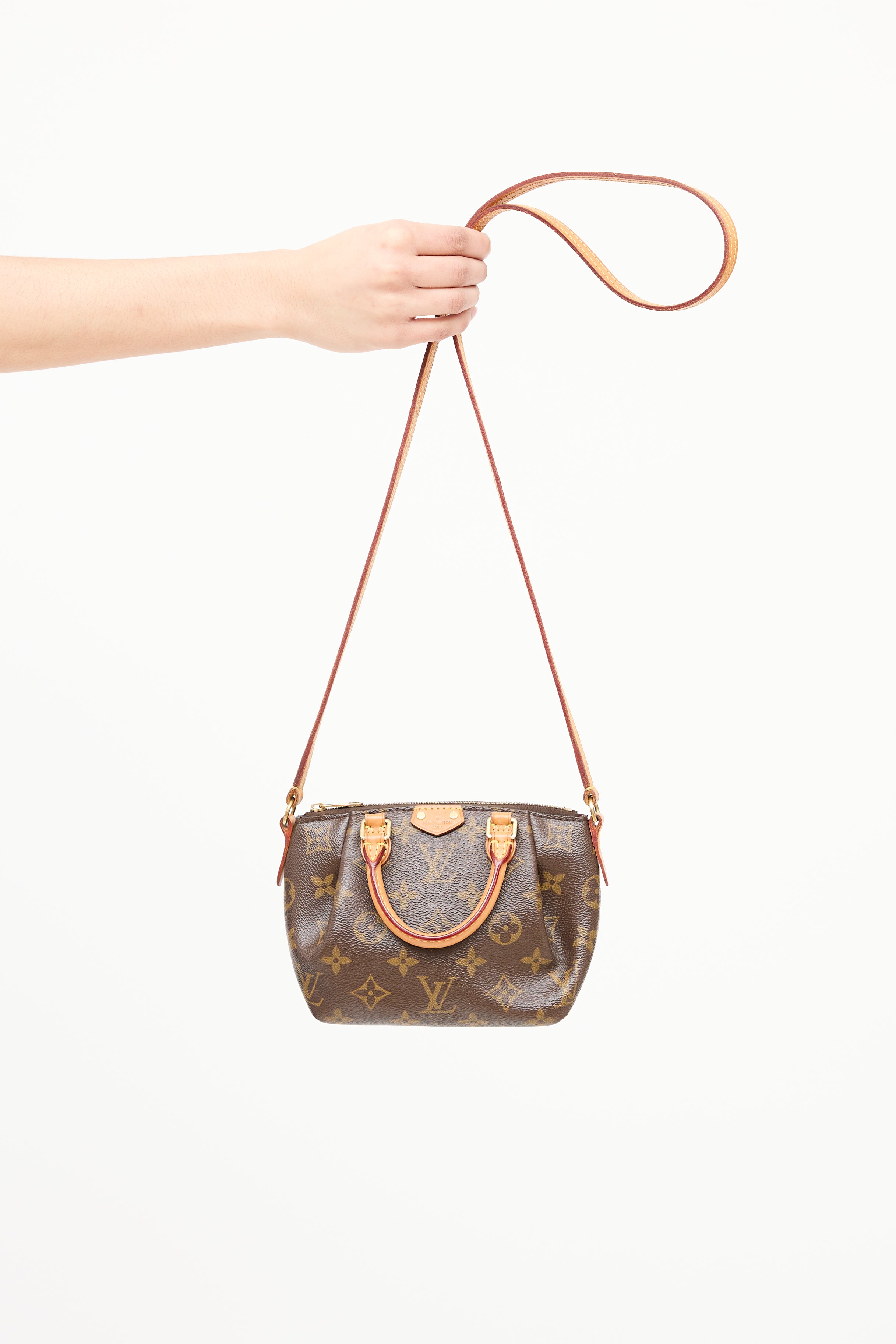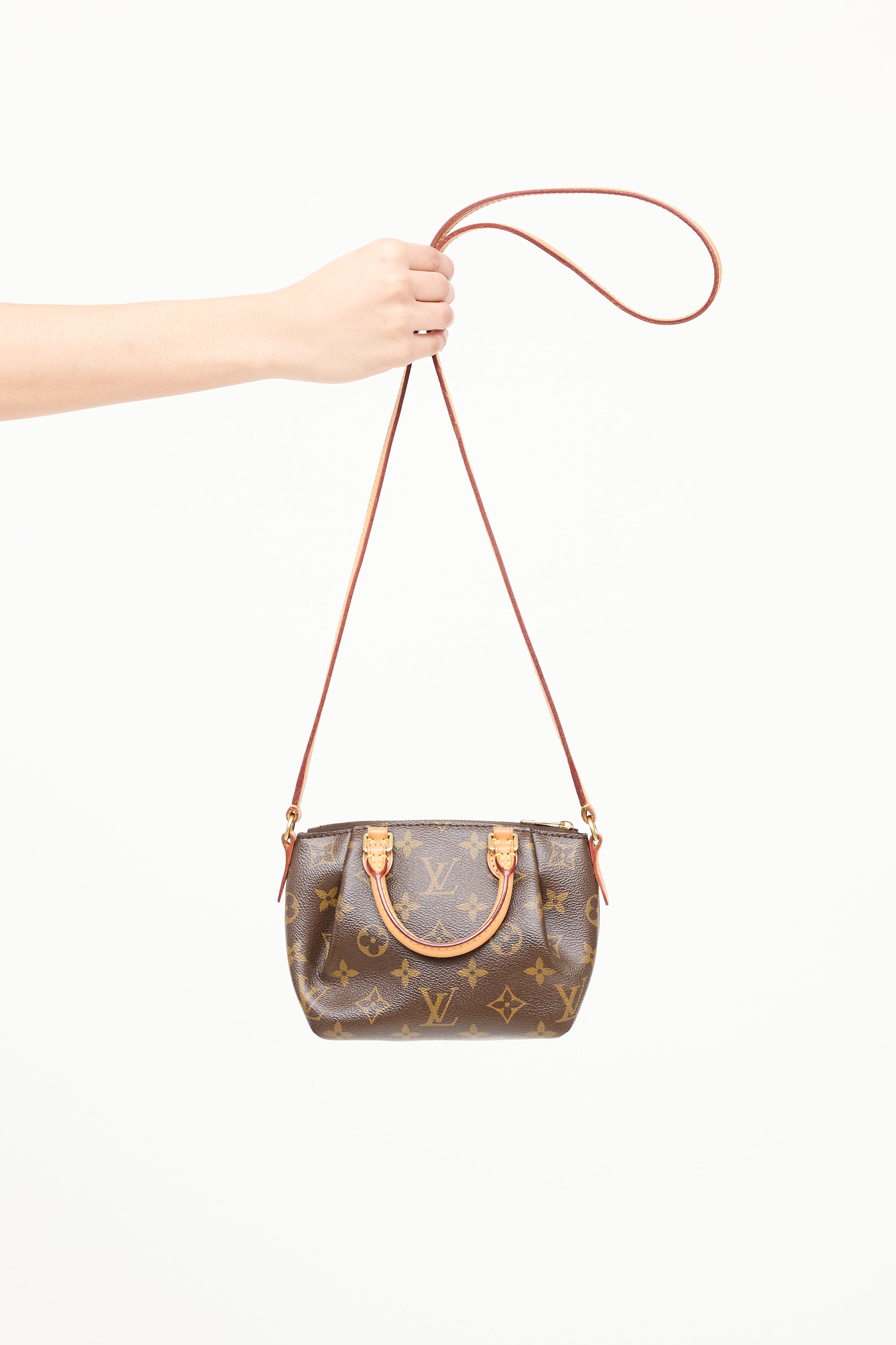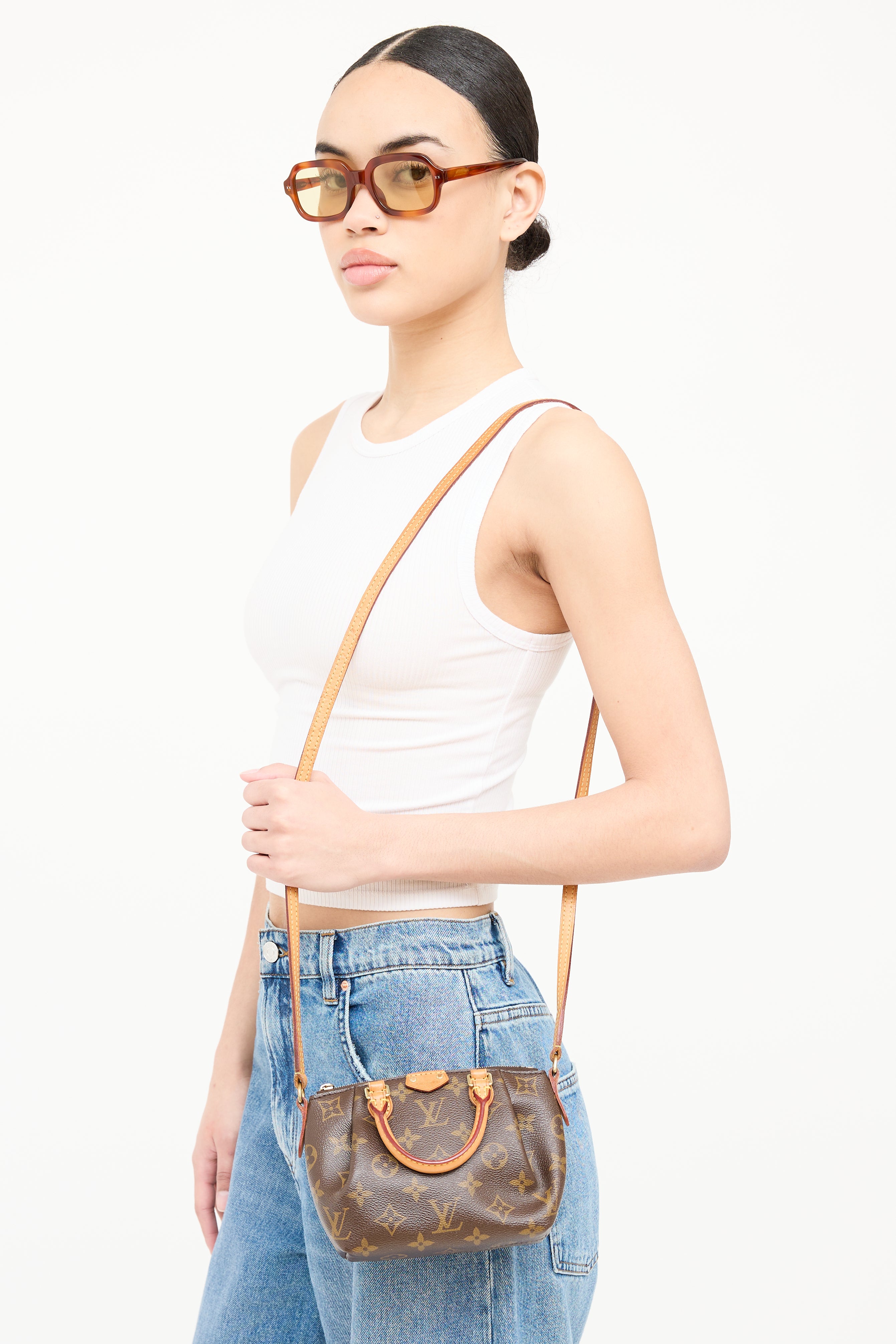 Pre-owned Louis Vuitton 2015 Nano bag featuring single flat shoulder strap, dual rolled top handles, gold tone hardware, coated canvas monogram print, logo text tab on front and zip closure top. Canvas lined main compartment.