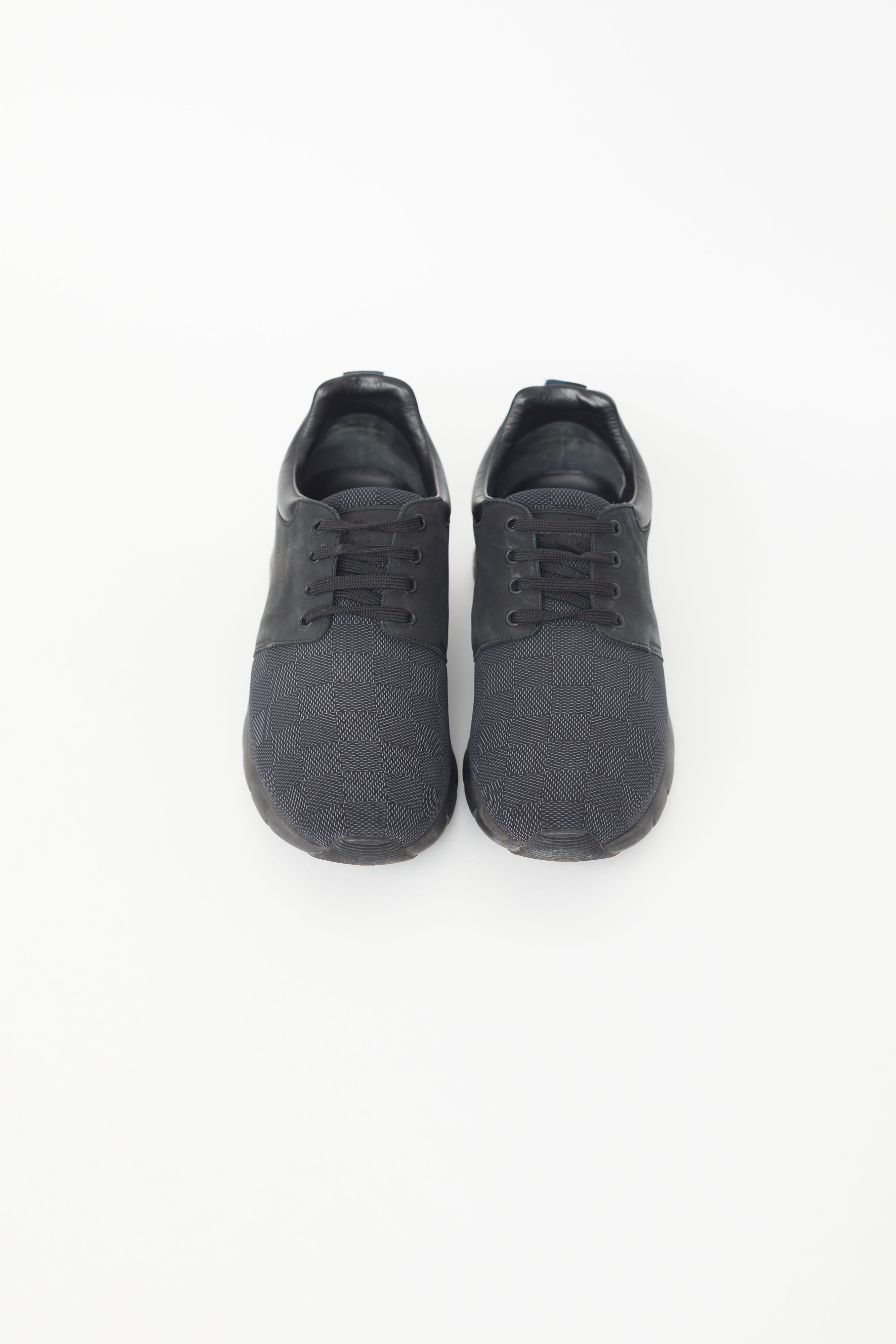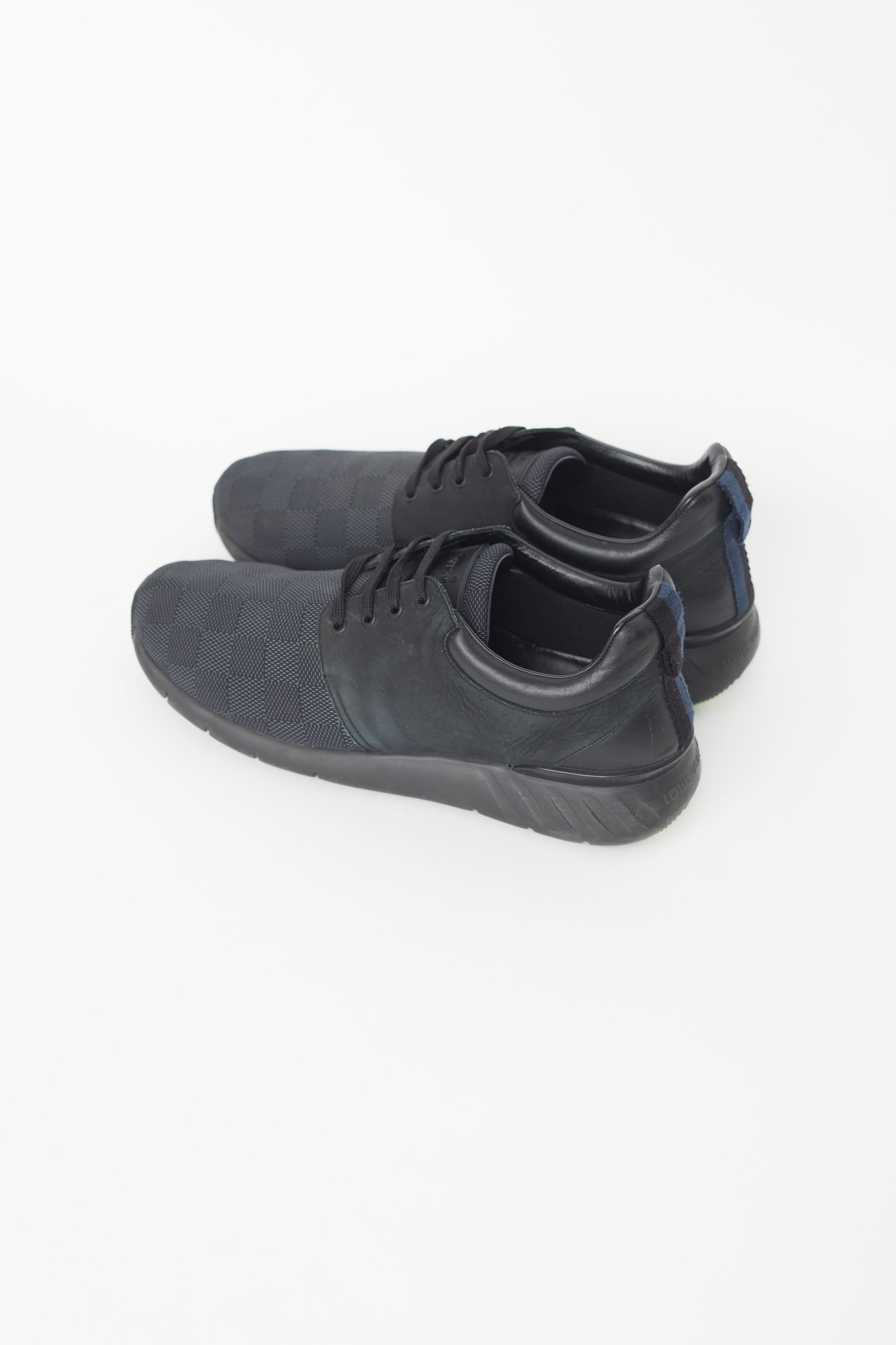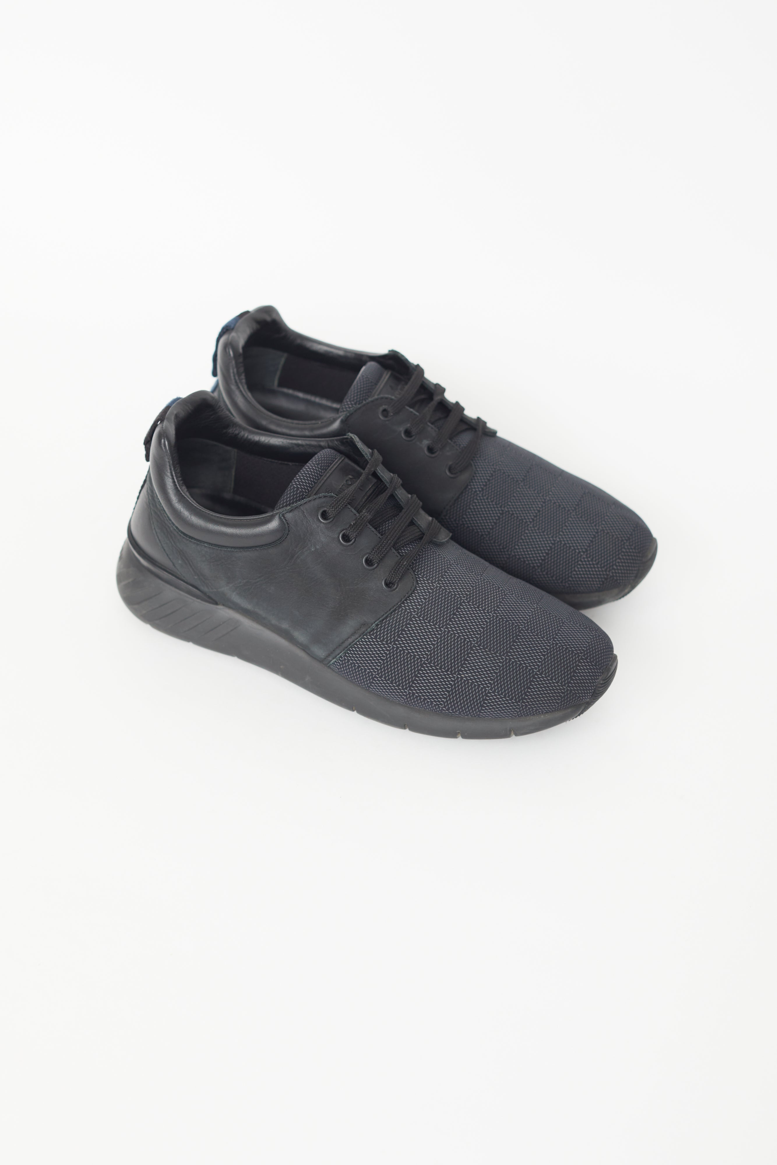Pre-owned Louis Vuitton black Fastlane sneakers featuring a tonal damier knit pattern throughout, round toe, pull tab at heel, and lace up closure.