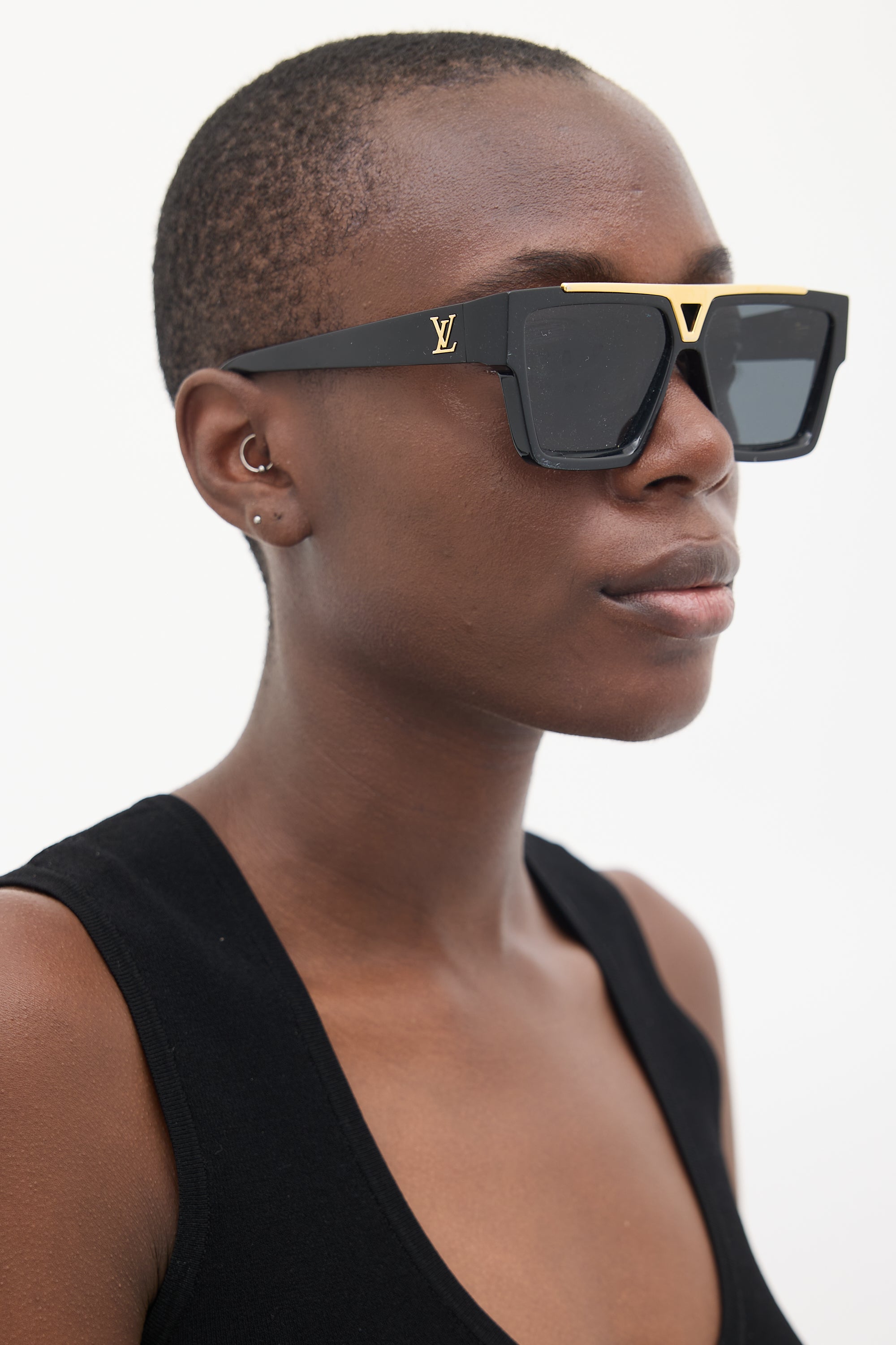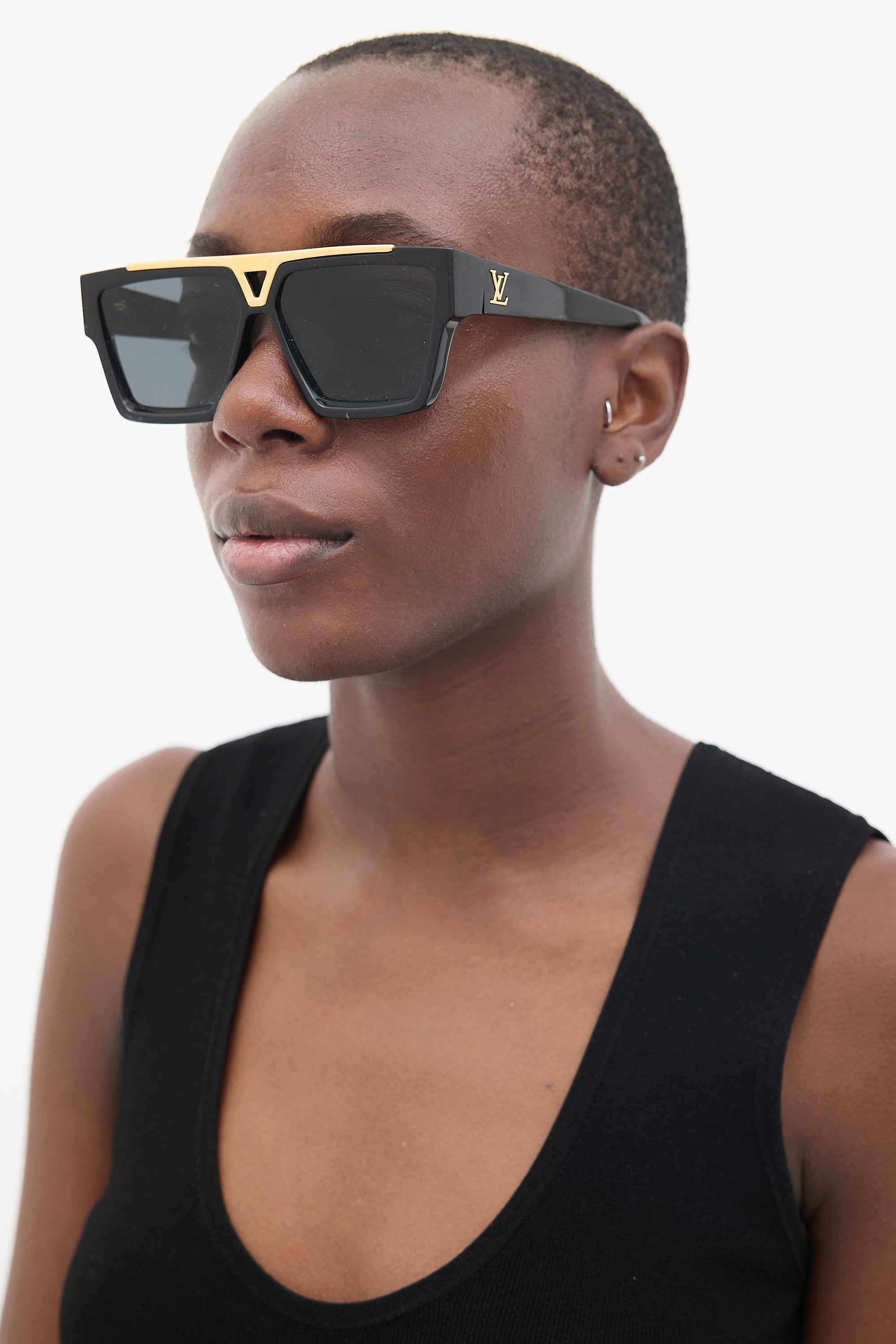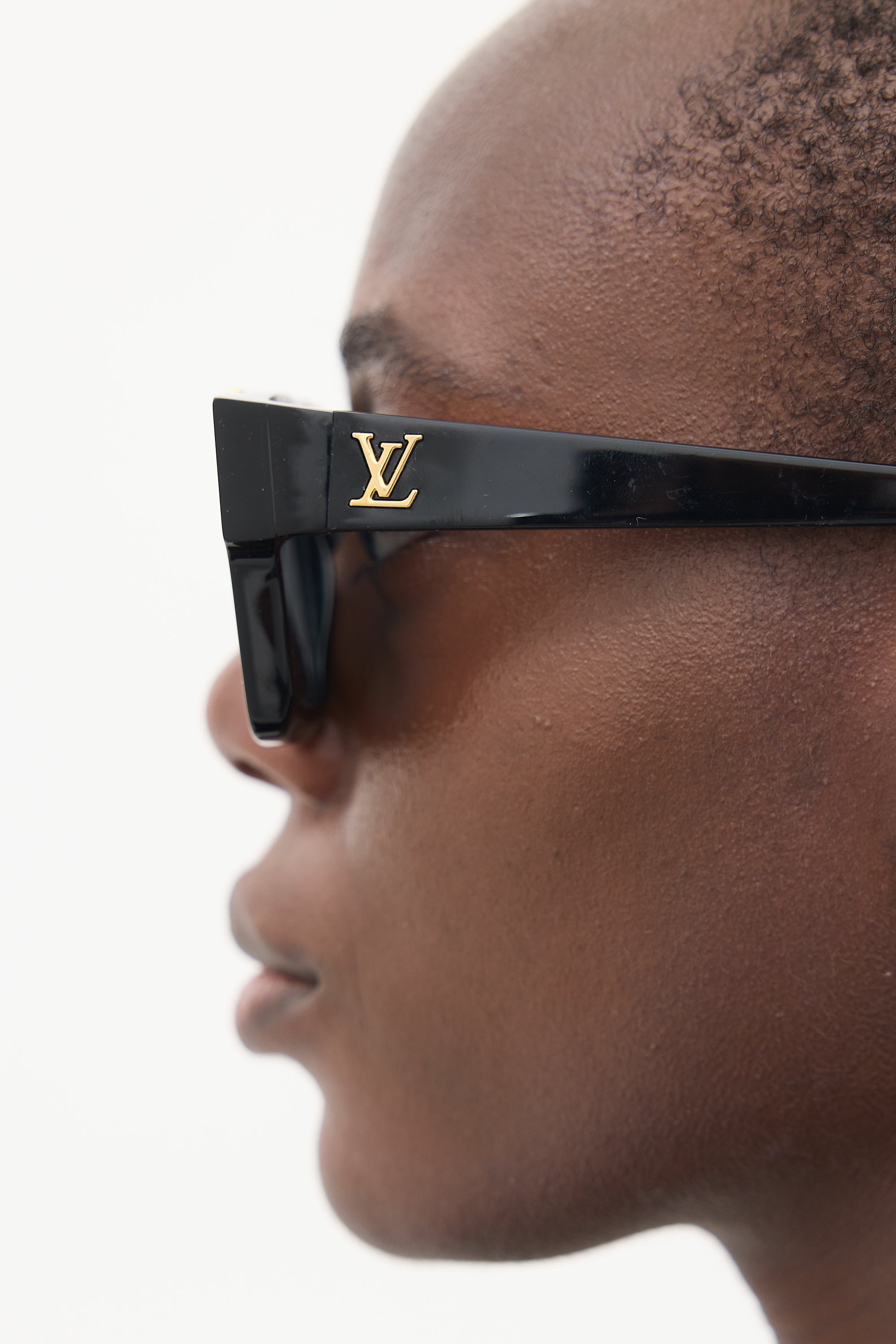 Pre-owned Louis Vuitton black Z1502W sunglasses featuring a straight brow bar with gold tone hardware, tinted lenses, nose pads, and gold tone logo hardware at temples.