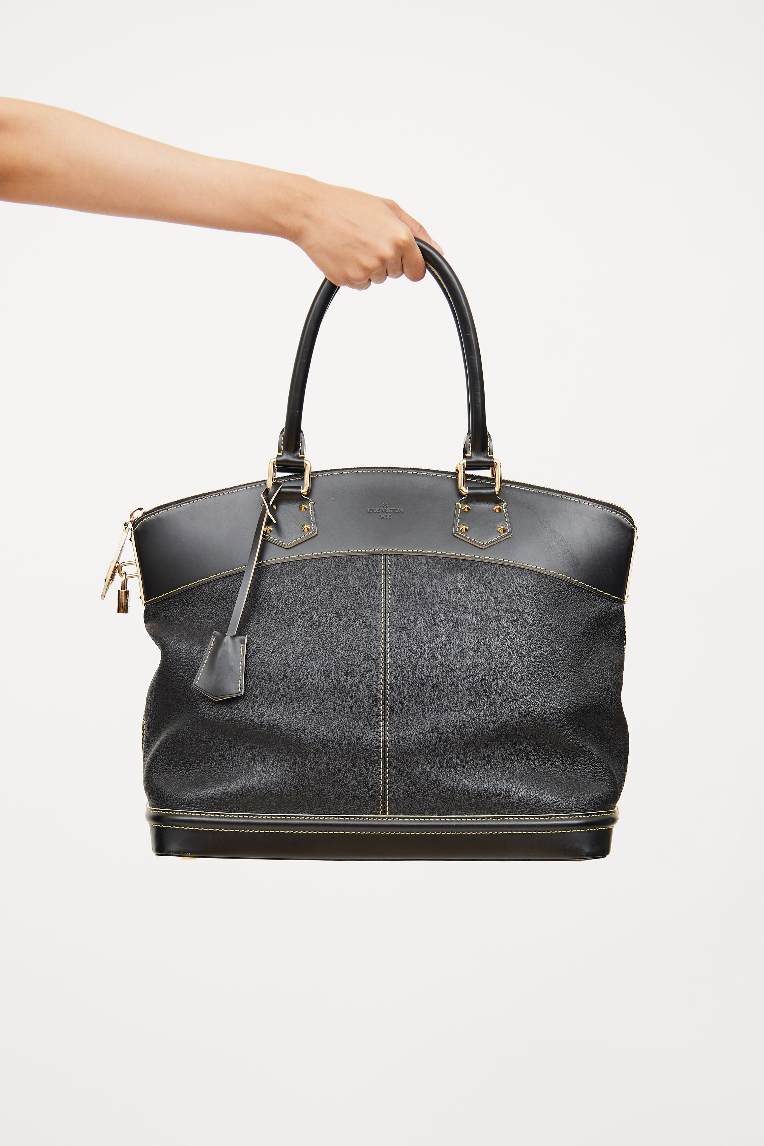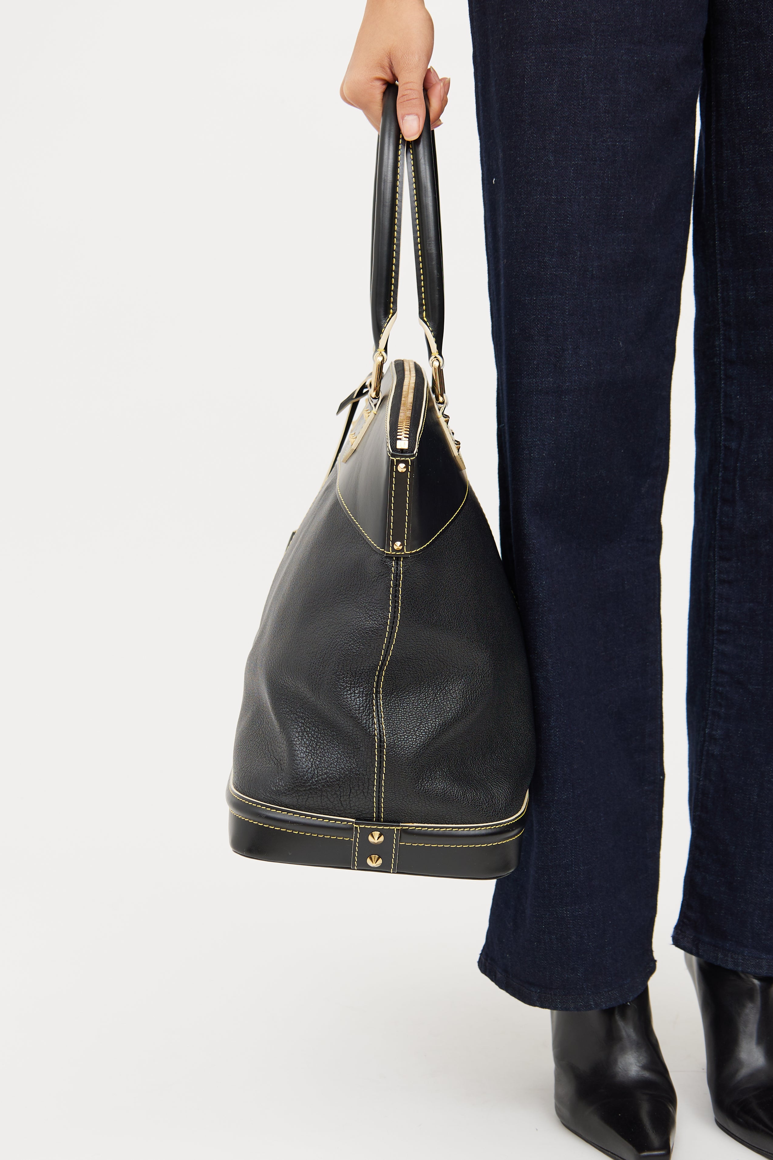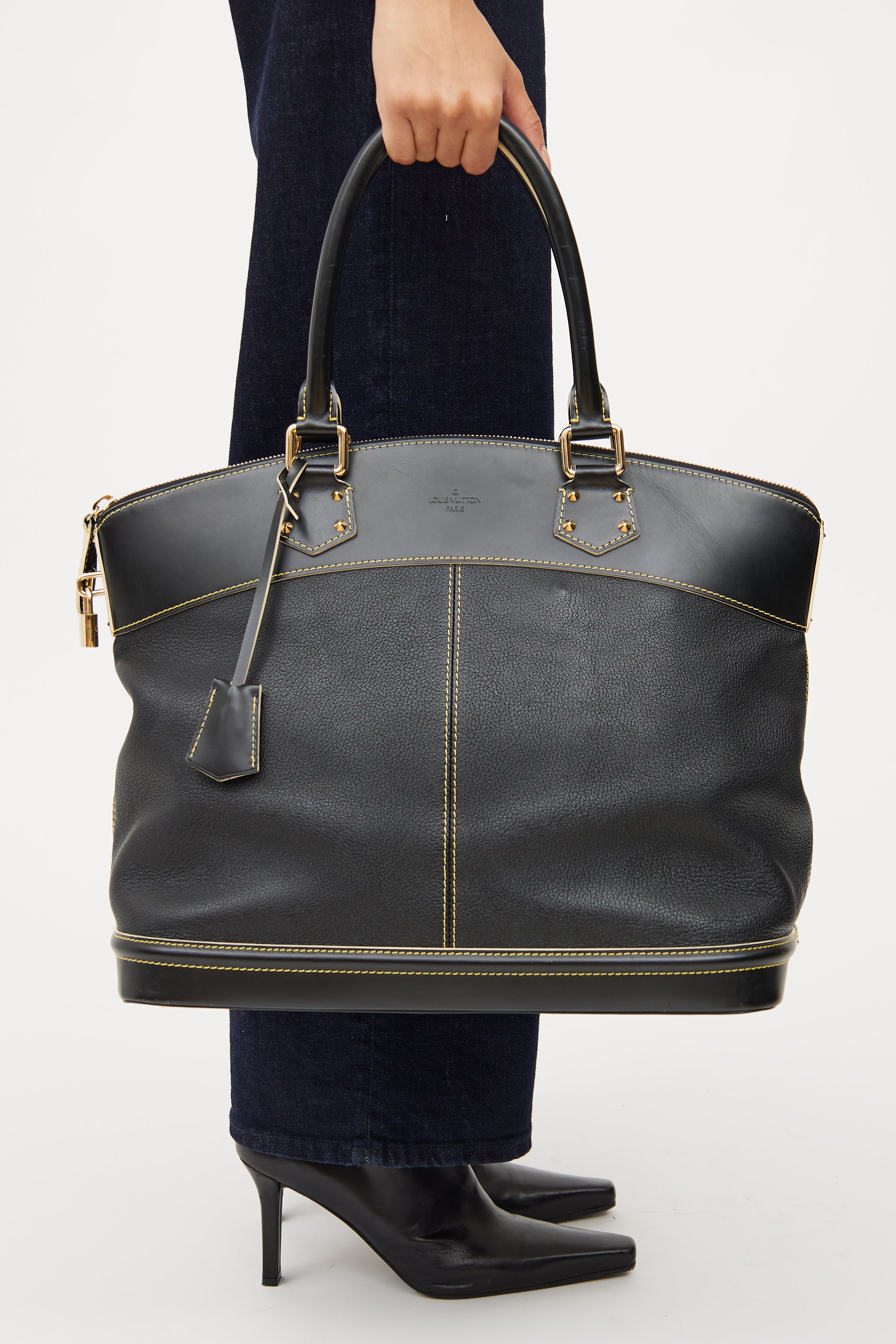 Pre-owned Louis Vuitton black leather Suhali Lockit bag featuring dual rolled top handles, yellow contrast stitching, gold tone hardware, clochette, embossed logo text on front, pebbled leather base, lock hardware on side and zip closure top with pull tab. Canvas lined main compartment, single zip pocket and two slip pockets.