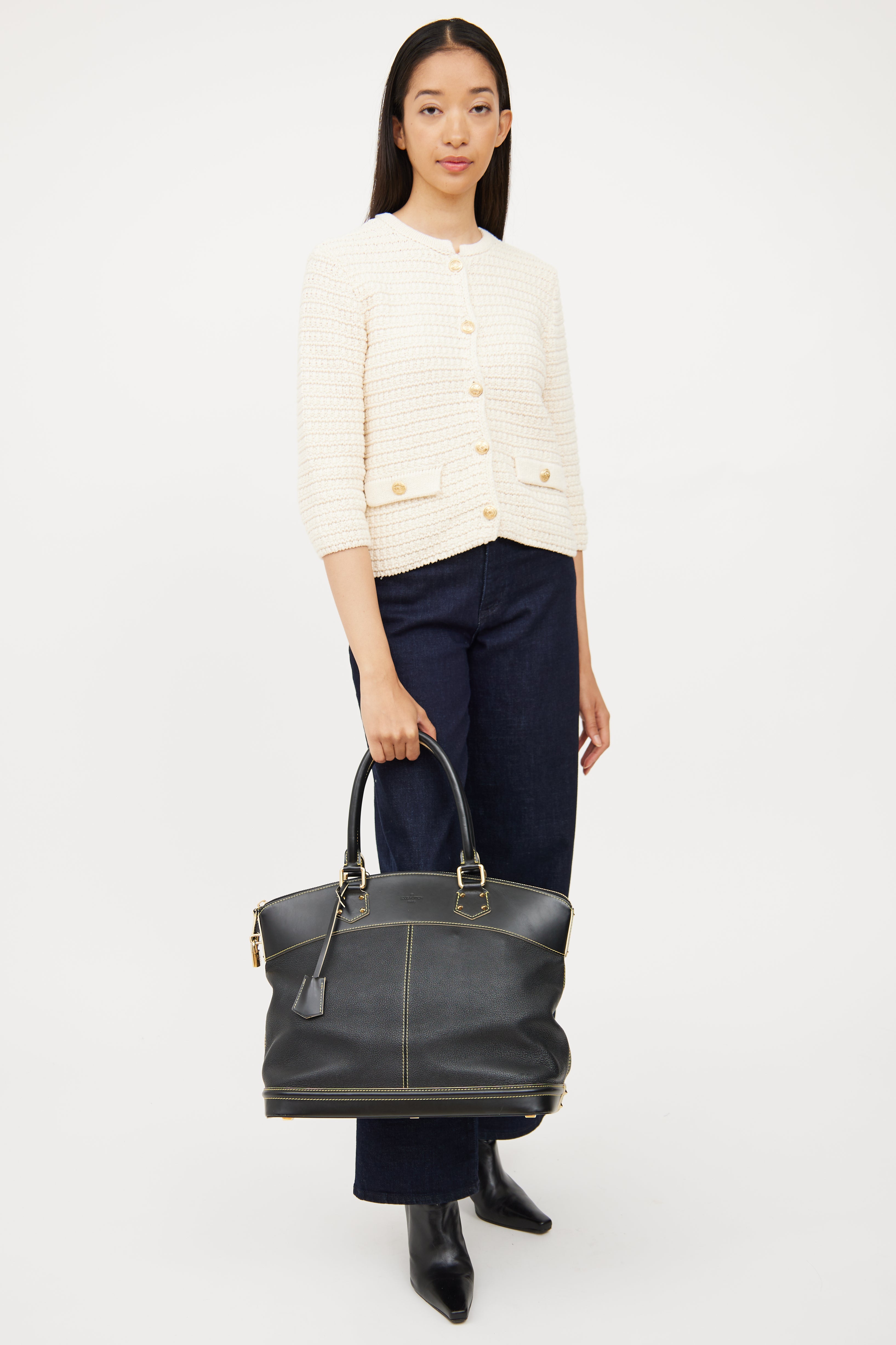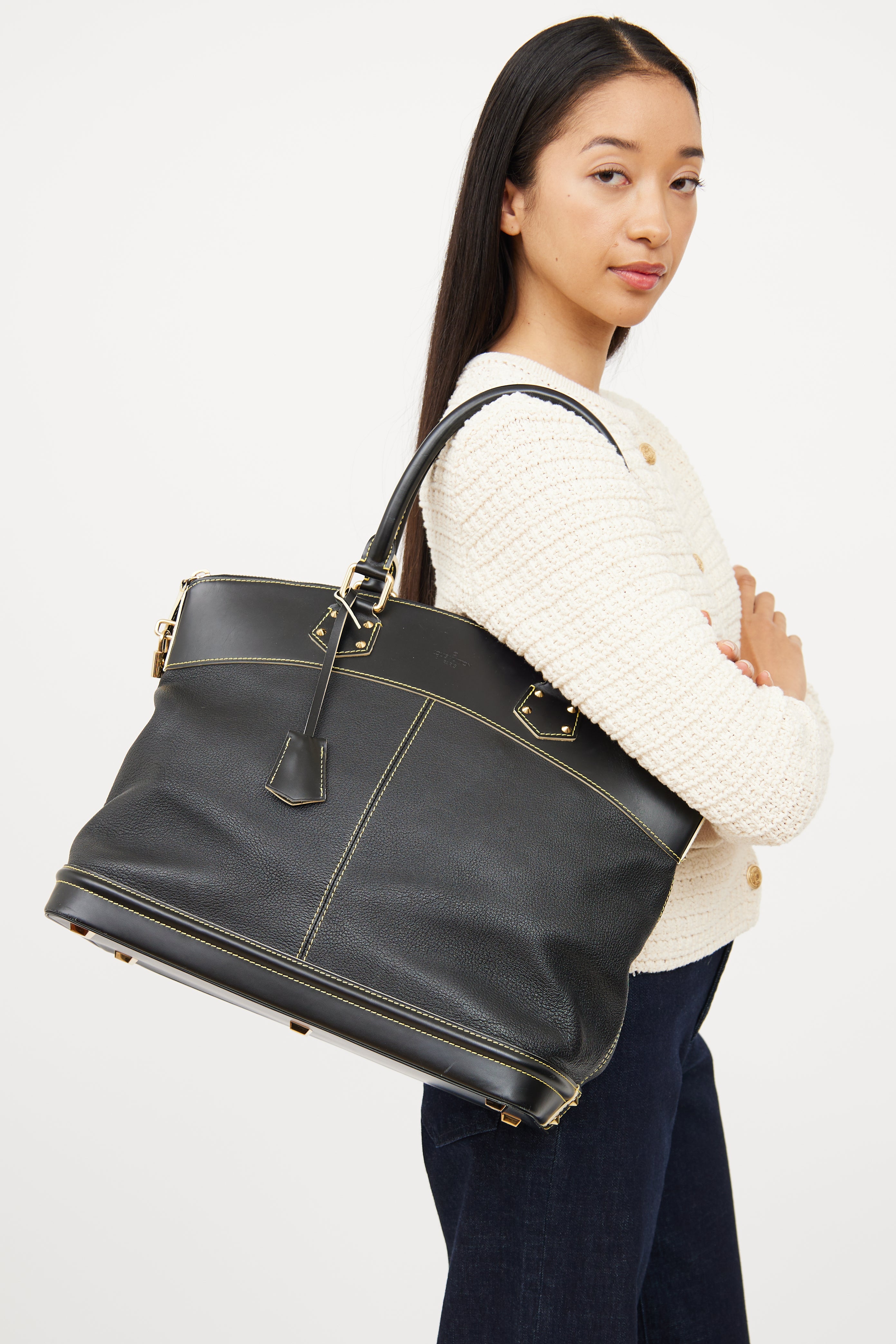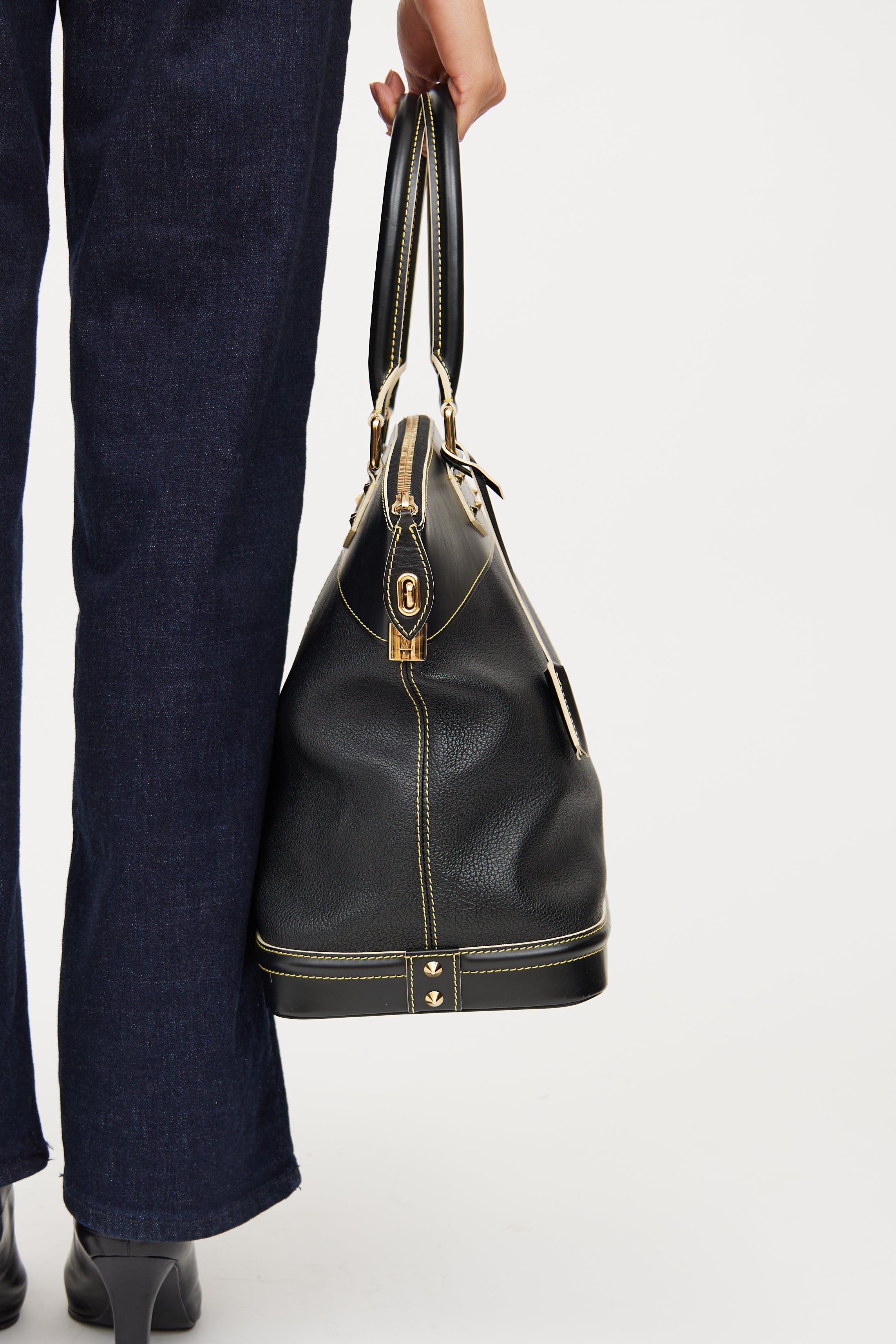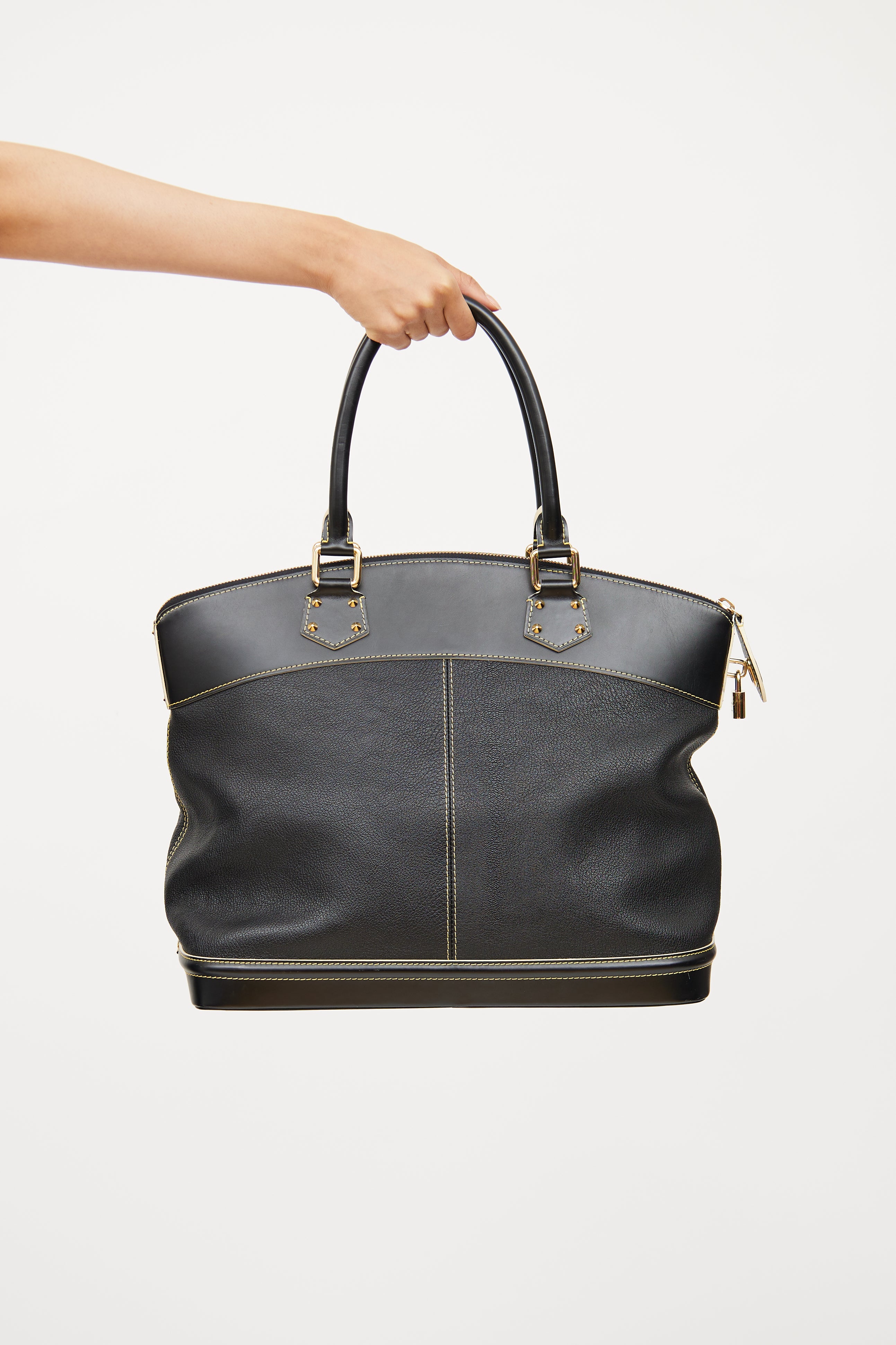 Pre-owned Louis Vuitton black leather Suhali Lockit bag featuring dual rolled top handles, yellow contrast stitching, gold tone hardware, clochette, embossed logo text on front, pebbled leather base, lock hardware on side and zip closure top with pull tab. Canvas lined main compartment, single zip pocket and two slip pockets.