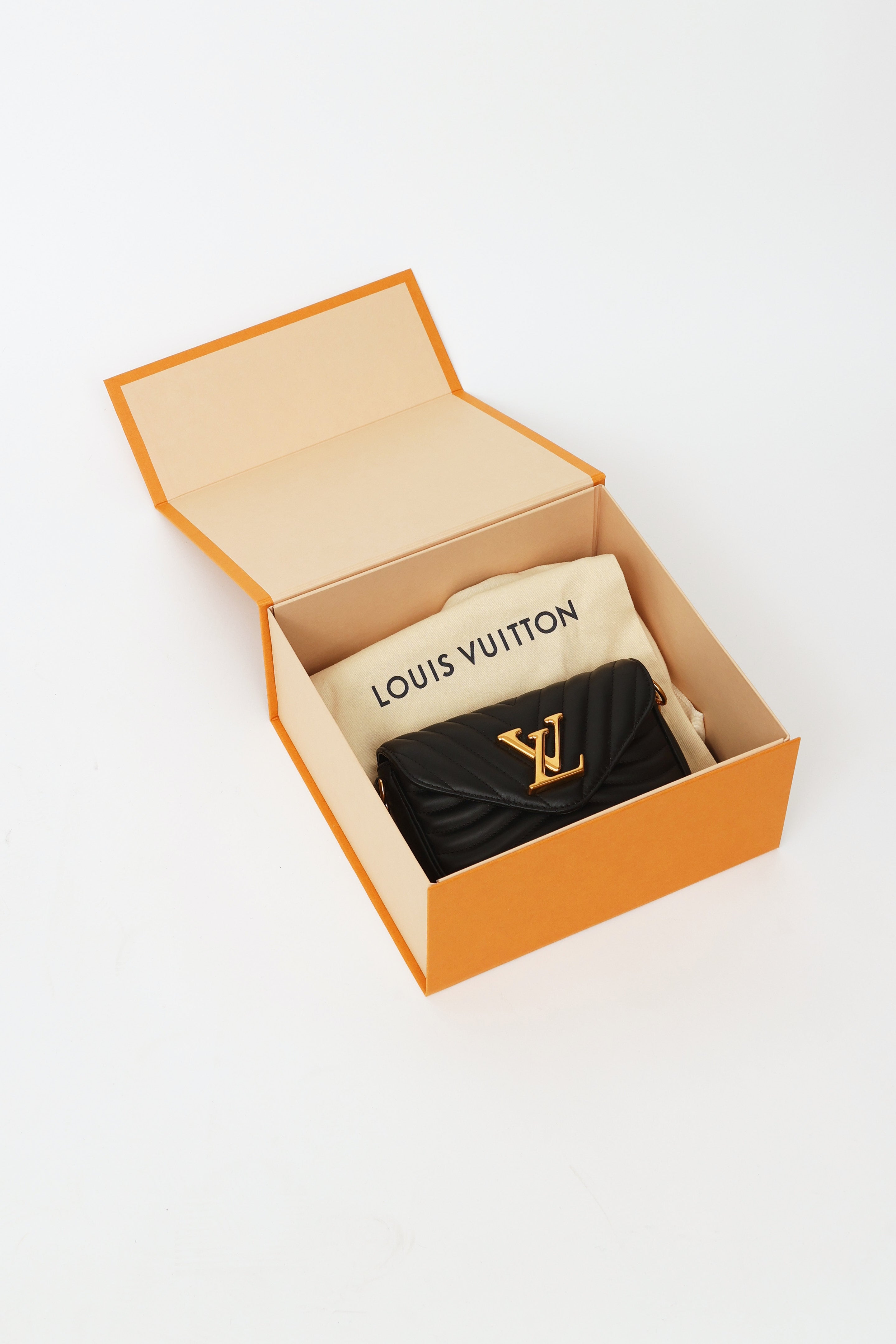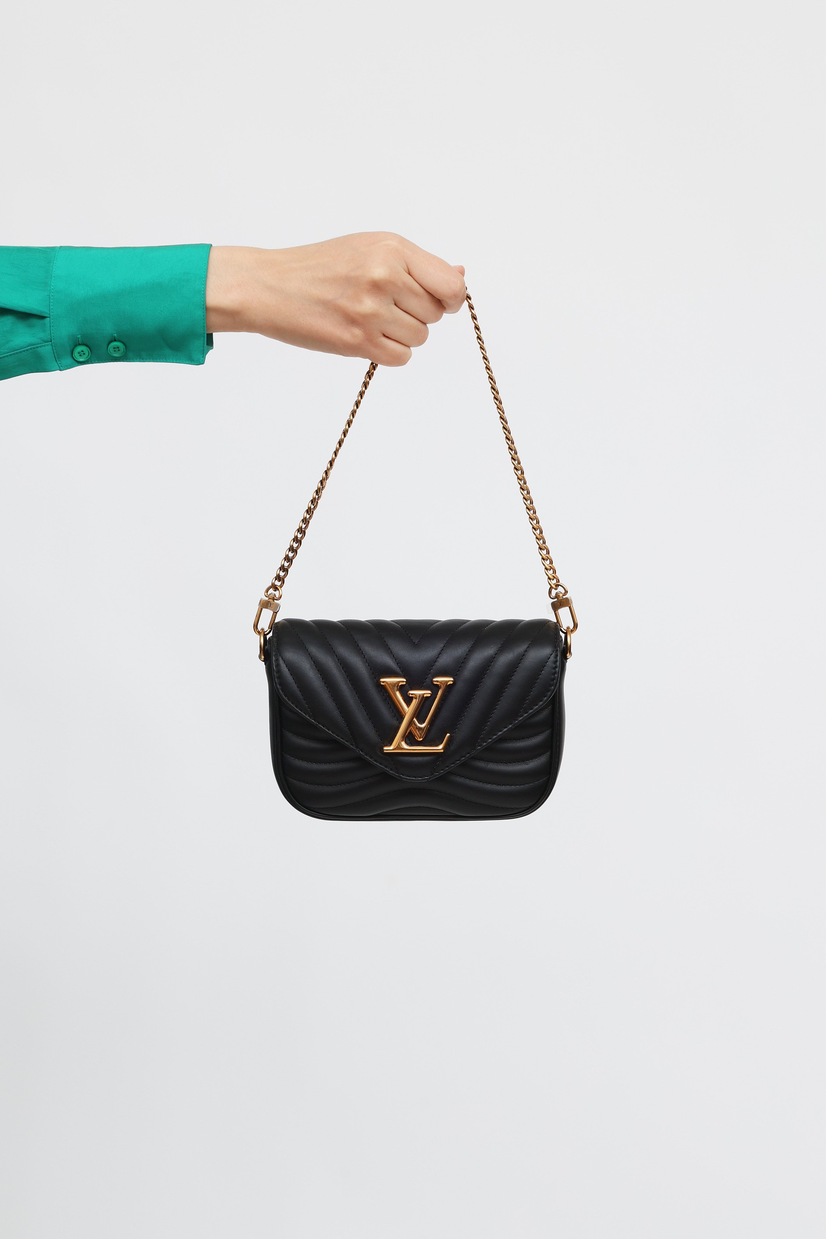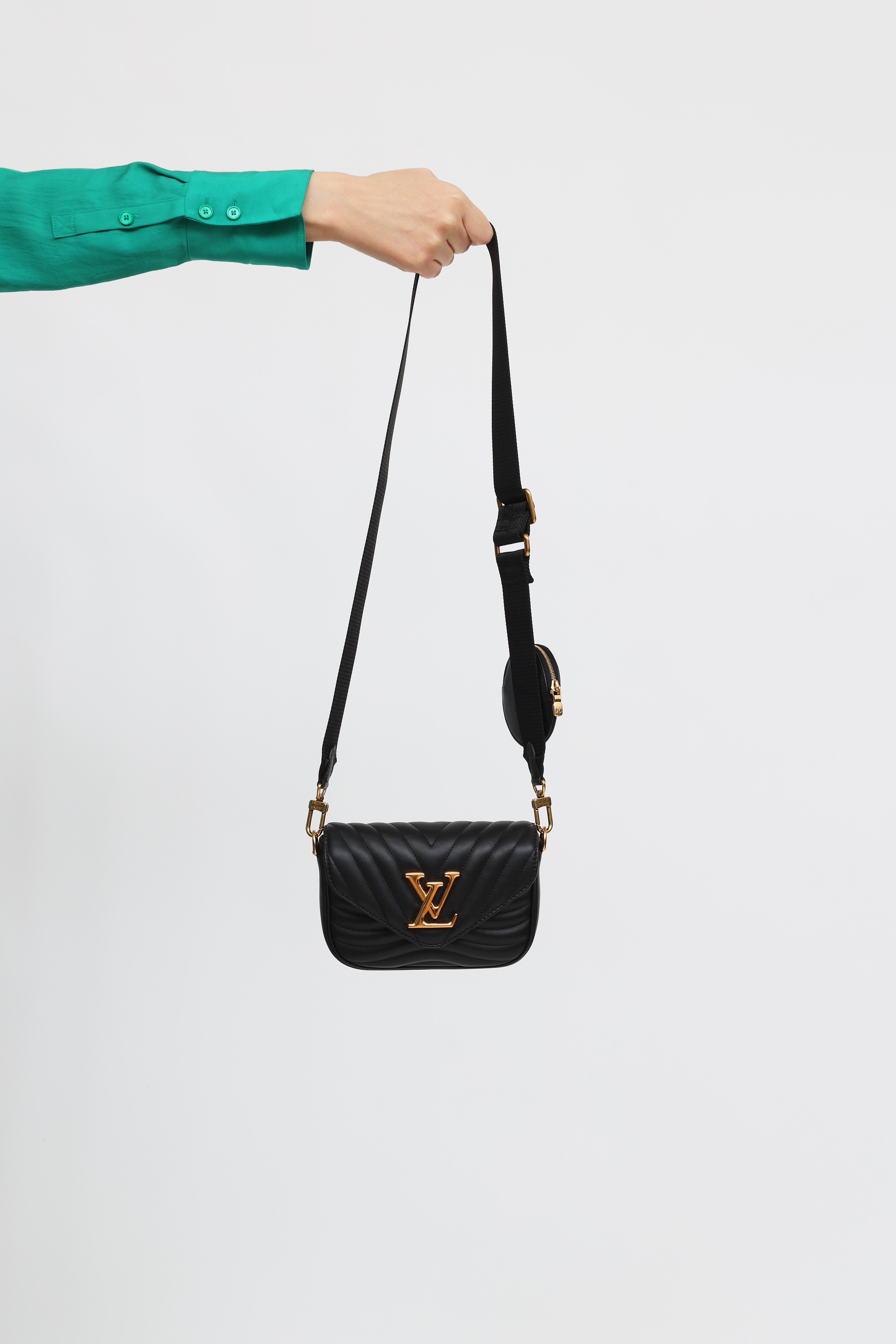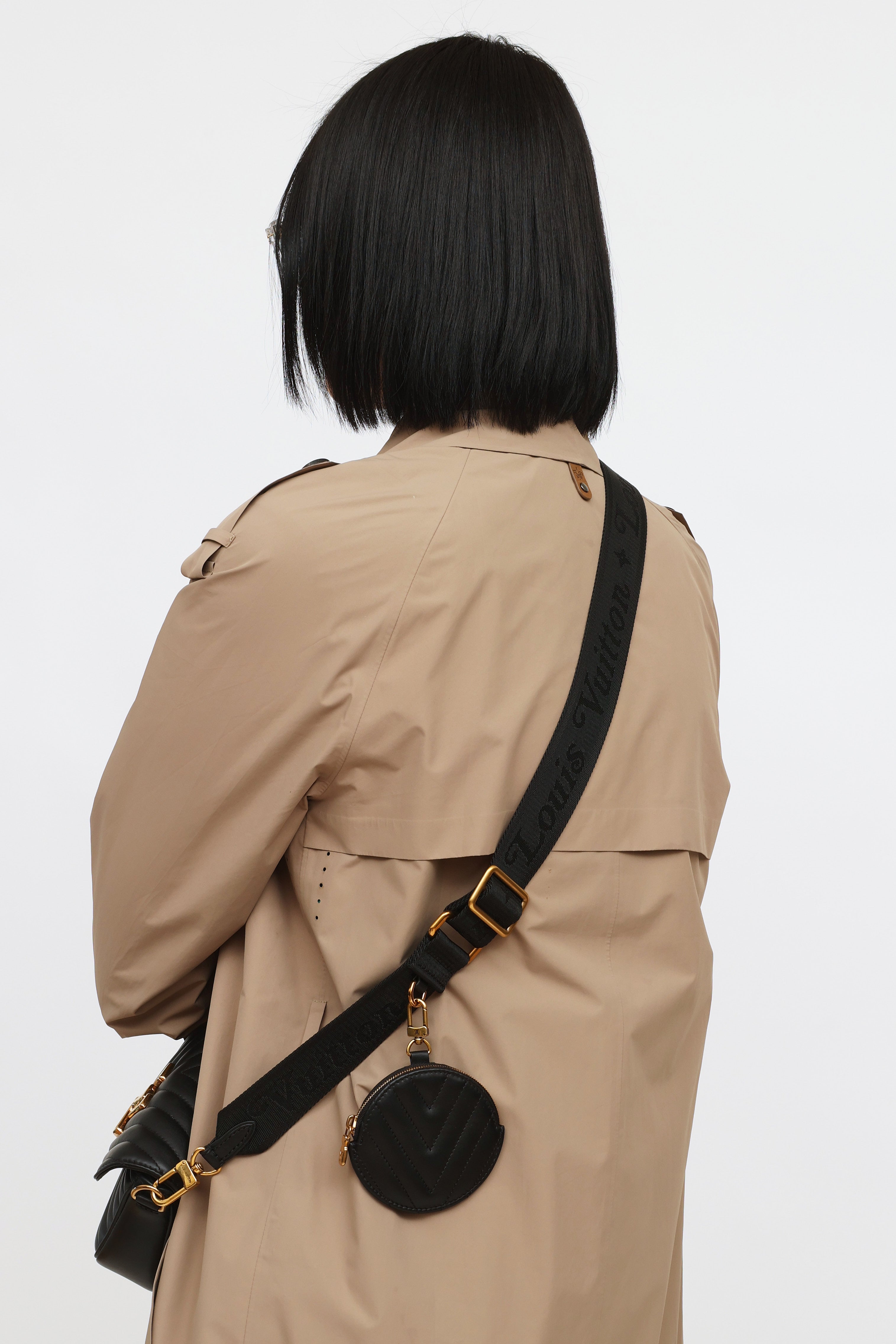 Pre-owned Louis Vuitton black New Wave Multi Pochette crossbody bag featuring quilted cowhide leather, fold over flap with magnetic closure, LV gold-tone logo hardware with detachable chain shoulder strap. Includes adjustable/detachable fabric strap featuring embroidered text logo and detachable quilted leather round coin purse. Microfiber lining. Microchipped.
