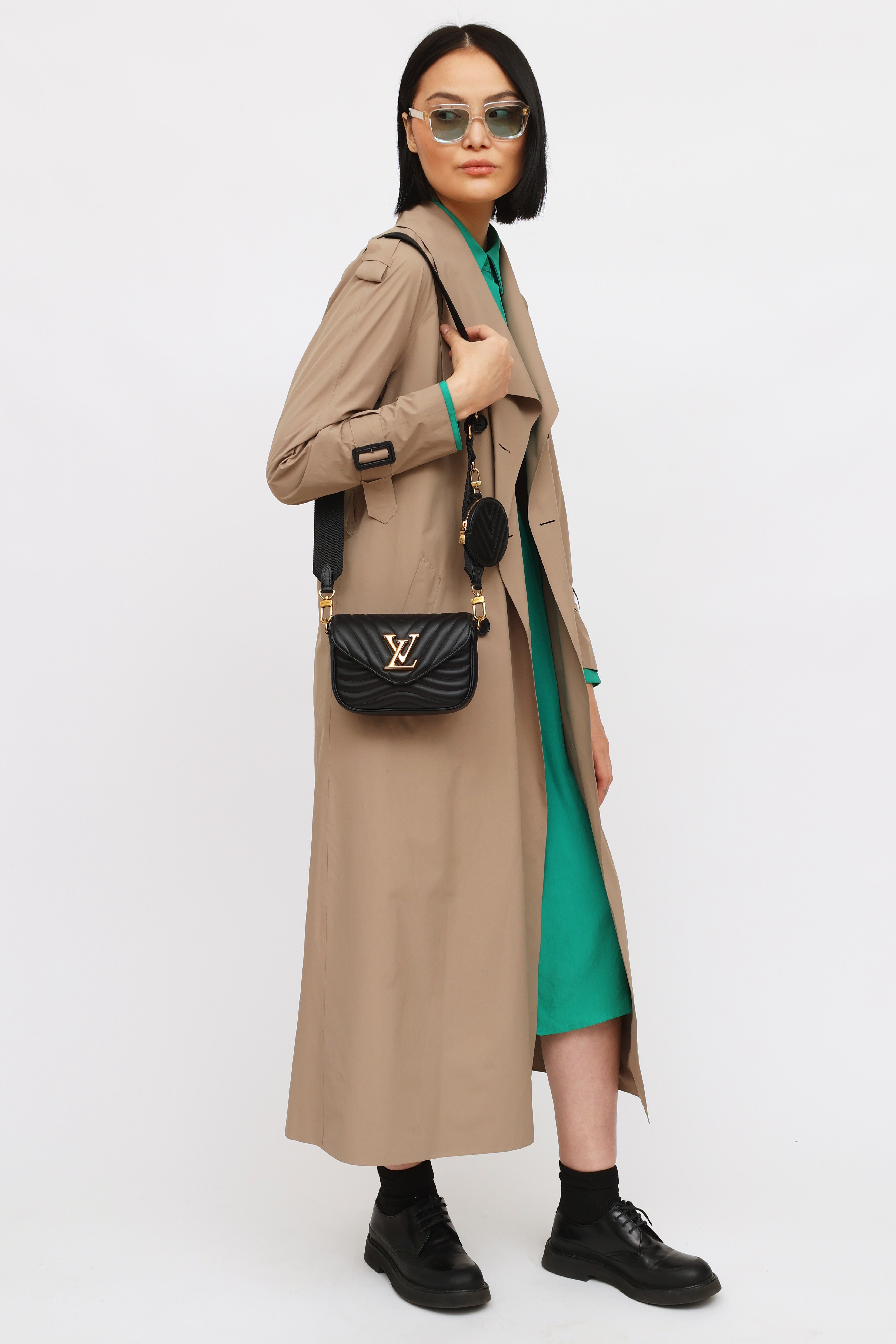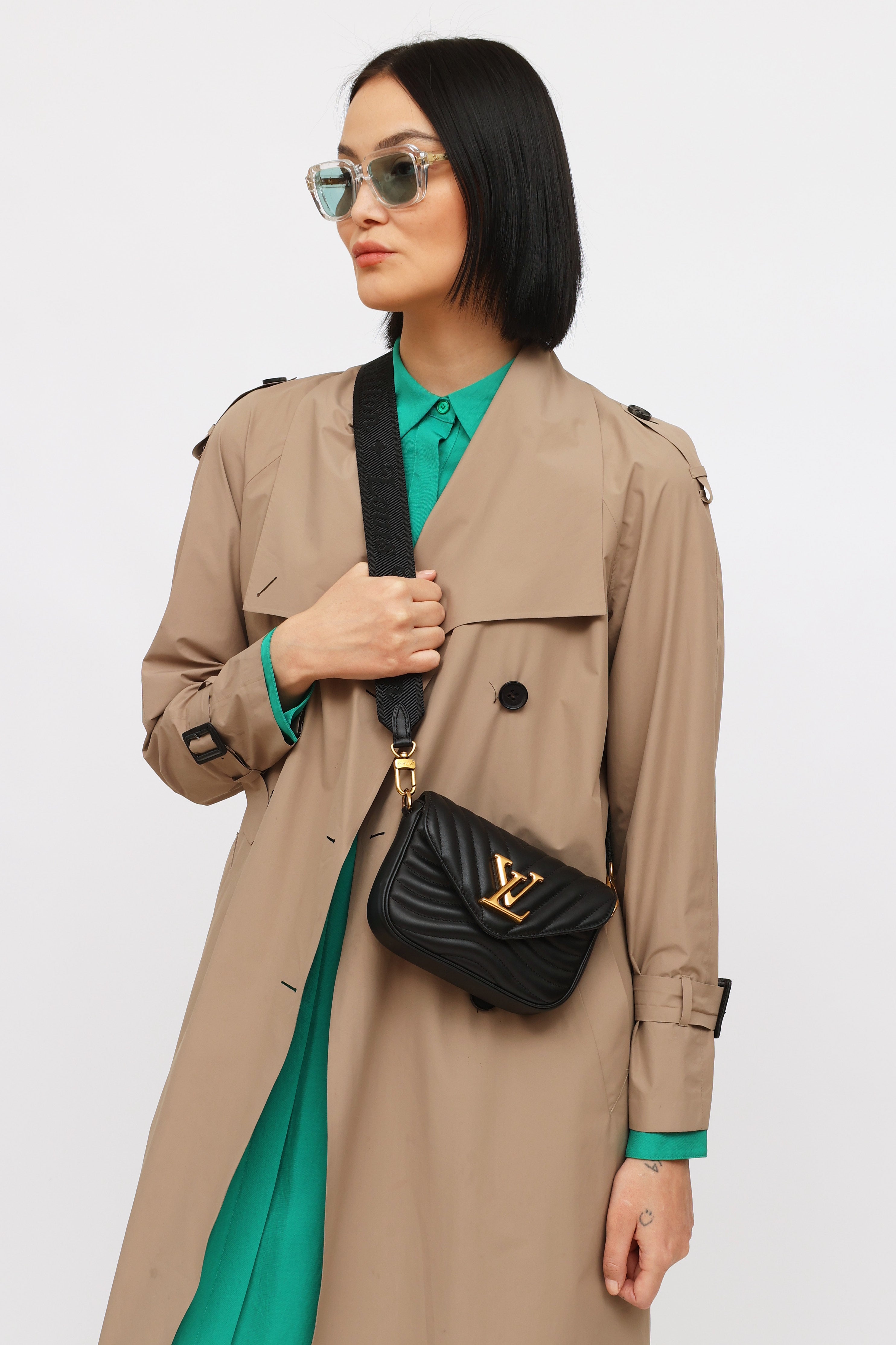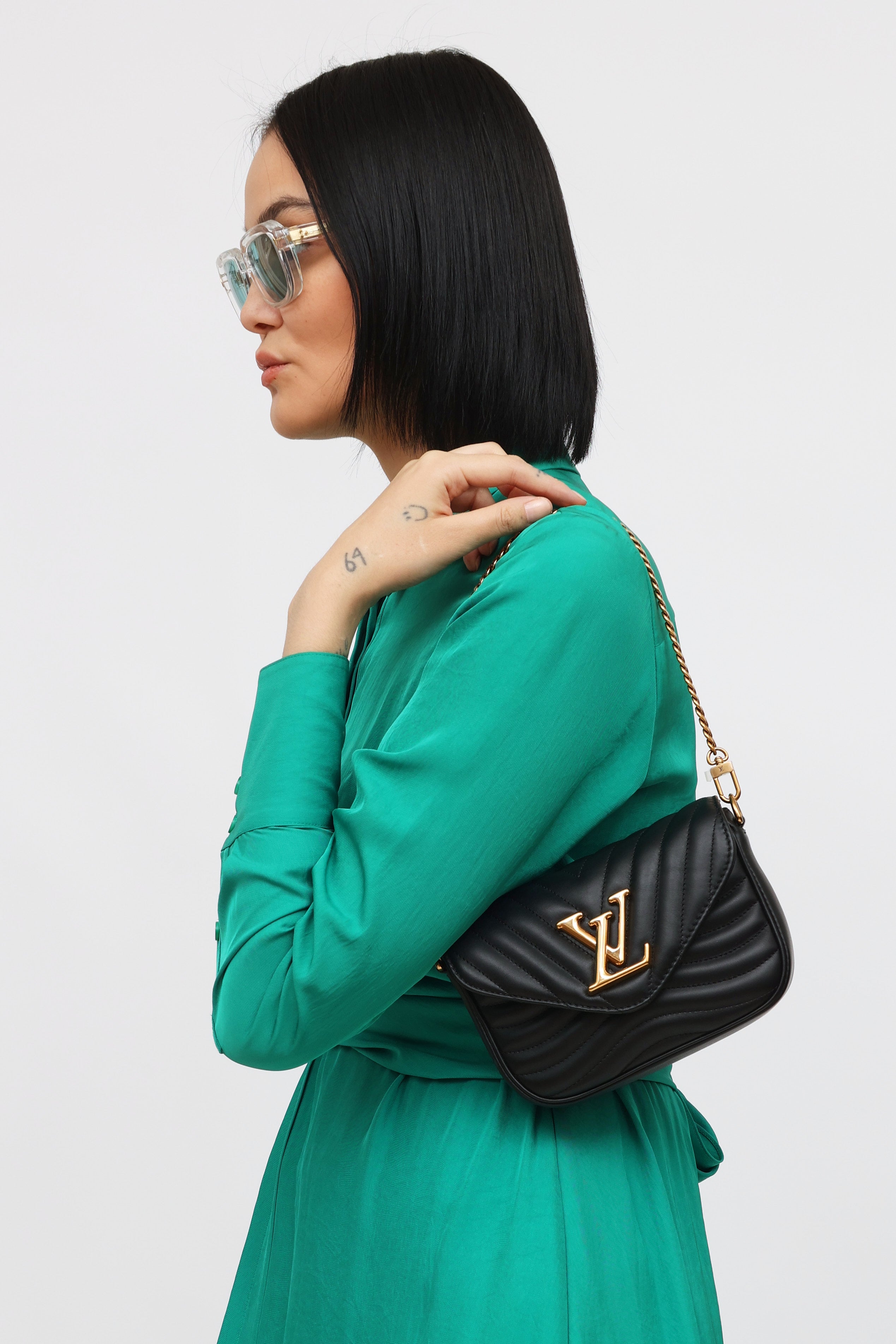 Pre-owned Louis Vuitton black New Wave Multi Pochette crossbody bag featuring quilted cowhide leather, fold over flap with magnetic closure, LV gold-tone logo hardware with detachable chain shoulder strap. Includes adjustable/detachable fabric strap featuring embroidered text logo and detachable quilted leather round coin purse. Microfiber lining. Microchipped.