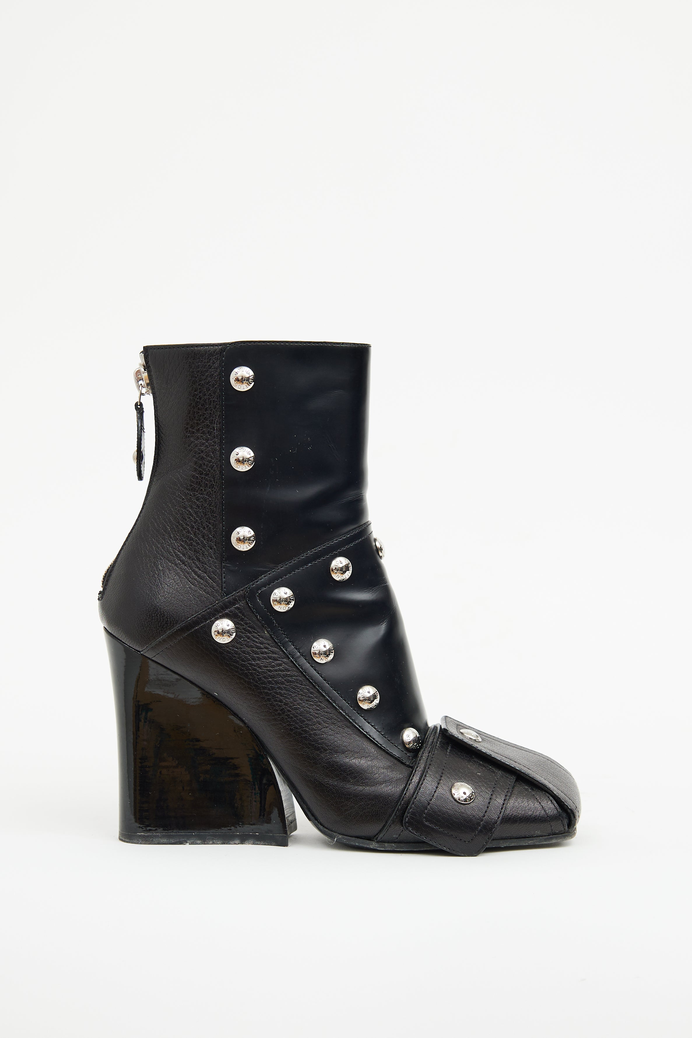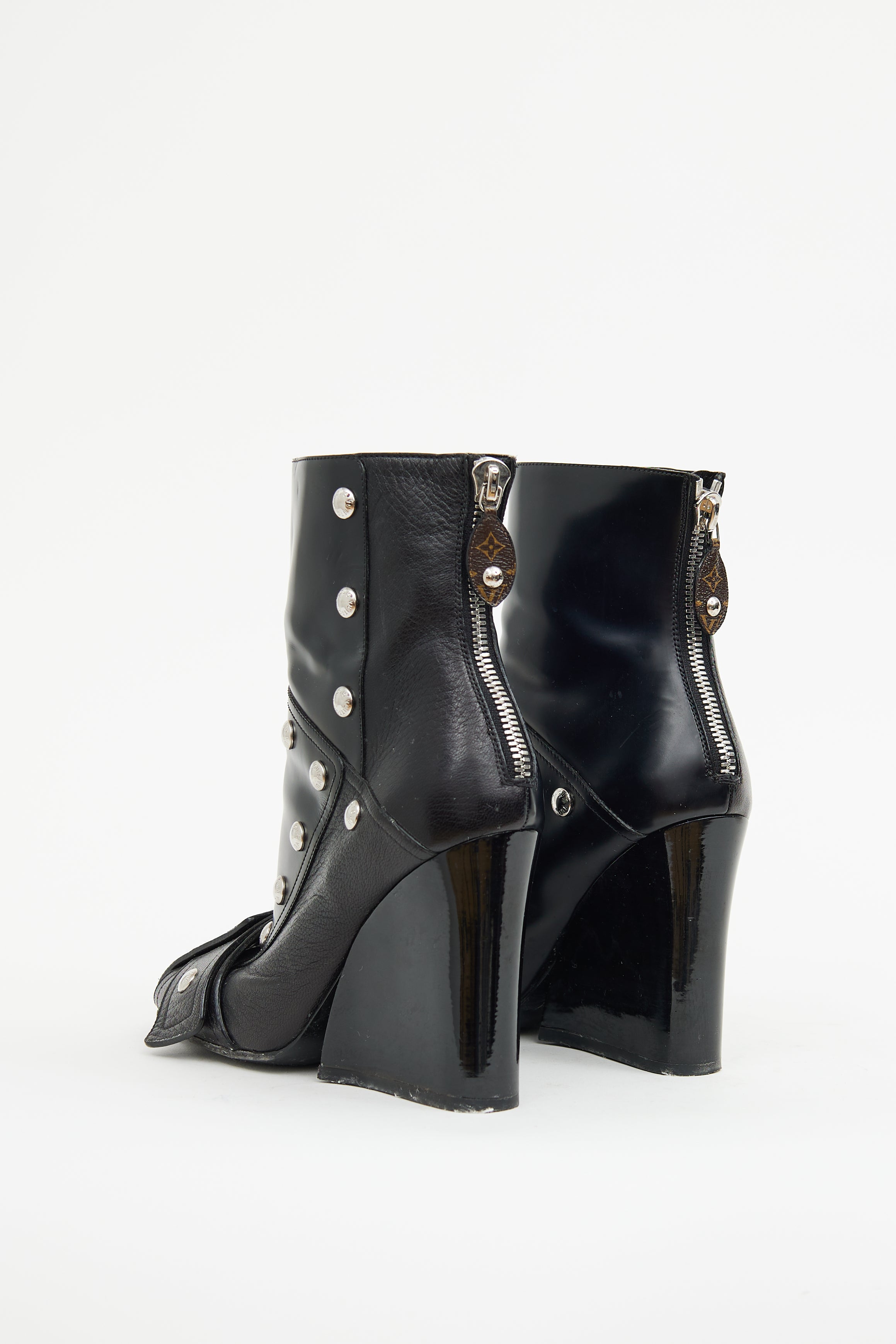 Pre-owned Louis Vuitton black Patti ankle boot featuring a square toe with decorative overlapping leather straps, silver tone studs along upper, zip closure at back with brown LV monogram pull, and wedge heel.