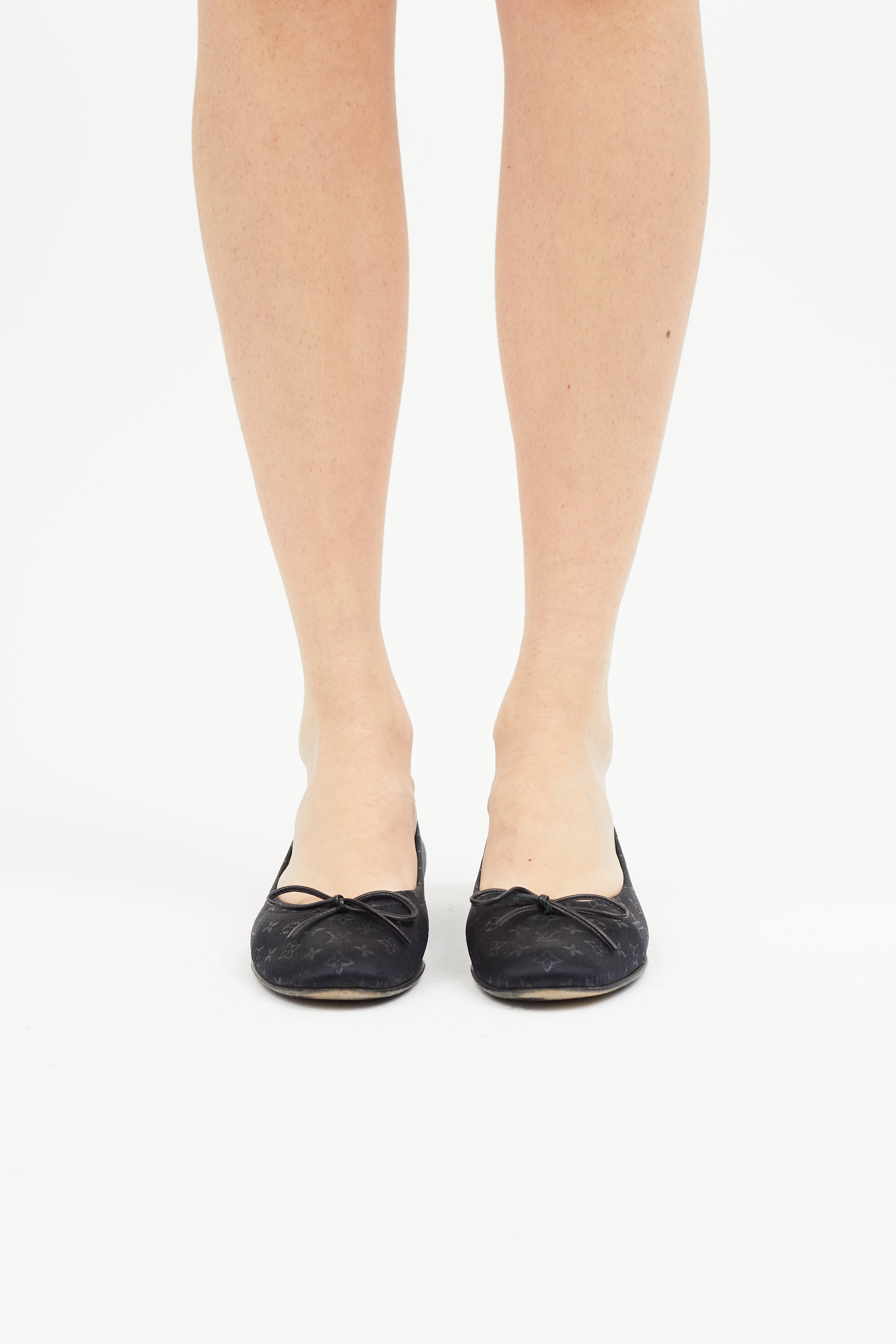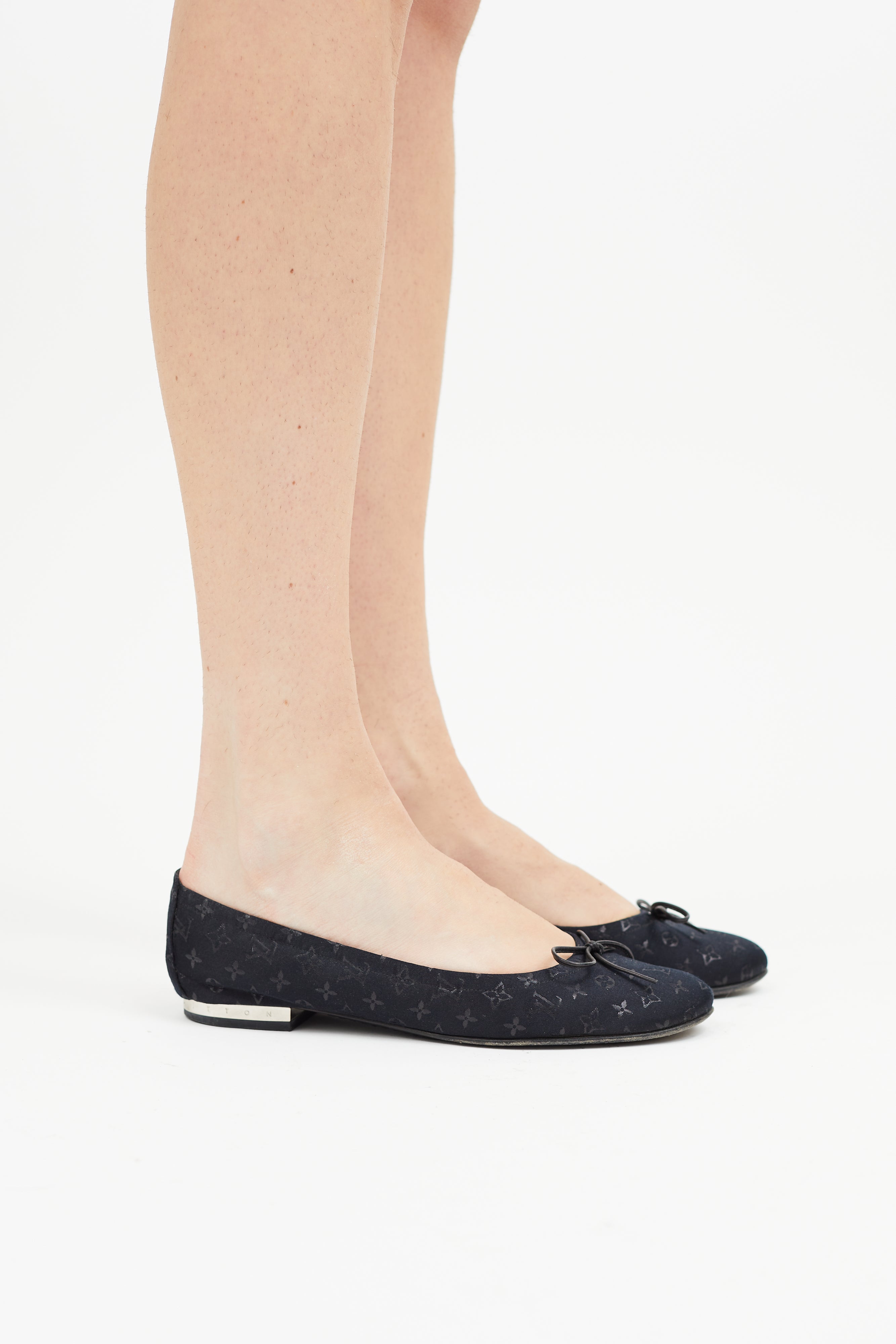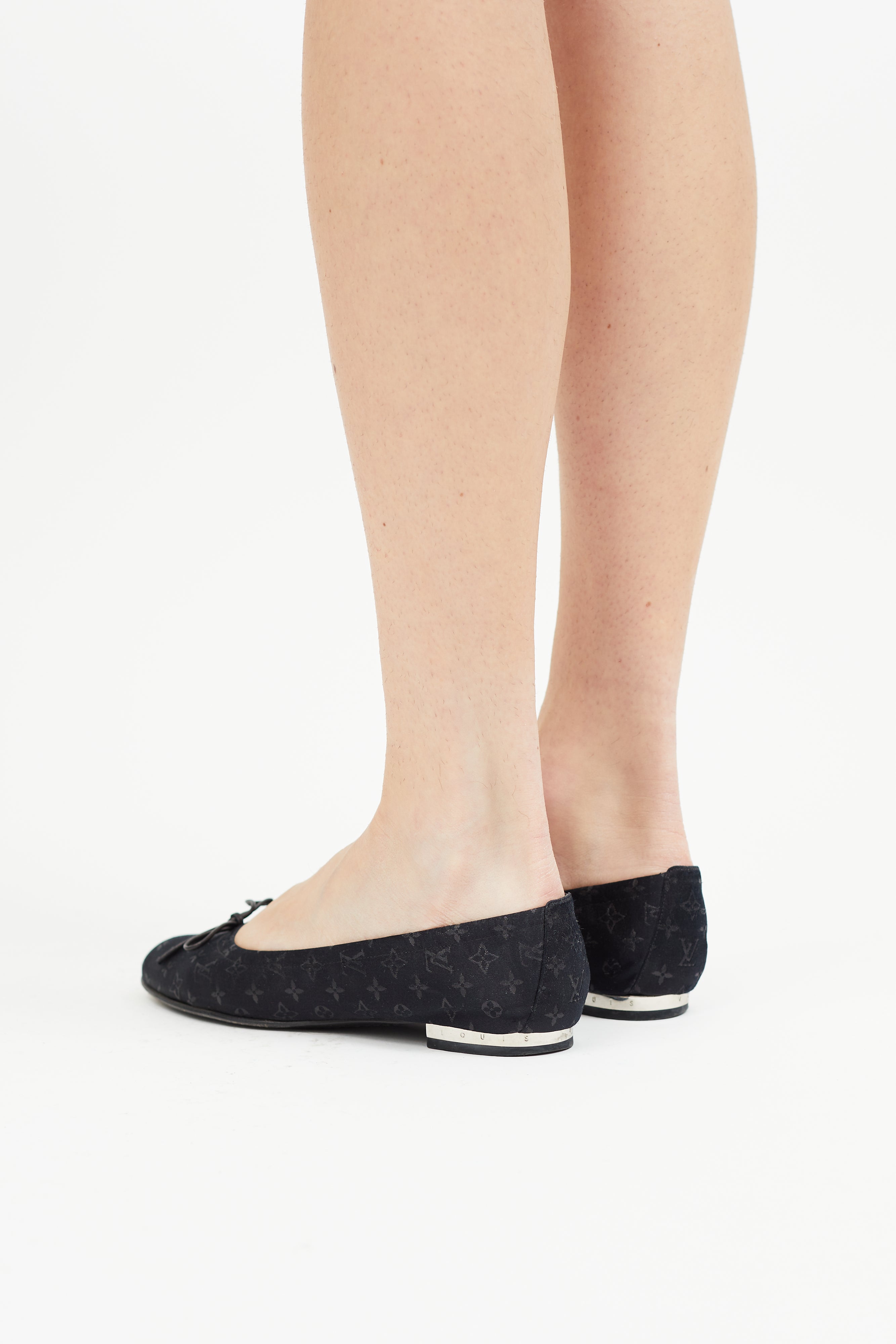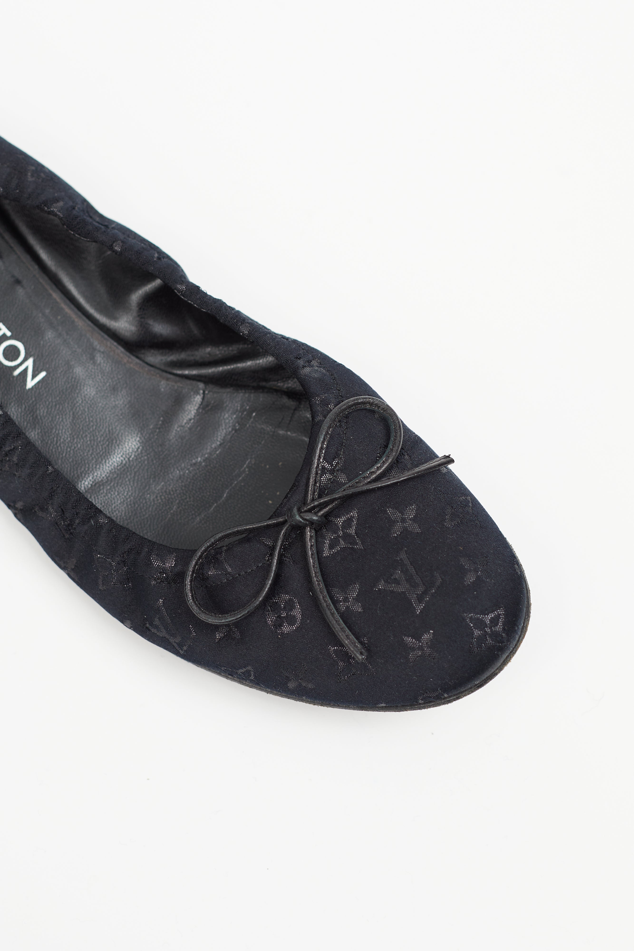 Pre-owned Louis Vuitton ballet flat featuring elastic collar, round toe, monogram satin upper, leather outsole with silver tone plating with logo at midsole heel, leather insole and leather bow at toe box.