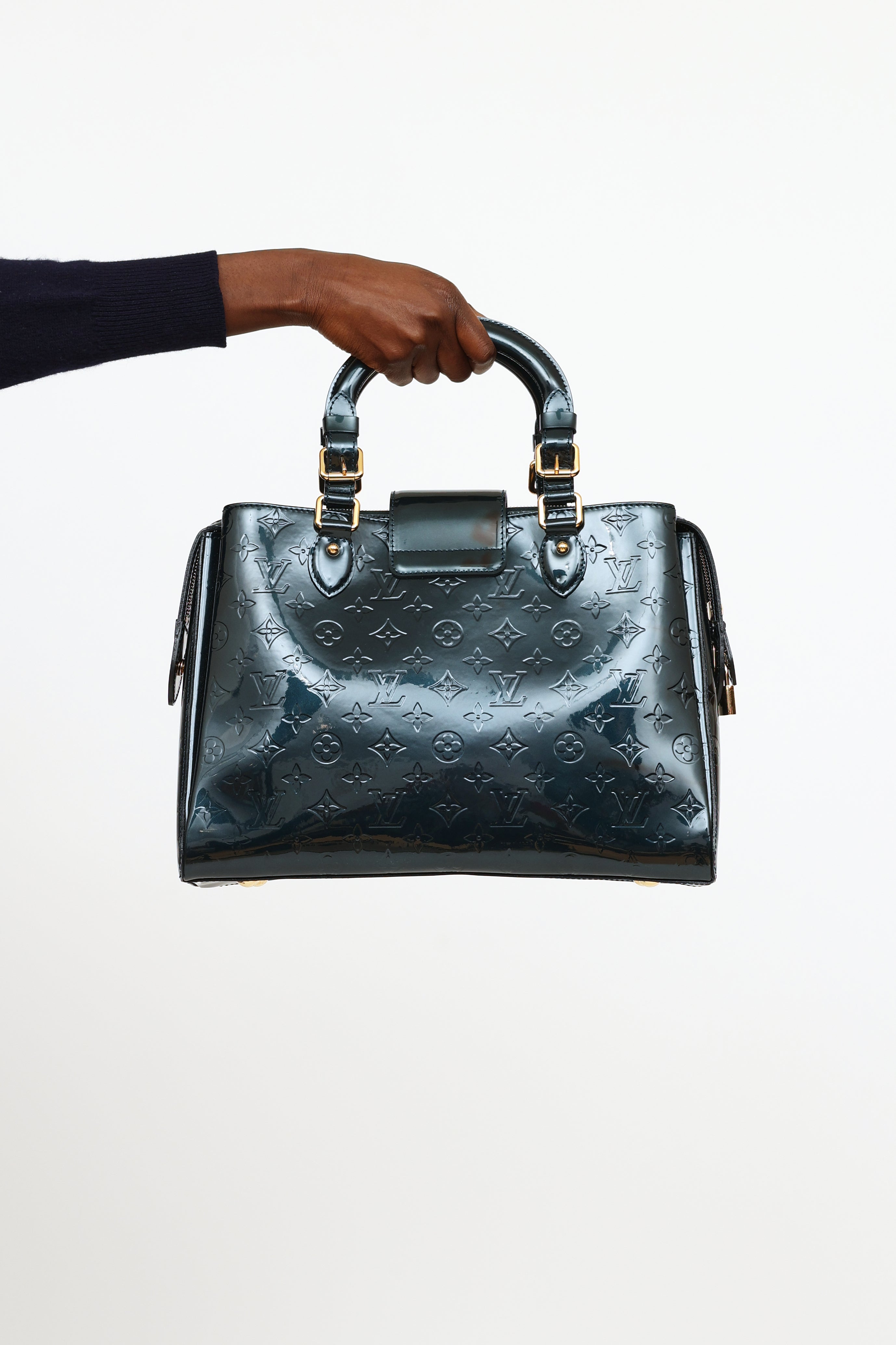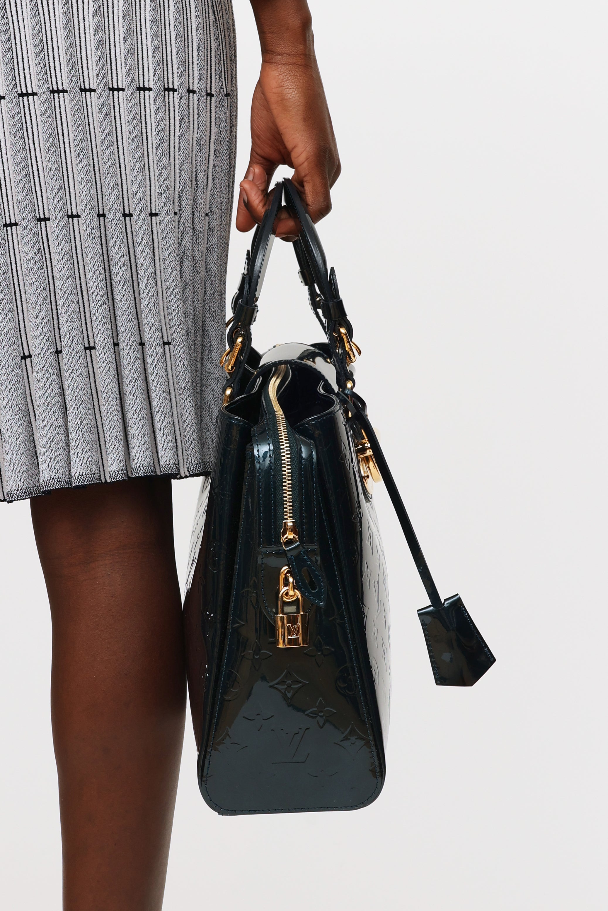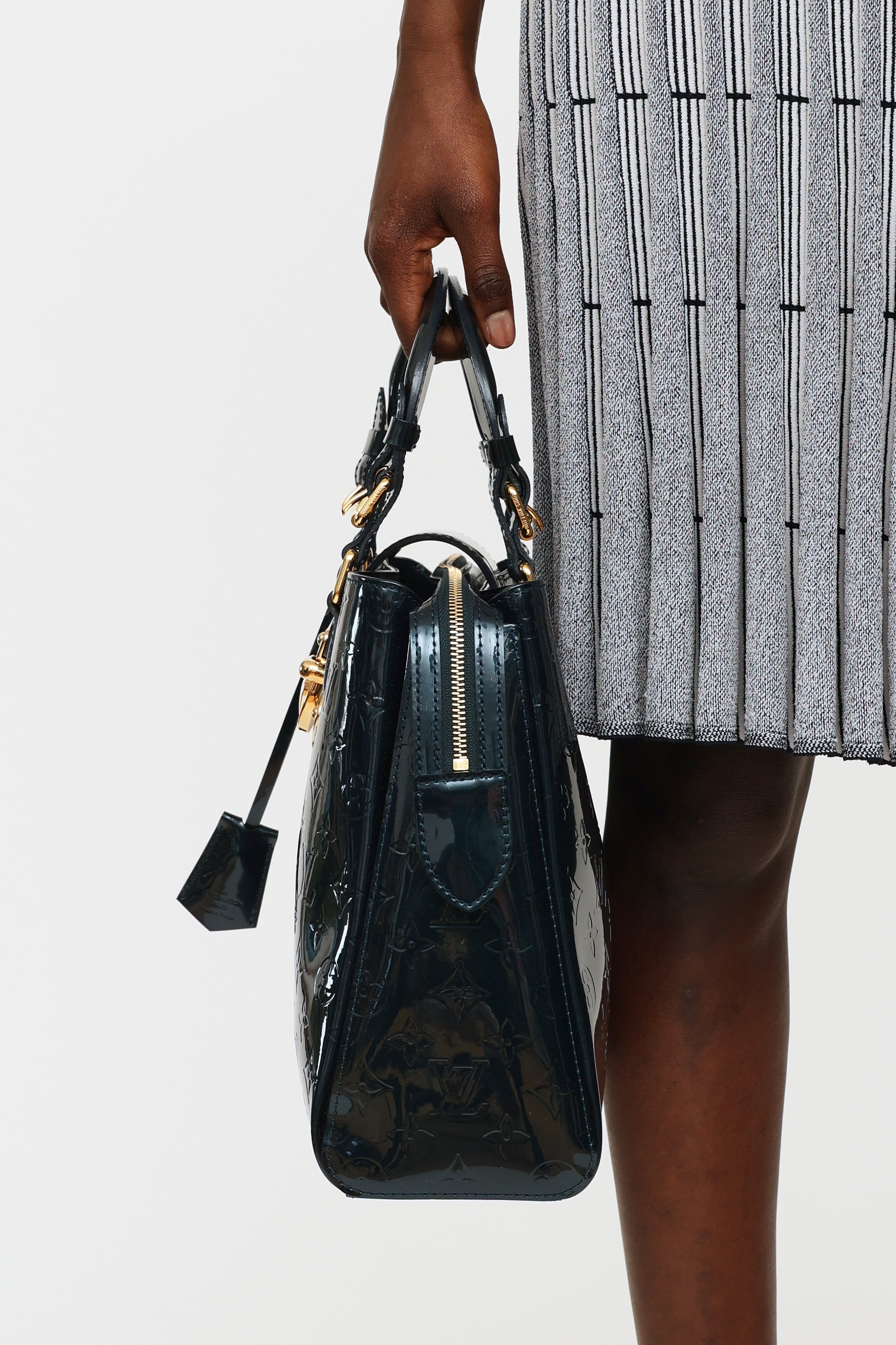 Pre-owned Louis Vuitton Bleu Nuit Vernis Melrose Avenue bag featuring LV monogram embossed vernis patent leather exterior in blue, dual rolled top handles with buckle detailing, press lock closure, padlock embossed with LV logo and detachable clochette with keys and gold-tone hardware. Interior features three compartments, two exterior open compartments and one zipped compartment with two slip pockets.