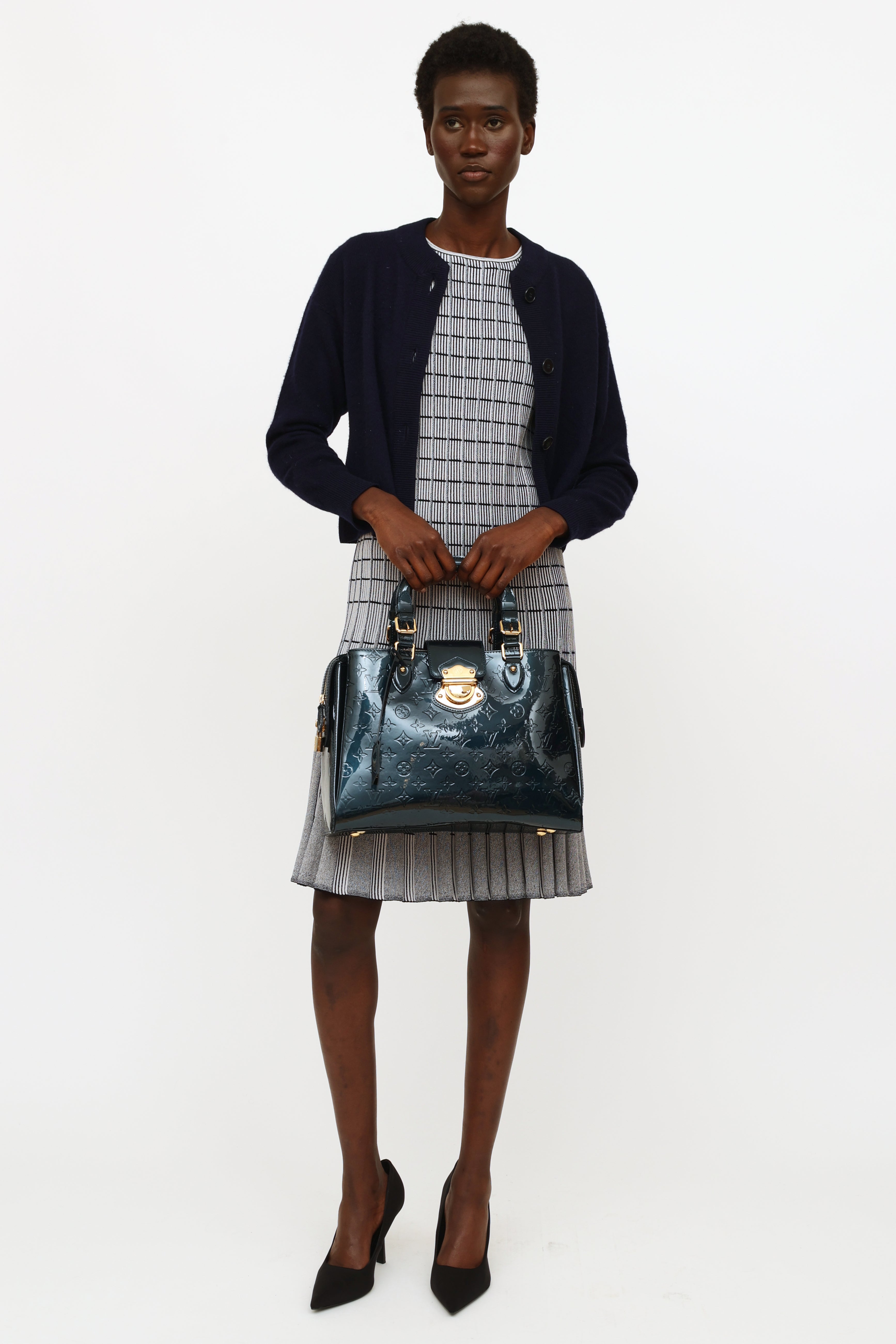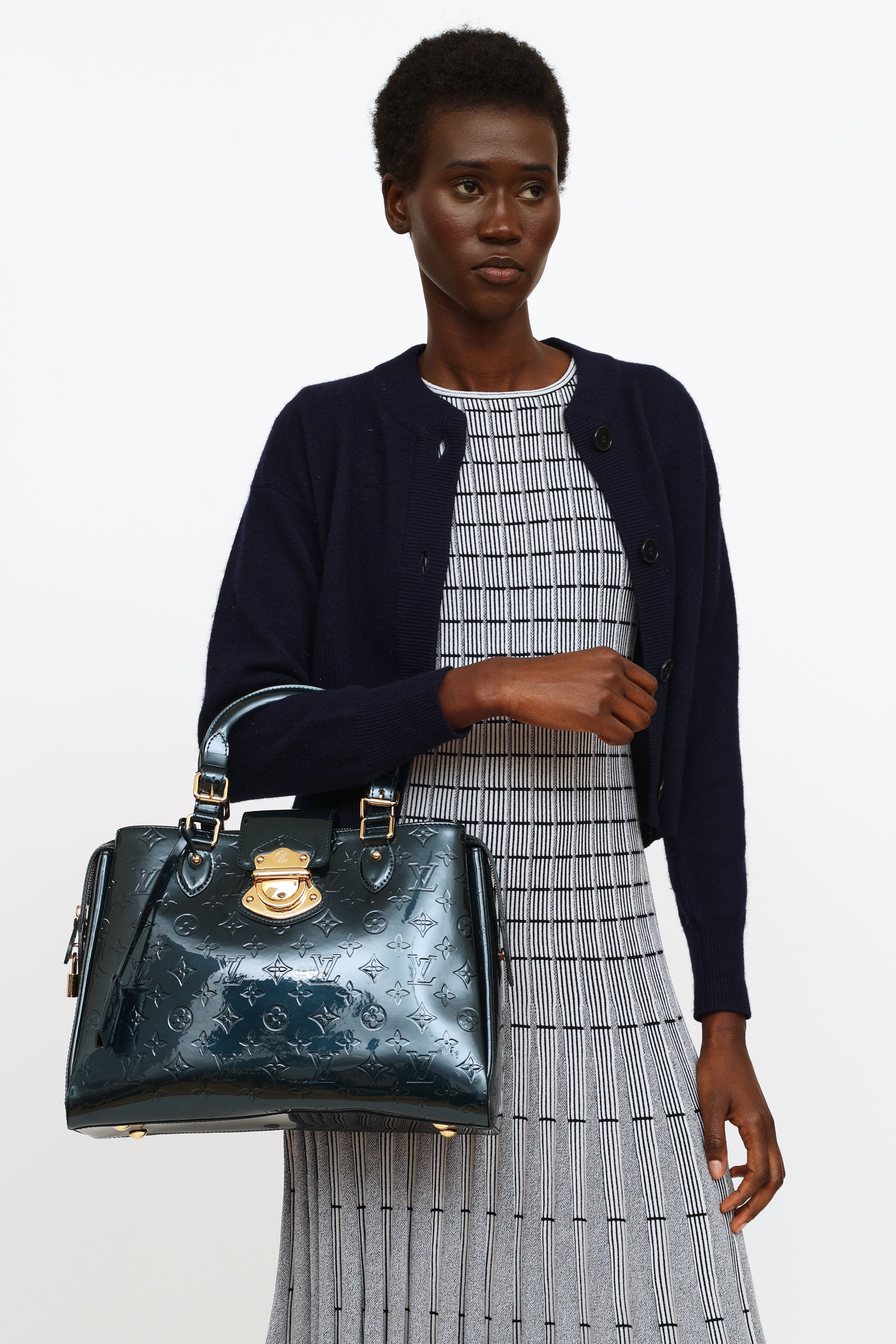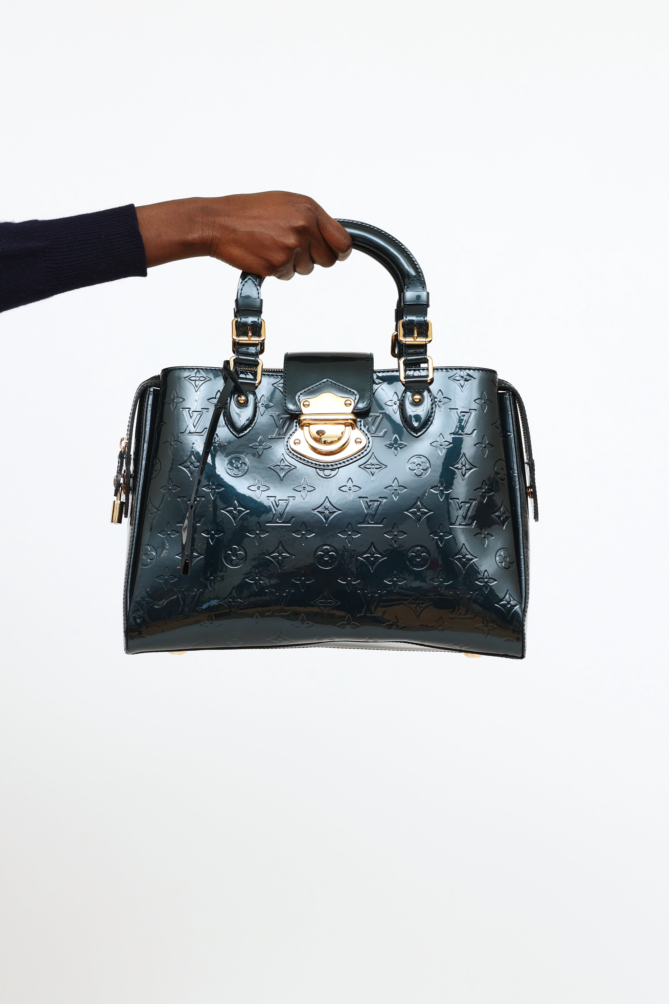 Pre-owned Louis Vuitton Bleu Nuit Vernis Melrose Avenue bag featuring LV monogram embossed vernis patent leather exterior in blue, dual rolled top handles with buckle detailing, press lock closure, padlock embossed with LV logo and detachable clochette with keys and gold-tone hardware. Interior features three compartments, two exterior open compartments and one zipped compartment with two slip pockets.