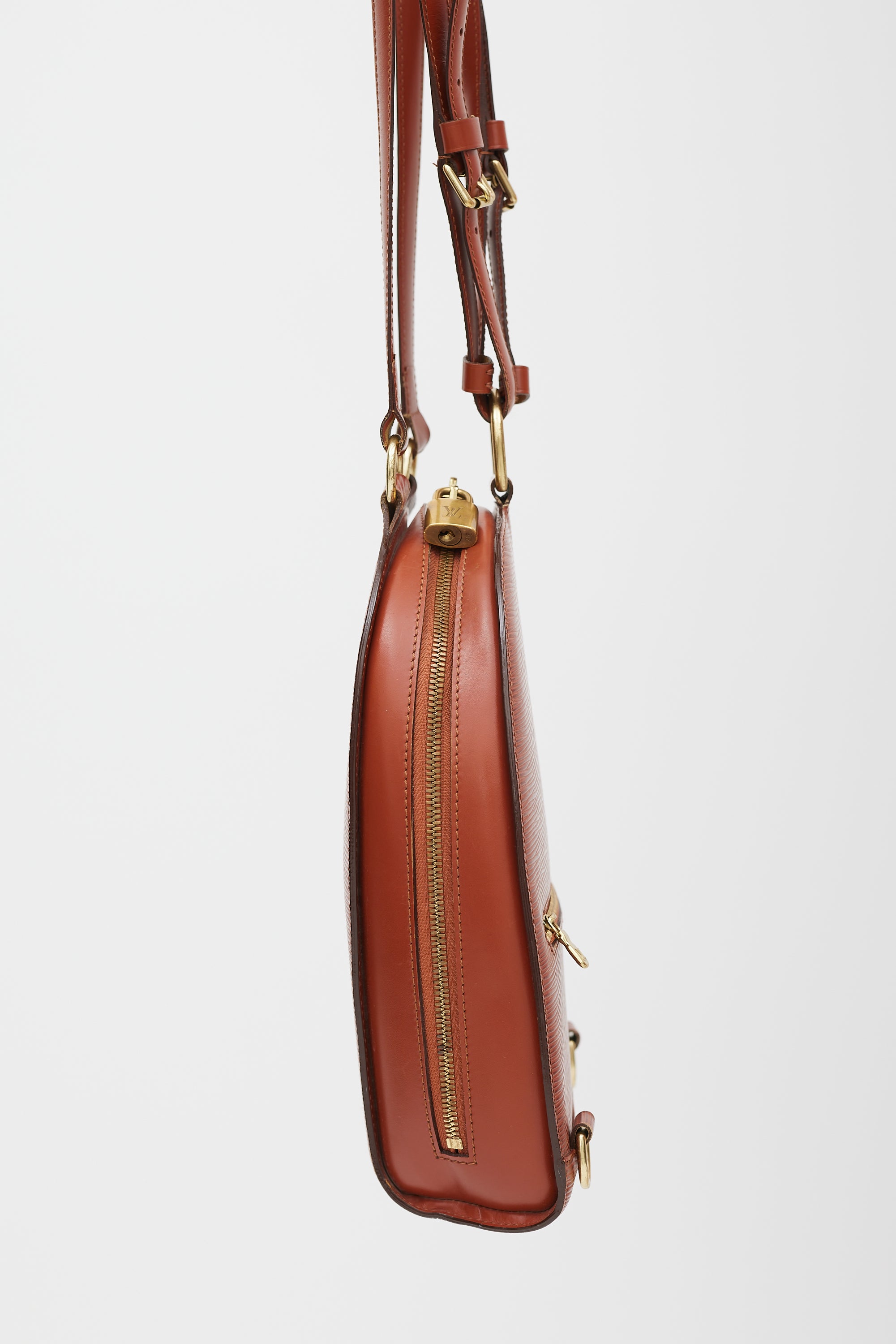 Pre-owned Louis Vuitton brown Mabillon backpack in textured Epi leather featuring a debossed logo at bottom corner, two adjustable shoulder straps, one main compartment with one slip pocket, gold tone D ring hardware, zip pocket at back, and top zip closure with padlock hardware. Comes with original dust bag.