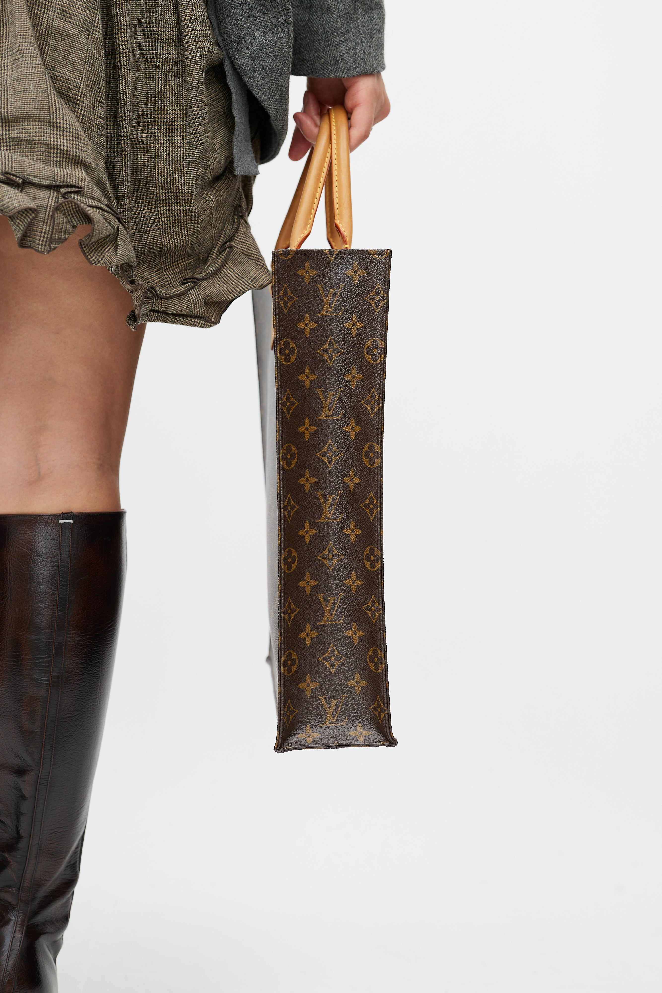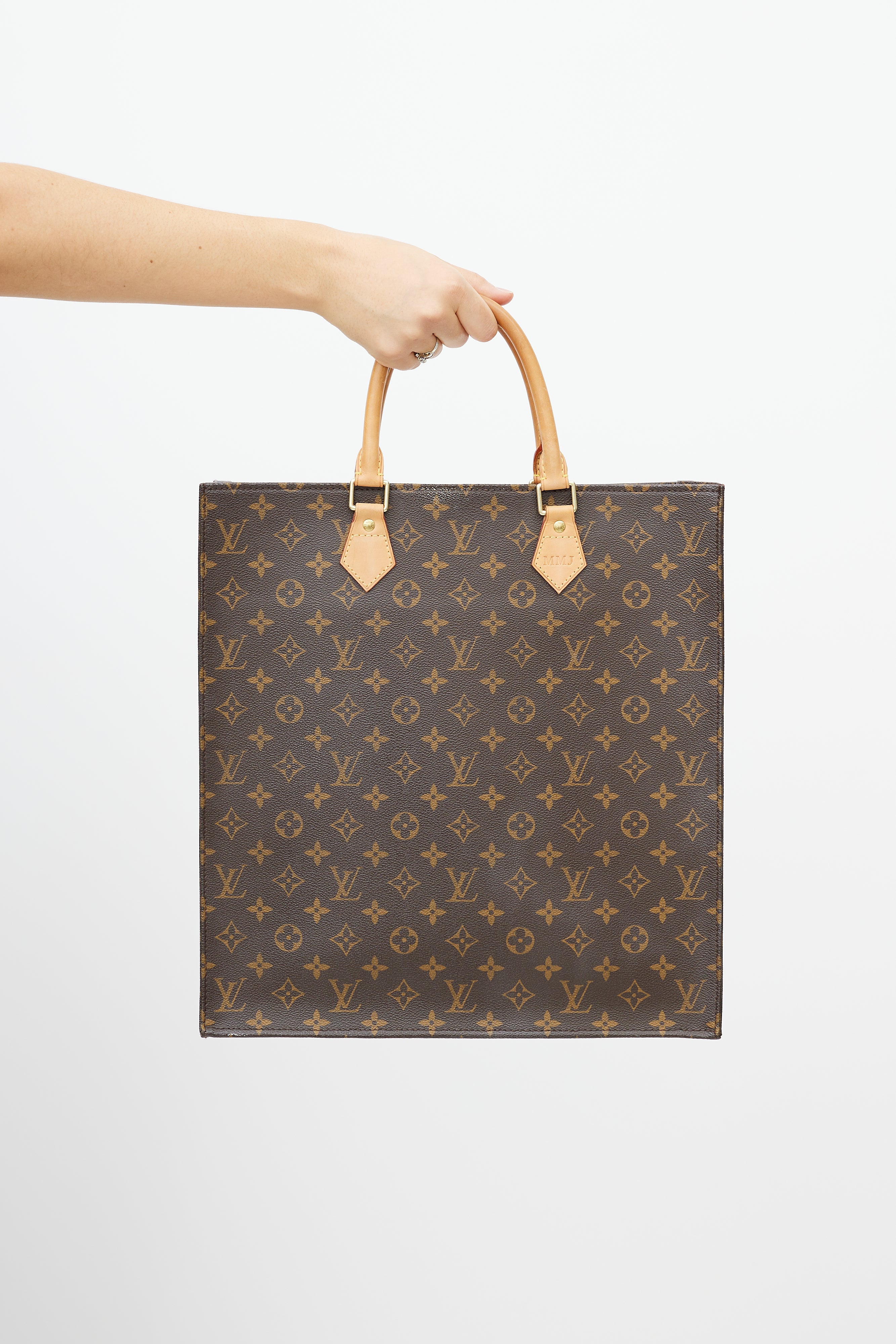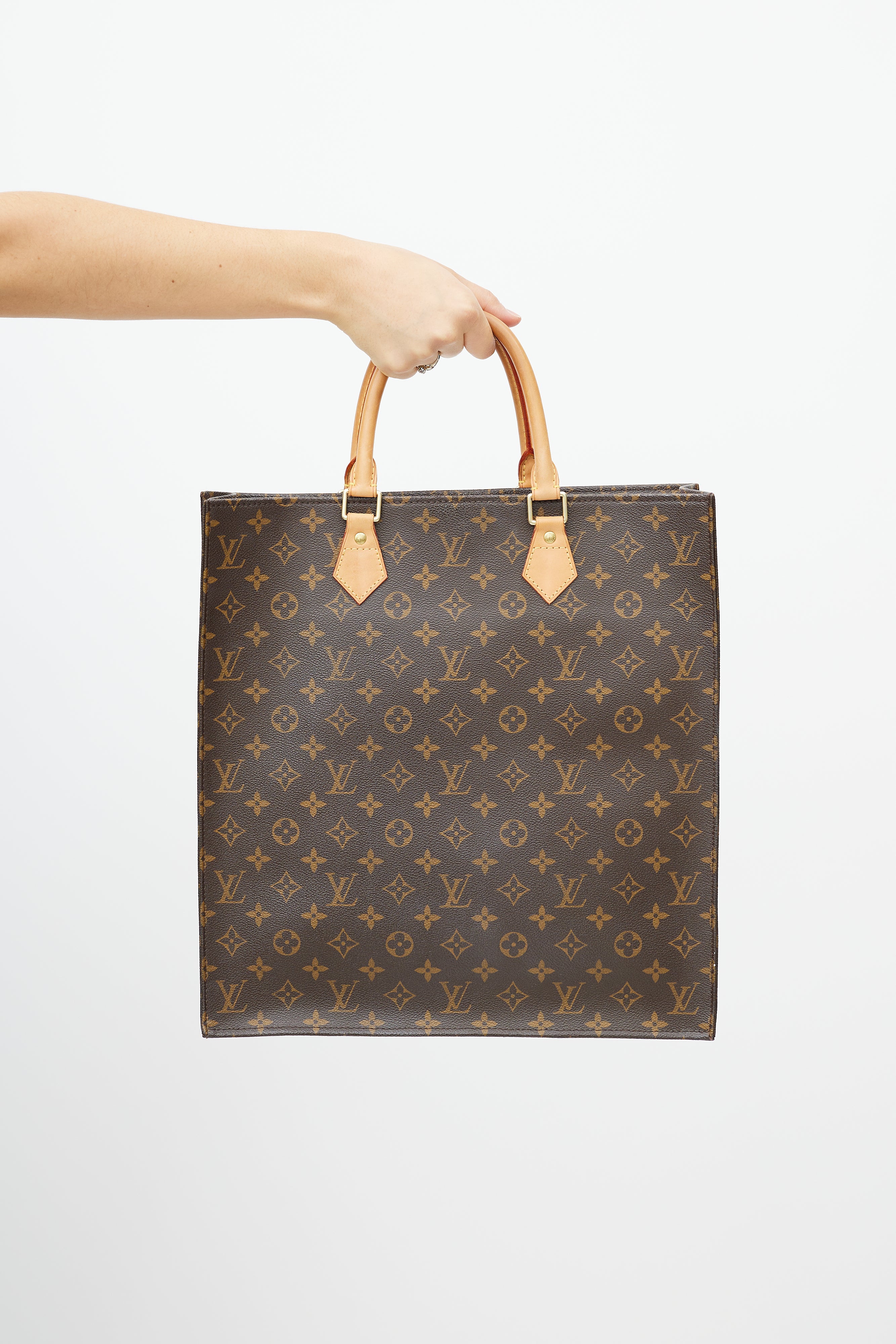 Pre-owned Louis Vuitton brown Sac Plat GM tote bag featuring signature Monogram coated canvas, Vachetta leather trim, gold tone hardware, dual rolled top handles, lined open main compartment, interior slip and phone pockets, D-ring for key attachment, and engraved "MMJ" at handle.