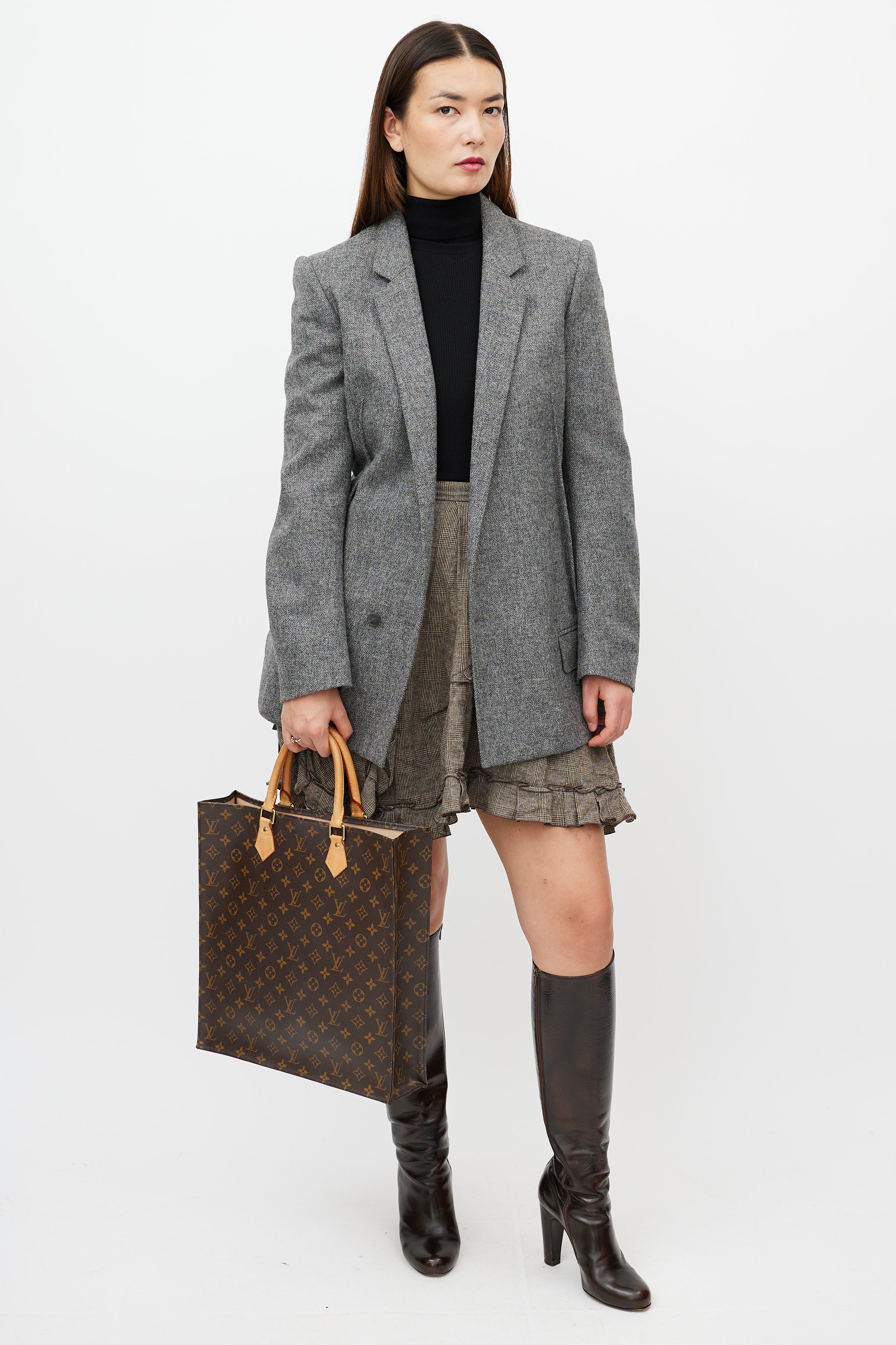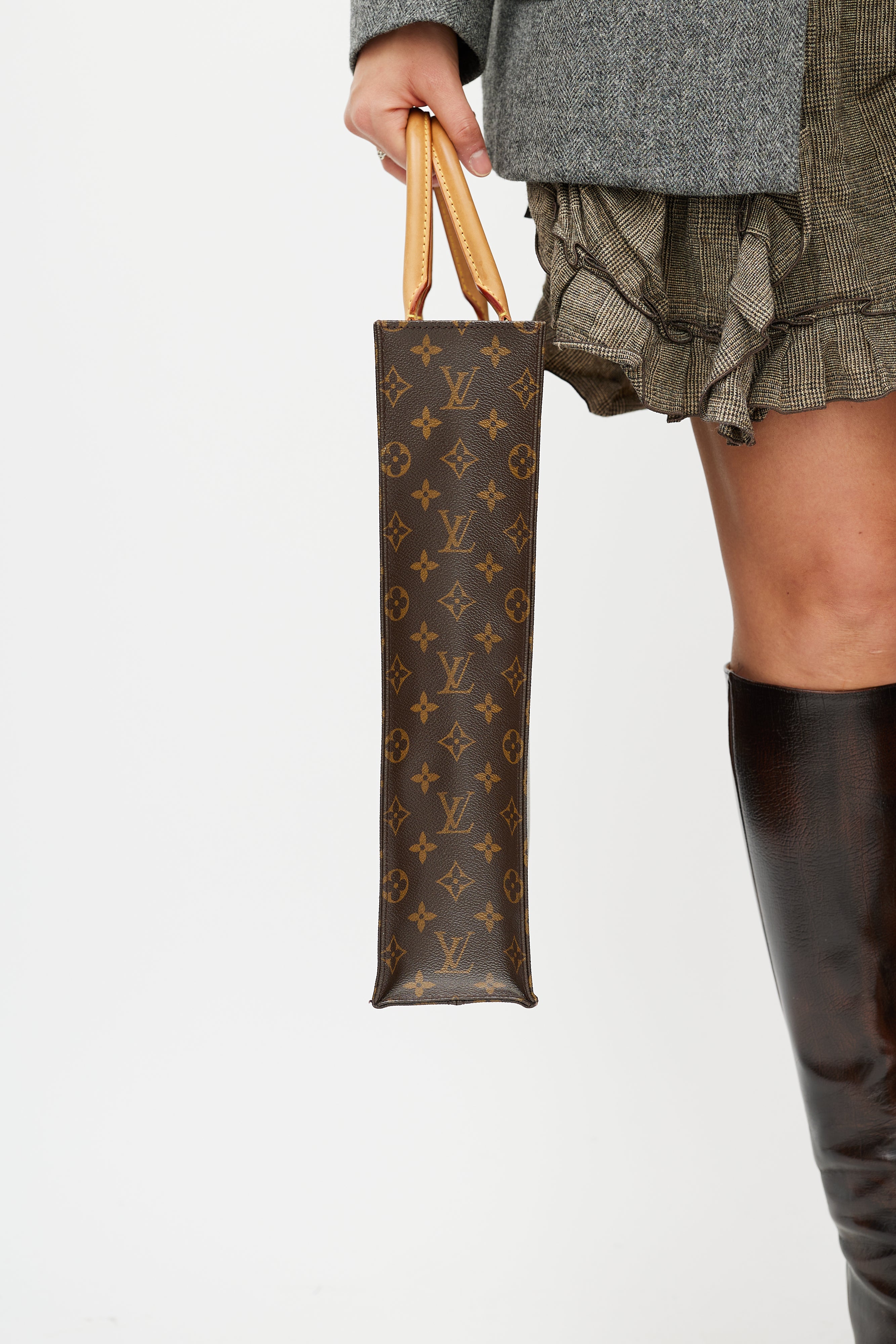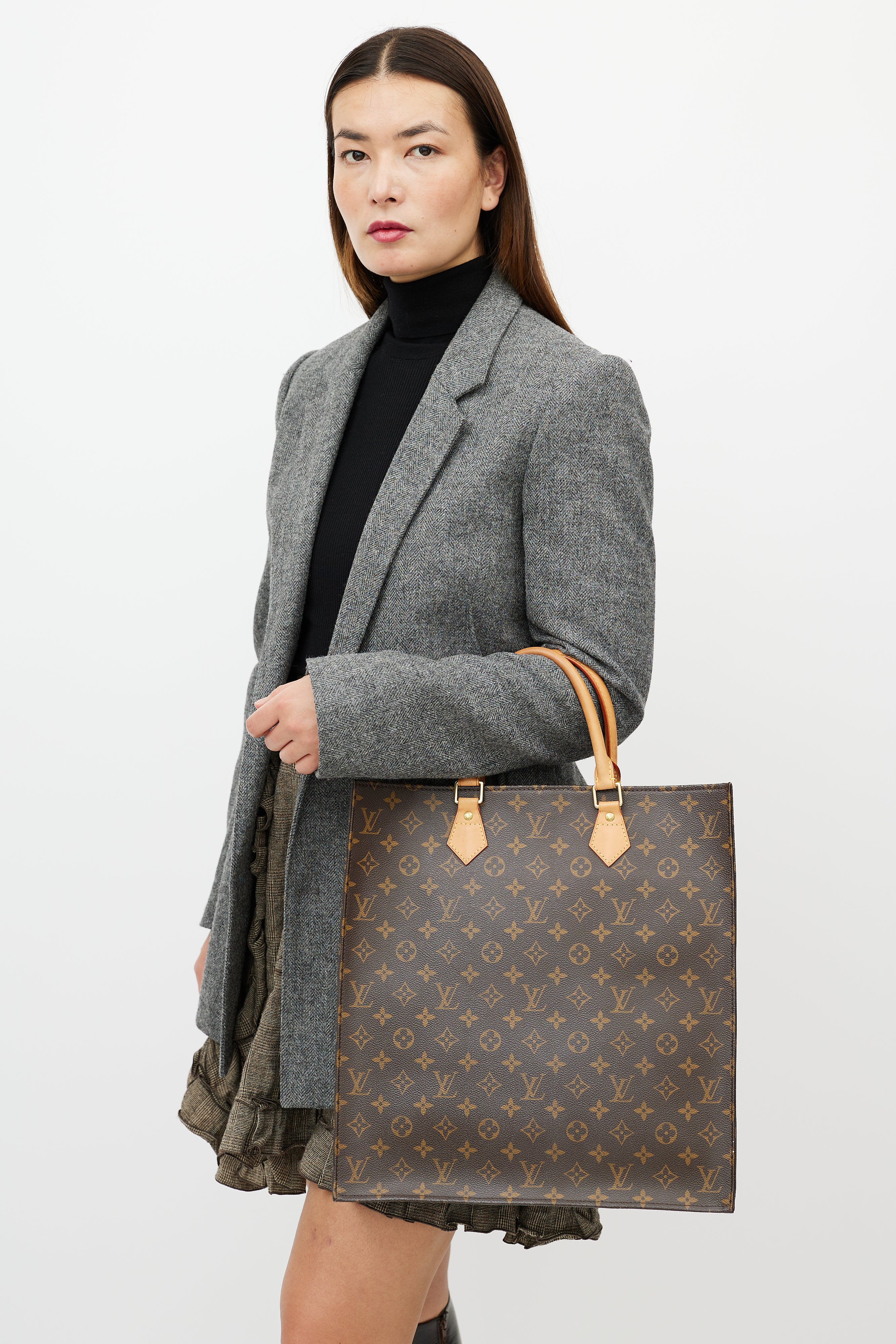Pre-owned Louis Vuitton brown Sac Plat GM tote bag featuring signature Monogram coated canvas, Vachetta leather trim, gold tone hardware, dual rolled top handles, lined open main compartment, interior slip and phone pockets, D-ring for key attachment, and engraved "MMJ" at handle.