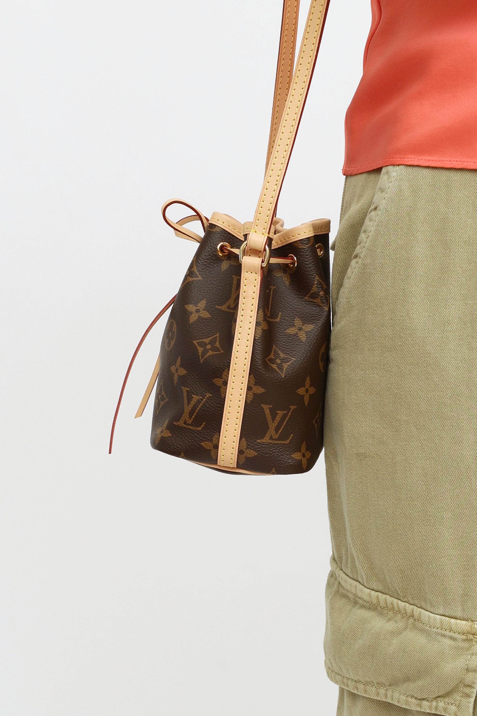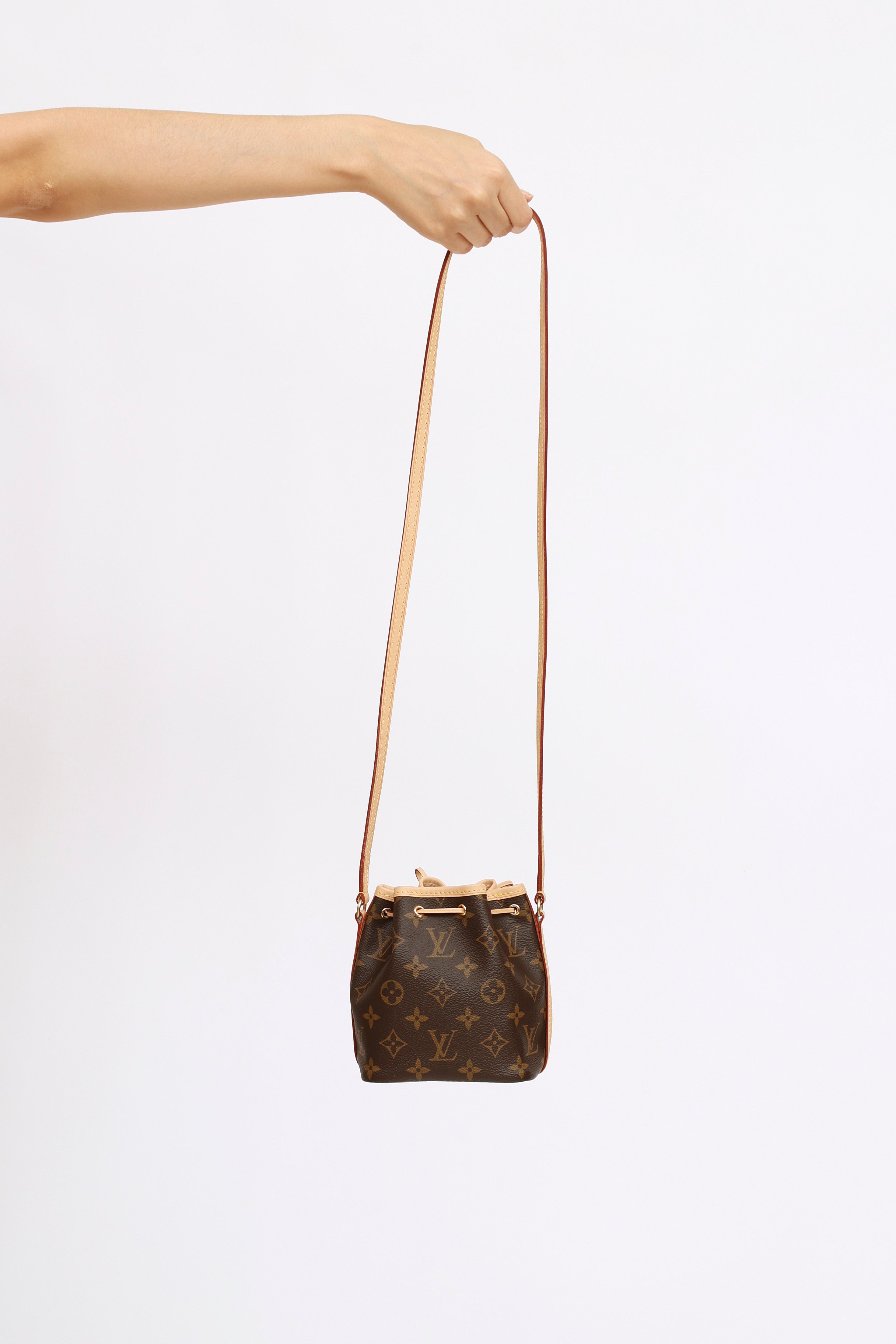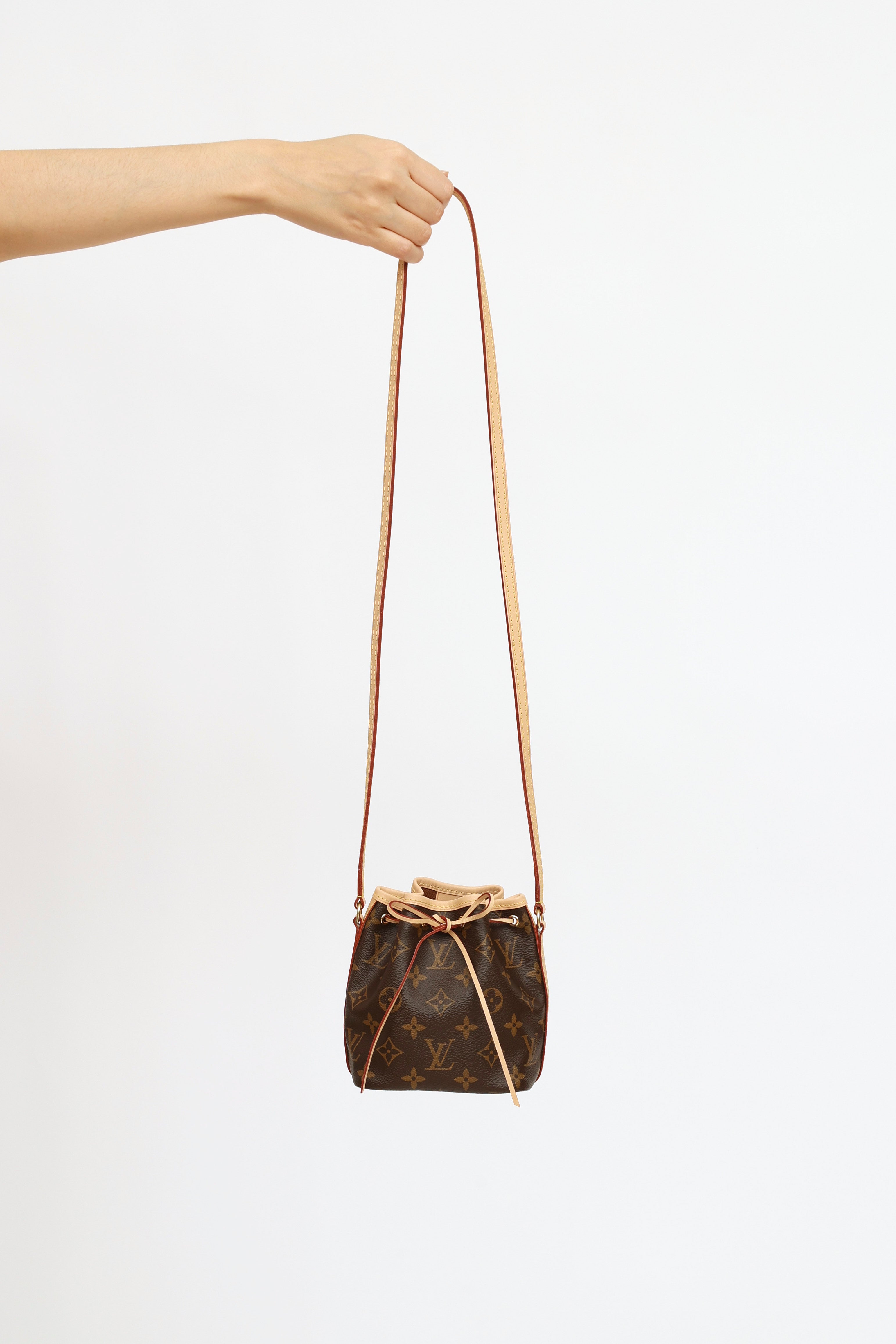 Pre-owned mini Louis Vuitton brown Nano Noé bucket bag featuring monogram coated canvas, natural leather trim, drawstring closure, gold tone hardware, flat leather strap and interior lined in brown textile.