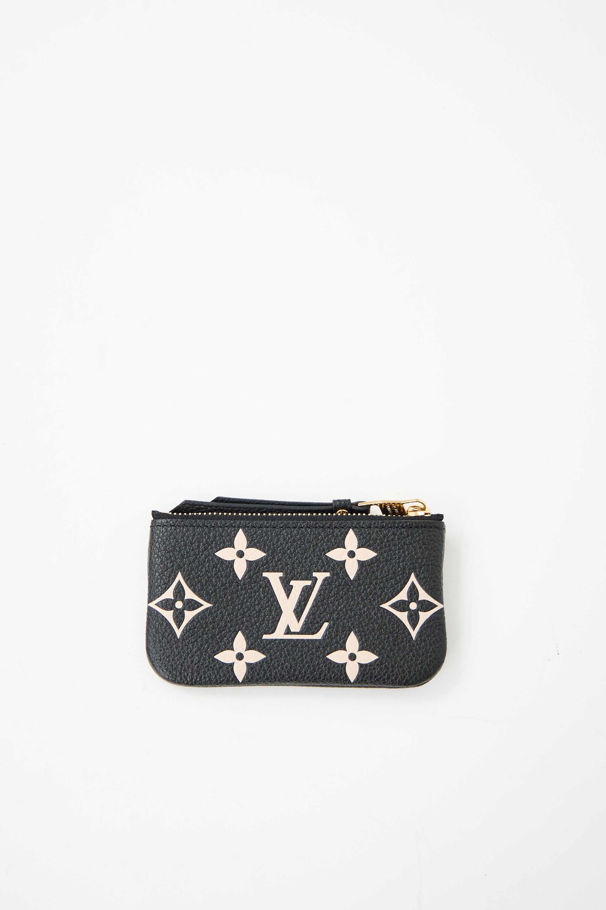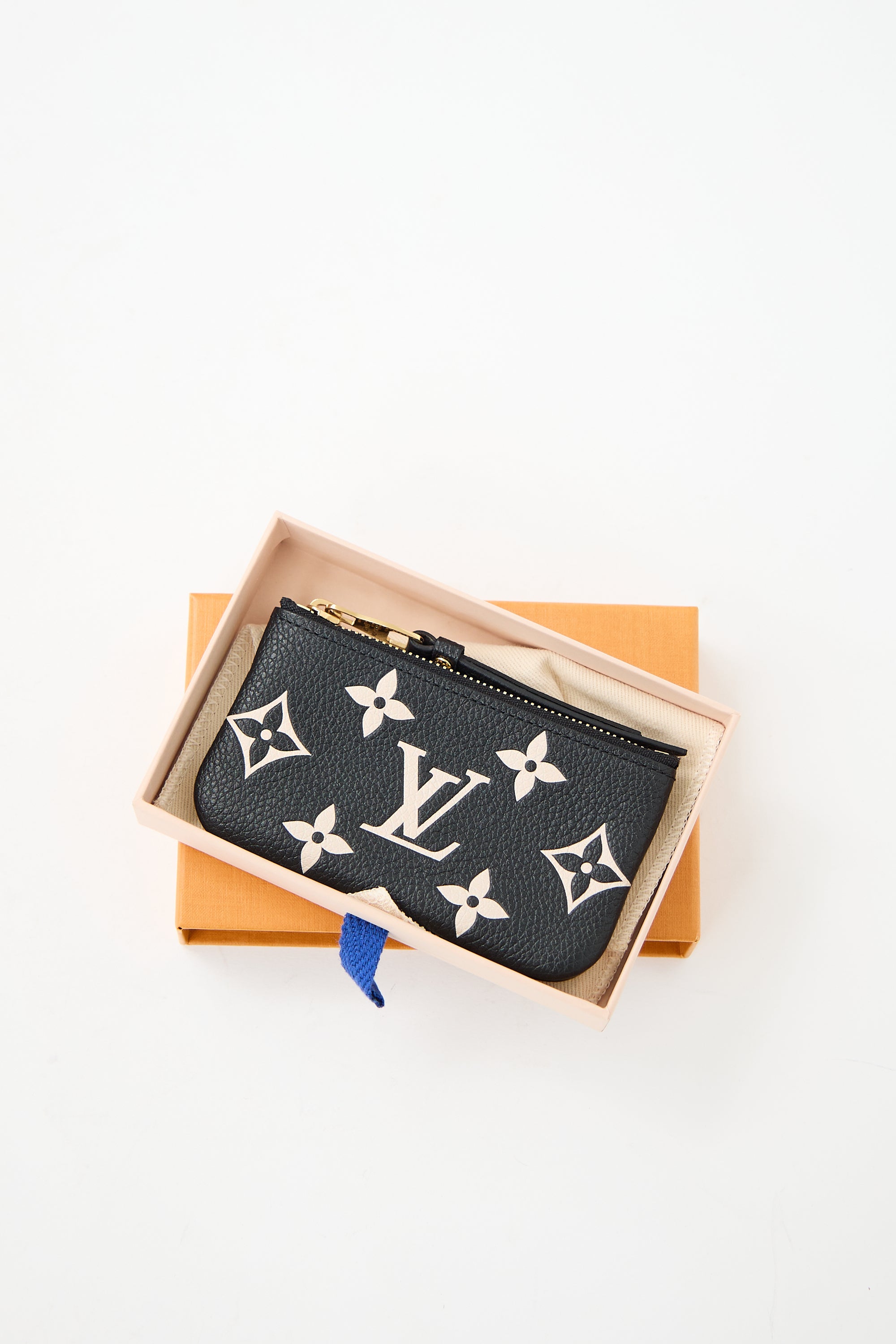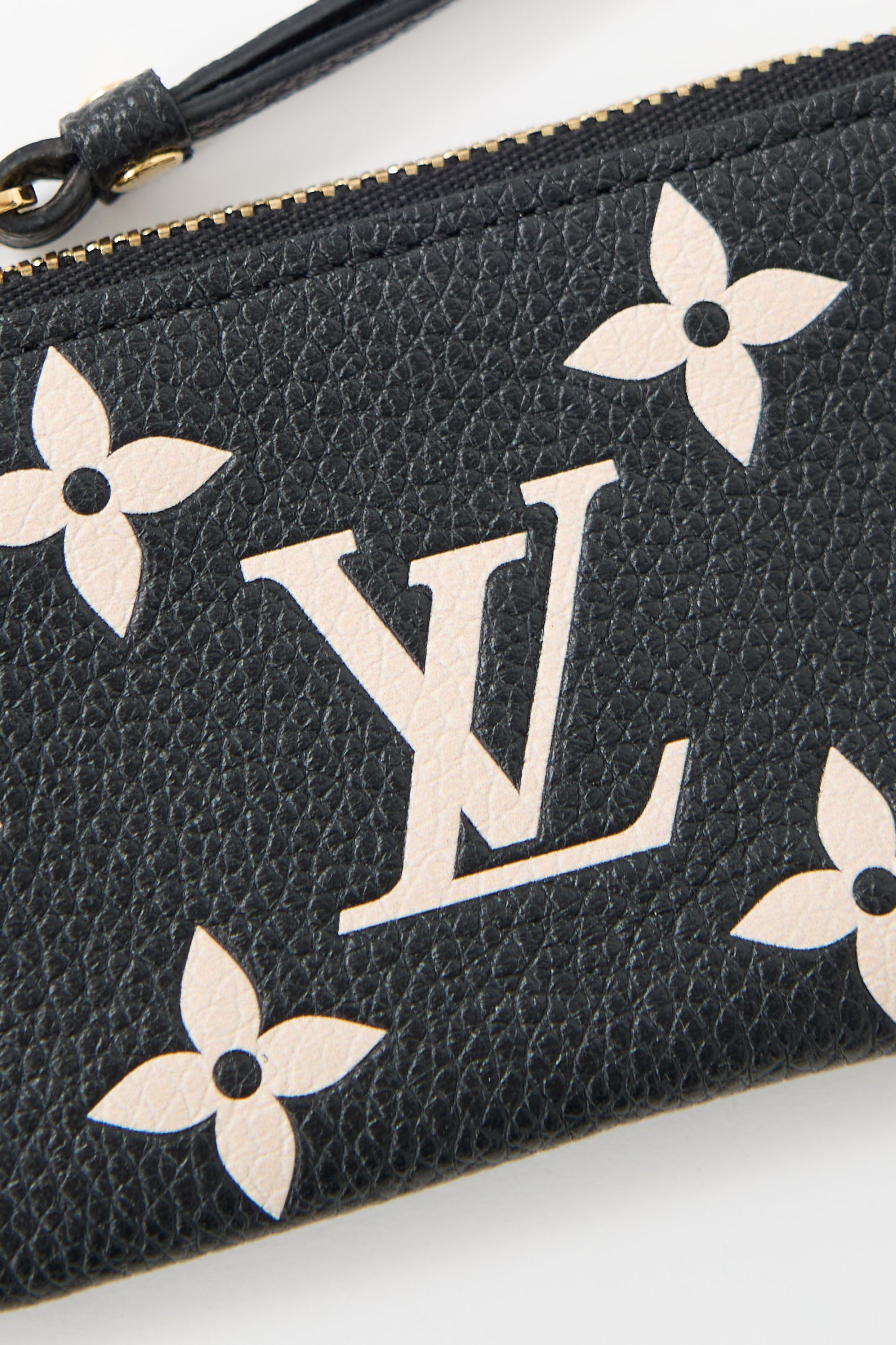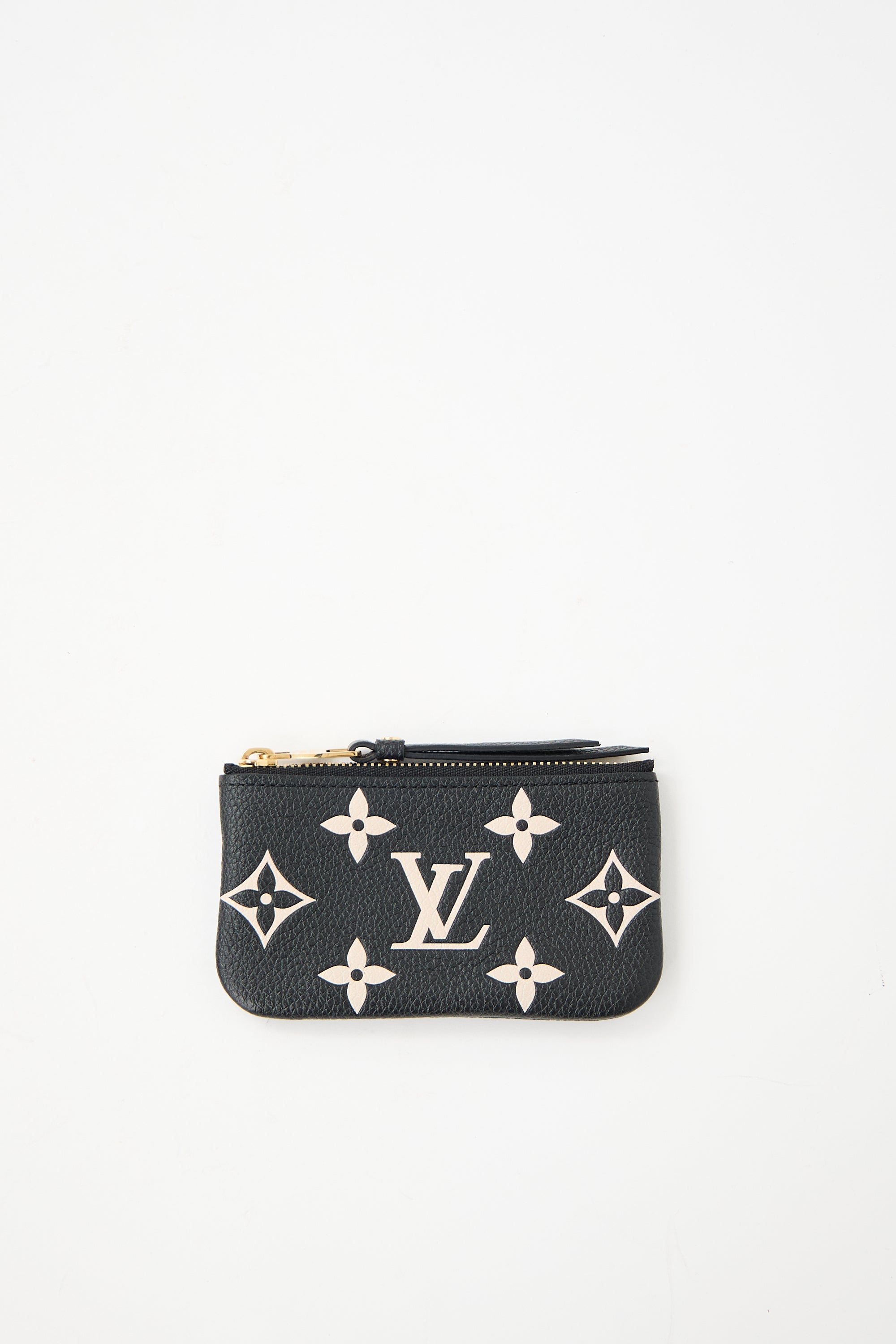 Pre-owned Louis Vuitton black and pink leather key pouch featuring Empreinte monogram, zip closure at top, one main compartment, and gold tone key clasp. Comes with original dust bag and box.