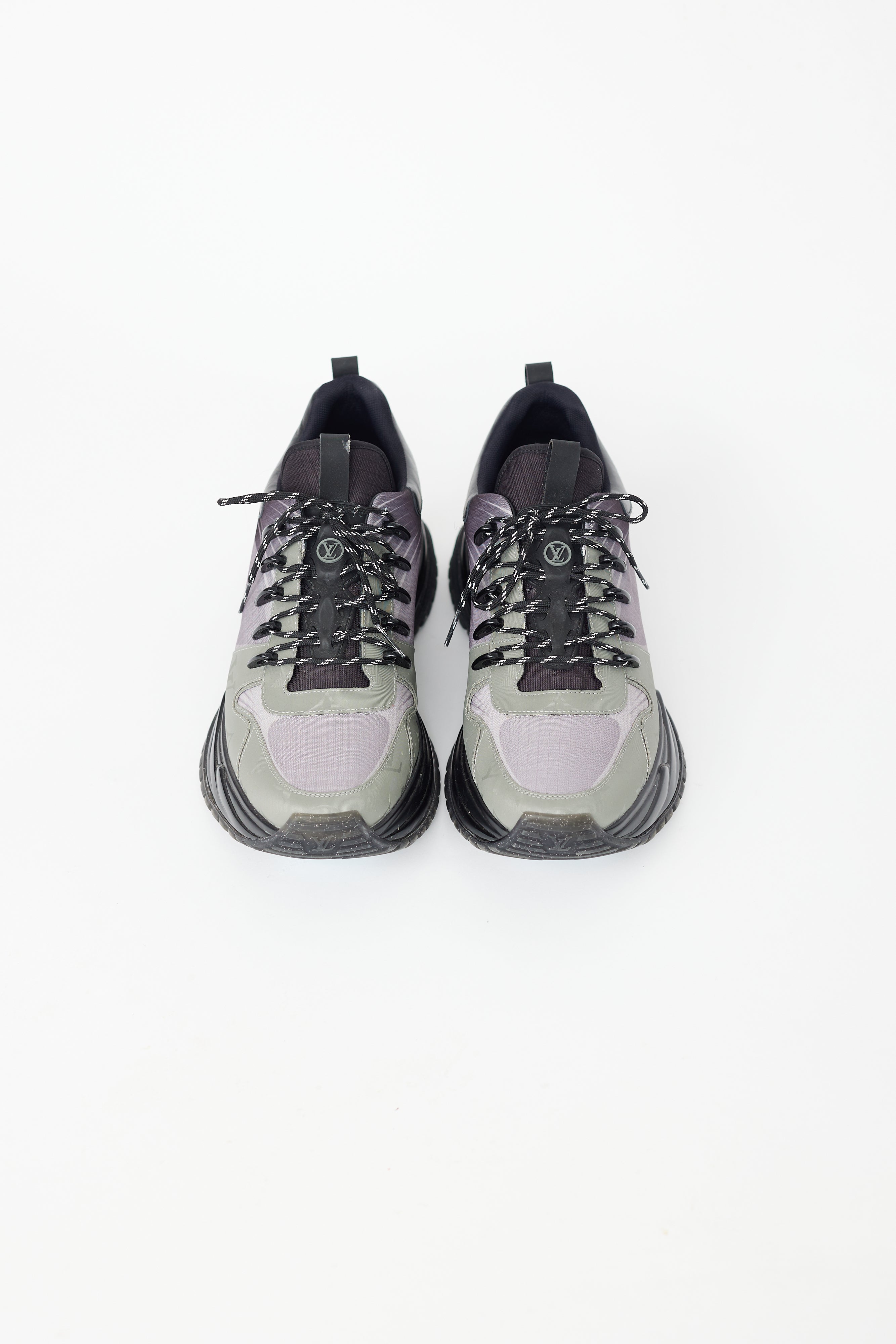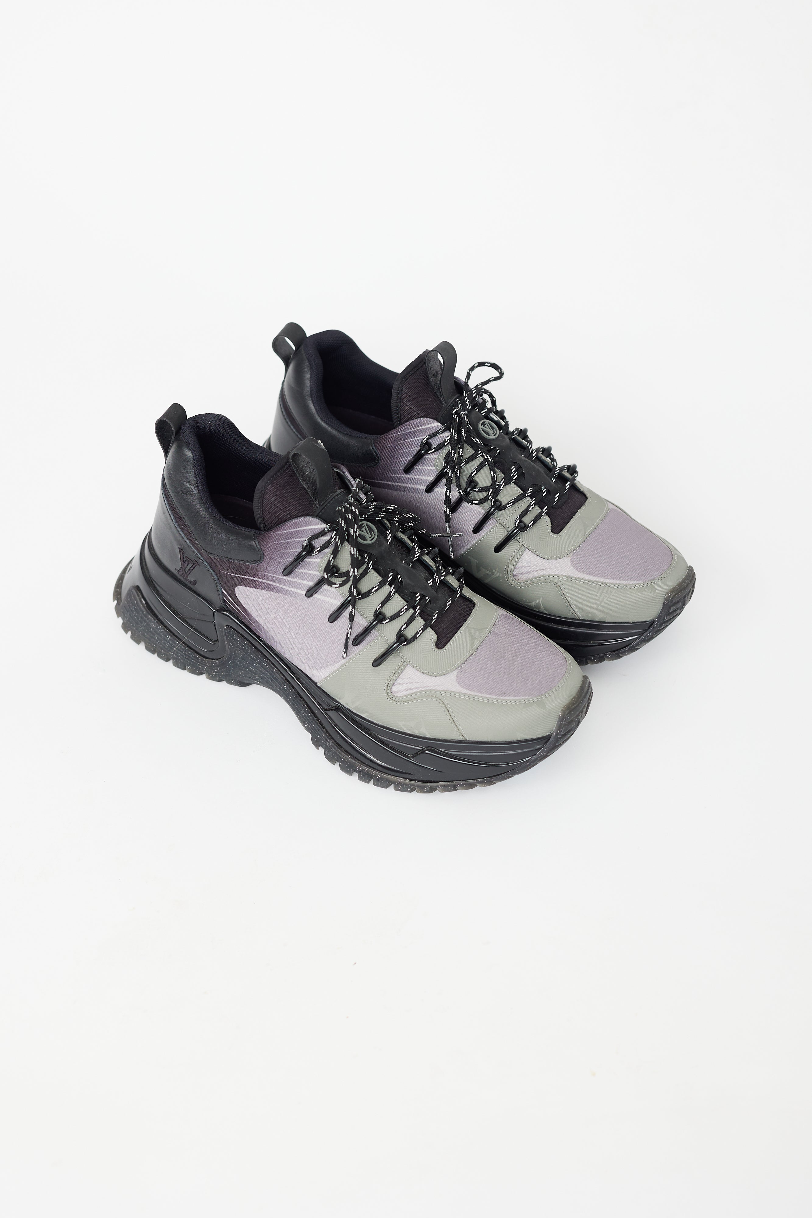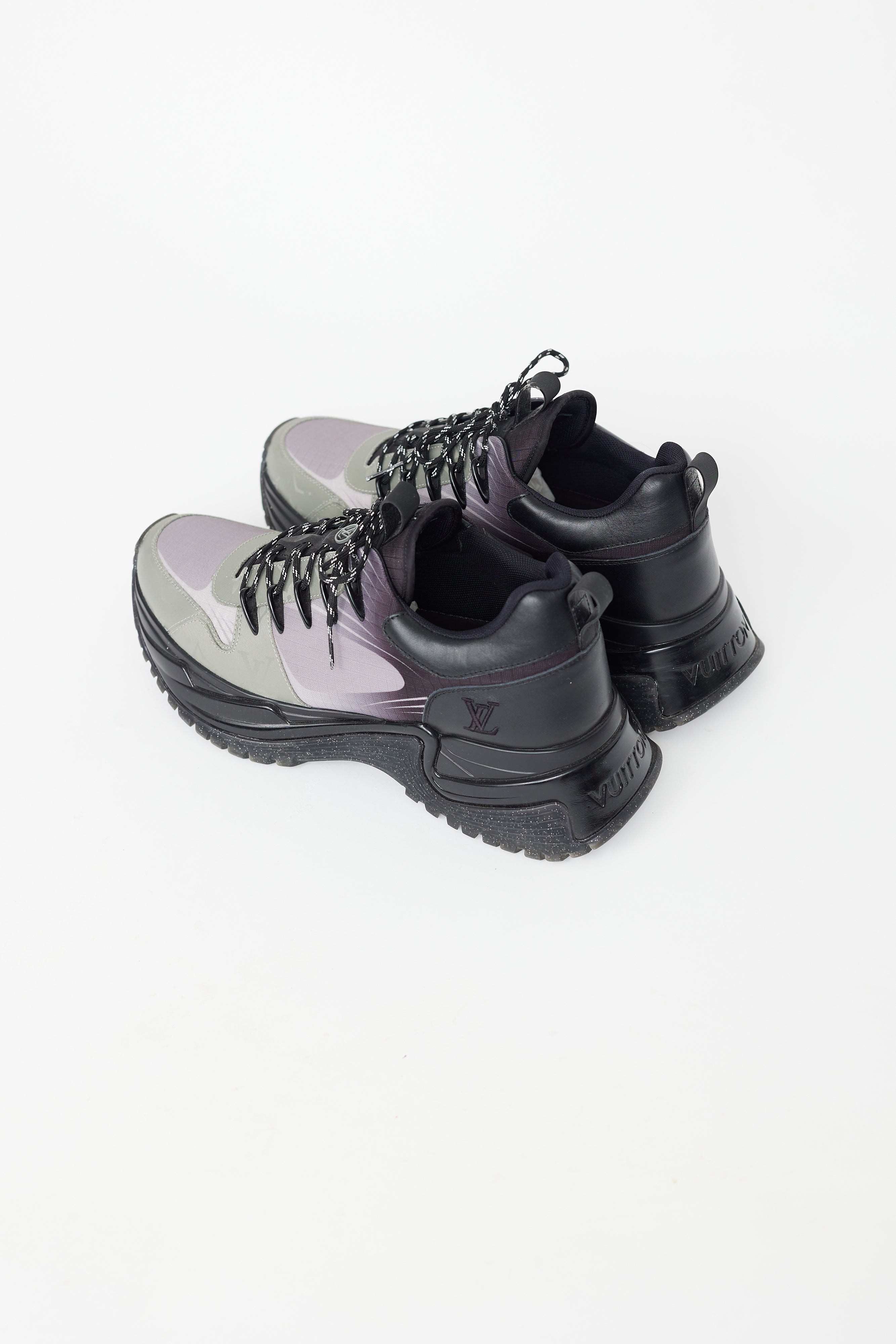 Pre-owned Louis Vuitton grey and black Run Away Pulse sneakers featuring round toe, lace up vamp, tonal embroidered logo at outer side, leather and textile panelling throughout and leather pull tab at counter and tongue.