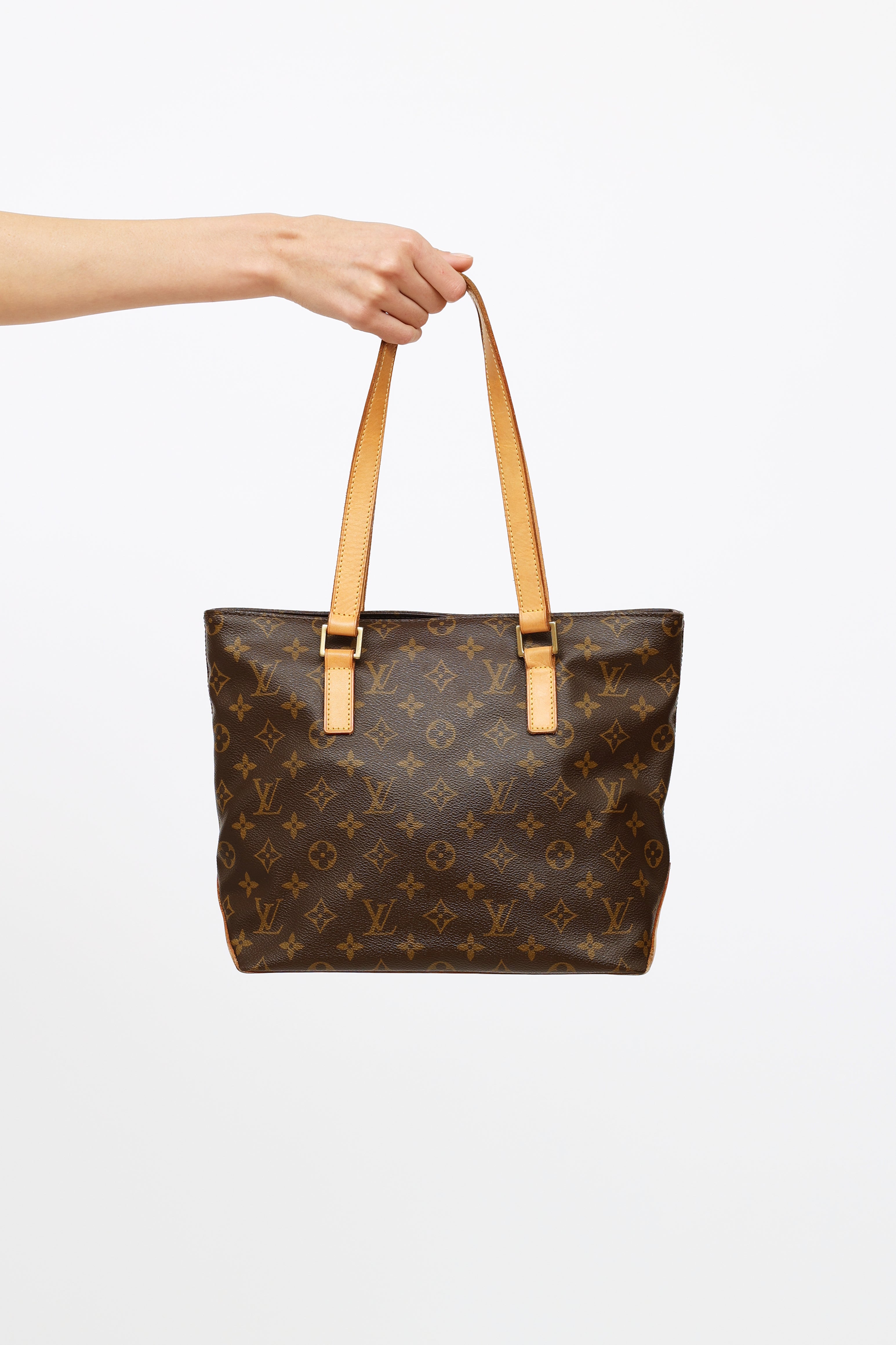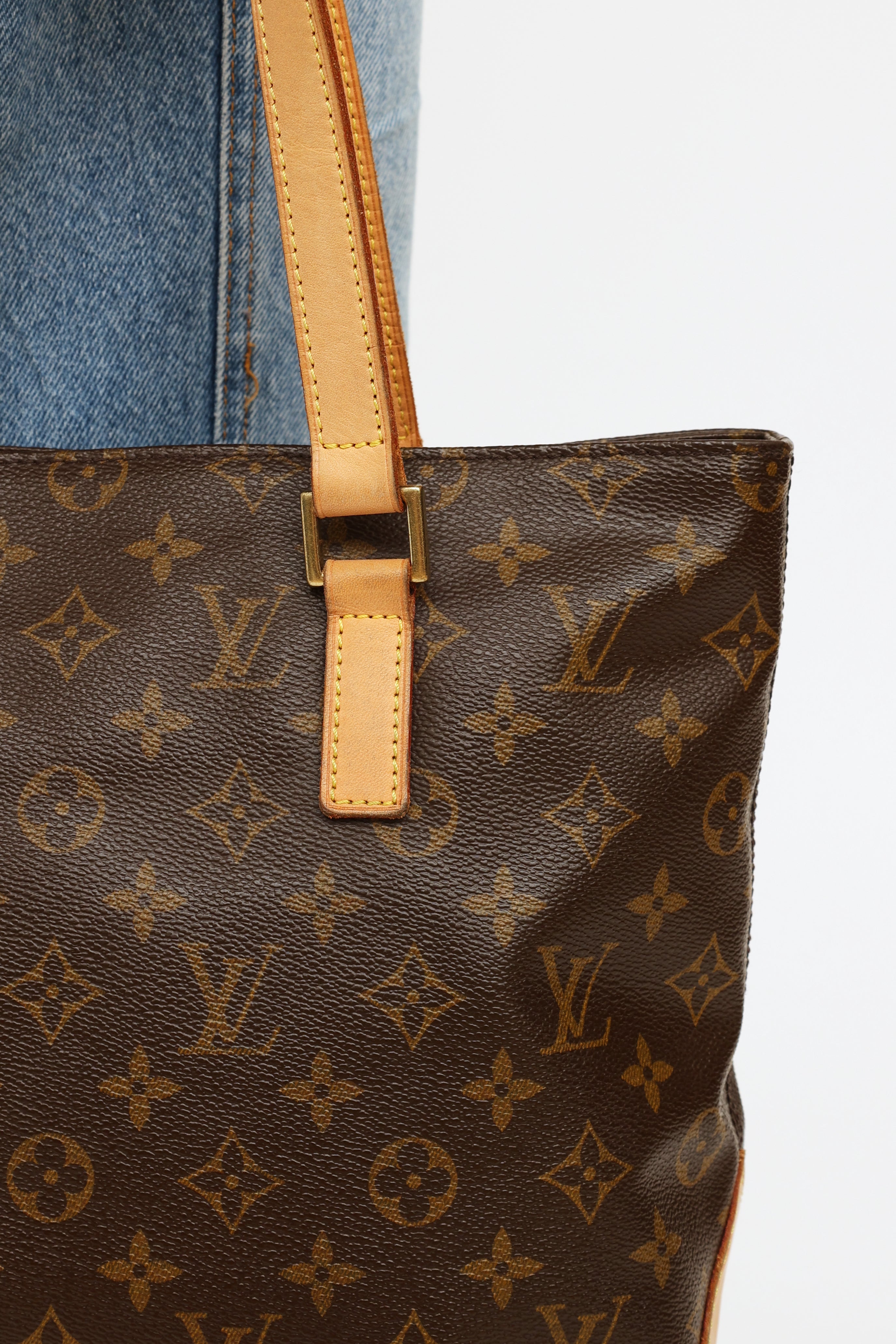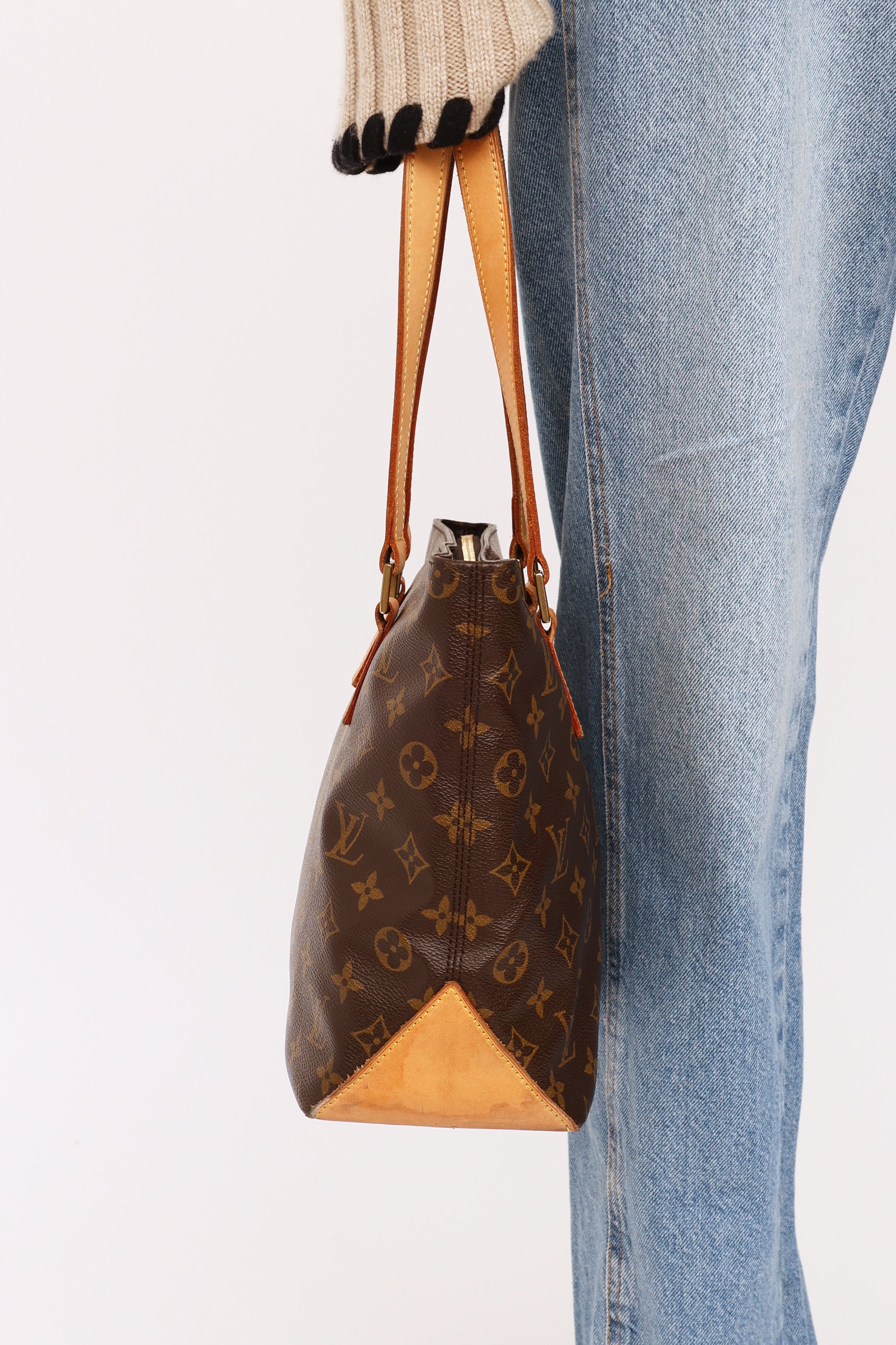 Pre-owned Louis Vuitton Cabas Piano bag in monogram coated canvas featuring Vachetta leather flat straps, gold-tone hardware, beige leather base, top zip closure, brown canvas lined interior, one zip pocket, one flat pocket, and D ring.