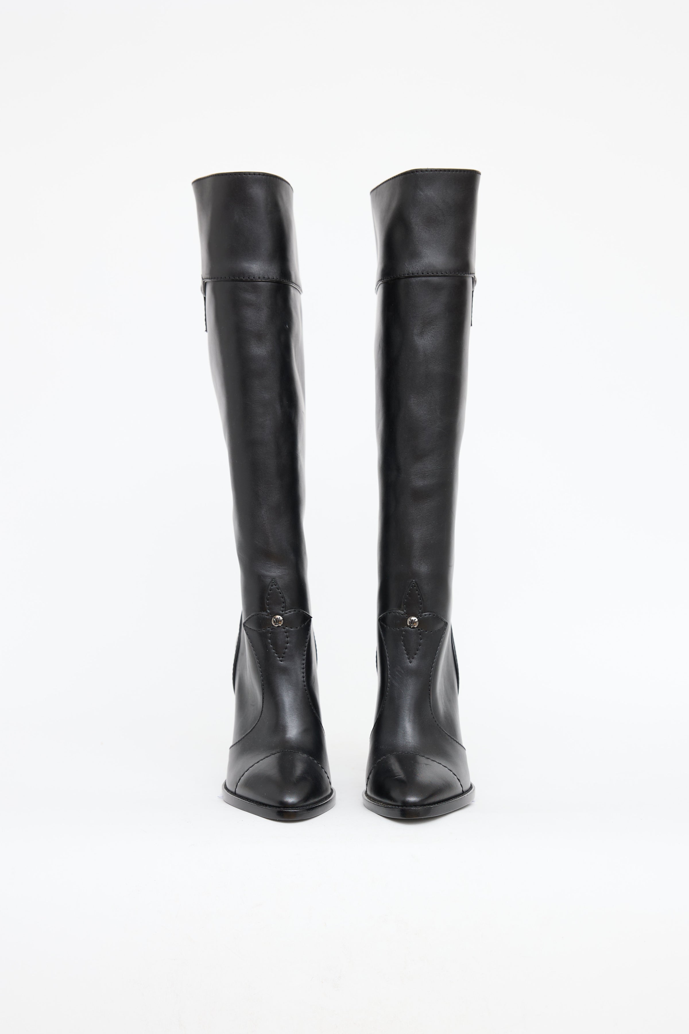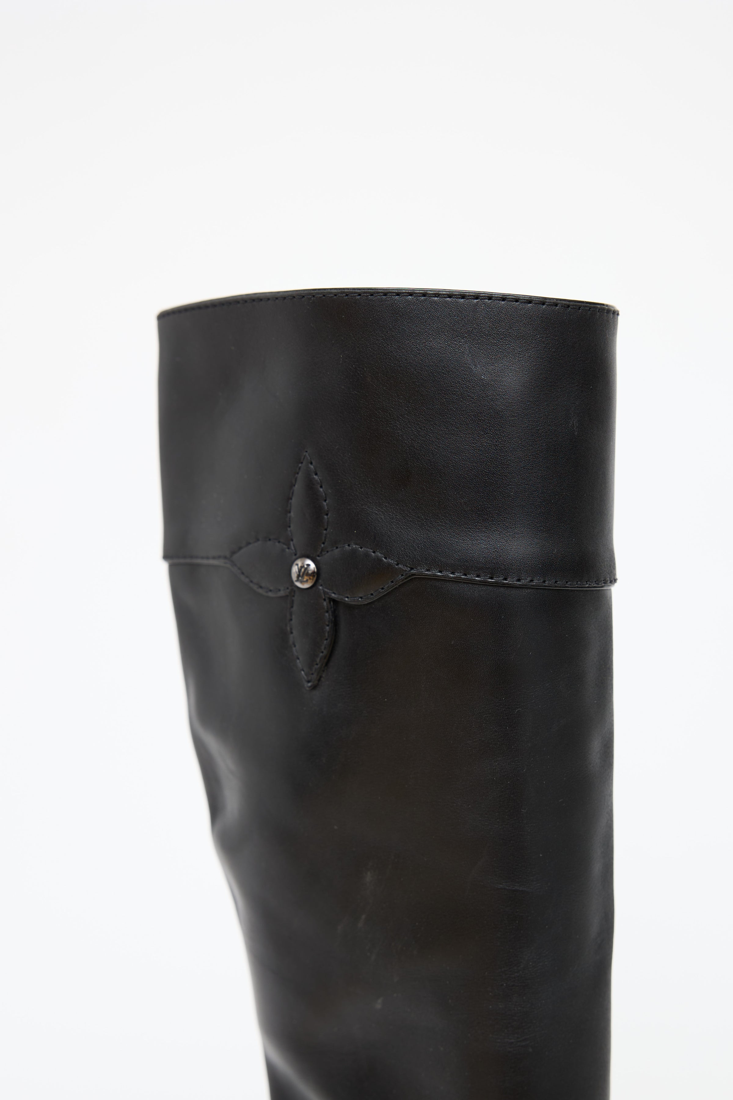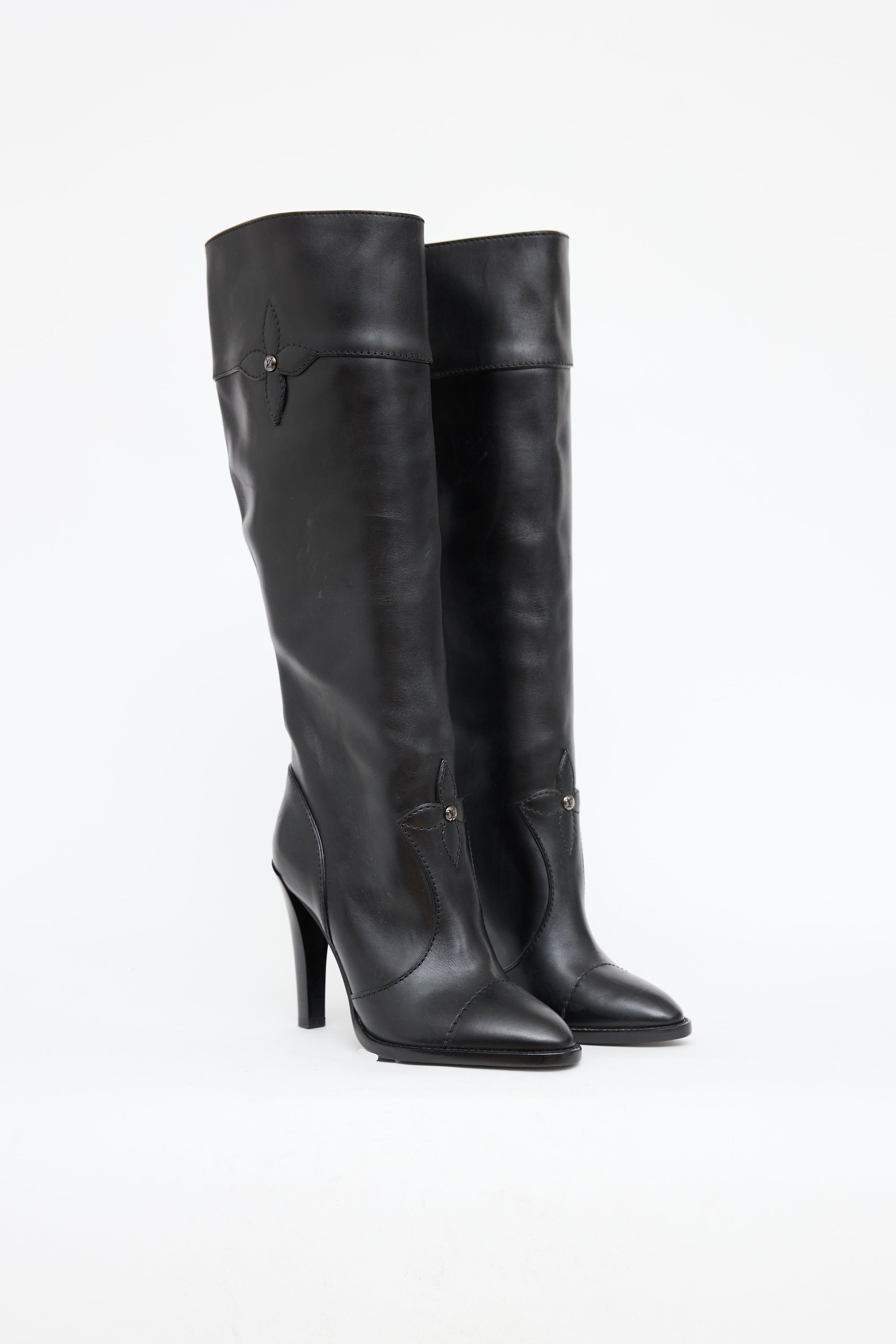 Pre-owned Louis Vuitton black Notting Hill knee high boots featuring almond toe, western paneling with signature LV floral embroidery, gunmetal hardware, pull on styling and covered block heel.