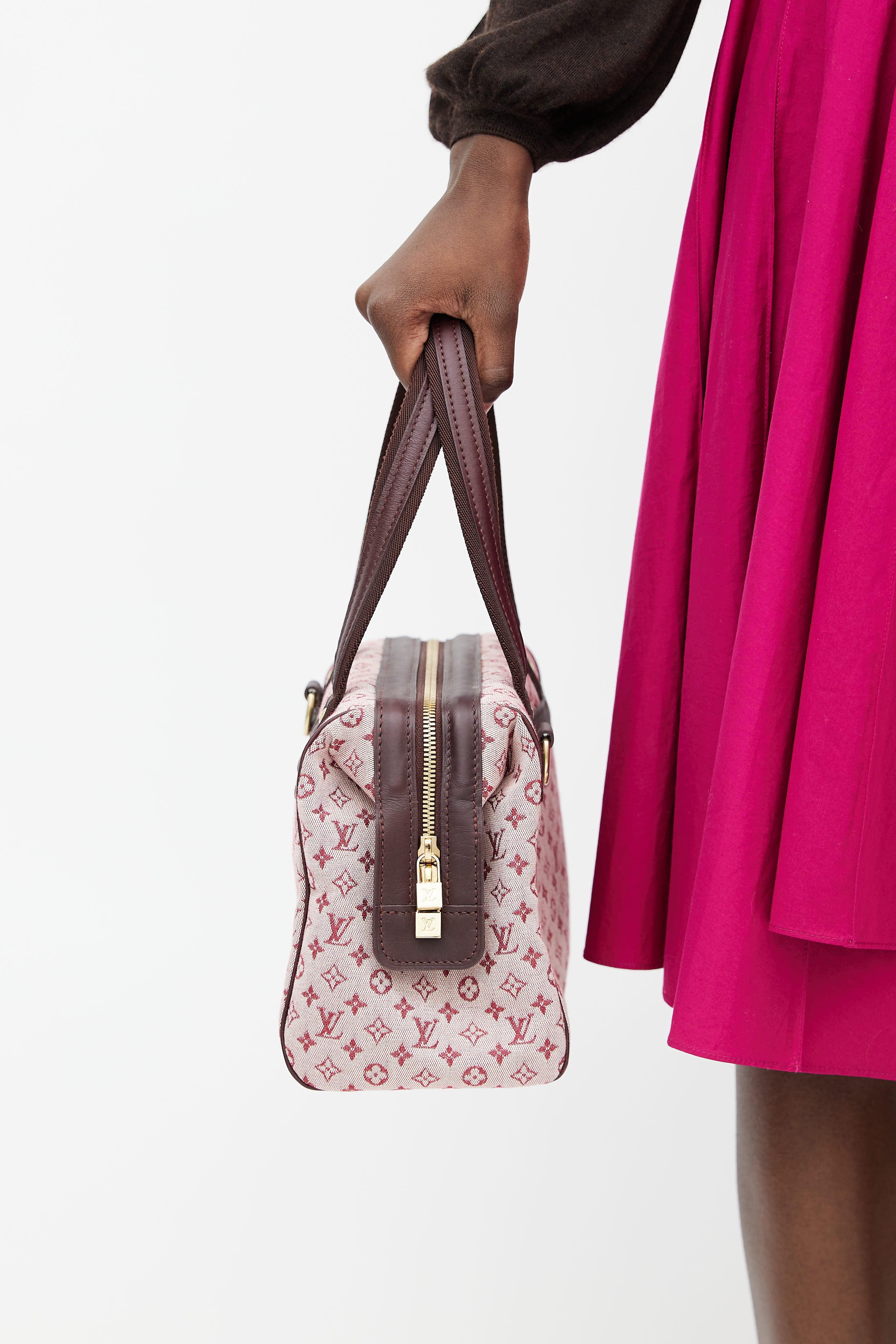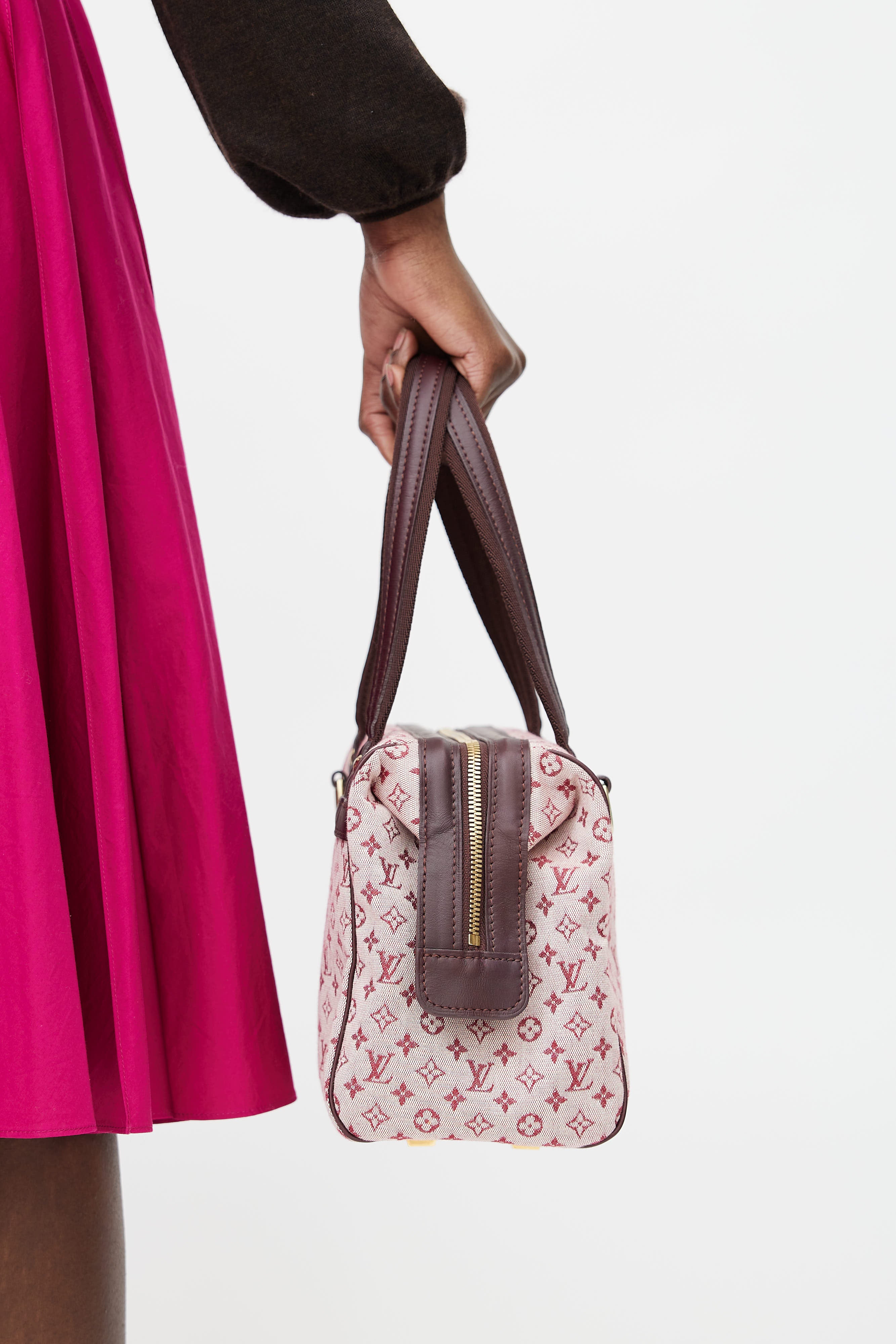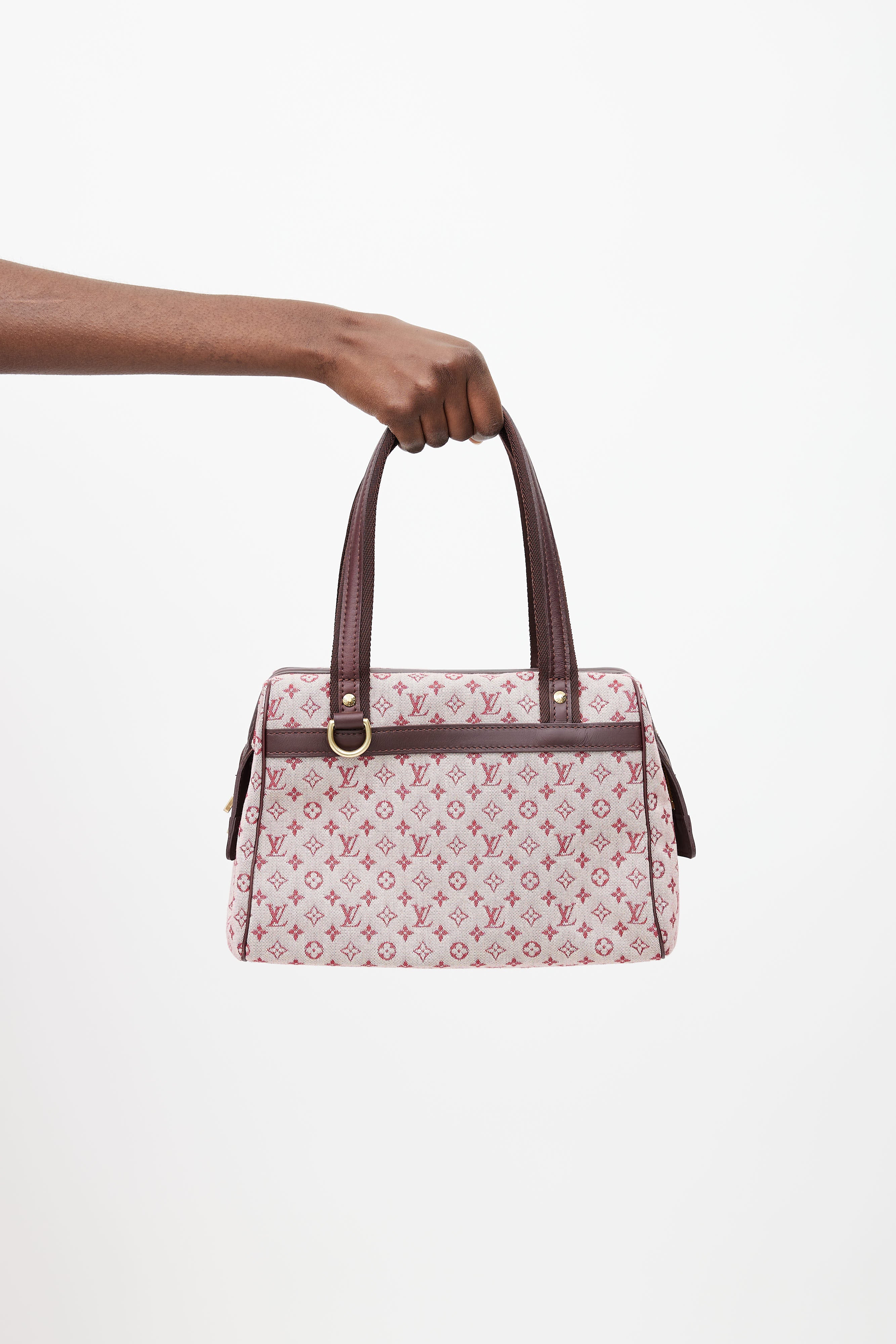 Pre-owned Louis Vuitton pink Josephine handbag featuring pink signature monogram print throughout, two webbed canvas top handles with tonal leather trim, one main compartment with one slip pocket and one zip closure pocket, gold tone zip closure at top, and gold tone protective feet at bottom of bag.