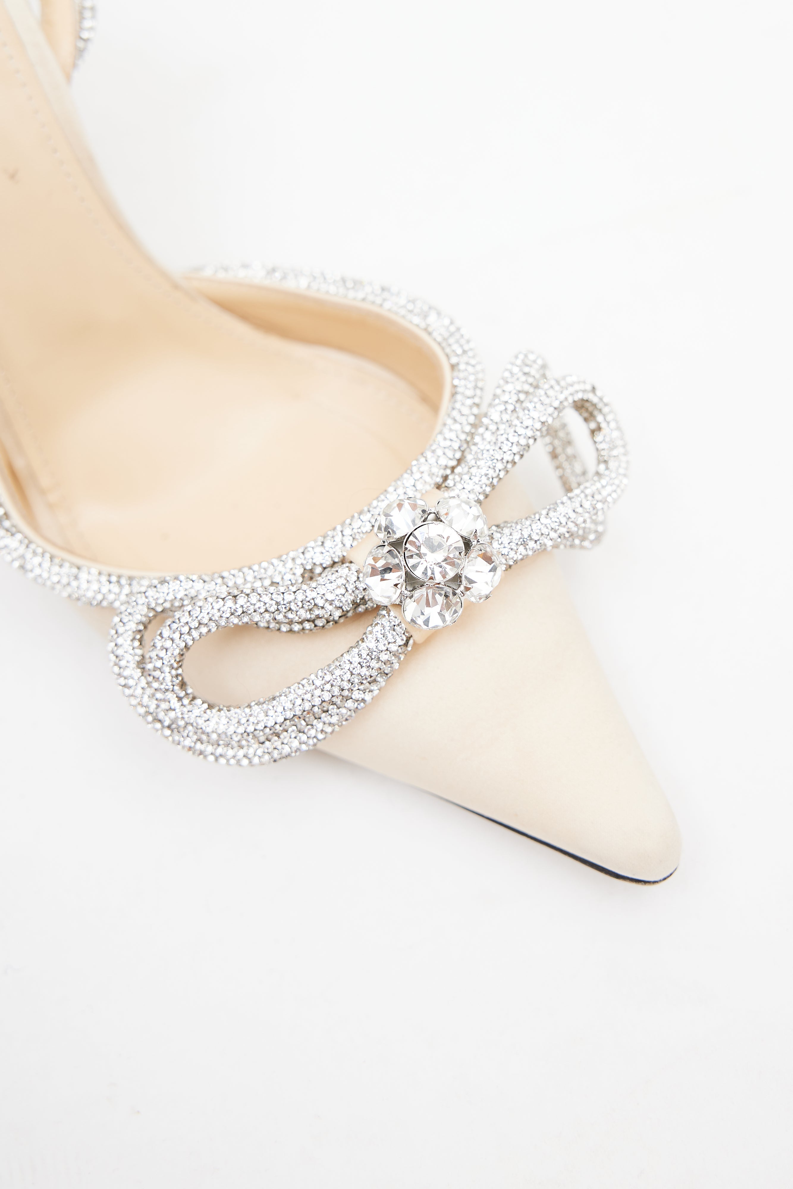 Pre-owned Mach & Mach beige Double Bow heels featuring pointed toe, embellished bow detail at toe box, wrapped stiletto heel, embellished trim at collar, and embellished adjustable wrap around strap at ankle. Comes with original dust bag.