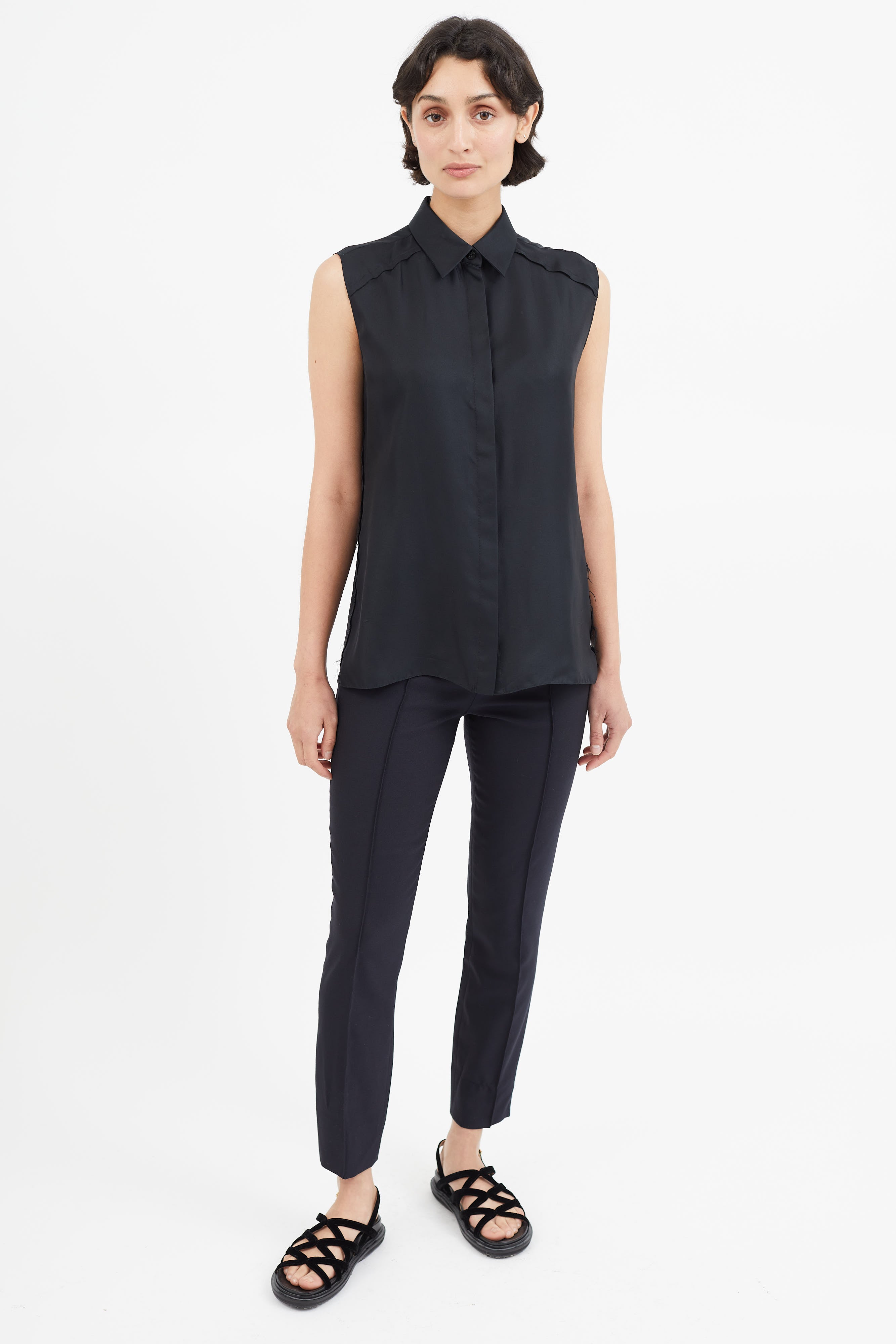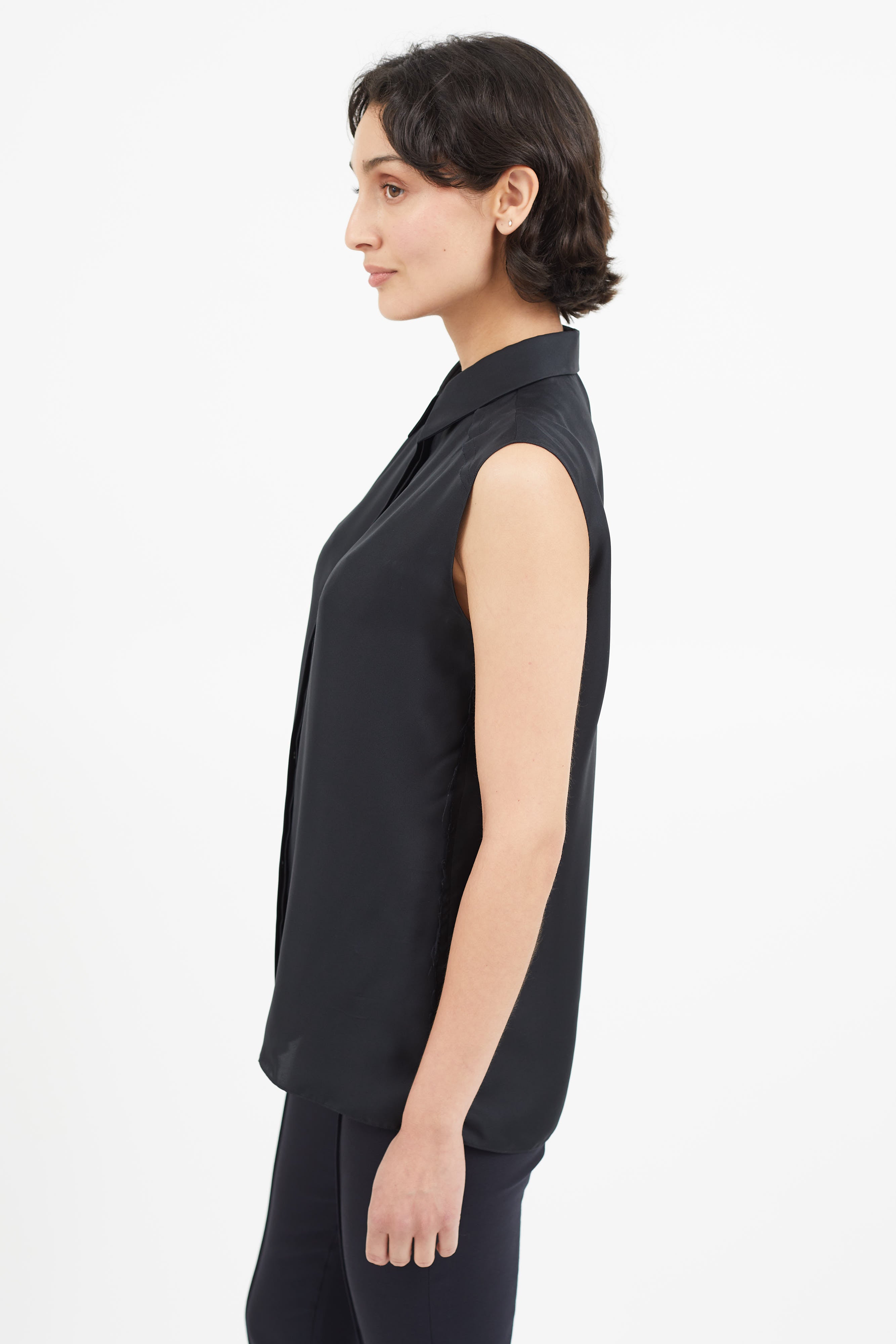 Pre-owned Maison Margiela black silk sleeveless top featuring a pointed collar, intentional distressing at sides, and button up front.