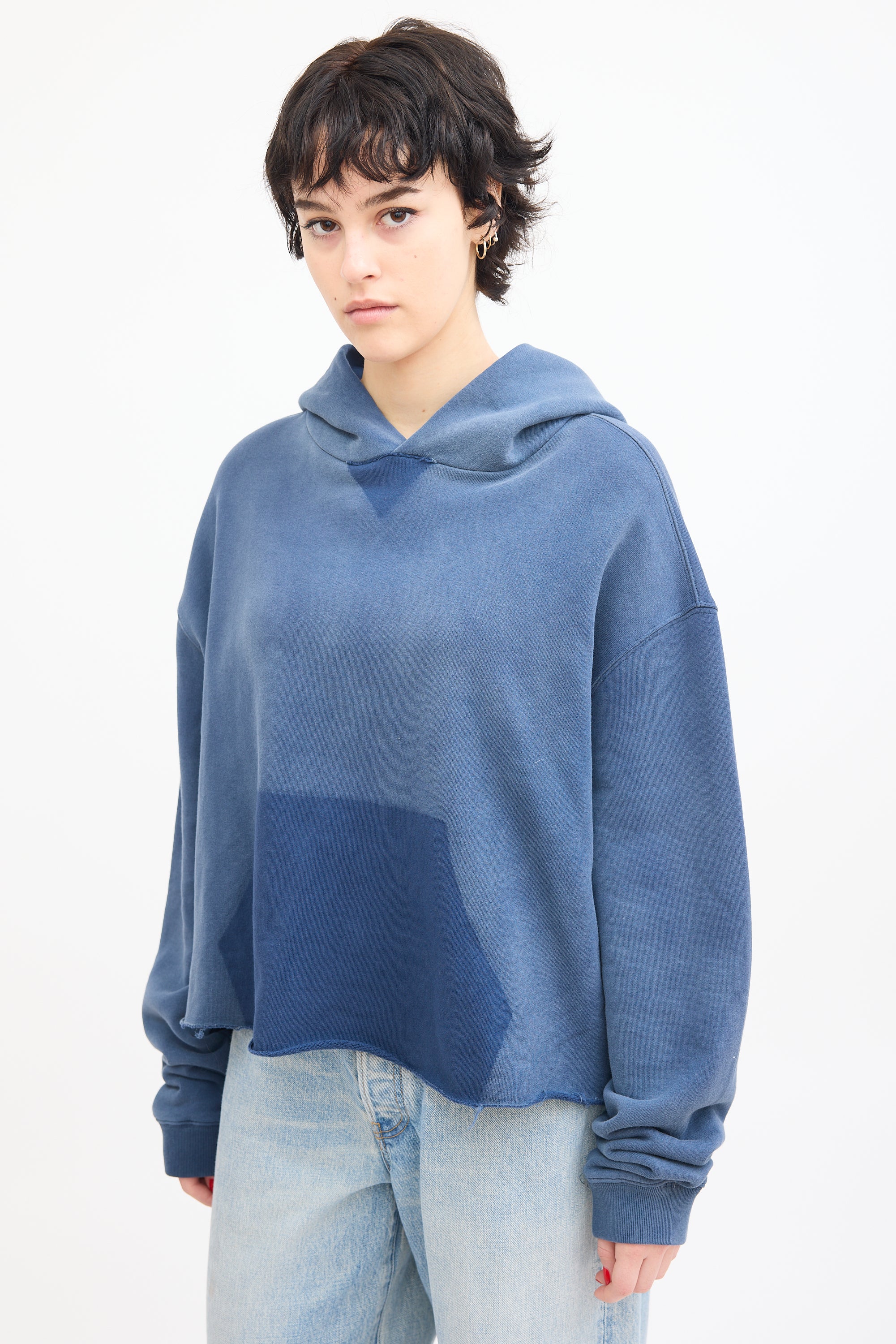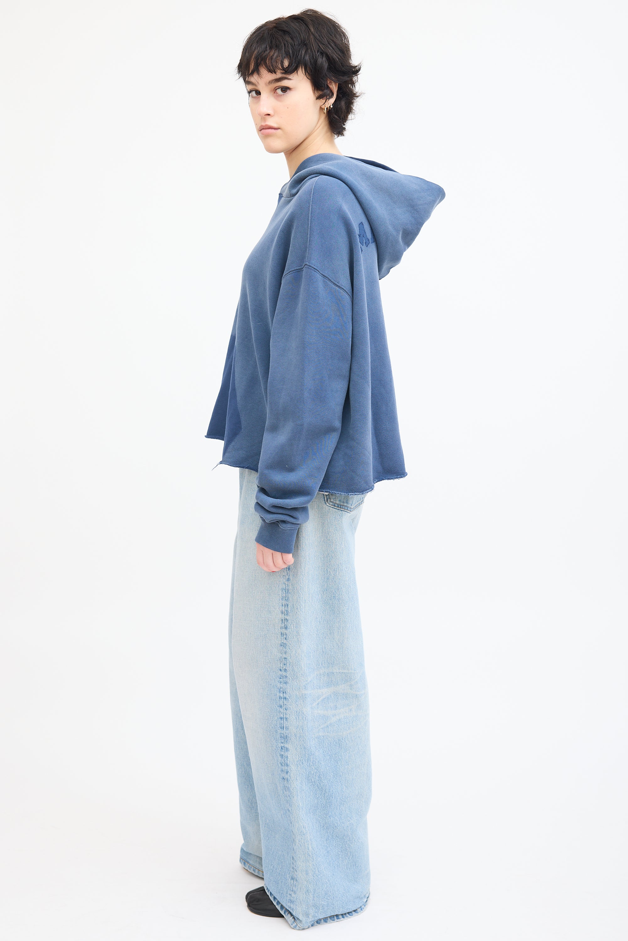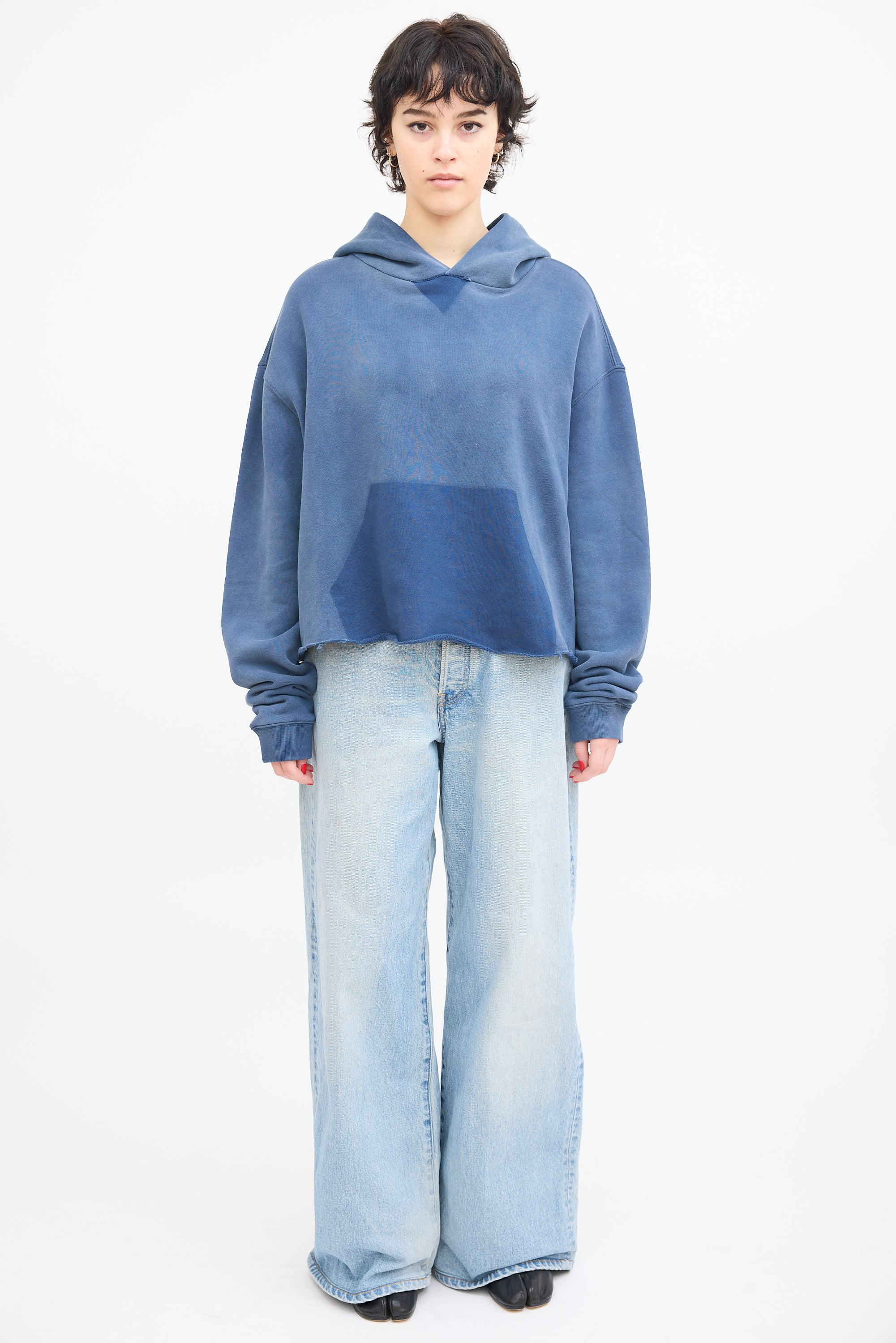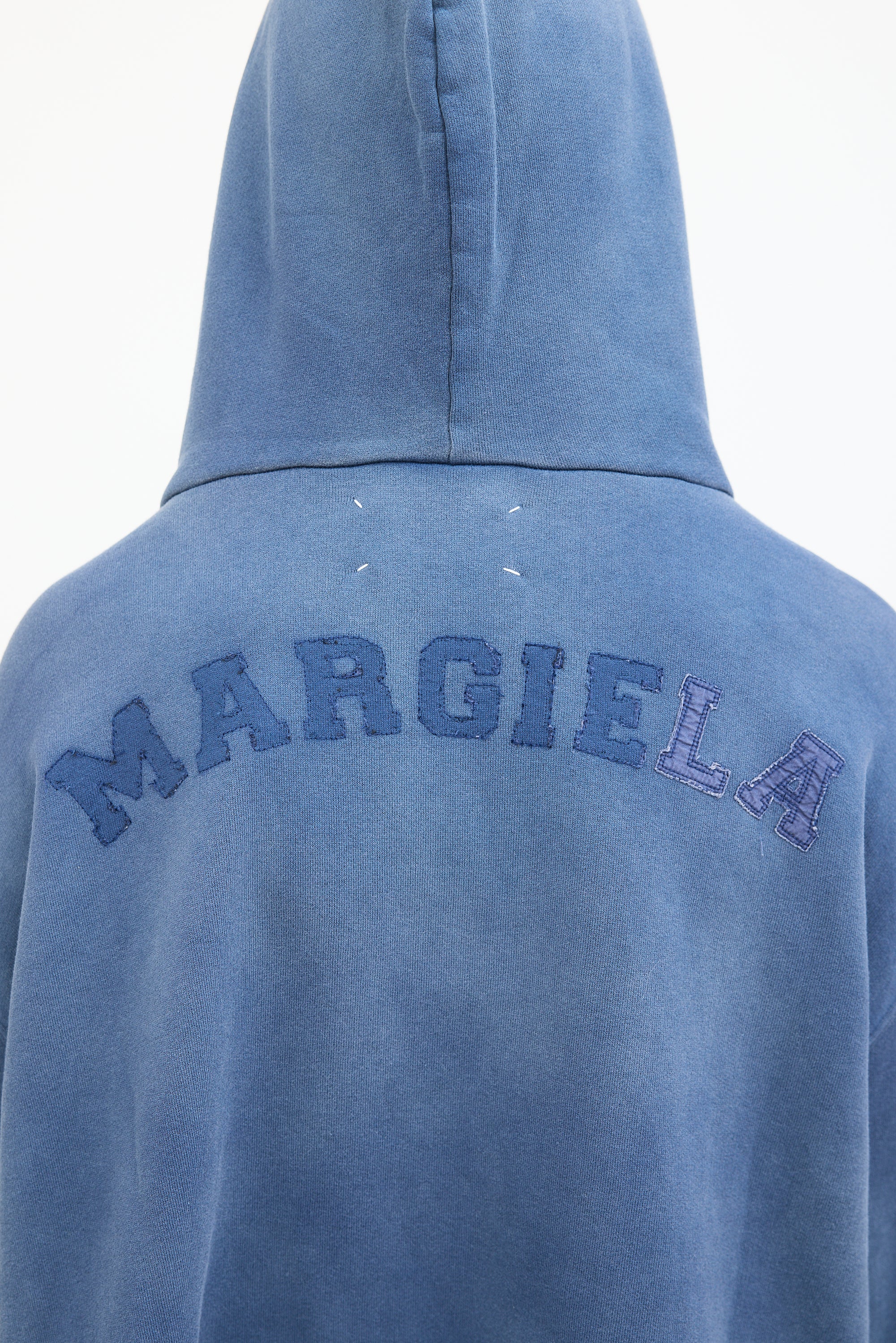 Pre-owned Maison Margiela blue Organic Cotton Logo hoodie featuring faded neckline and pocket silhouette, drop shoulders, long sleeves with ribbed cuffs, raw hem, faded logo with distressed embroidery trim at back, and signature four stitches at back.