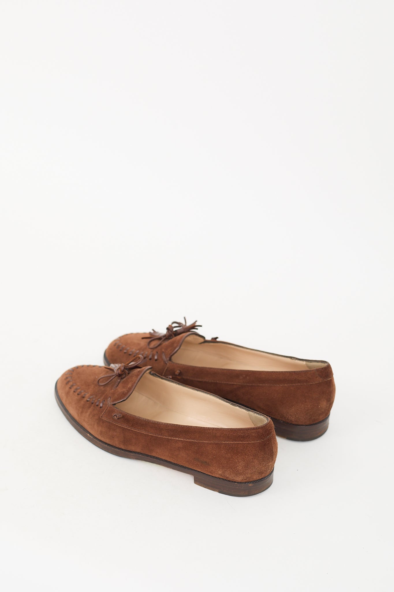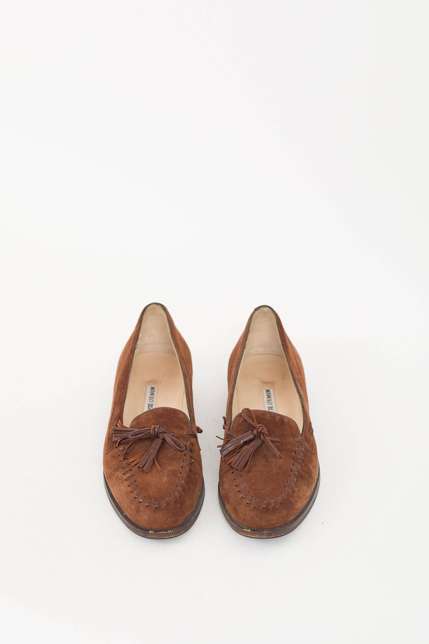 Pre-owned Manolo Blahnik brown suede loafers featuring rounded toe, tonal braided leather trim at toe, tassel bow at vamp, slip on entry, and stacked heel.