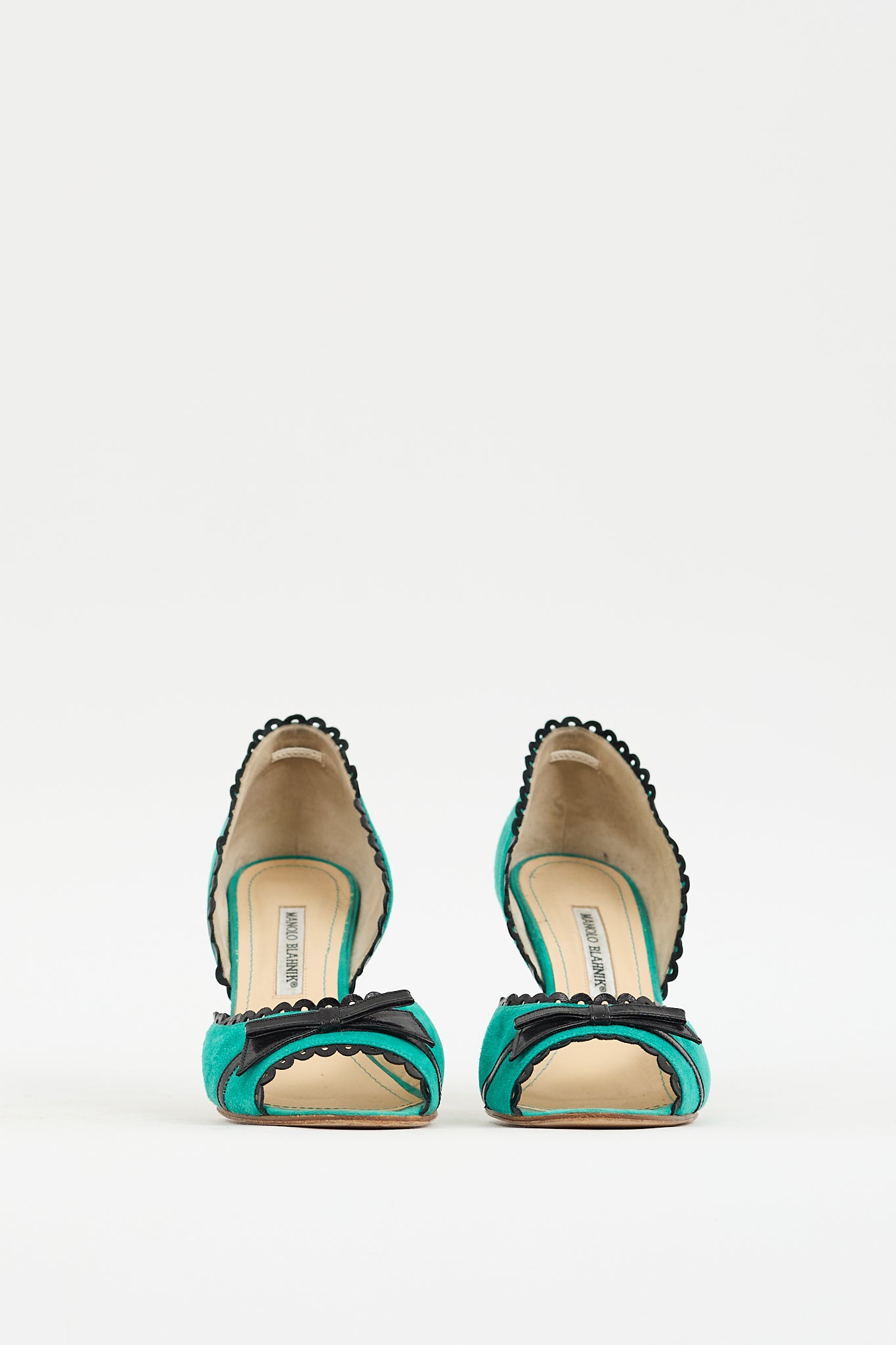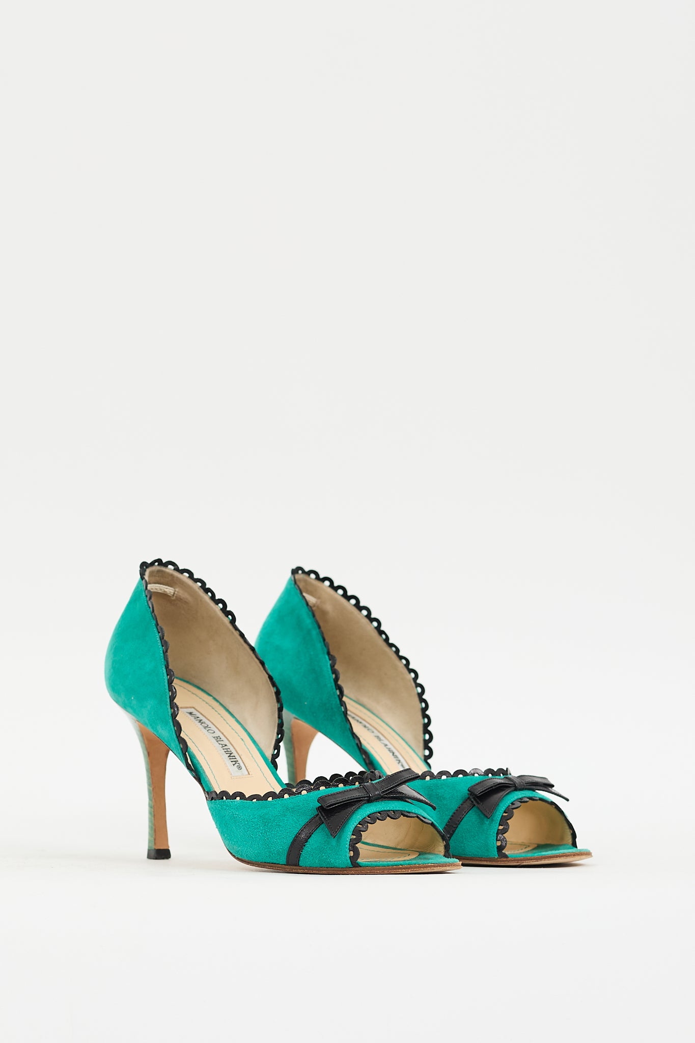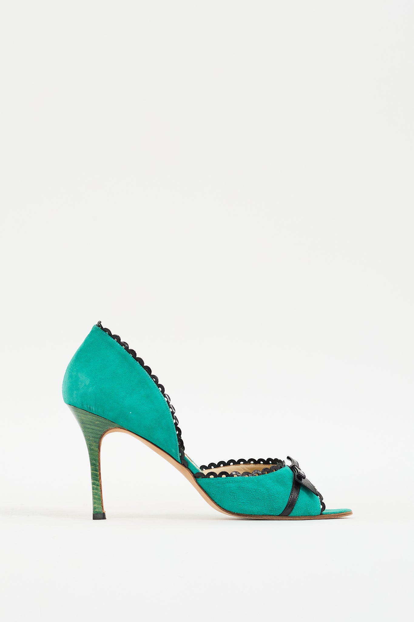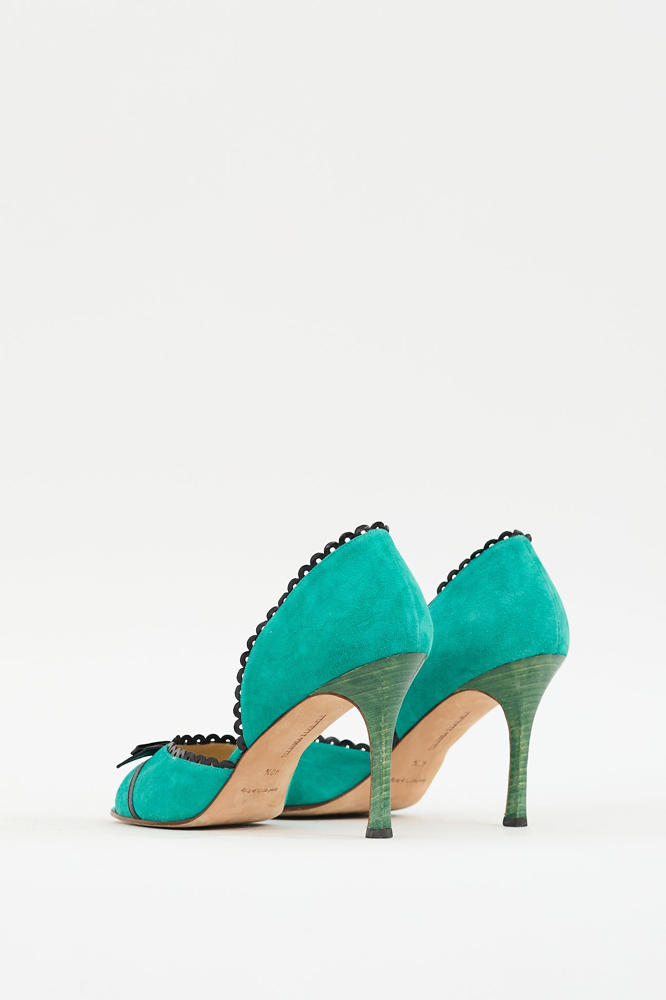 Pre-owned Manolo Blahnik green suede heels featuring a rounded peep toe, D'Orsay design with black leather scallop trim throughout, black leather bow detail at vamp, green stiletto heel, and leather insole and outsole.