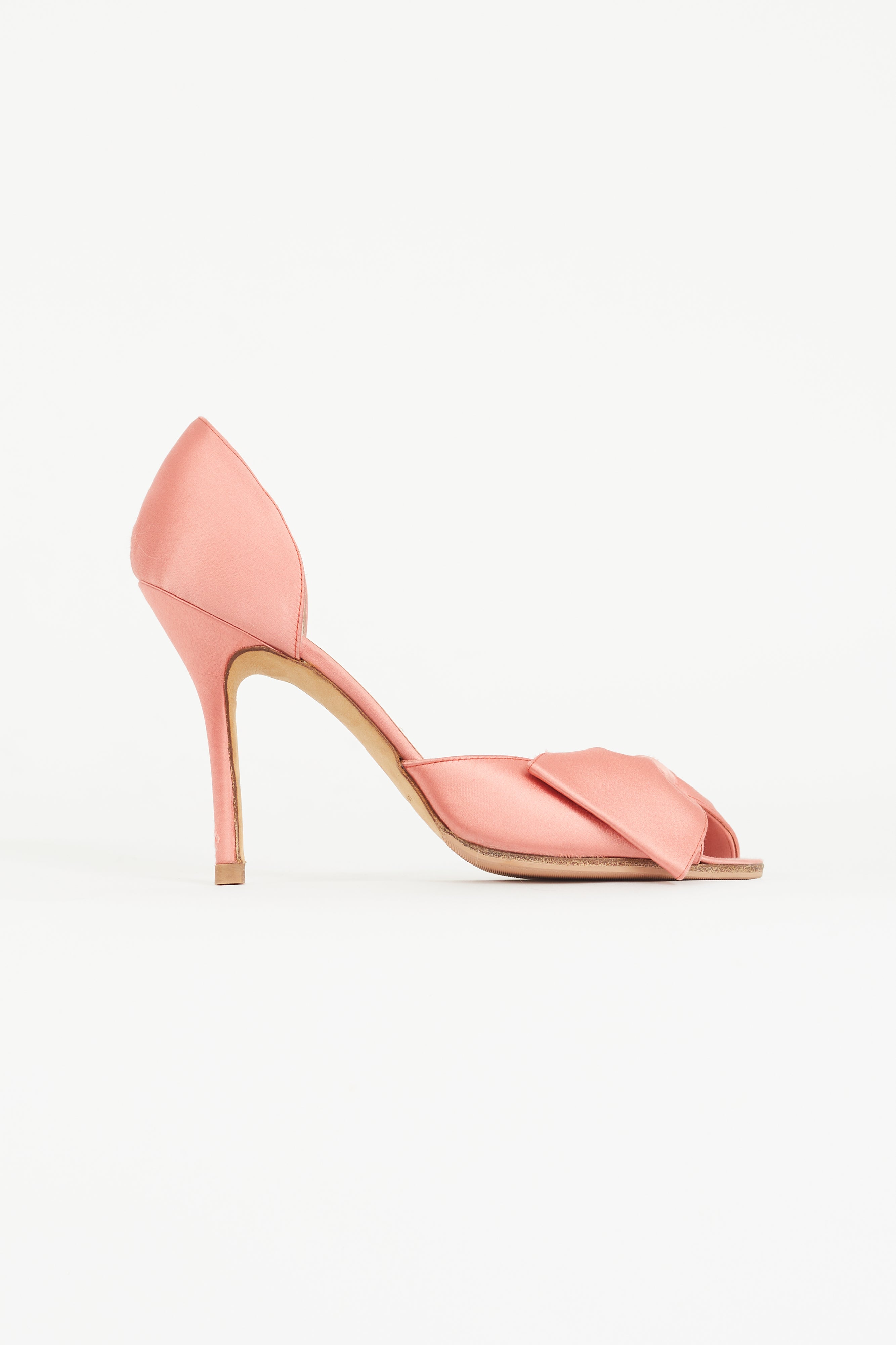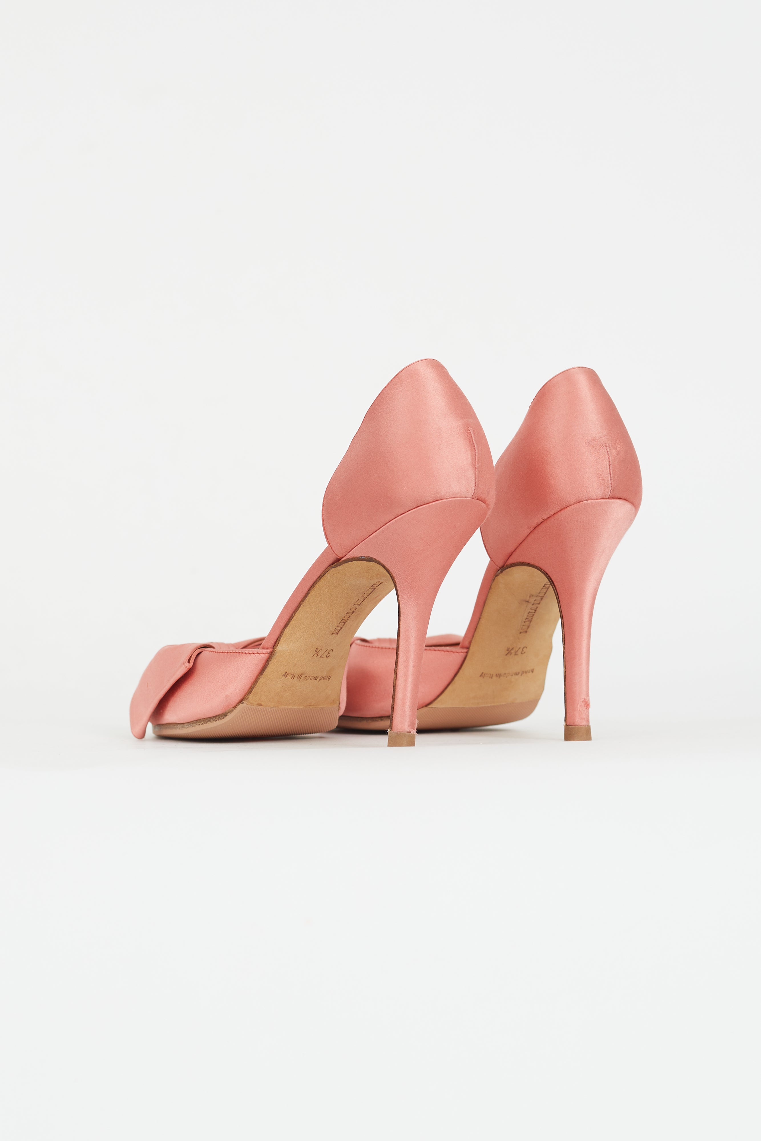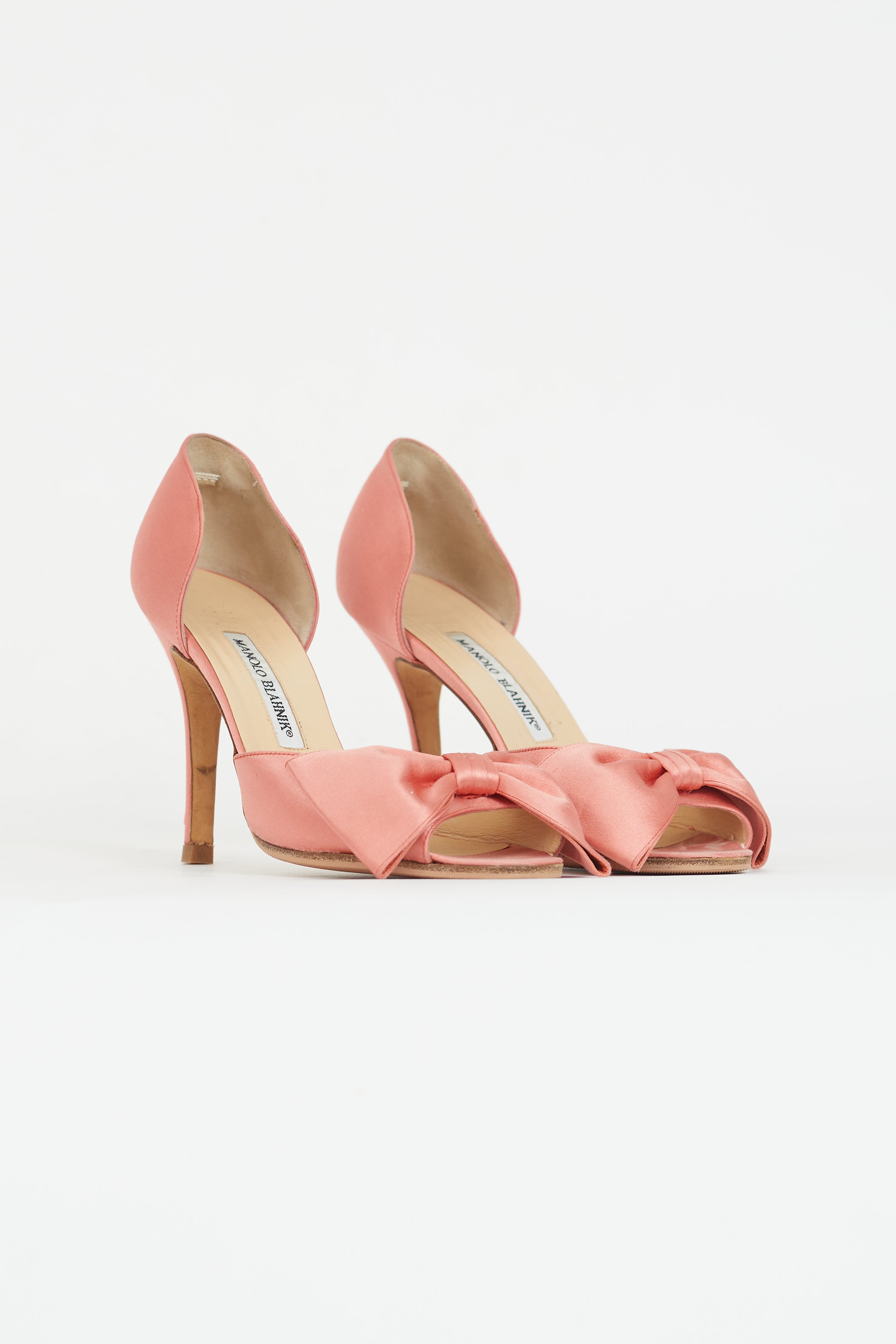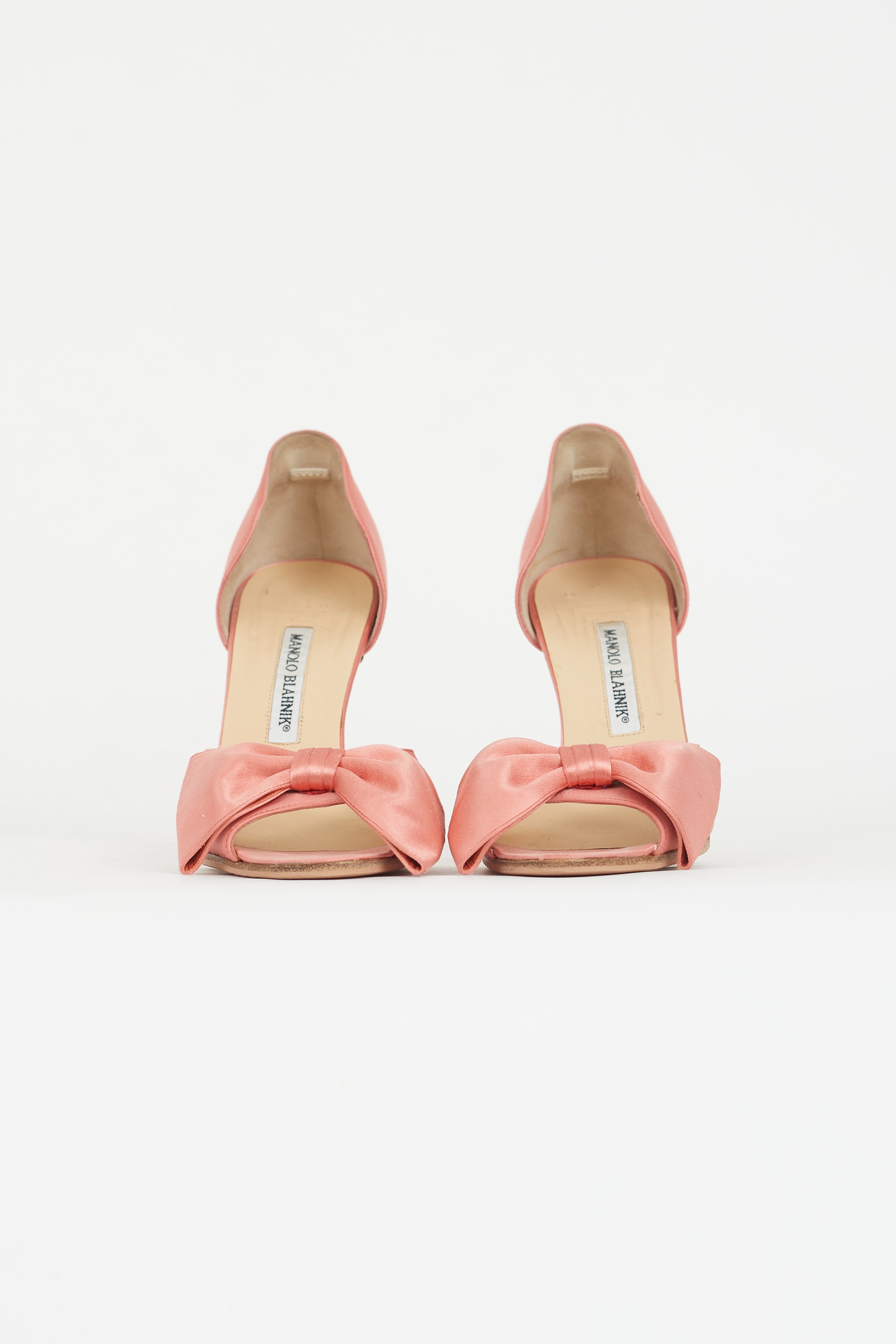Pre-owned Manolo Blahnik pink Clausado D'orsay heels featuring open almond toe, tonal bow attachment across toe strap, slip on entry, and stiletto heel,