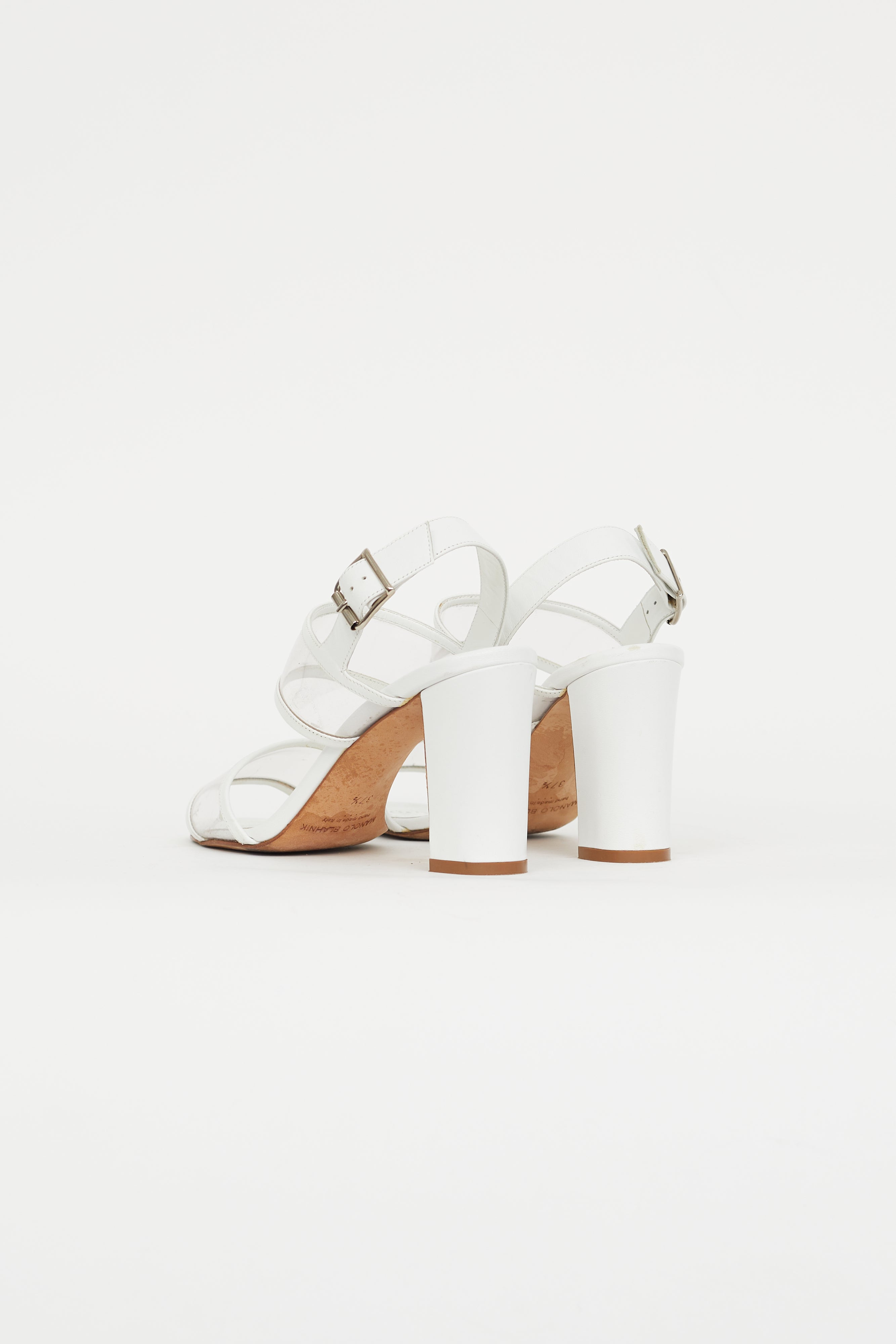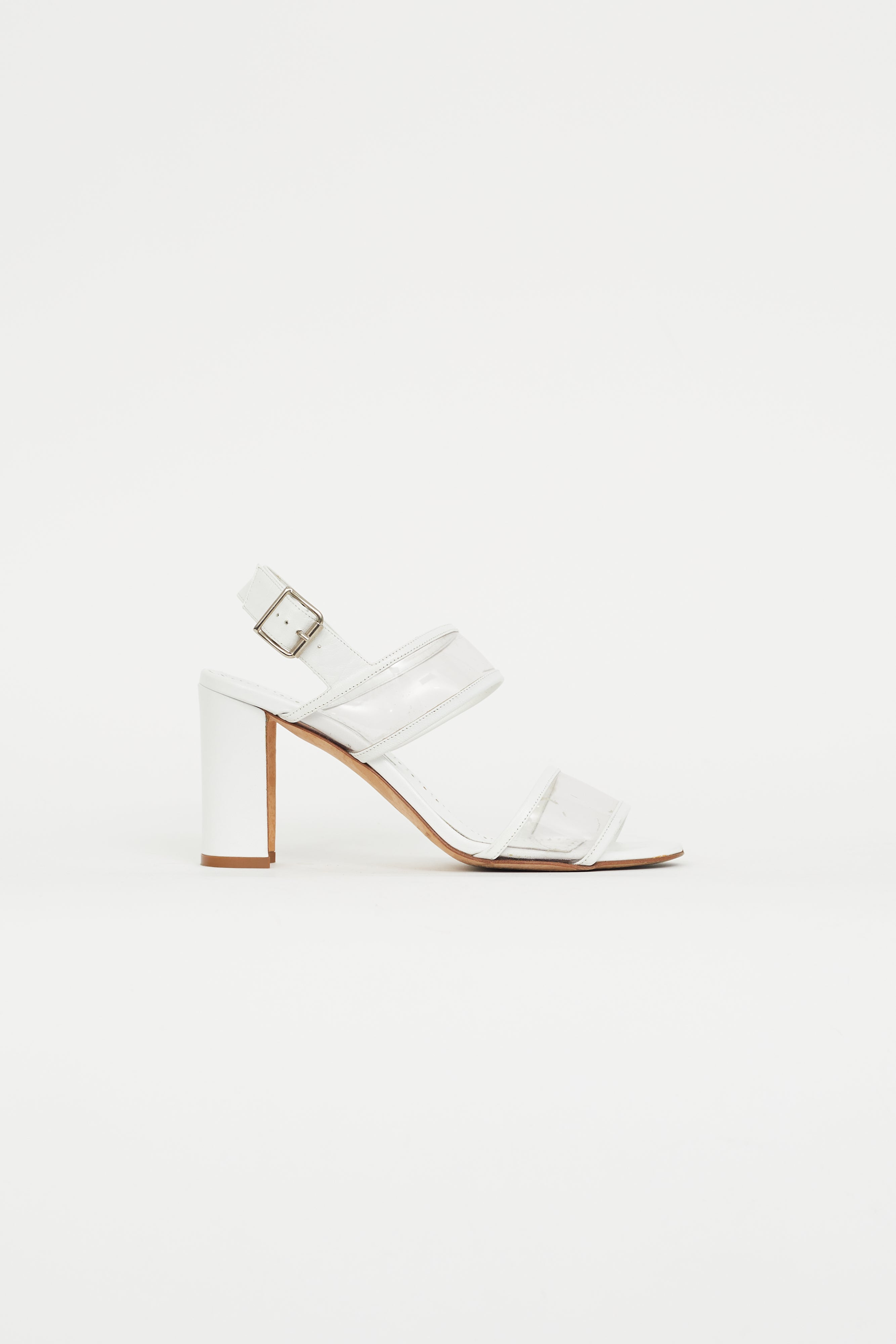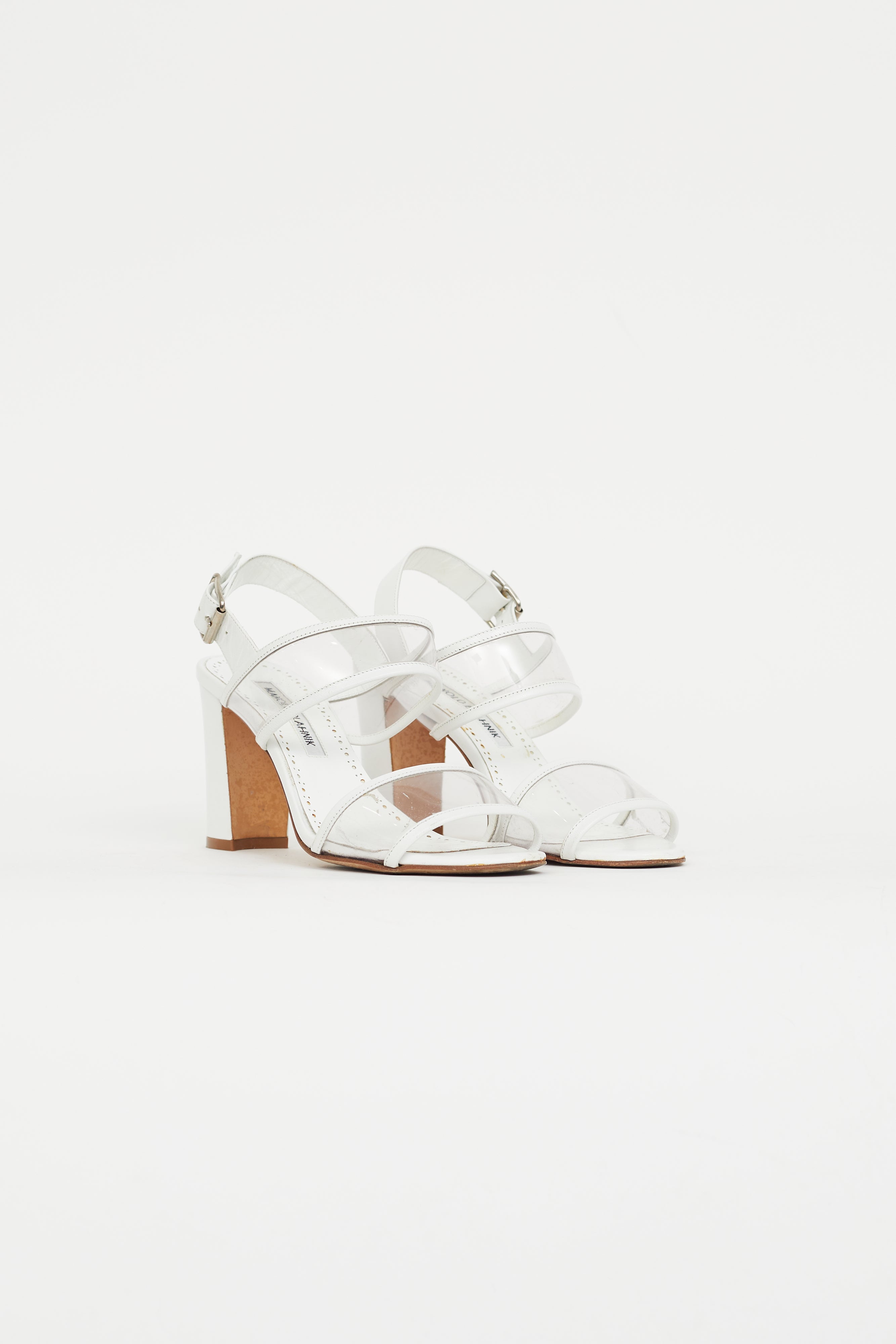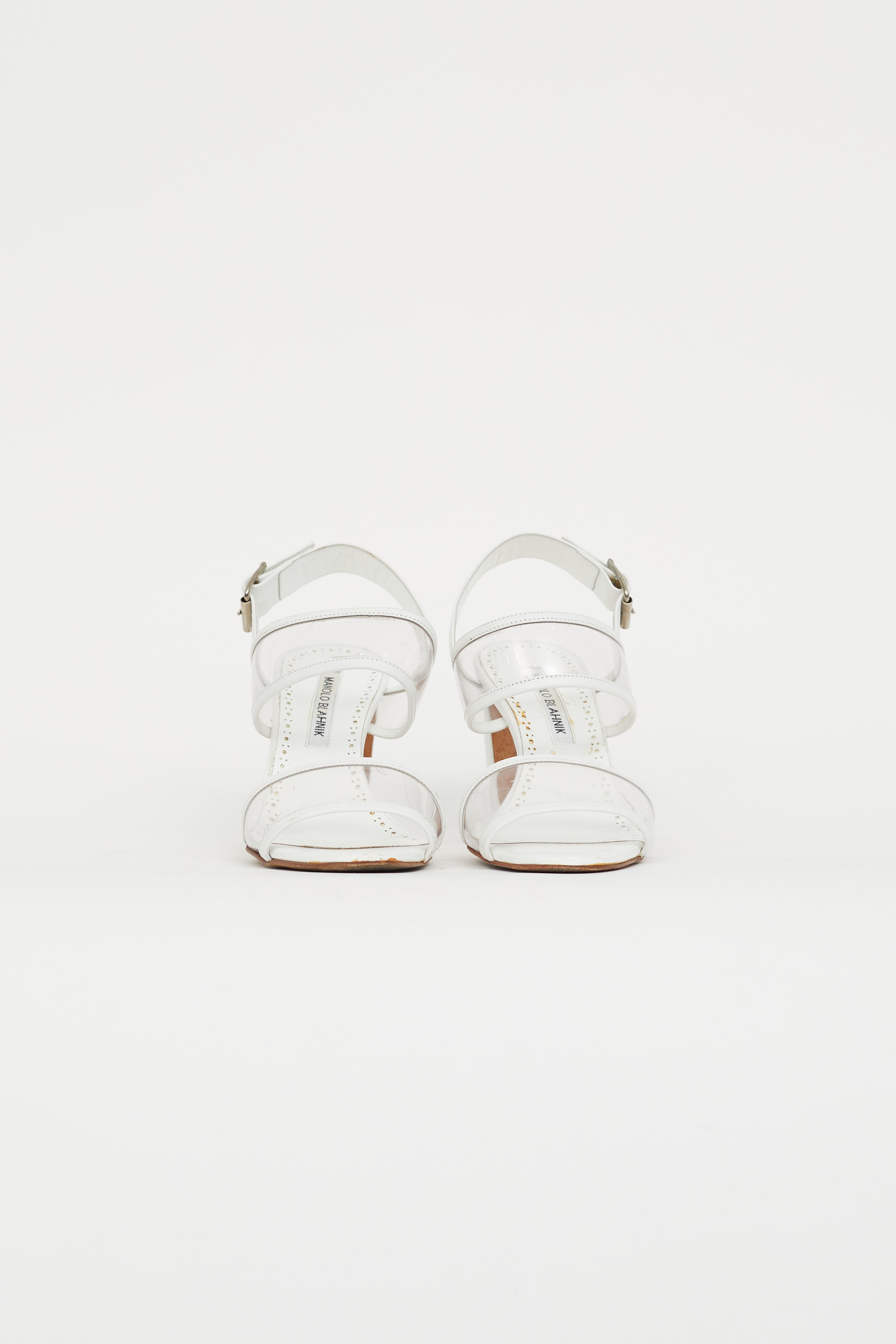 Pre-owned Manolo Blahnik sandals in white leather featuring wide clear PVC straps, sling back closure with silver-tone hardware, open almond toe and block heel.