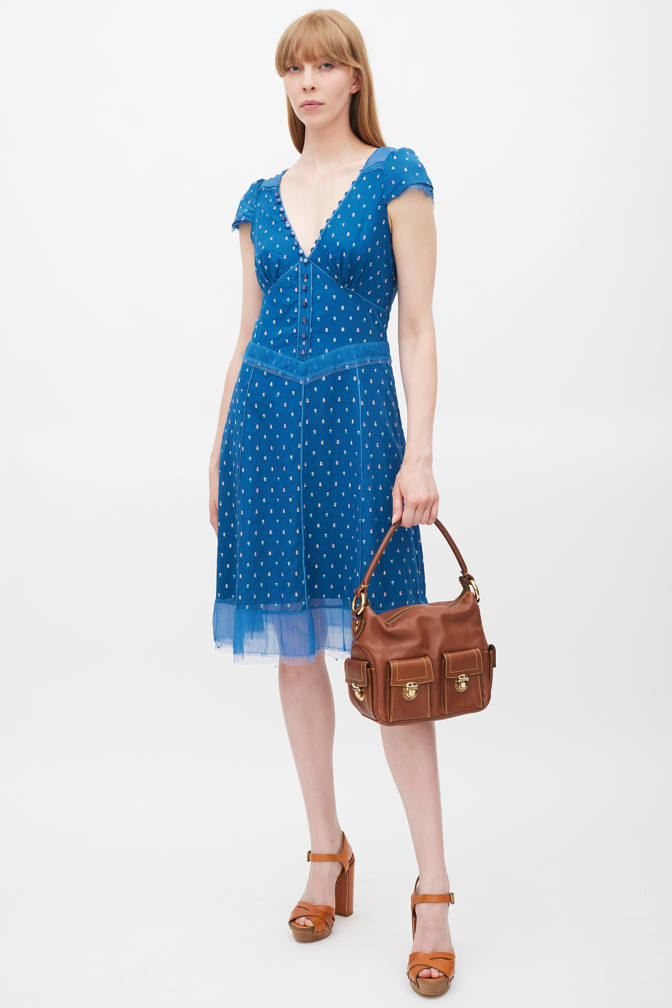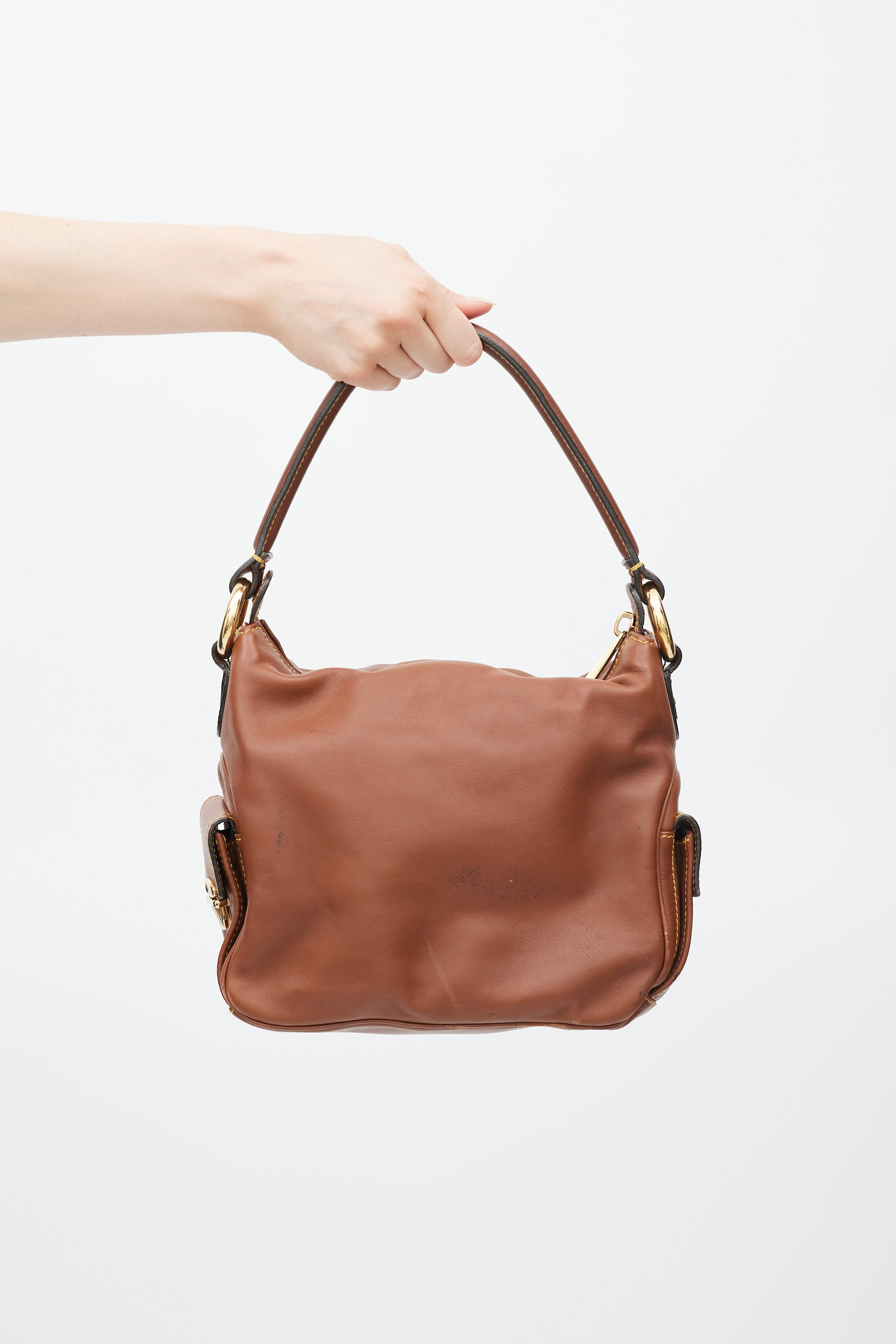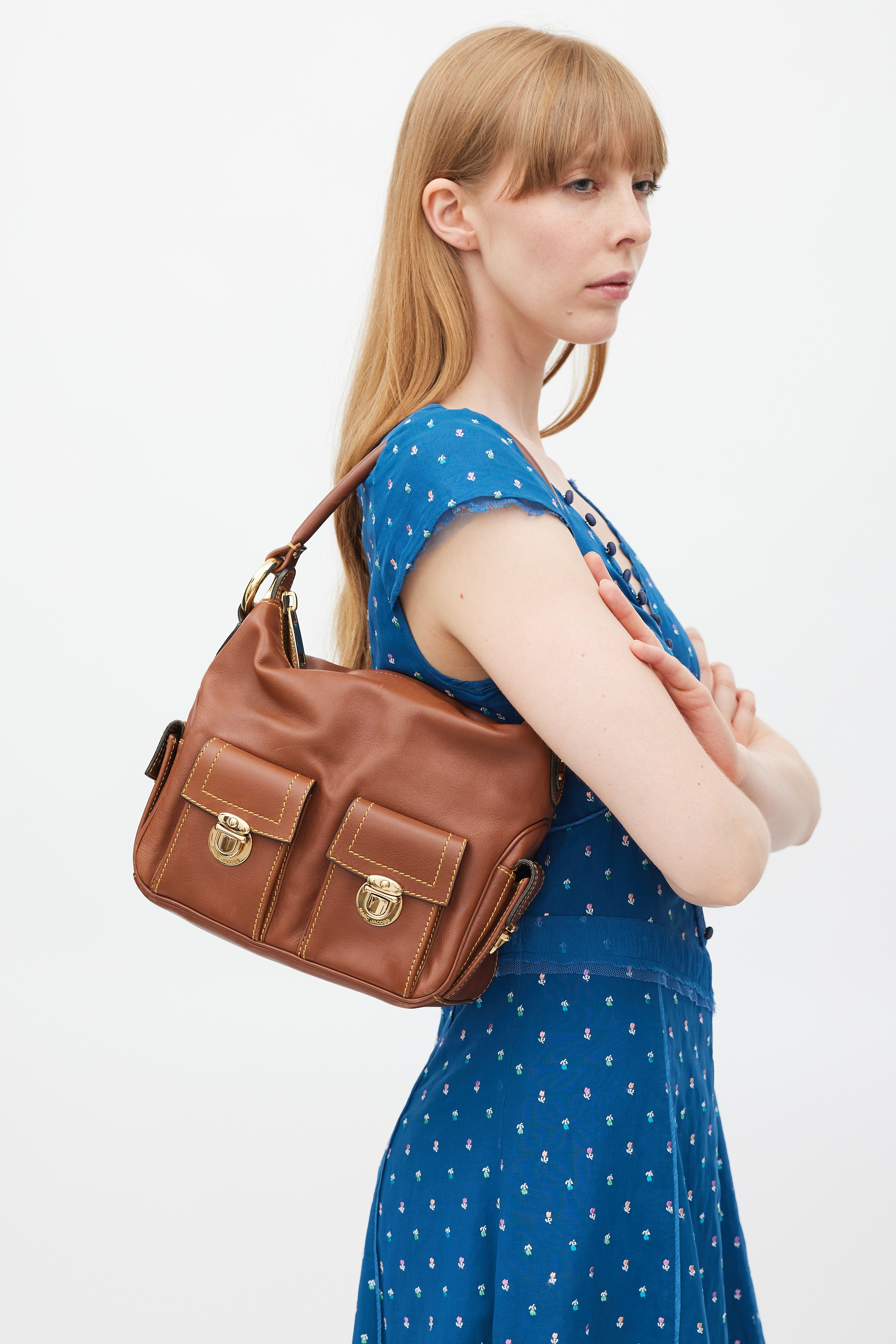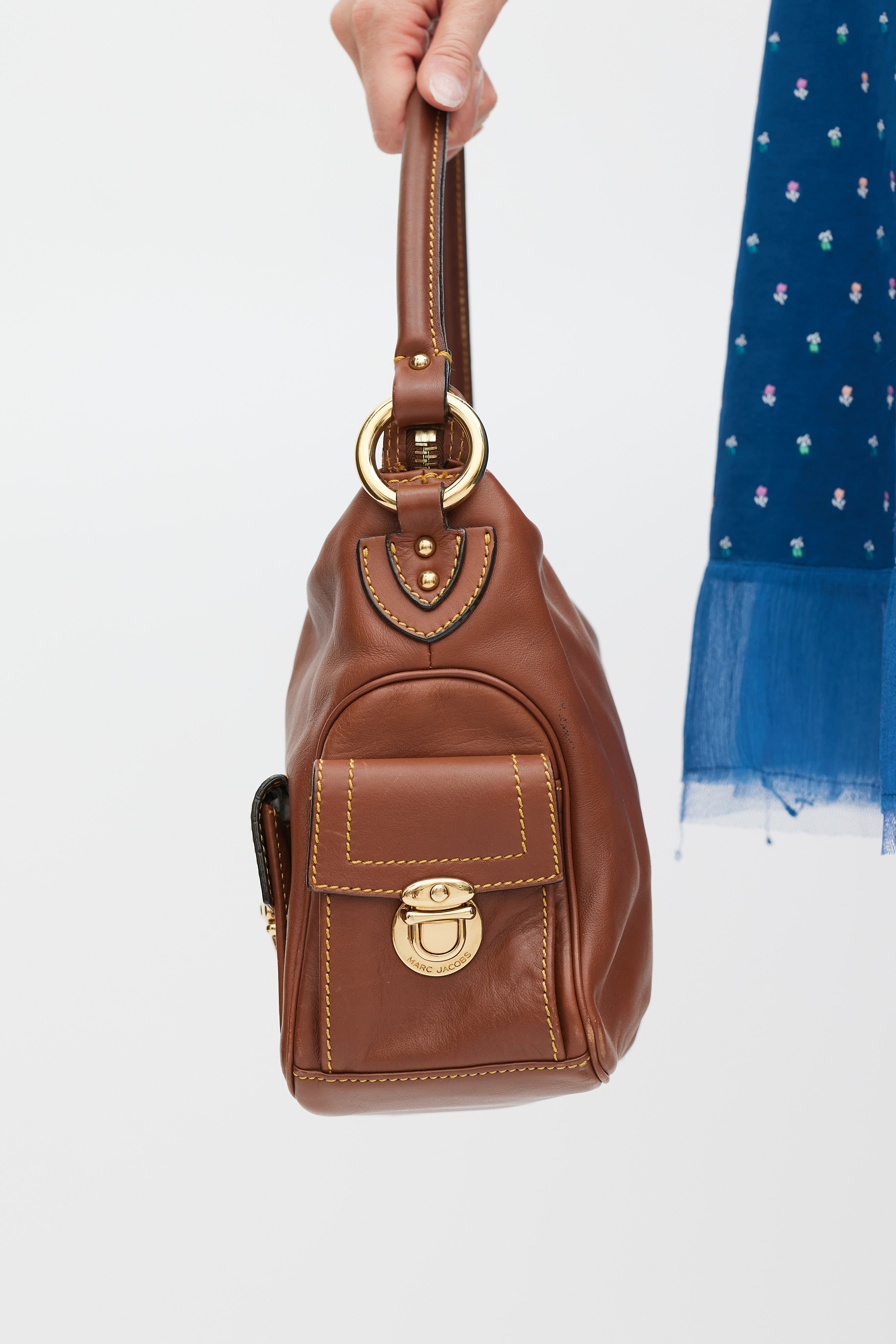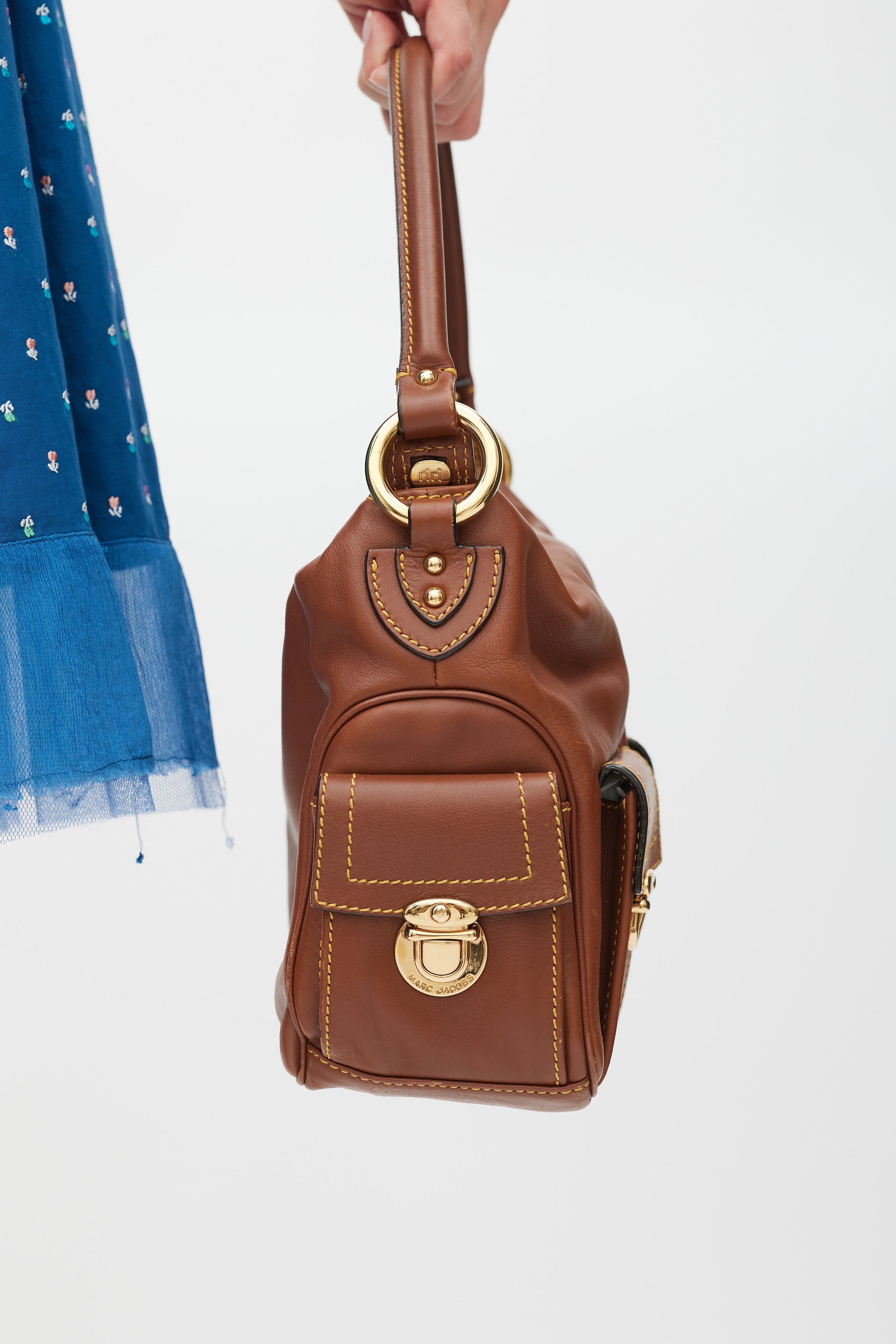 Pre-owned Marc Jacobs brown leather Blake bag featuring two cargo pockets at front and side, rolled top handle, one main compartment with one zip pocket, and gold tone top zip closure.