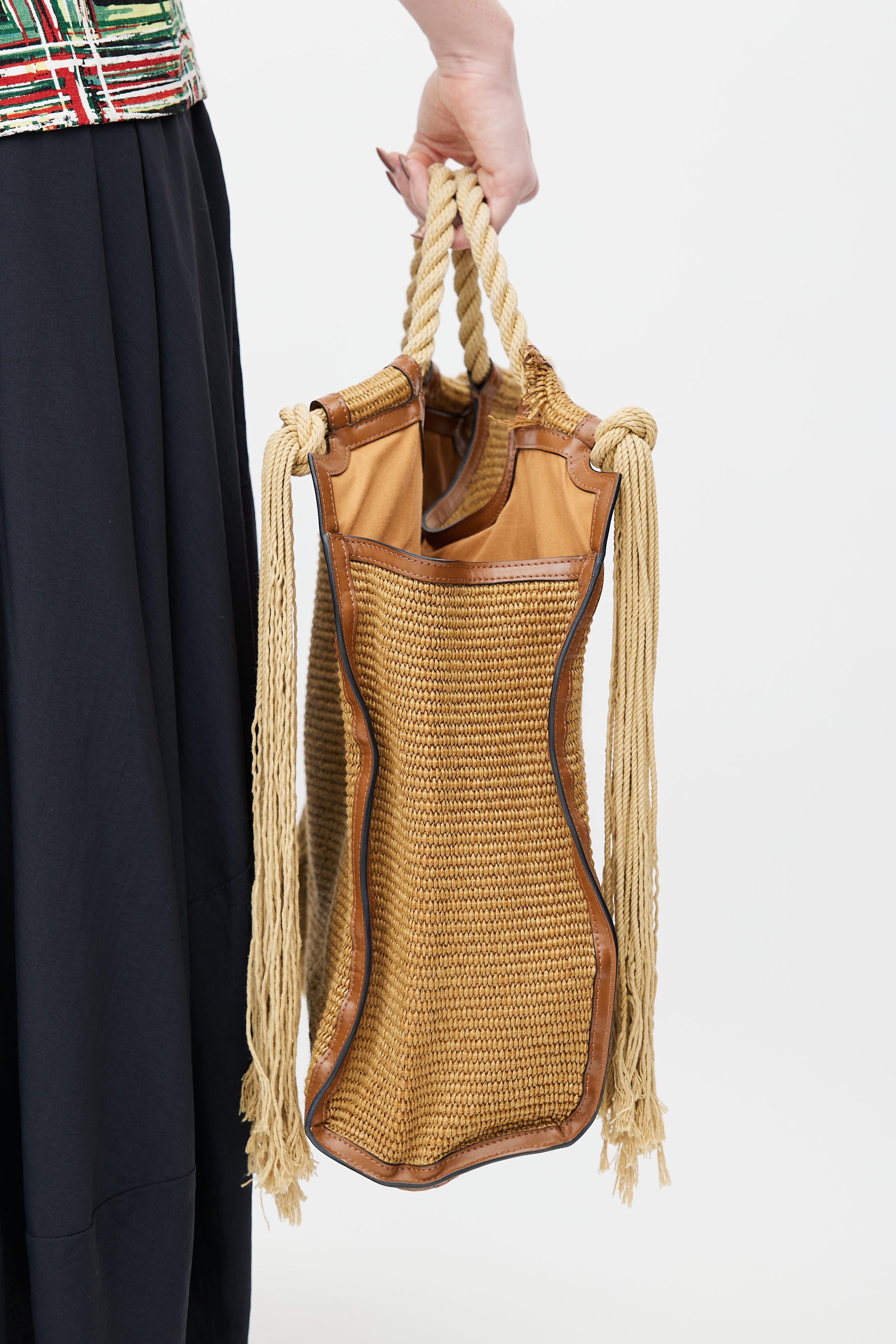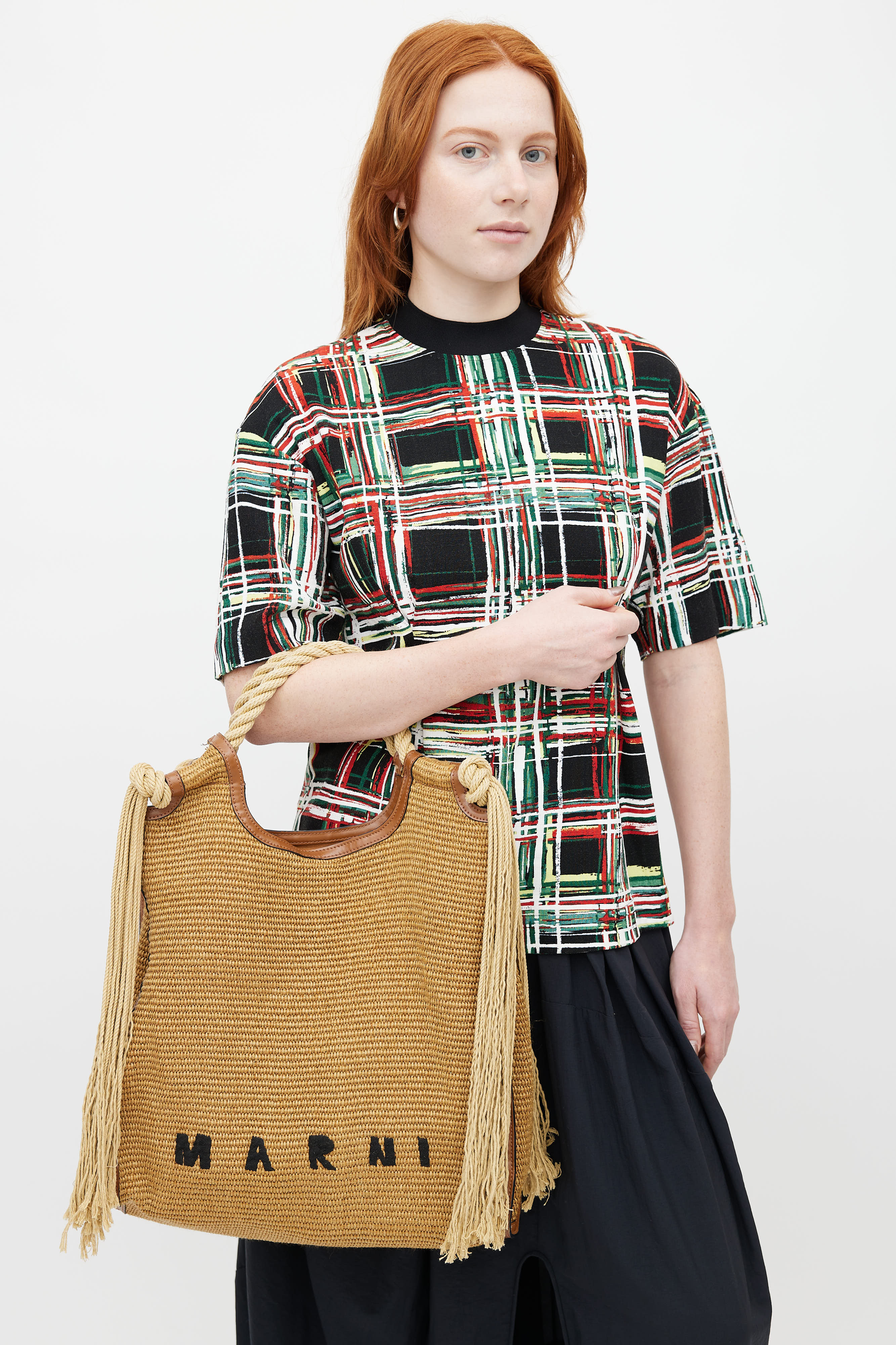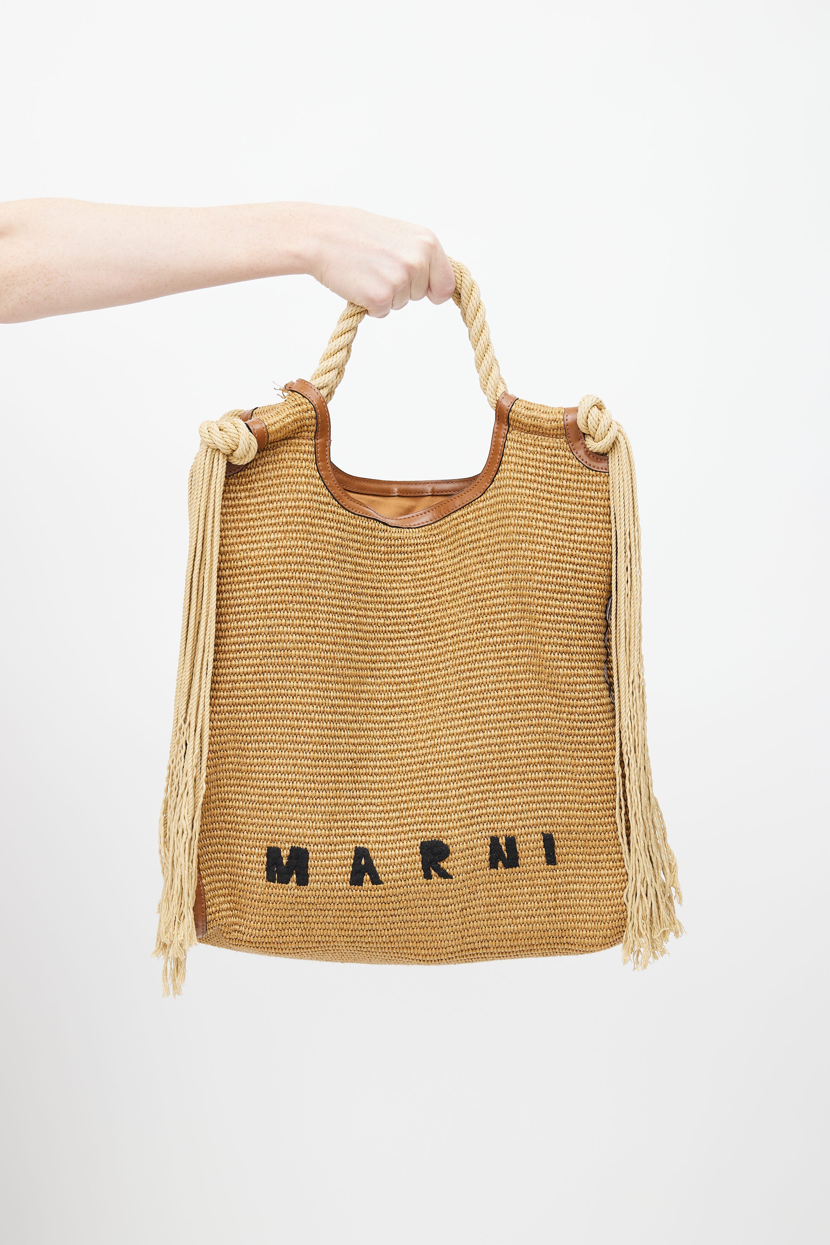 Pre-owned Marni brown Marcel North-South tote bag featuring braided top handles, fringe at sides, brown leather trim, black embroidered logo at face, open compartment, and interior zip pocket.