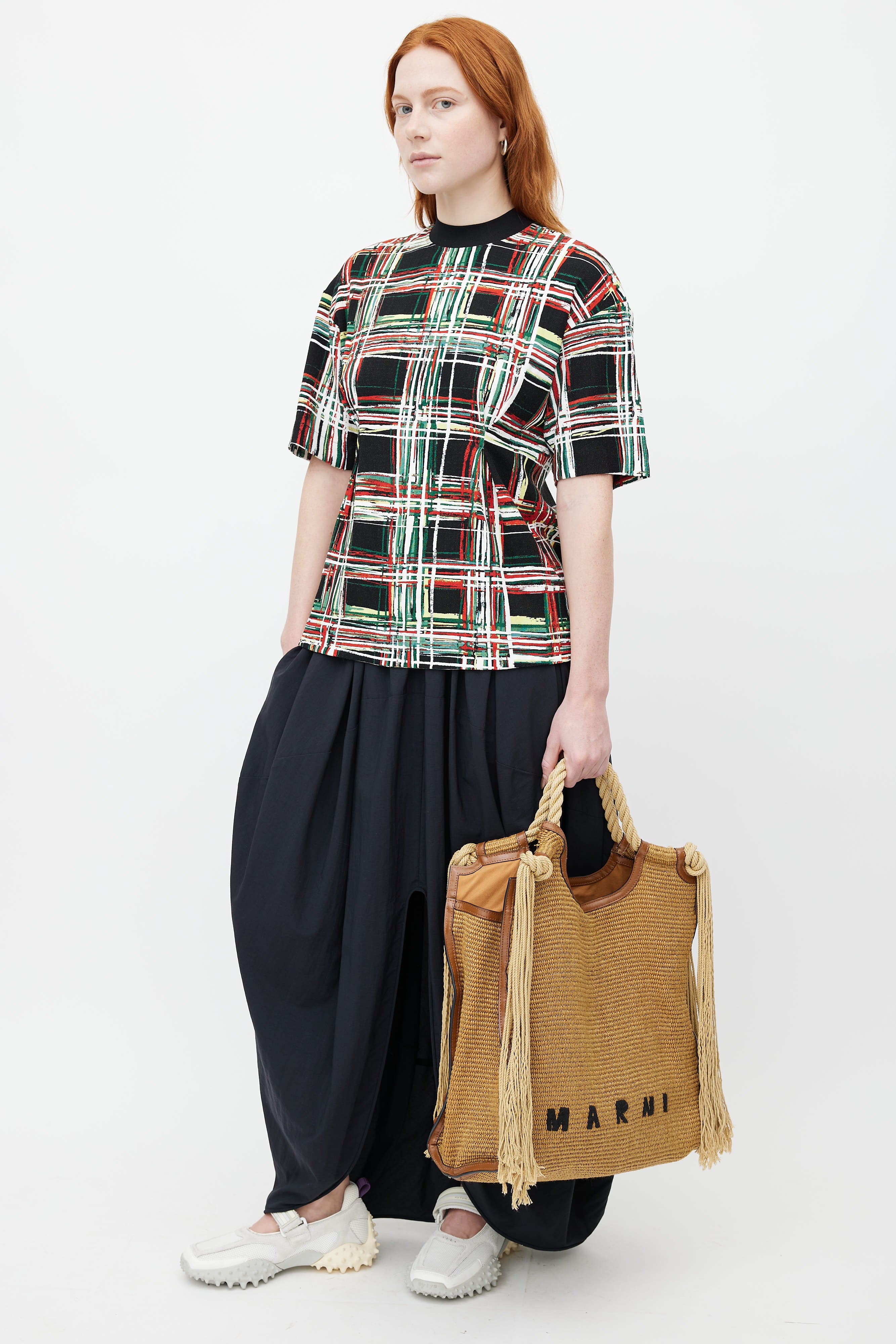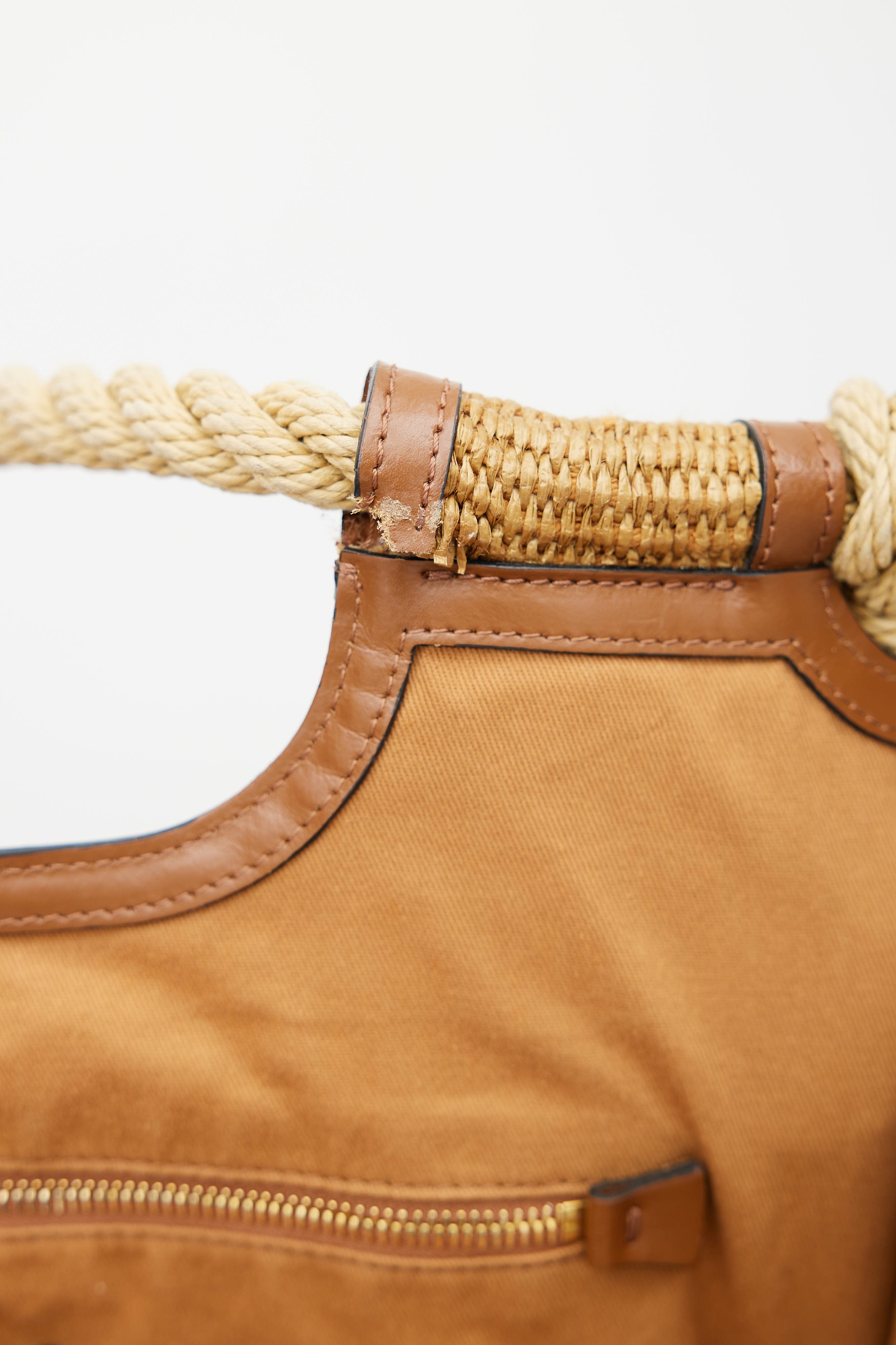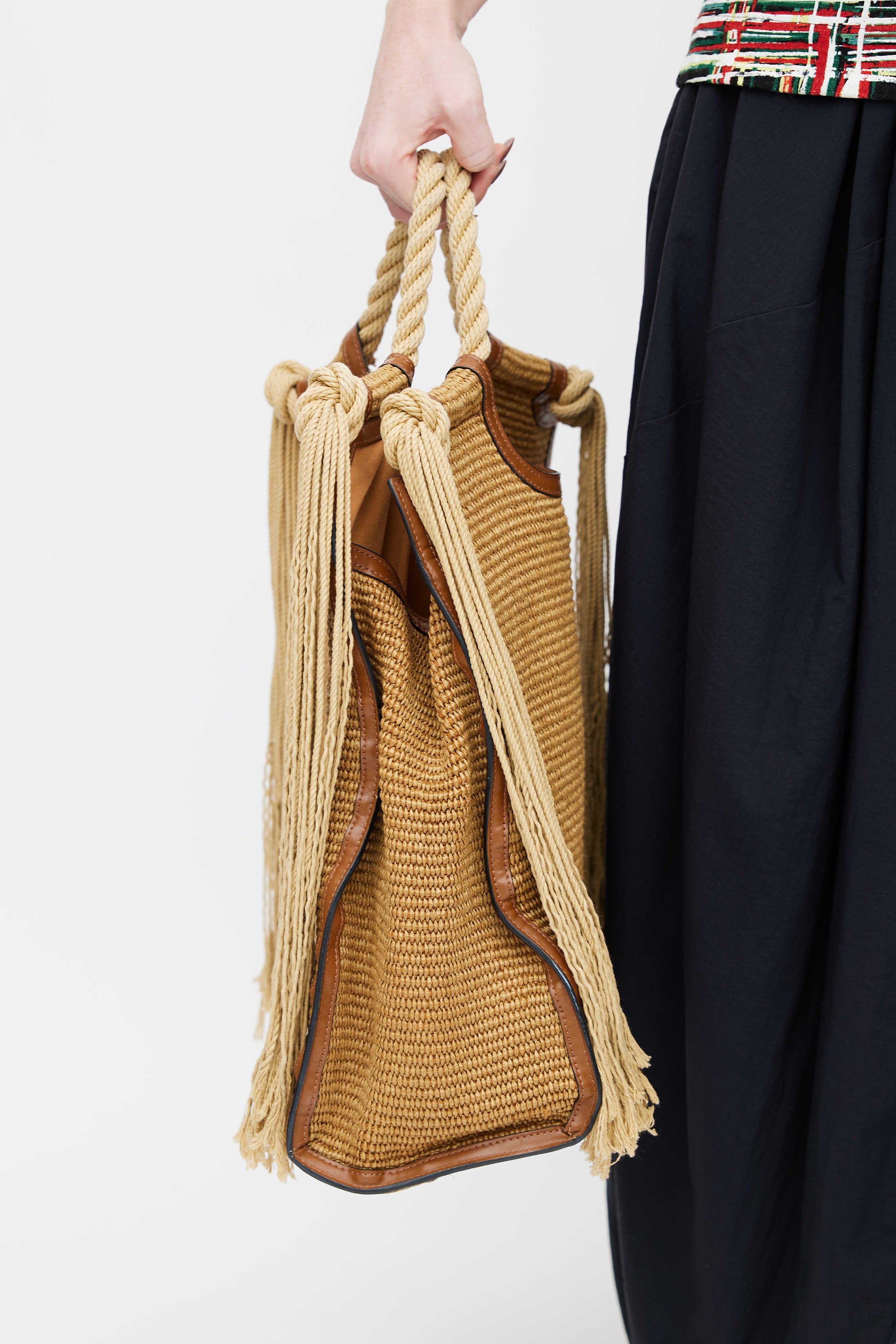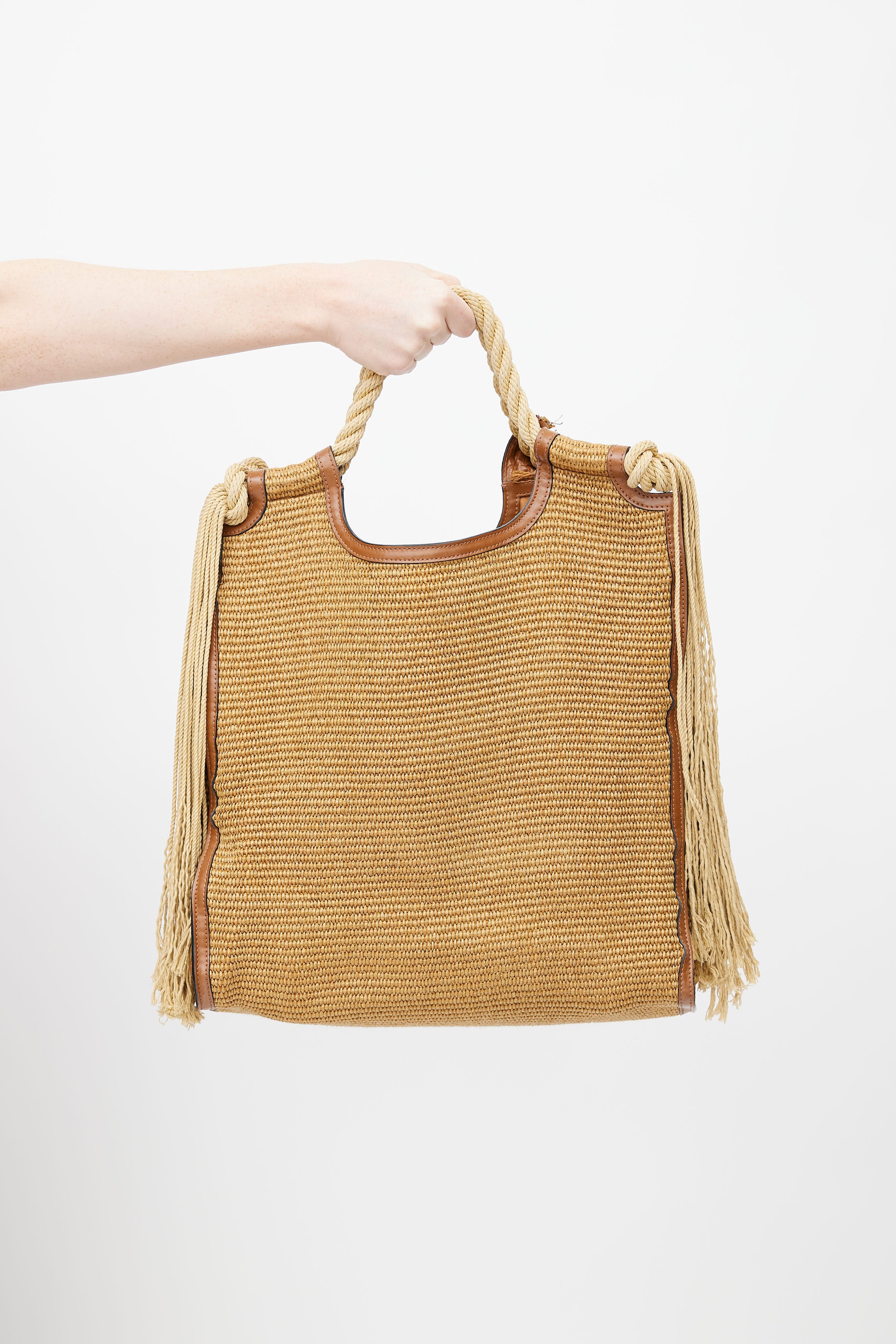 Pre-owned Marni brown Marcel North-South tote bag featuring braided top handles, fringe at sides, brown leather trim, black embroidered logo at face, open compartment, and interior zip pocket.