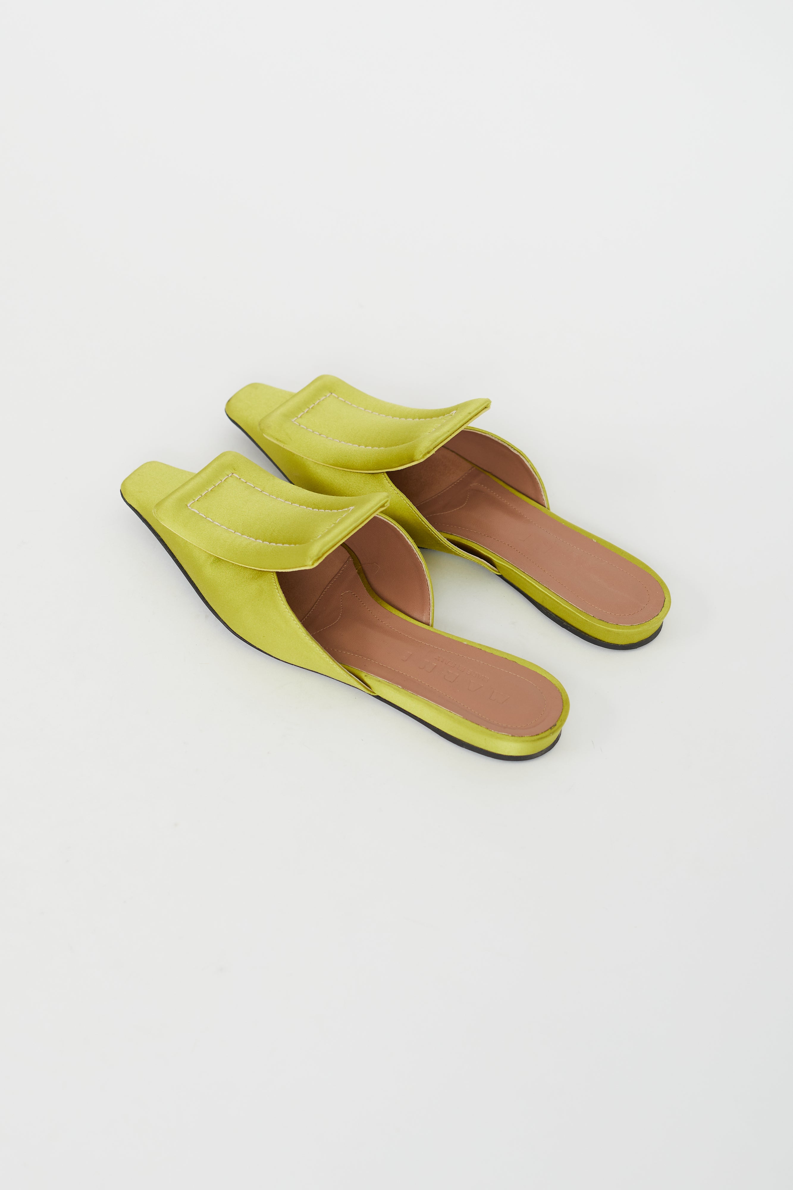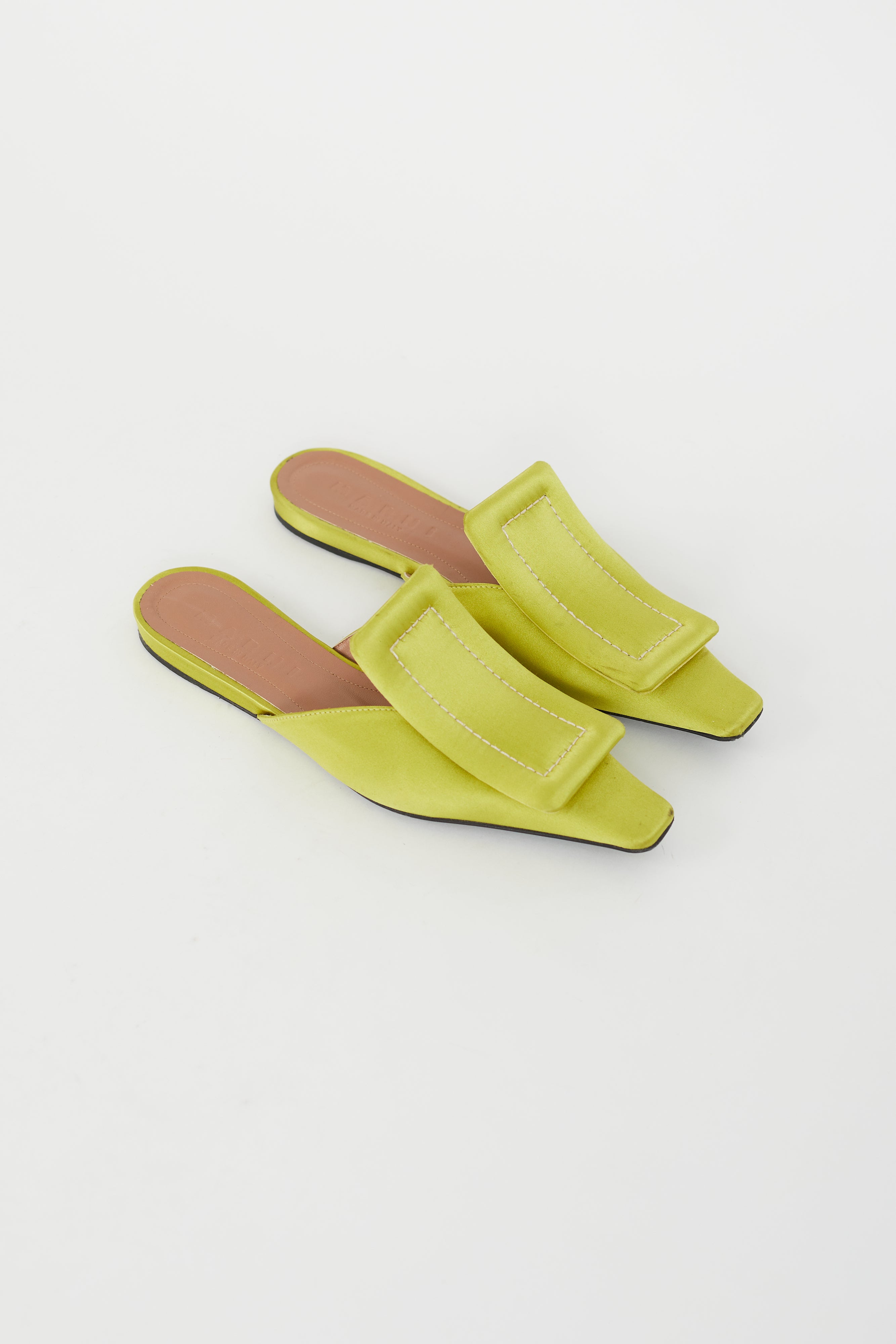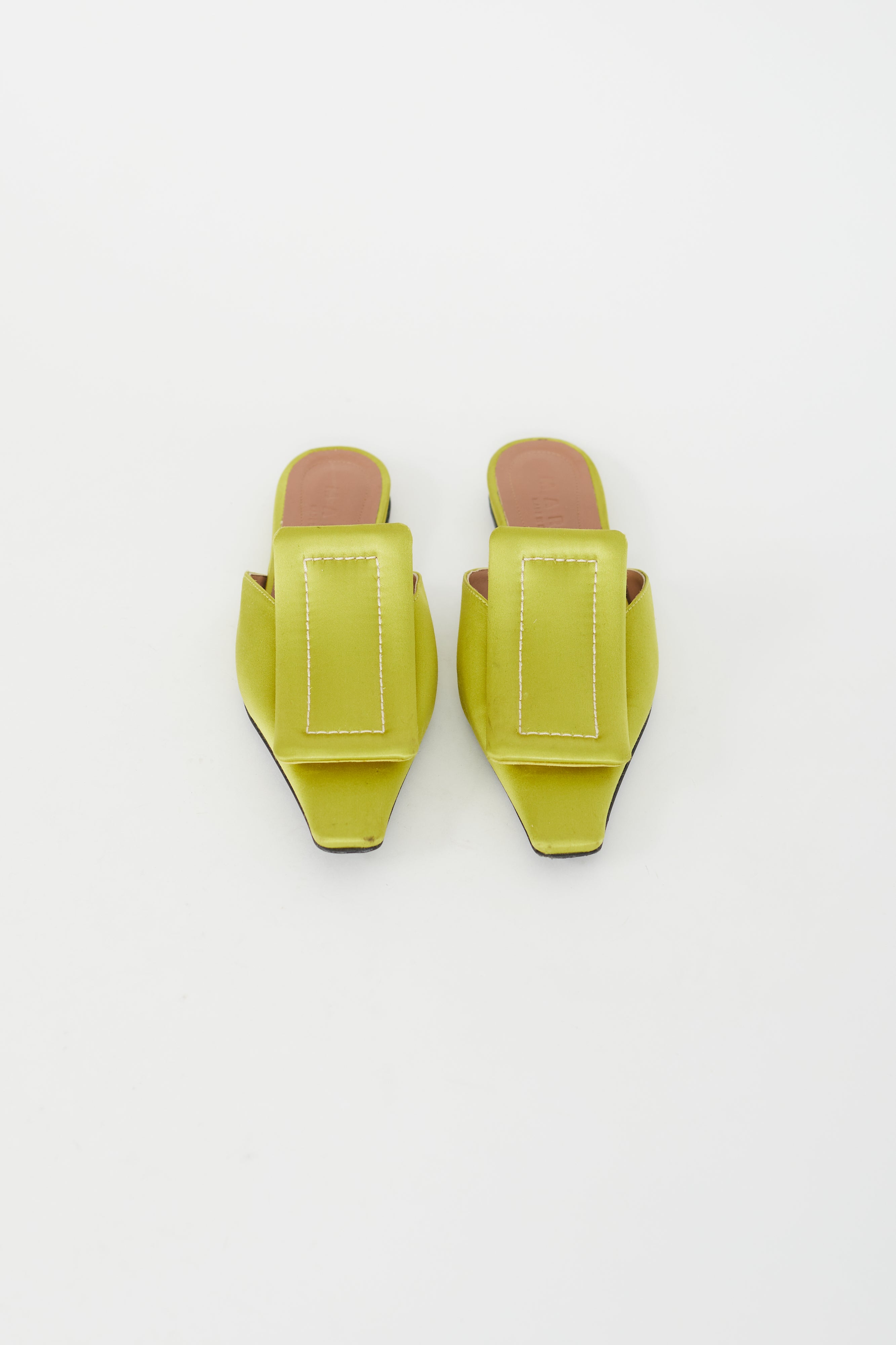 Pre-owned Marni green satin Sabot mule featuring a pointed square toe, exaggerated rectangular detail at vamp, leather insole and slip on entry.