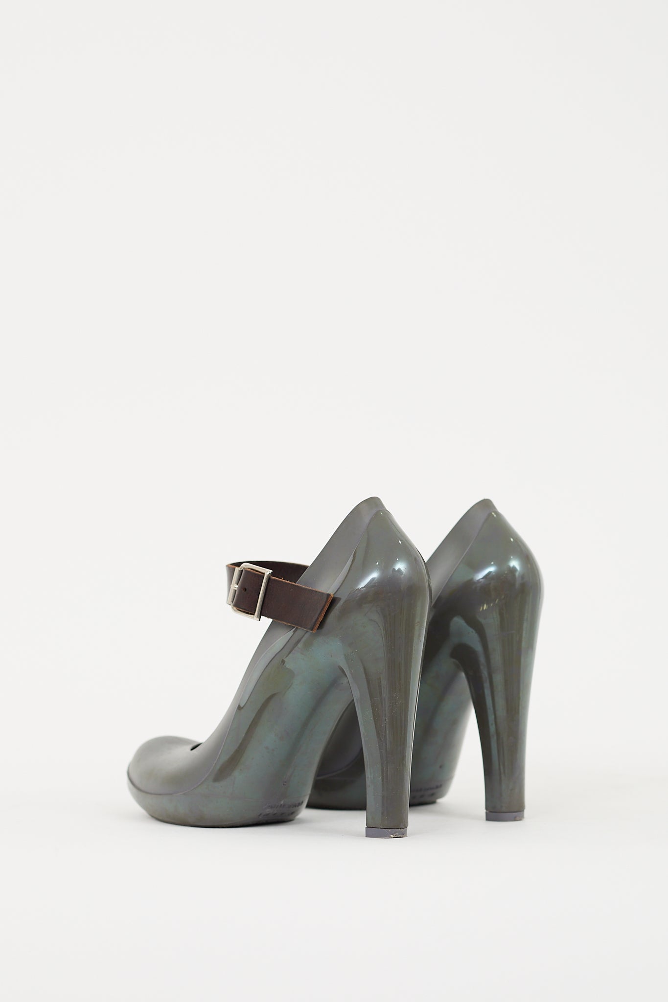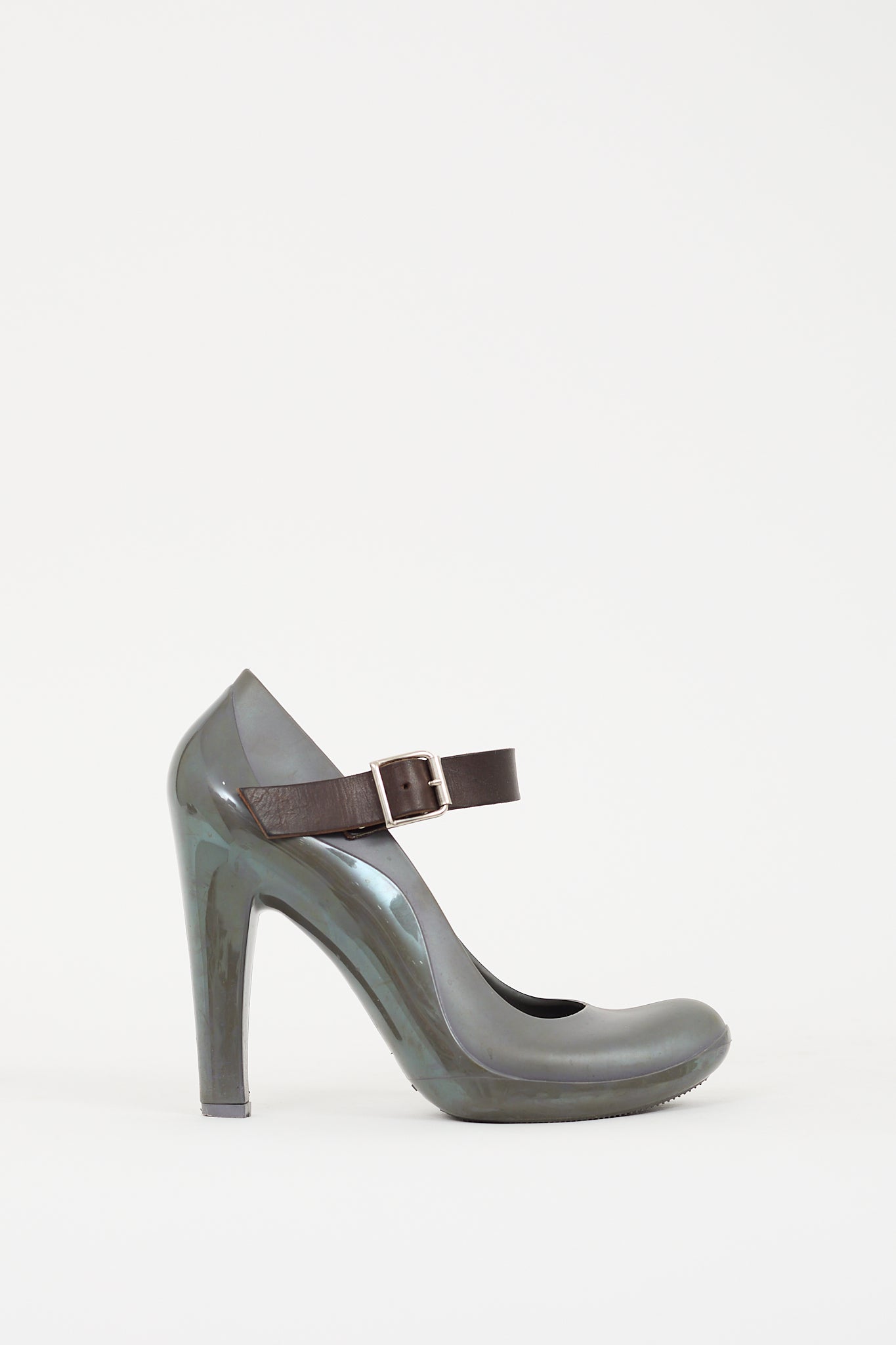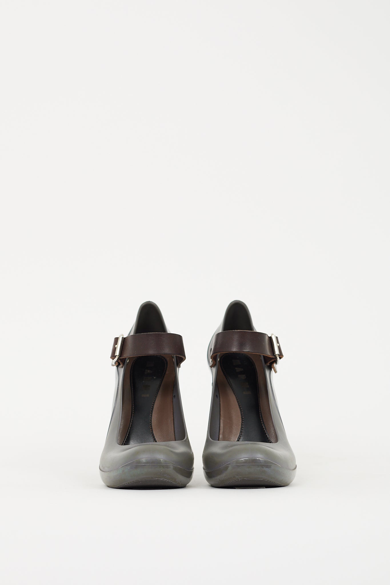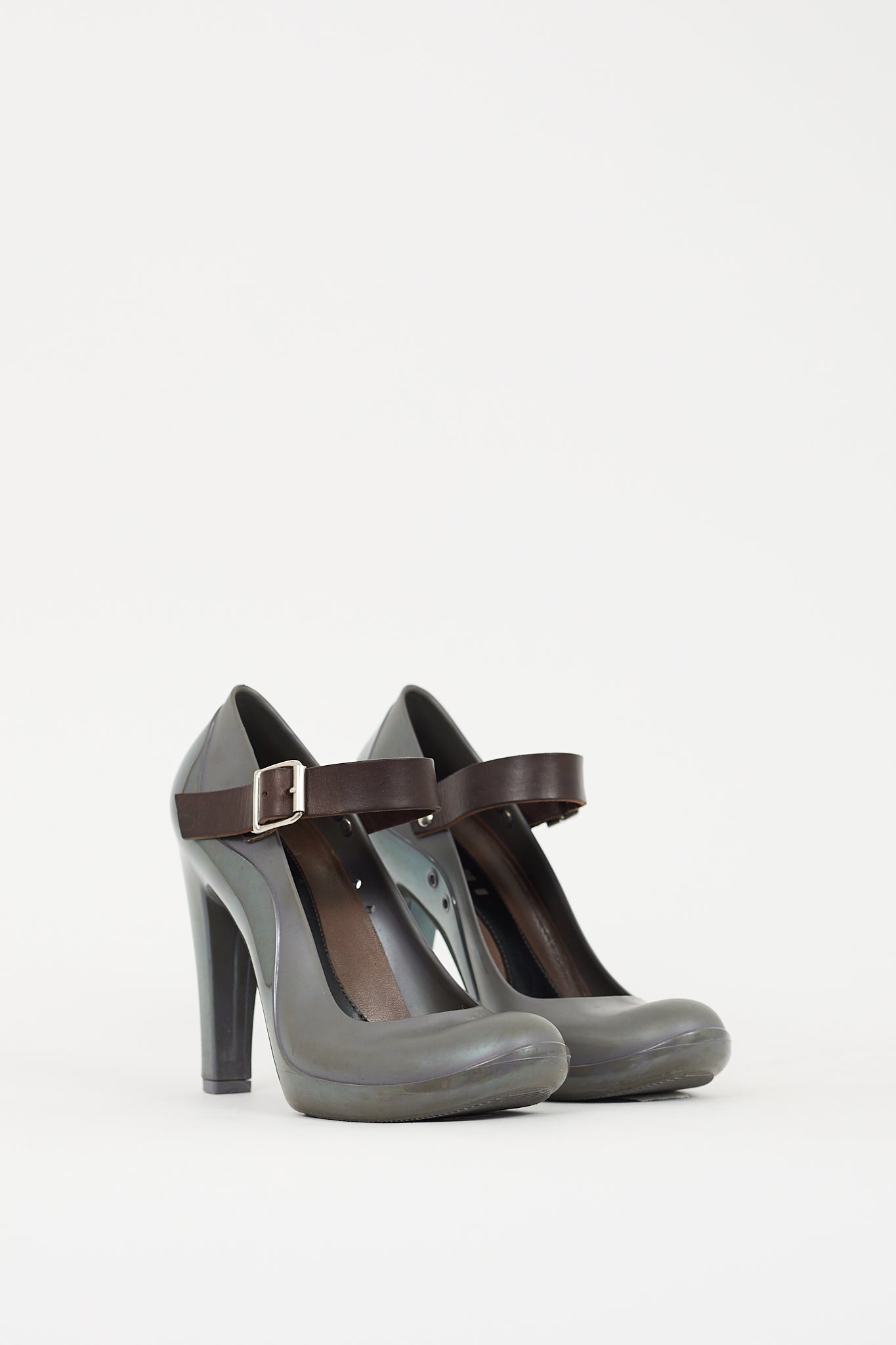 Pre-owned Marni grey and brown Mary Jane pumps featuring a rounded toe, rubber upper, adjustable brown leather instep strap, stiletto heel, and leather insole. Comes with original dust bags.