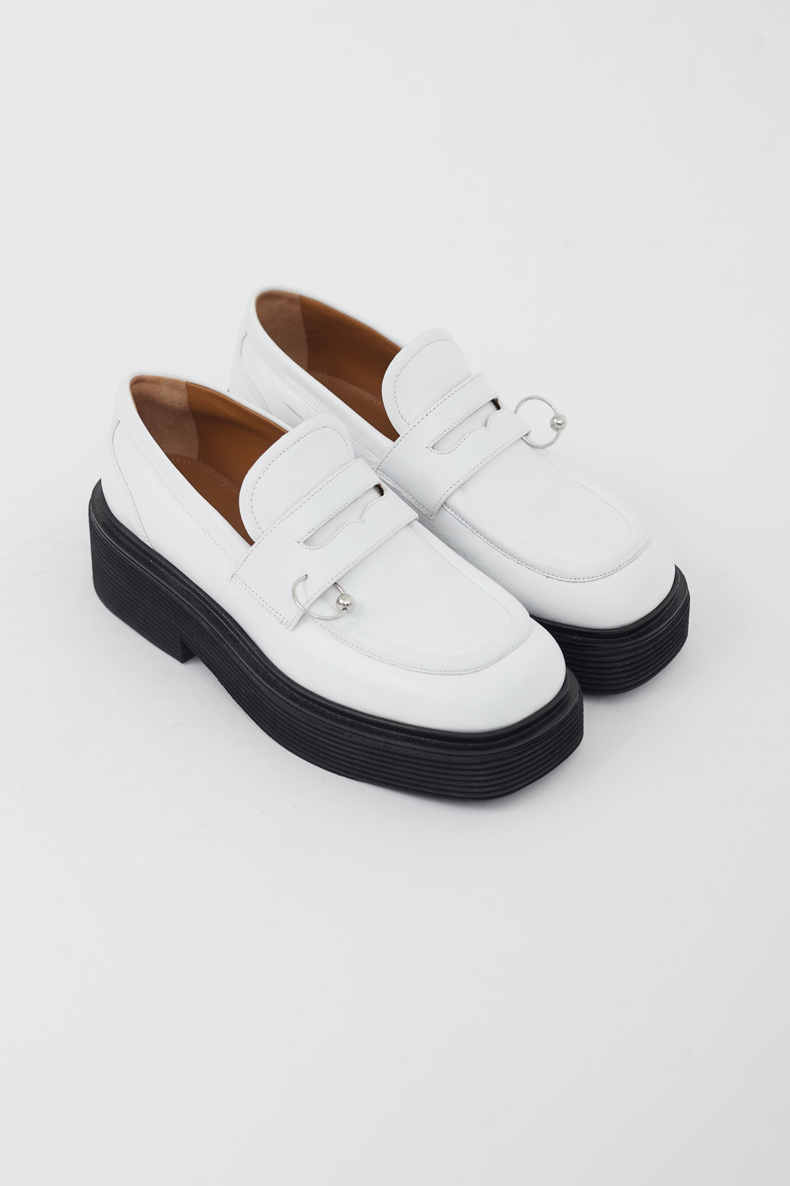 Pre-owned Marni white loafers featuring square toe, piping detail at front, cut out and silver tone piercing embellishment at vamp strap, slip on entry, and stacked midsole and heel.