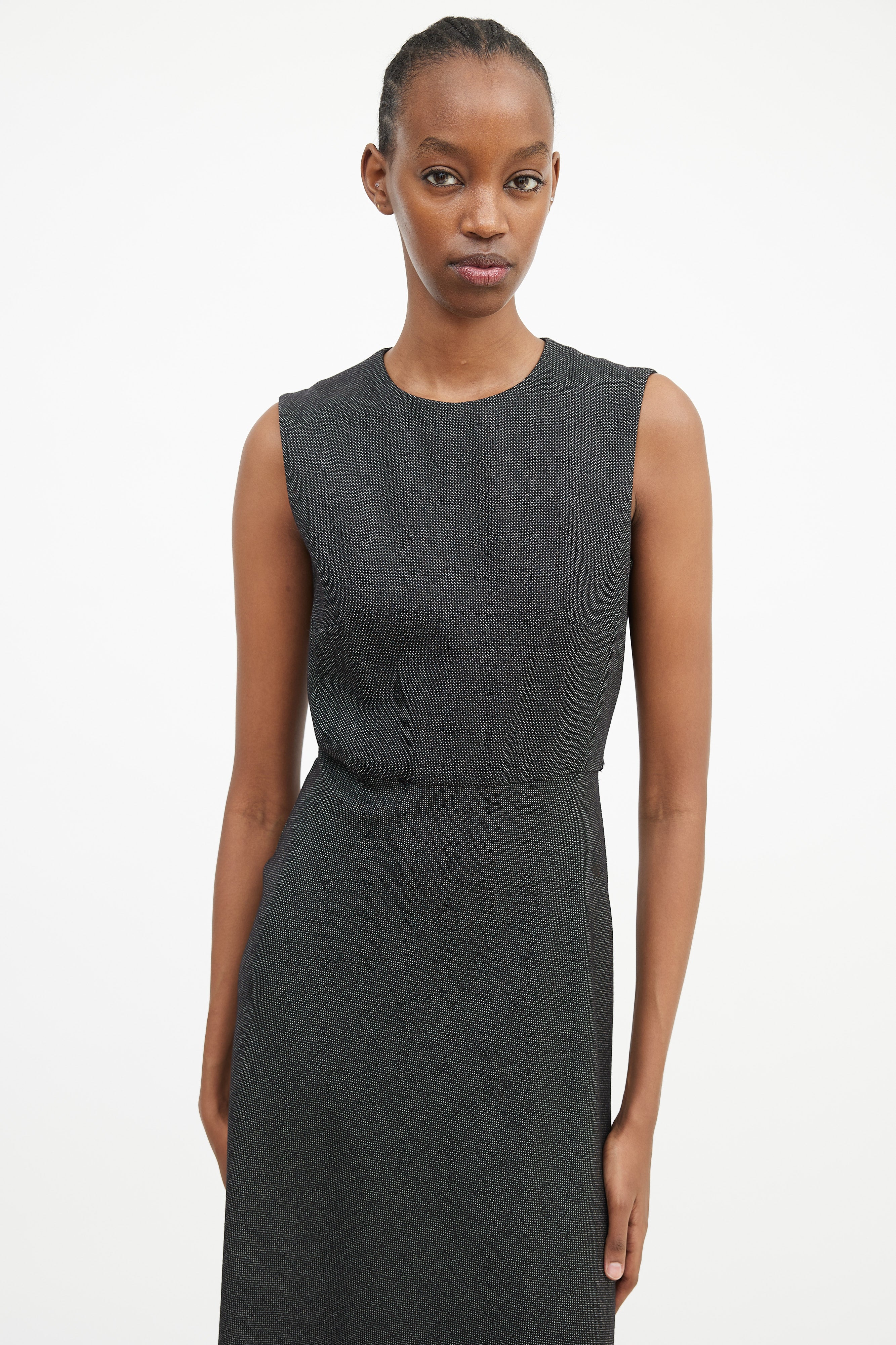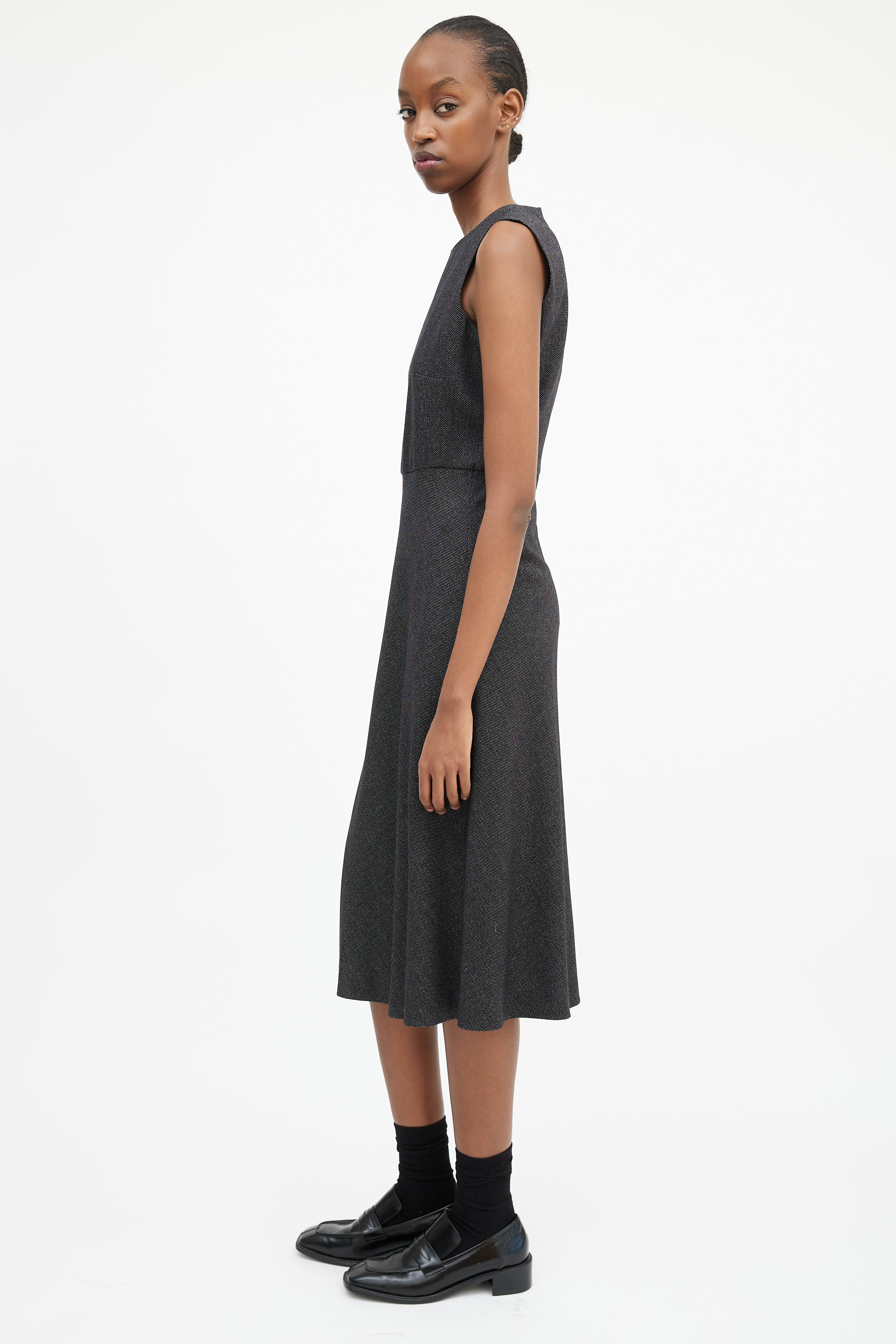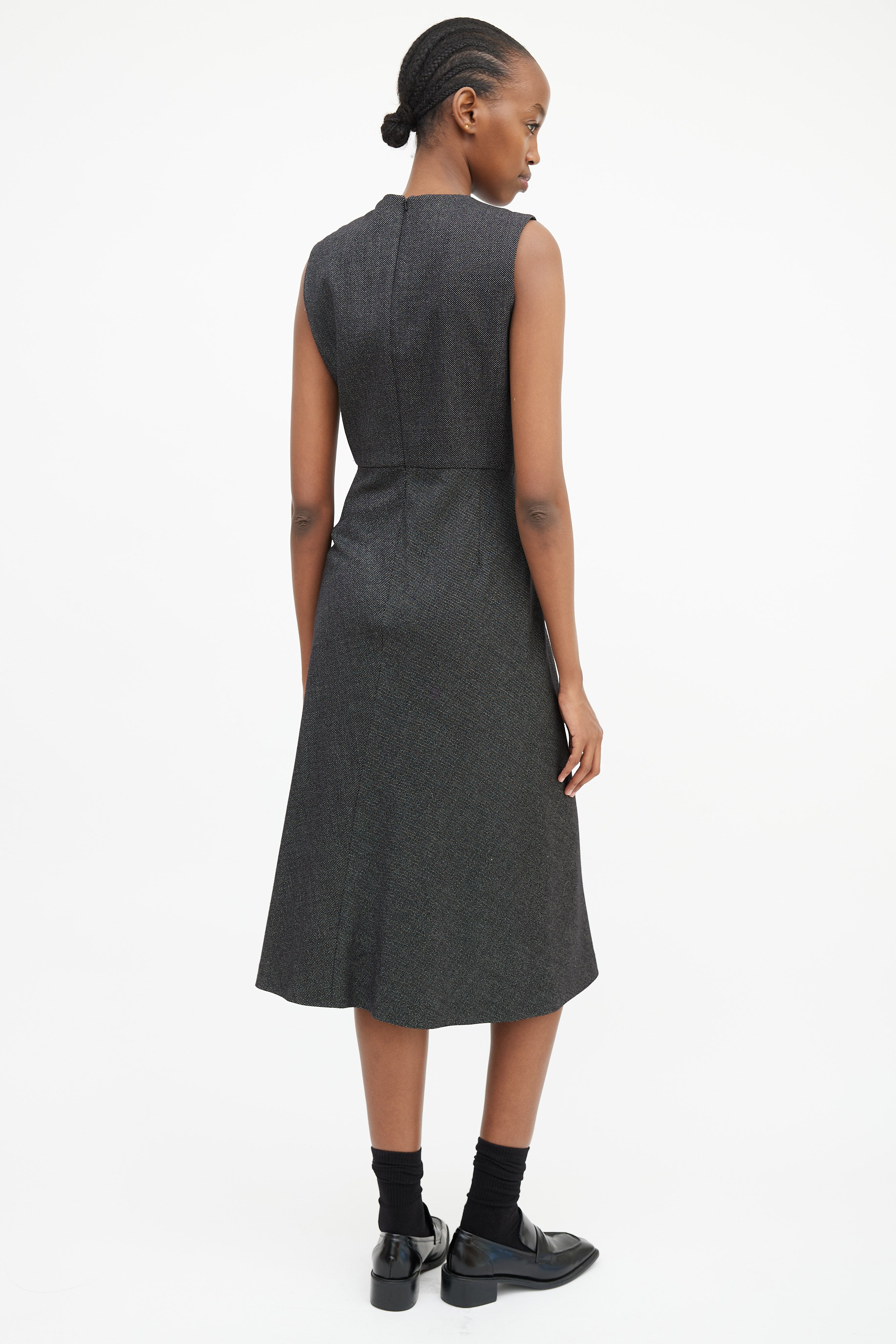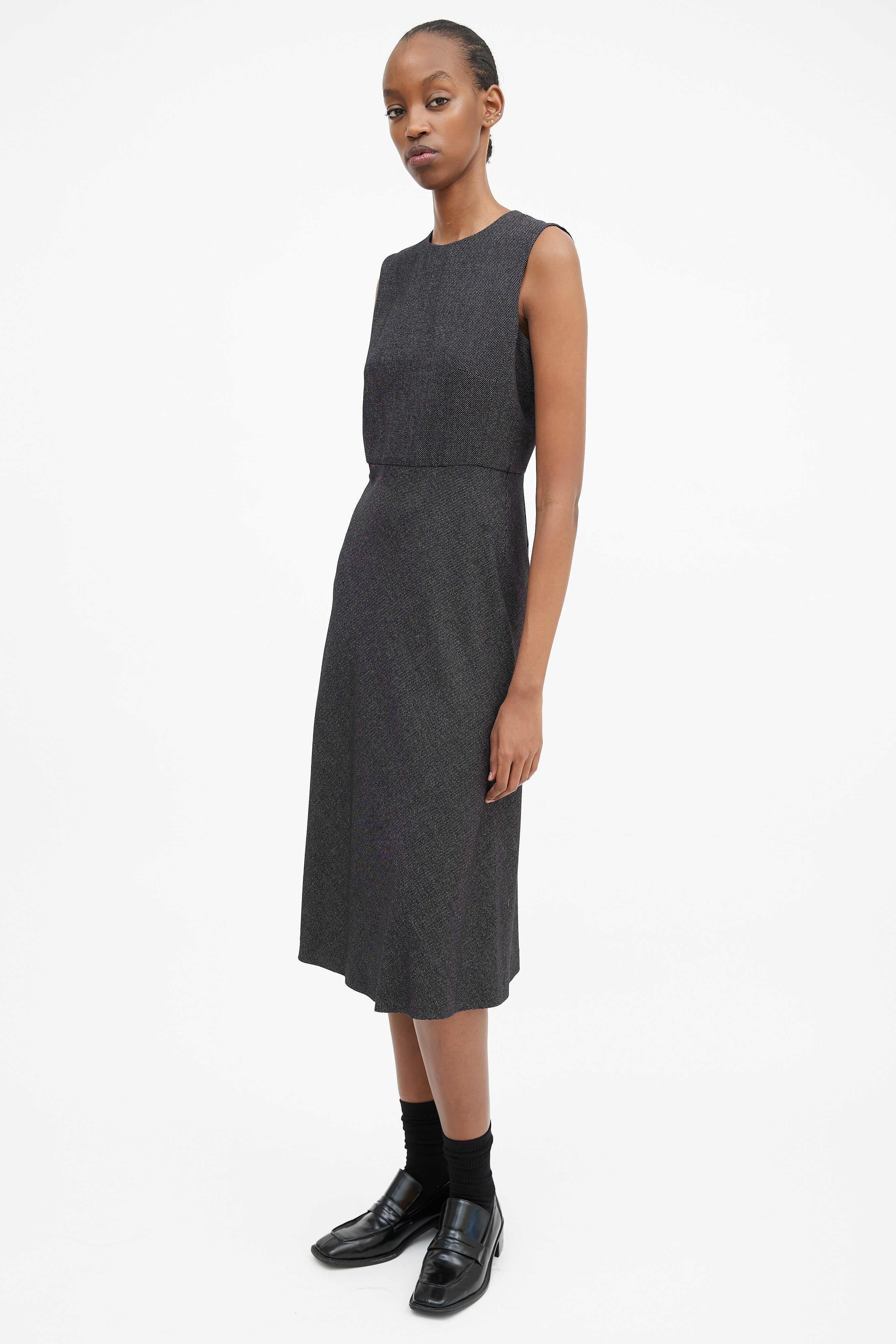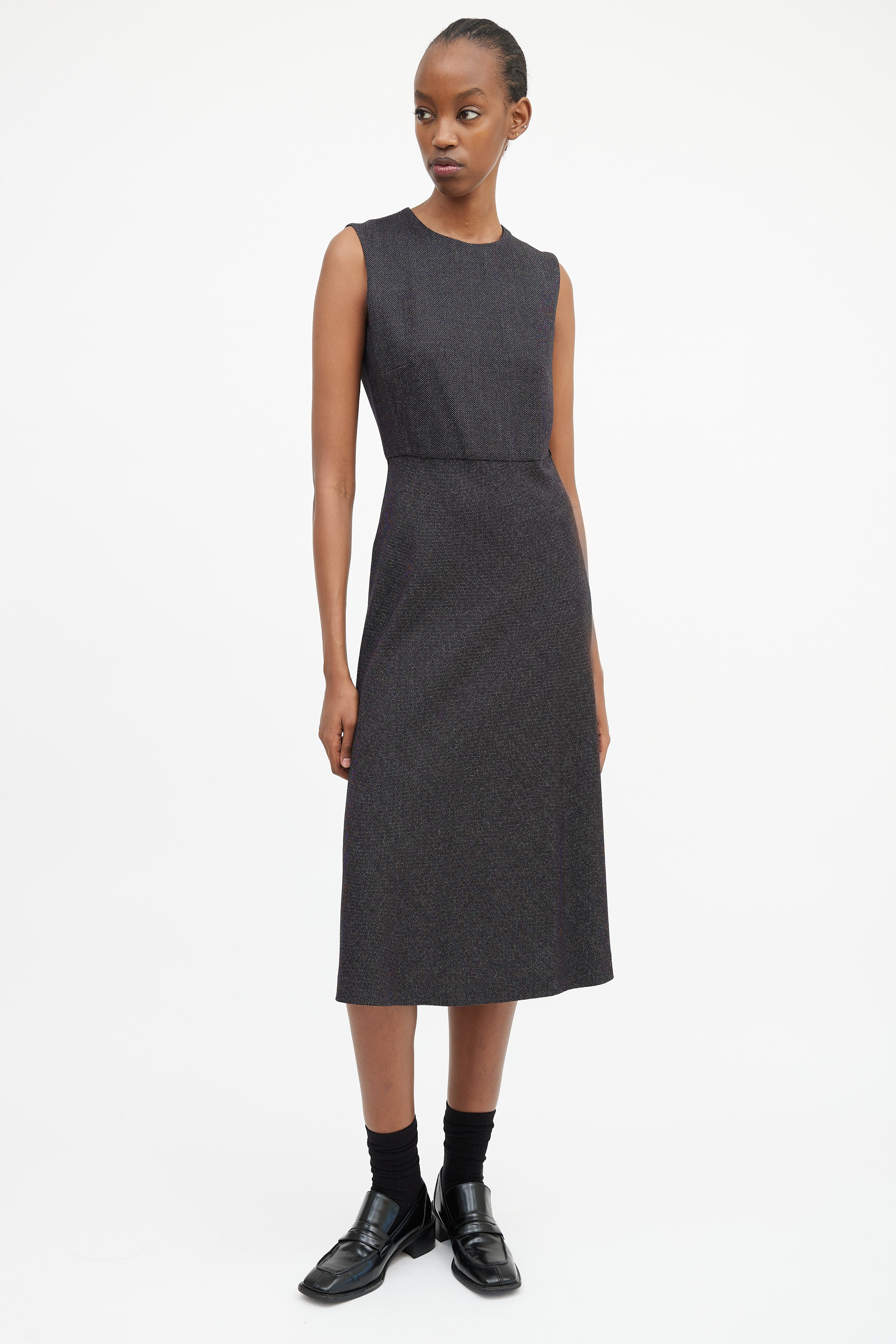 Pre-owned Max Mara black and white sleeveless midi dress featuring a rounded neckline, panelled construction, darting at bust, and concealed back zip closure. Lined bodice.