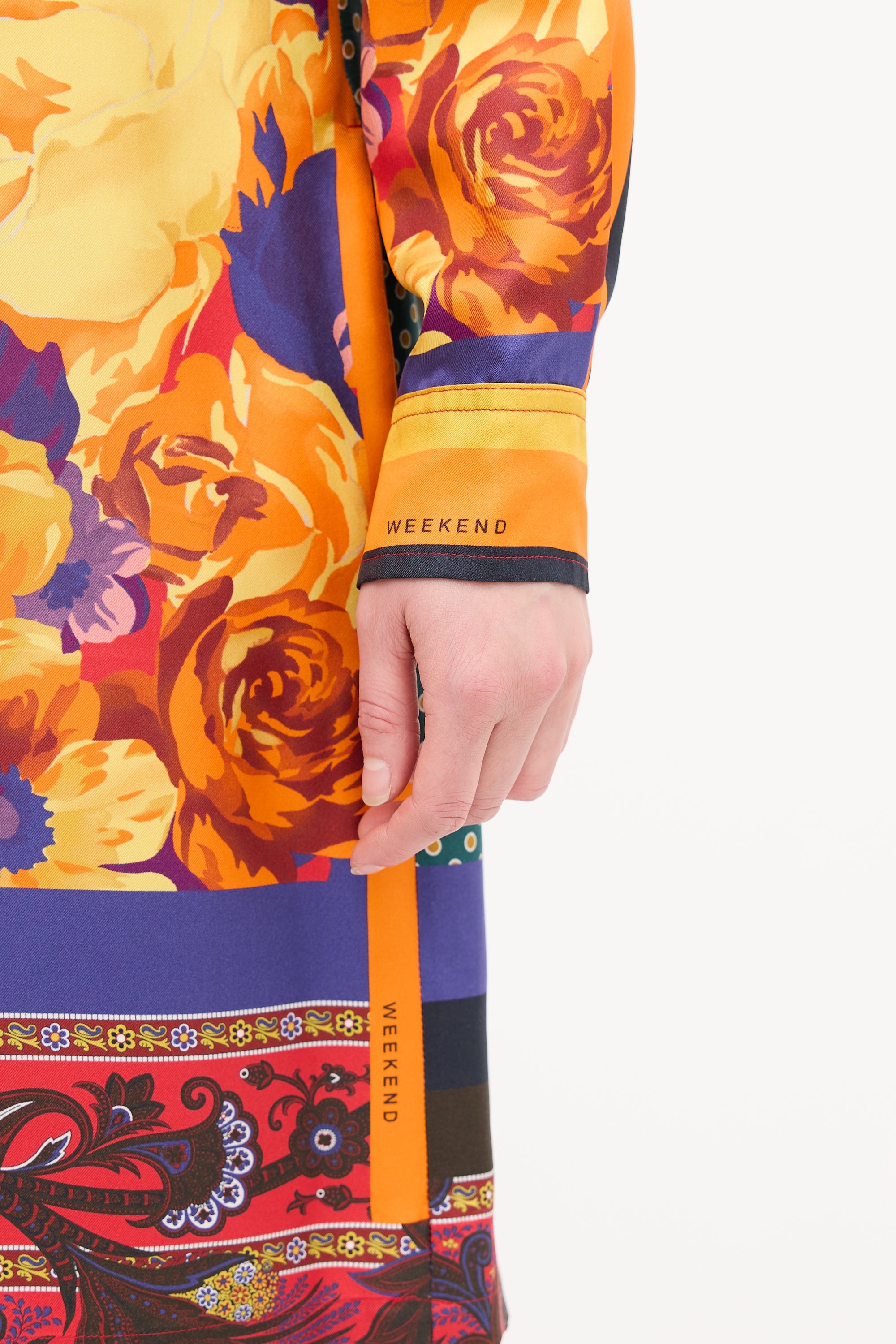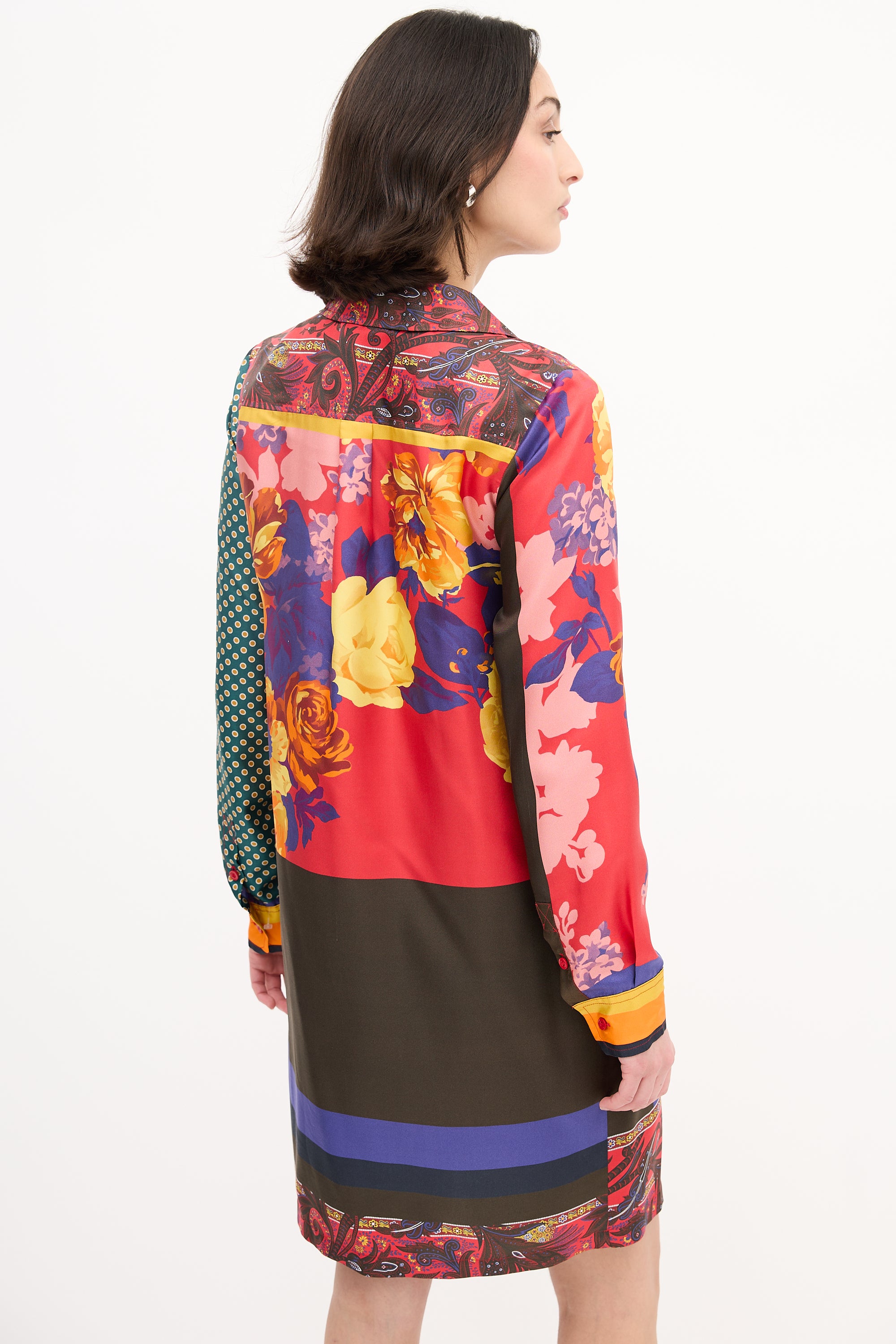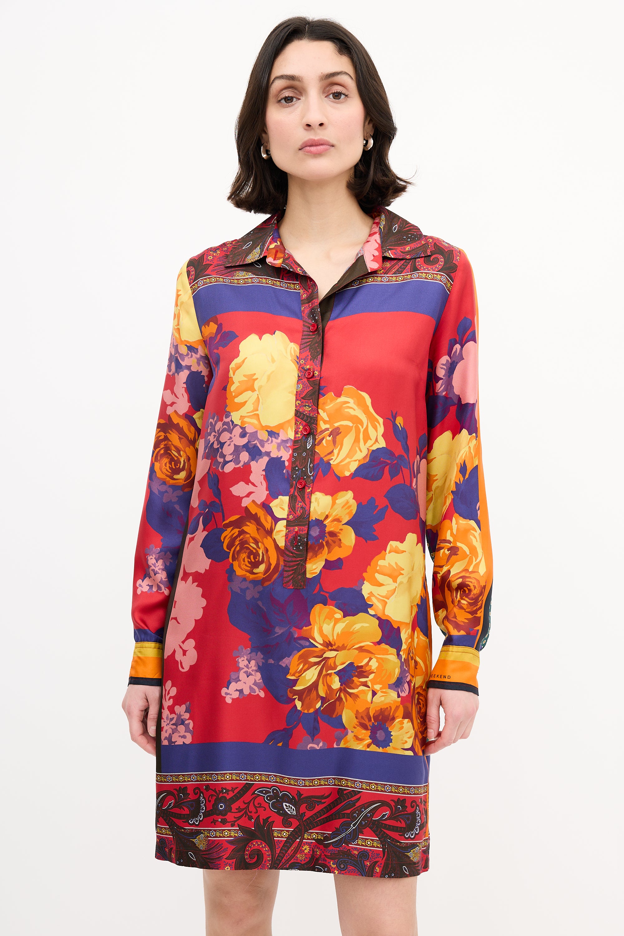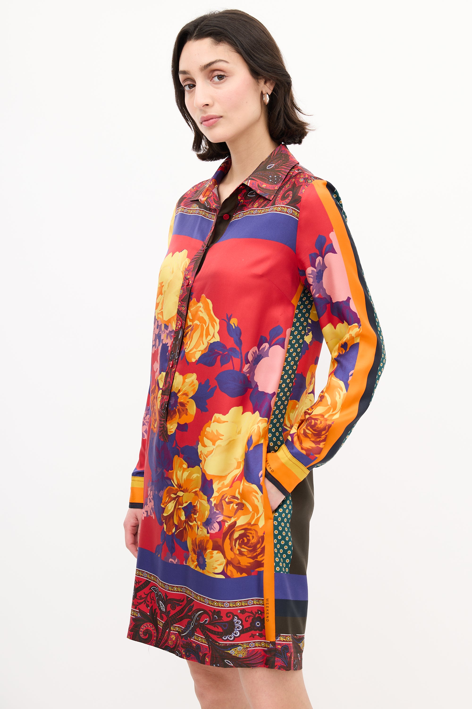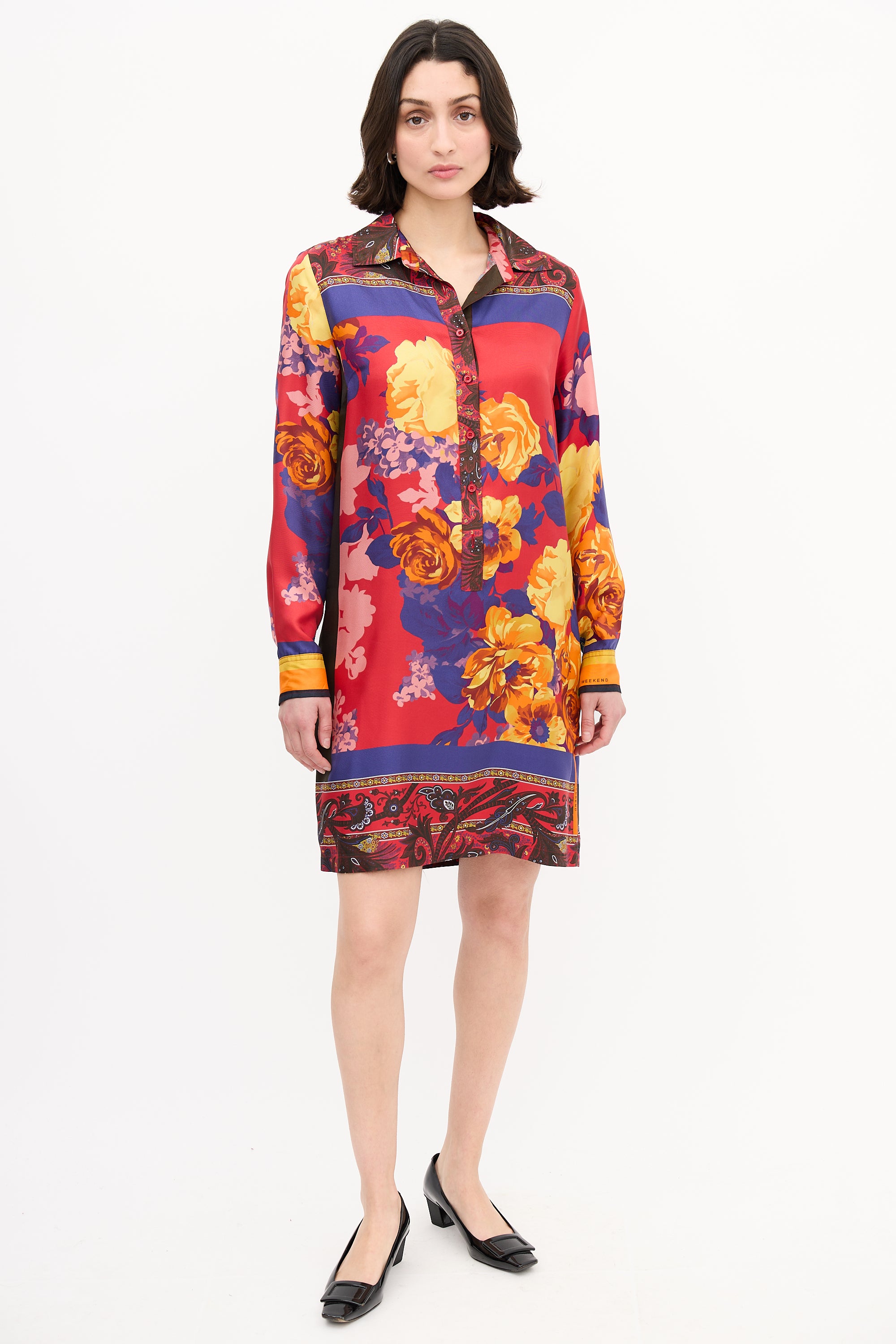 Pre-owned Max Mara Weekend red and multicolour silk mini tunic dress featuring a spread collar, half button up front closure, in seam pockets, buttoned cuffs, and mixed floral, ornate, and polka dot print throughout.